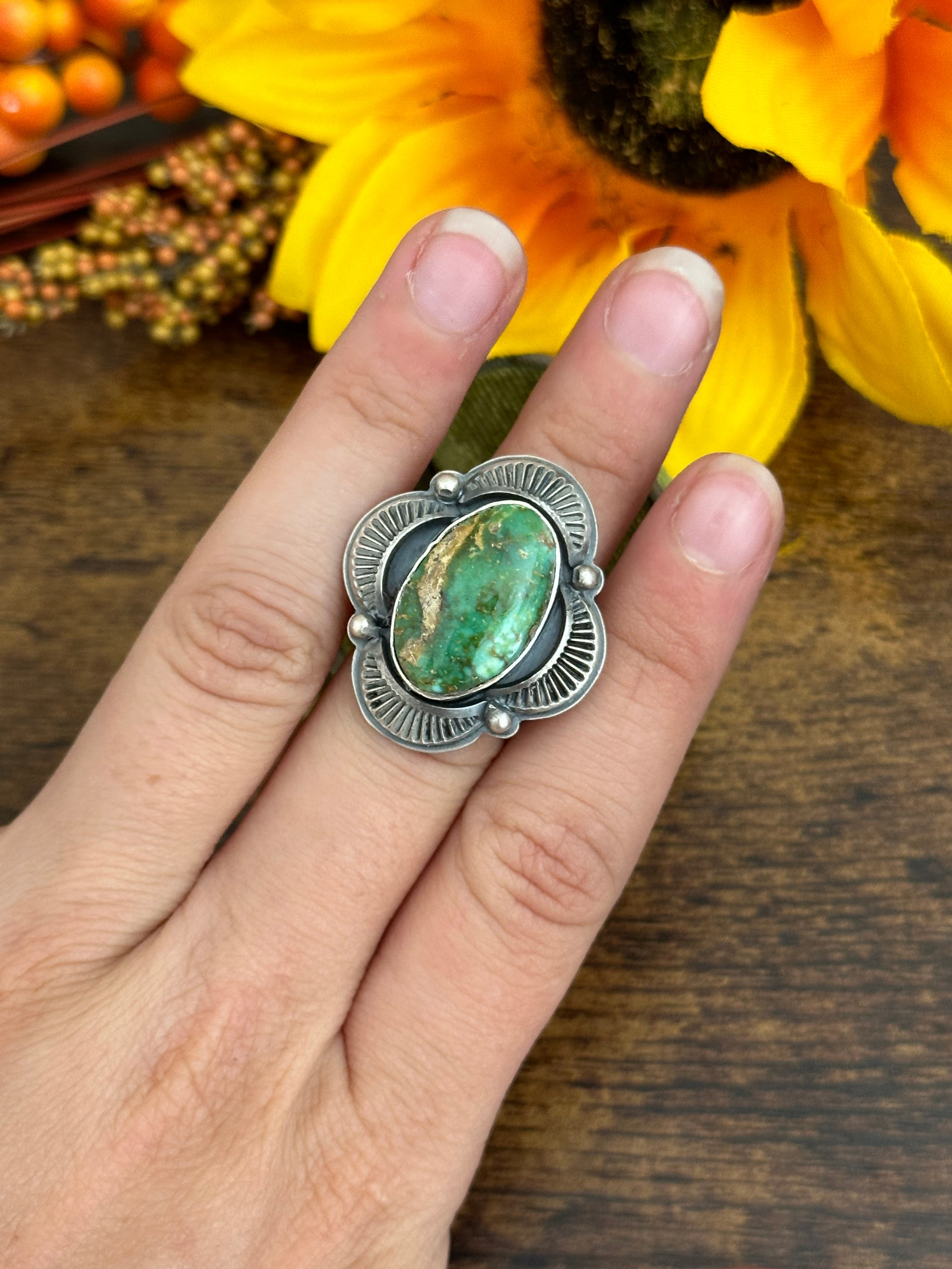 Beautiful ring, Gilbert Platero Sonoran Gold Turquoise & Sterling Silver Ring Size 6. It measures 1 1/4 inches round. Signed by the artist and stamped sterling silver.