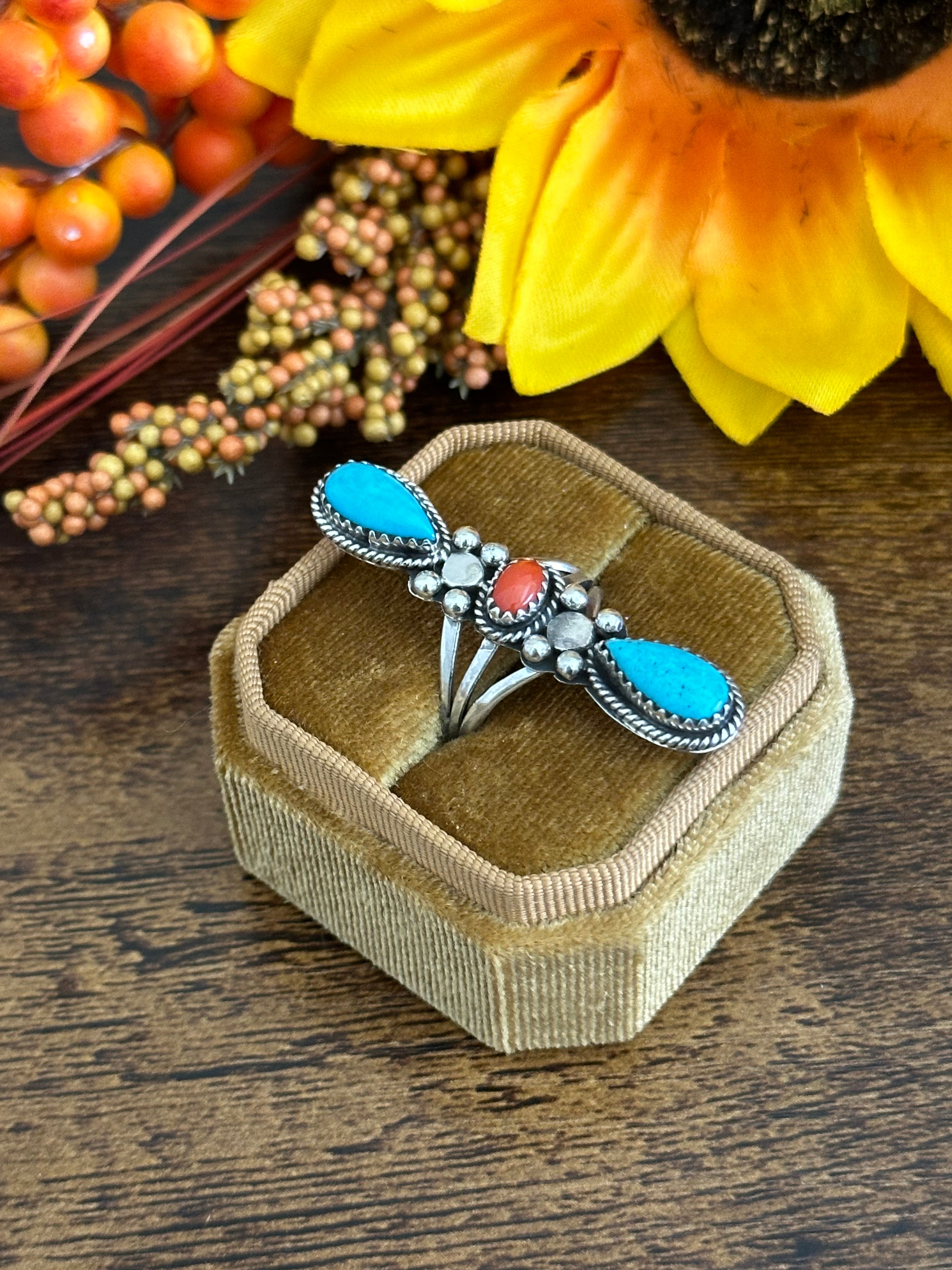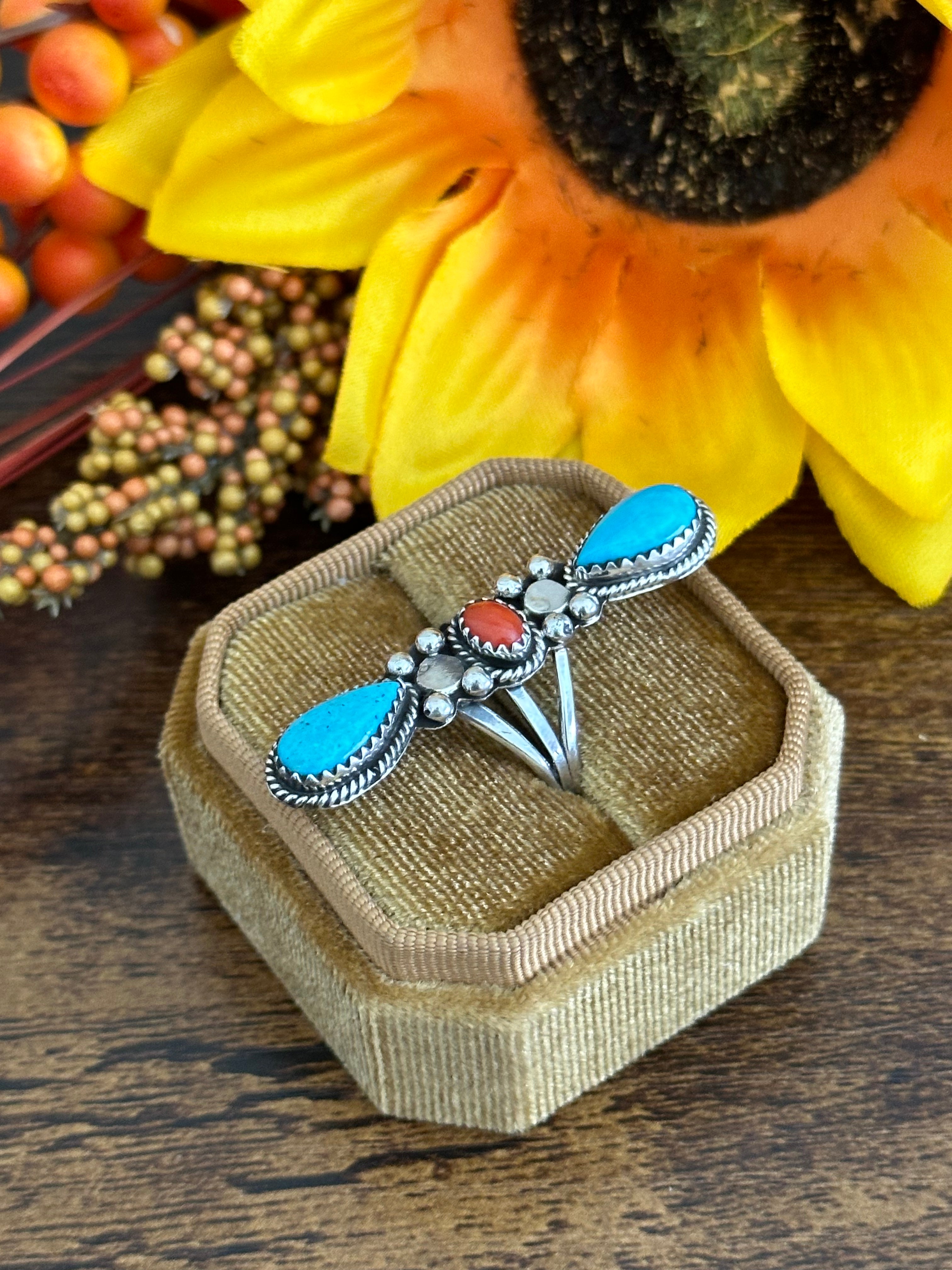 Beautiful ring, Navajo Made Multi Stone & Sterling Silver Ring. It measures 1 3/4 inches long and 3/8 of an inch wide. Stones will differ due to natural stones.
