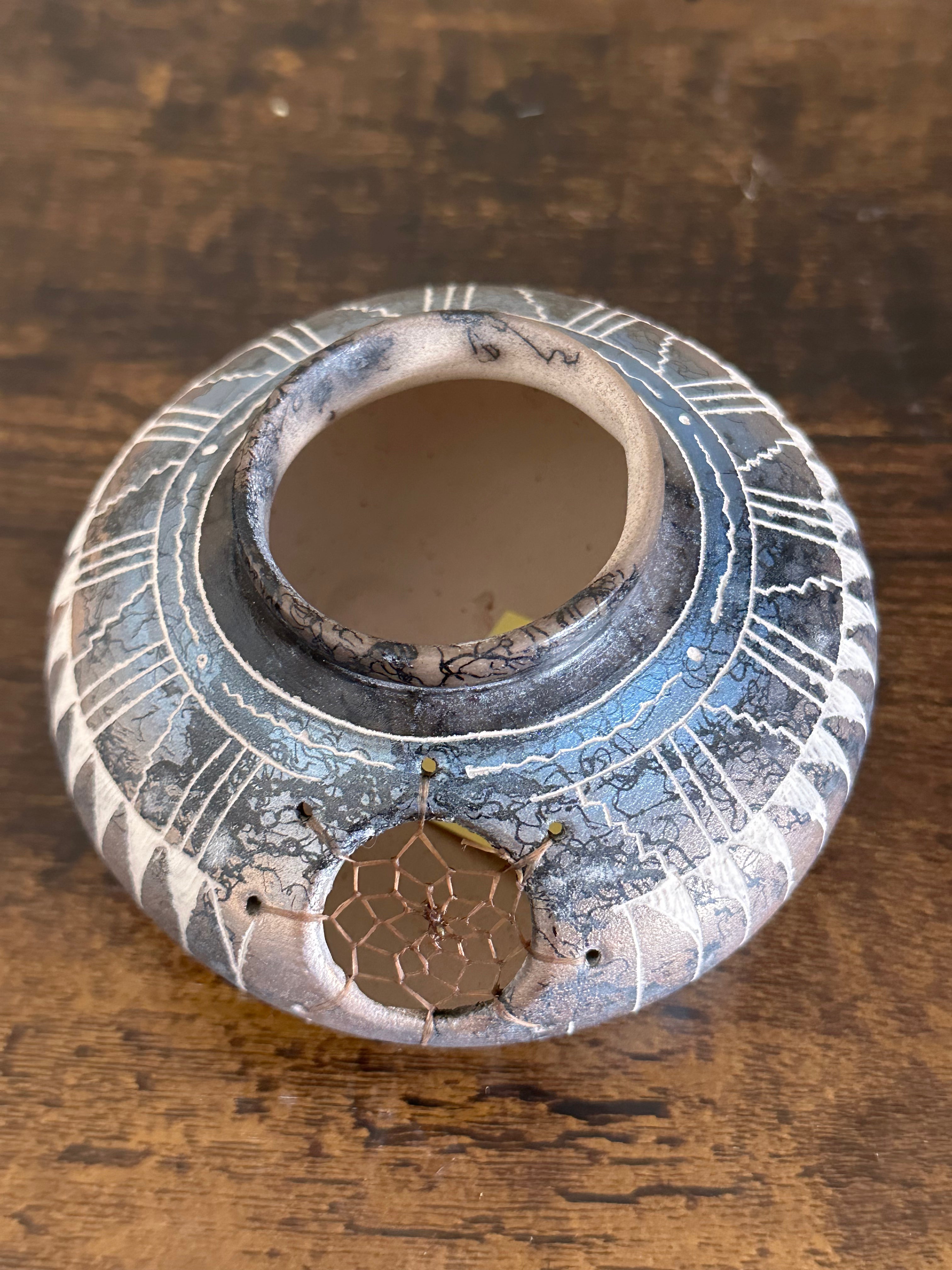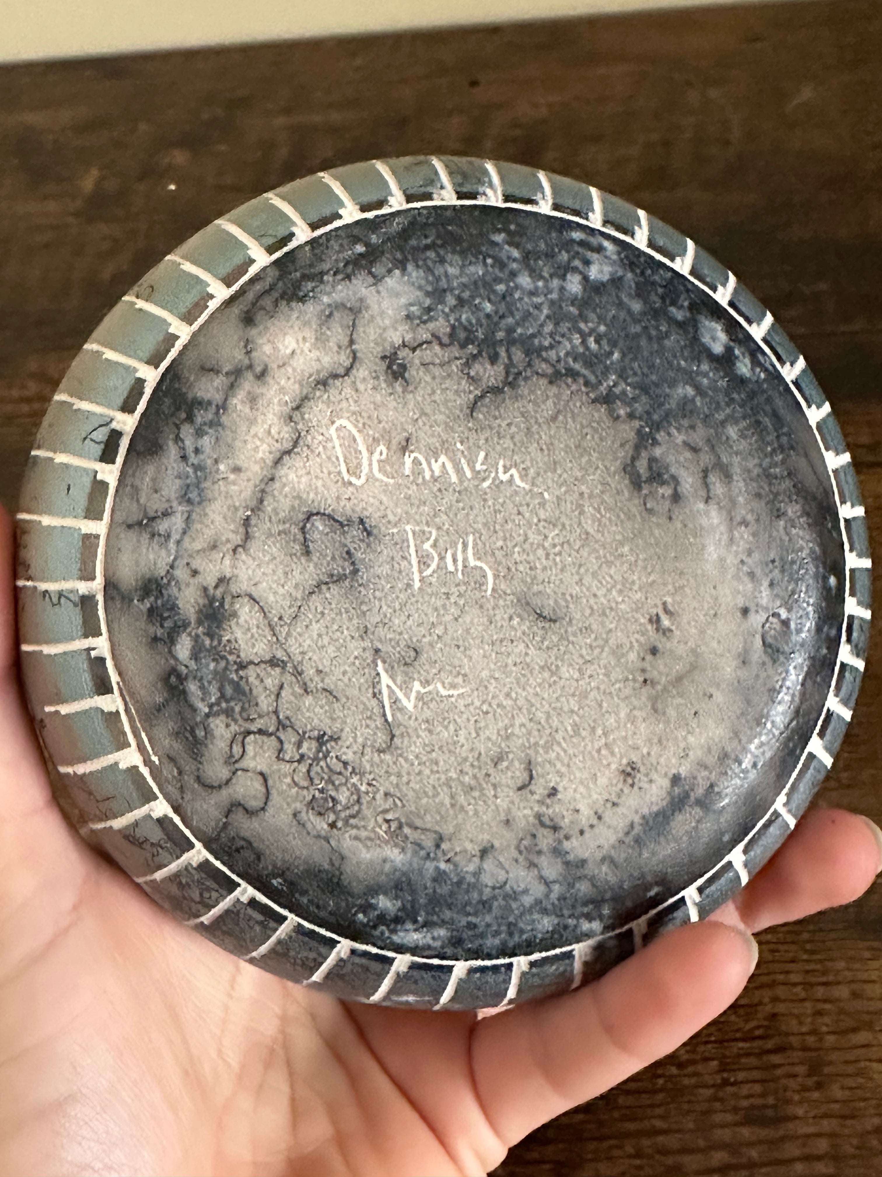 Dennison Billy Navajo Made Pottery. It measures 3 inches long and 14 7/8 inches round. Signed by the artist.