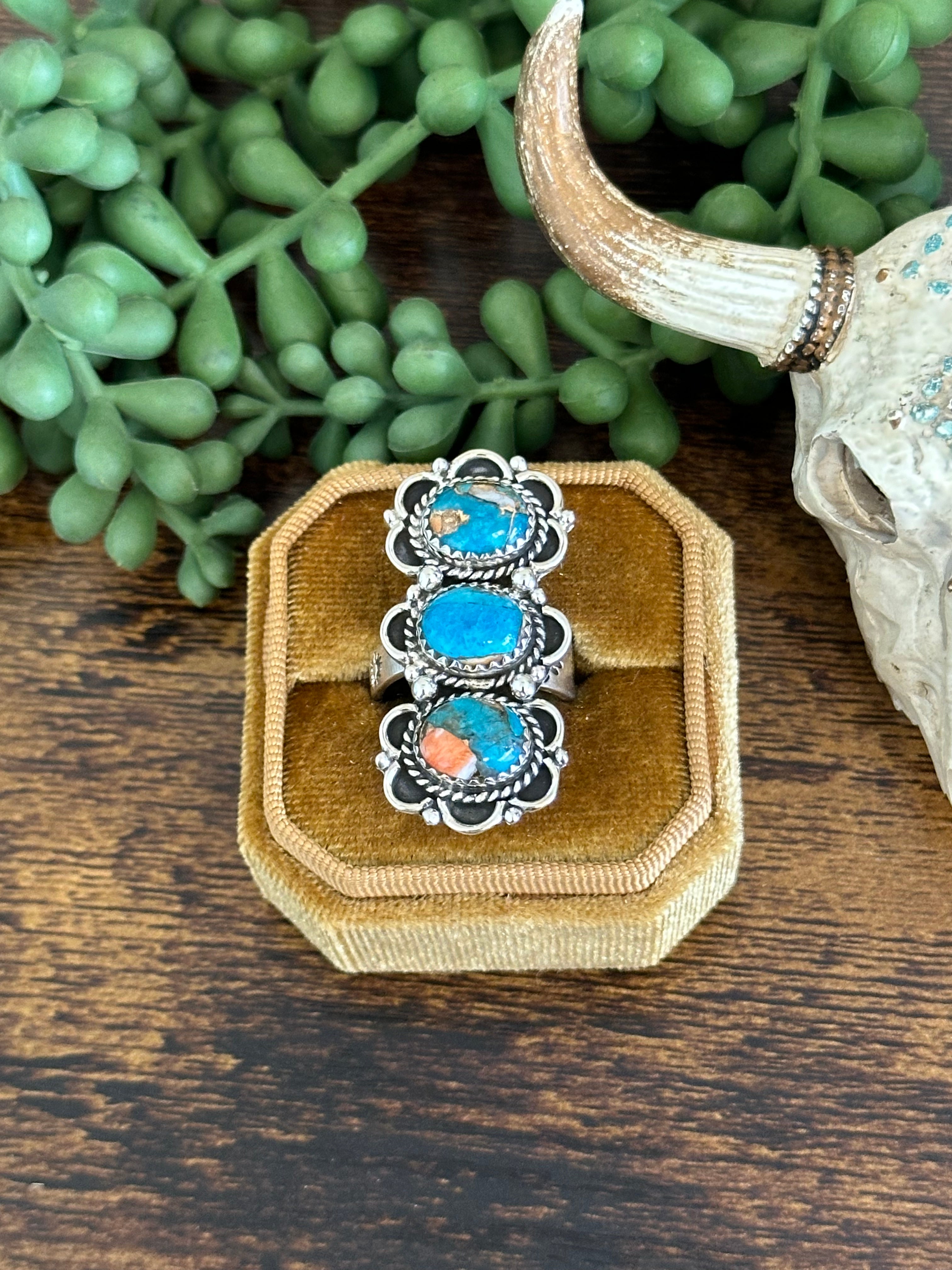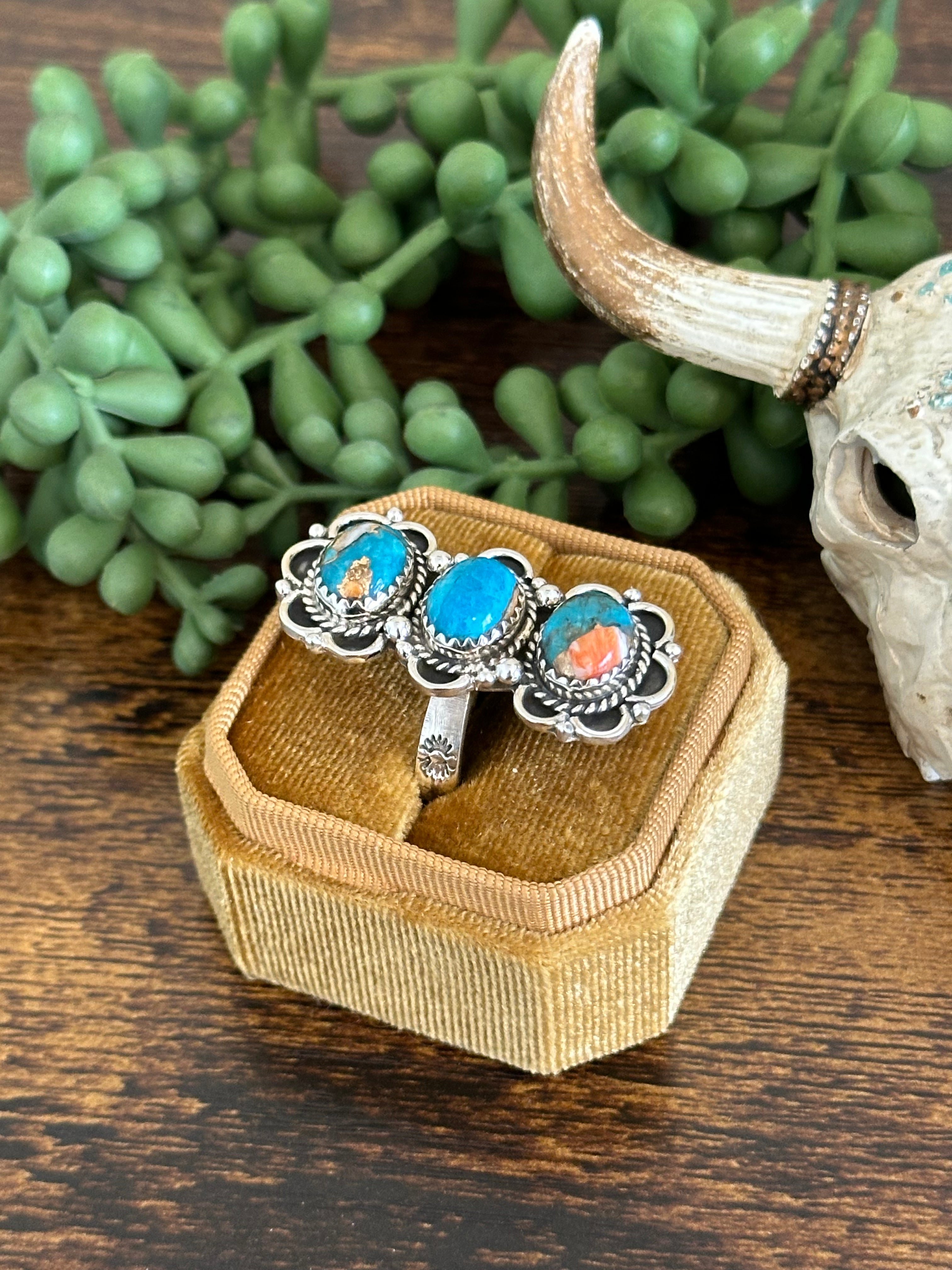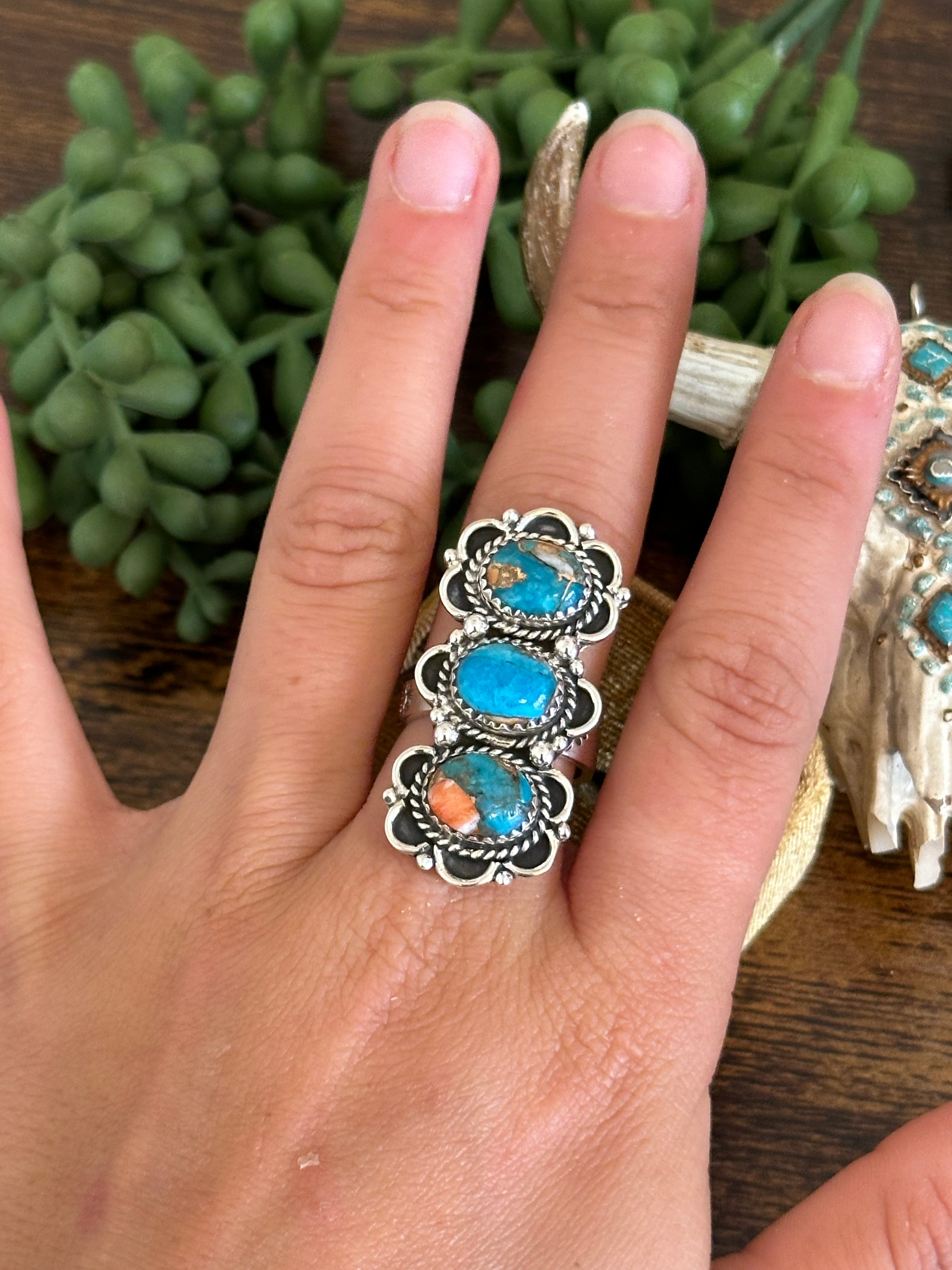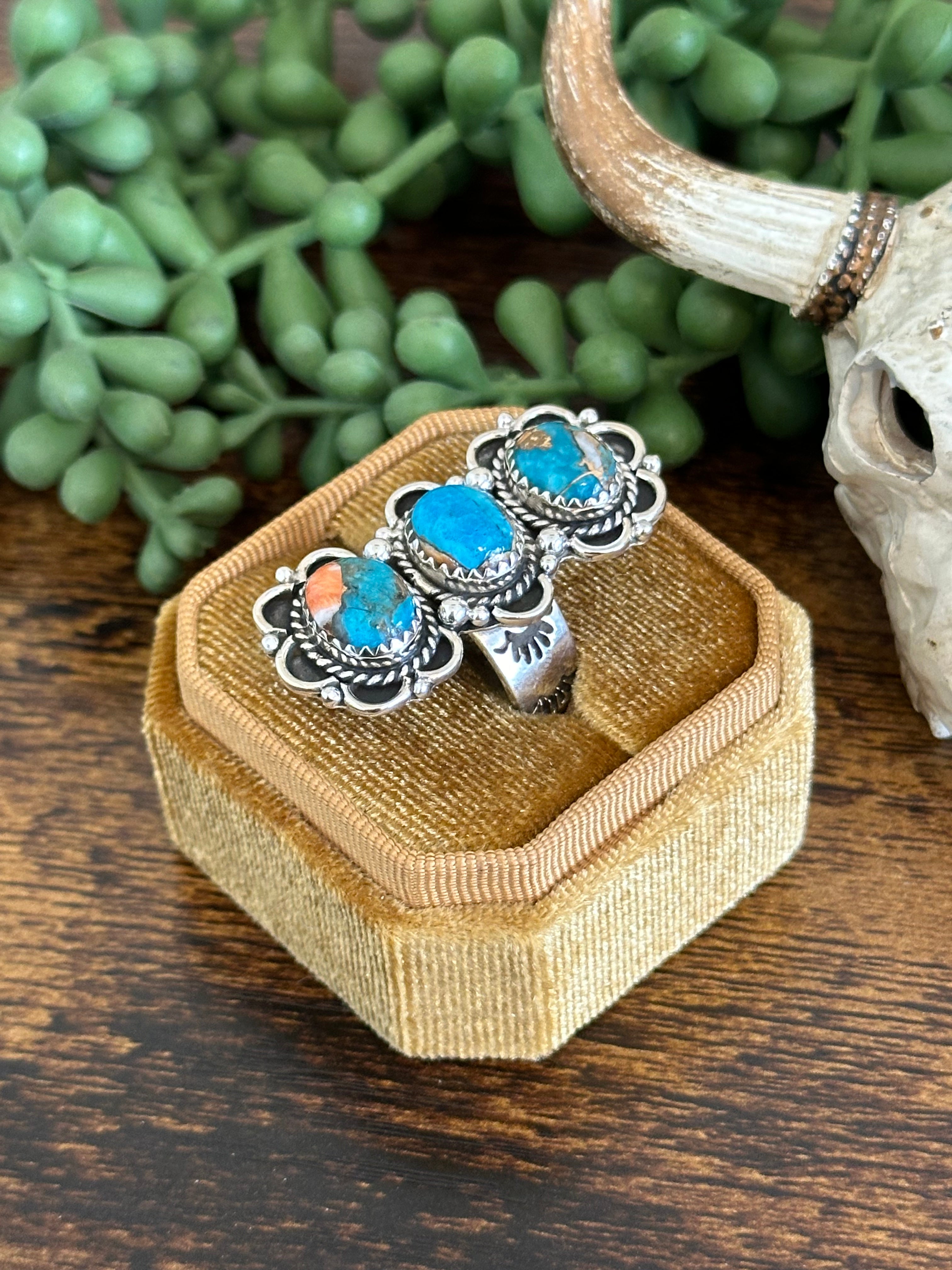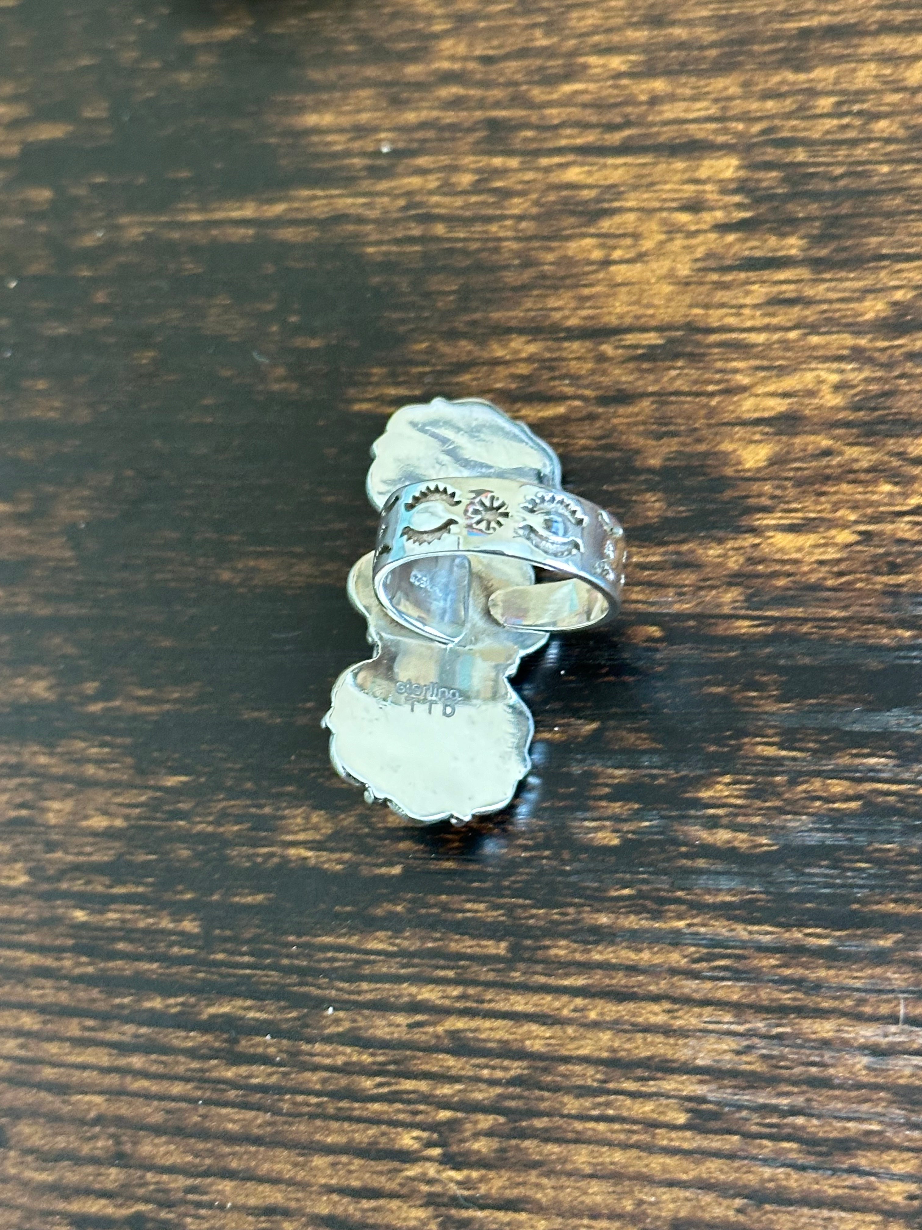 Beautiful climber ring. Southwest Handmade Mohave Turquoise & Sterling Silver Adjustable Ring. It measures just over 1 1/2 inches long and 3/4 of an inch wide. Signed by the artist and stamped sterling silver.