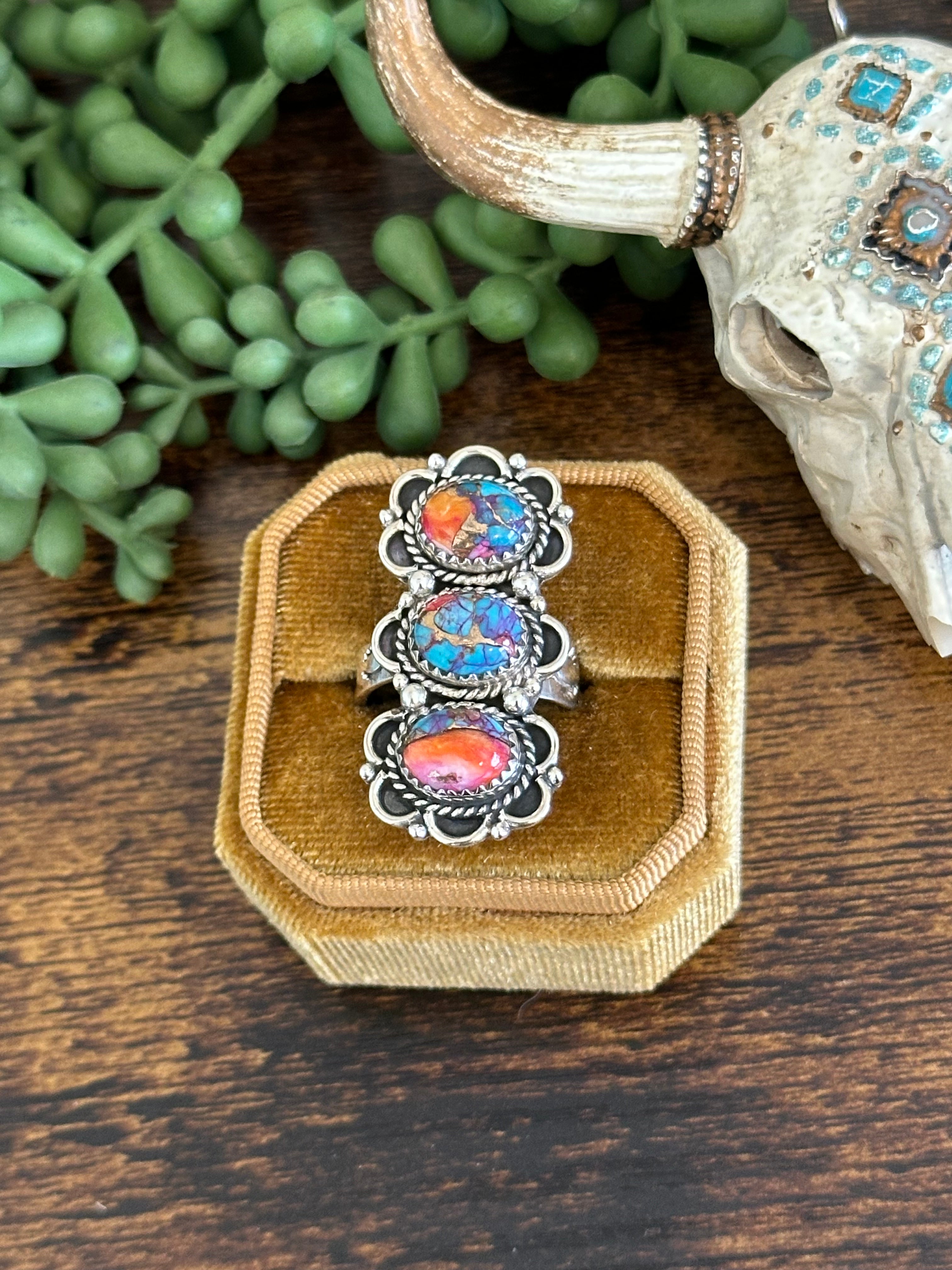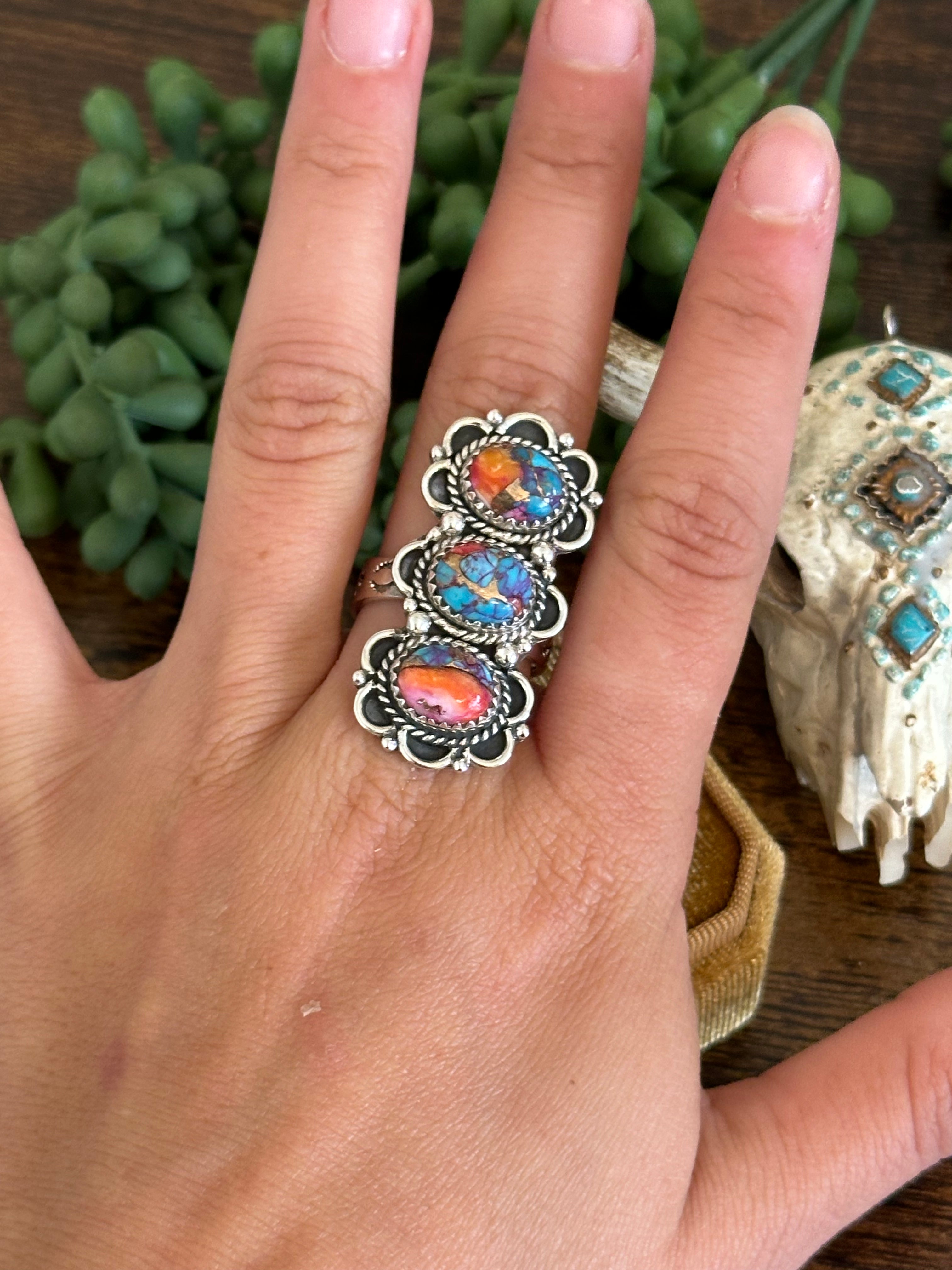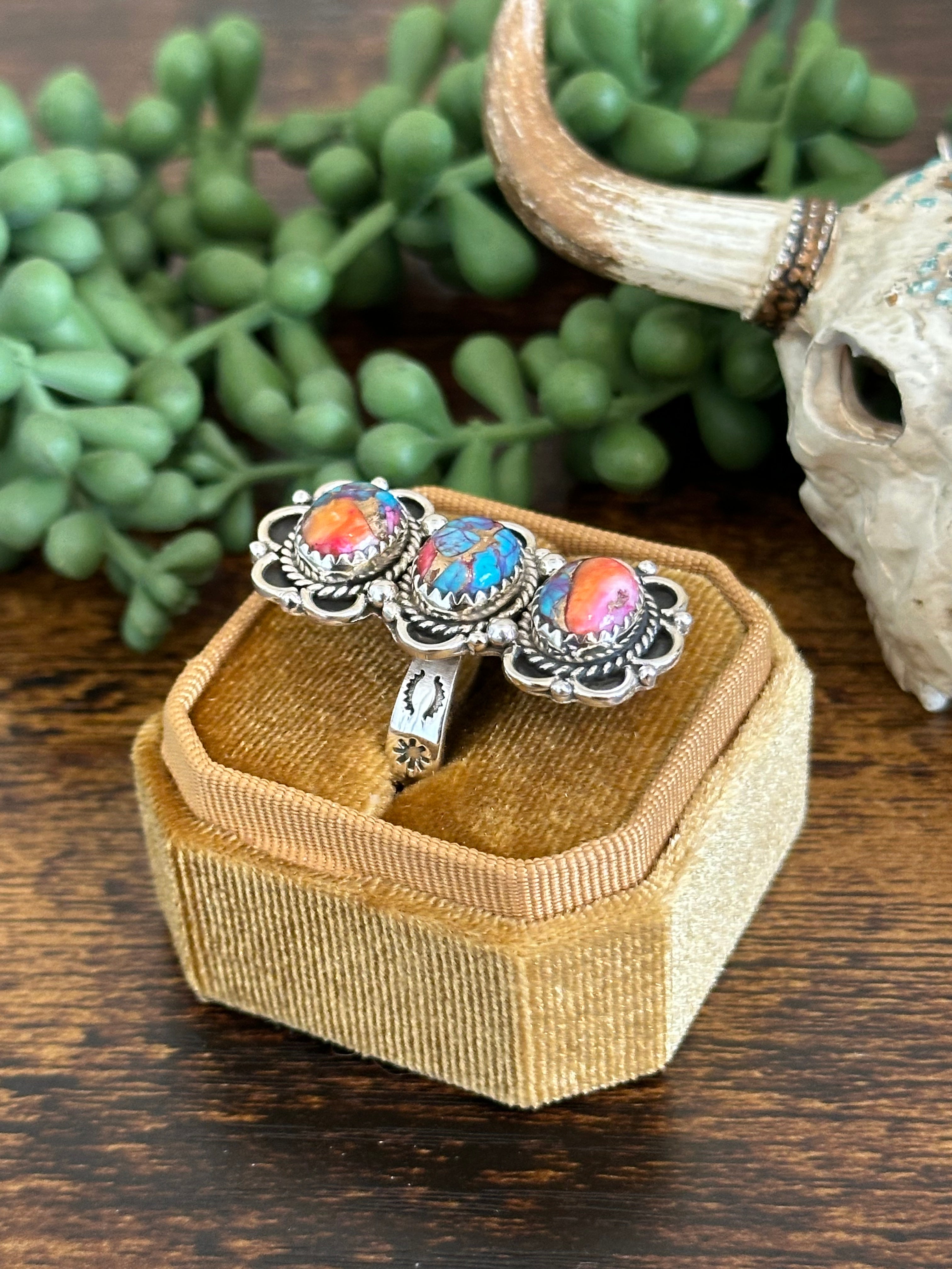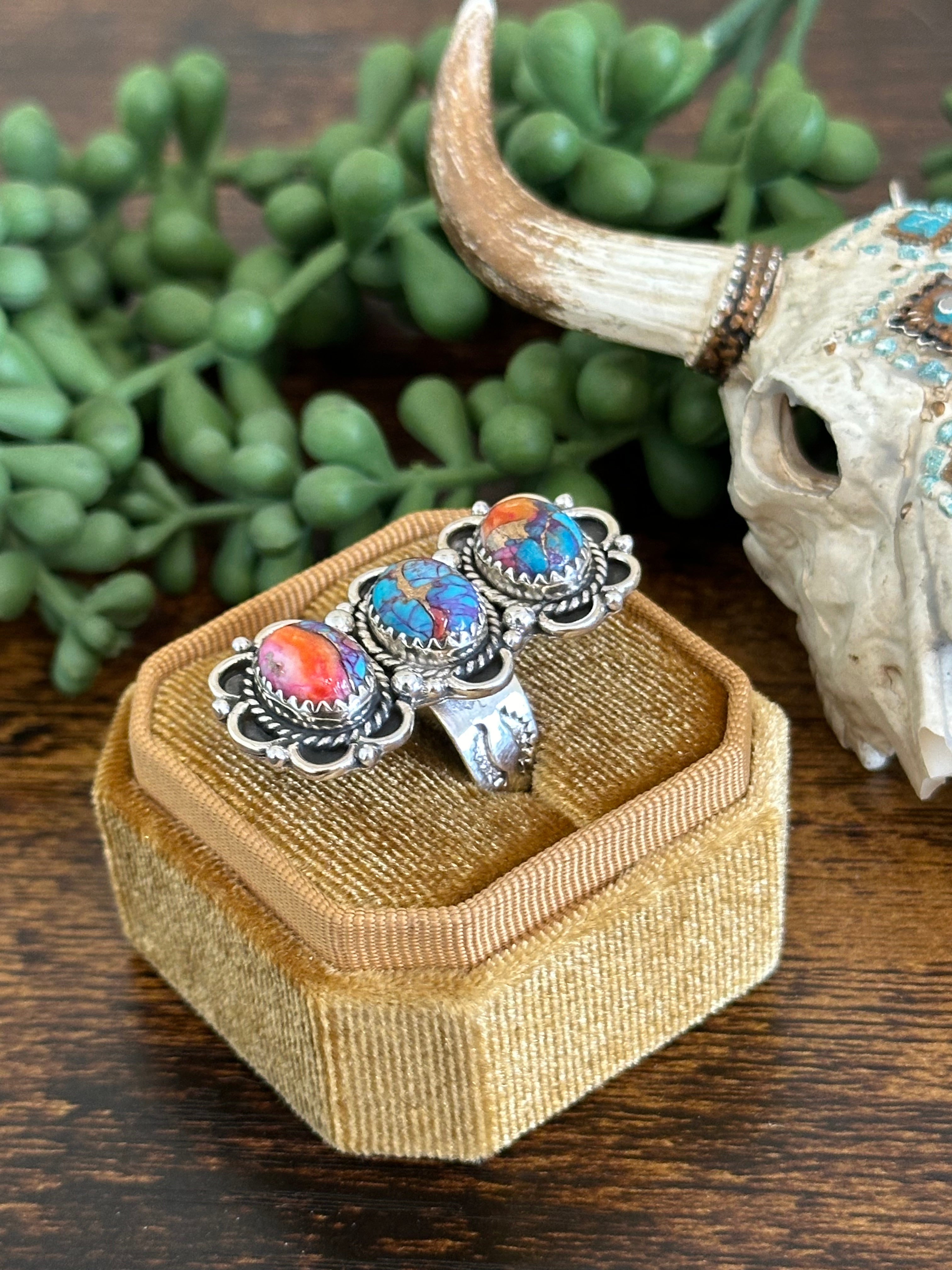 Beautiful climber ring. Southwest Handmade Mohave Turquoise & Sterling Silver Adjustable Ring. It measures just over 1 1/2 inches long and 3/4 of an inch wide. Signed by the artist and stamped sterling silver.