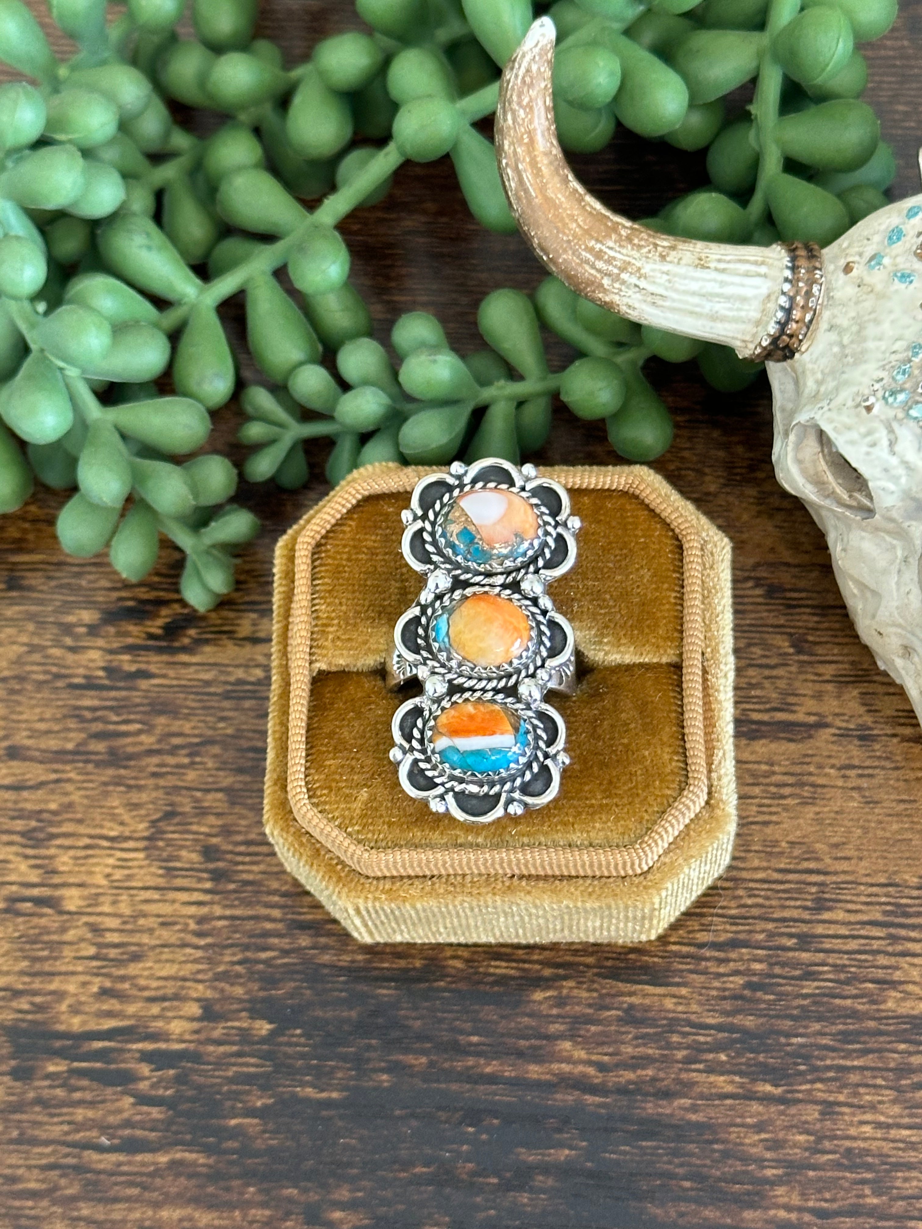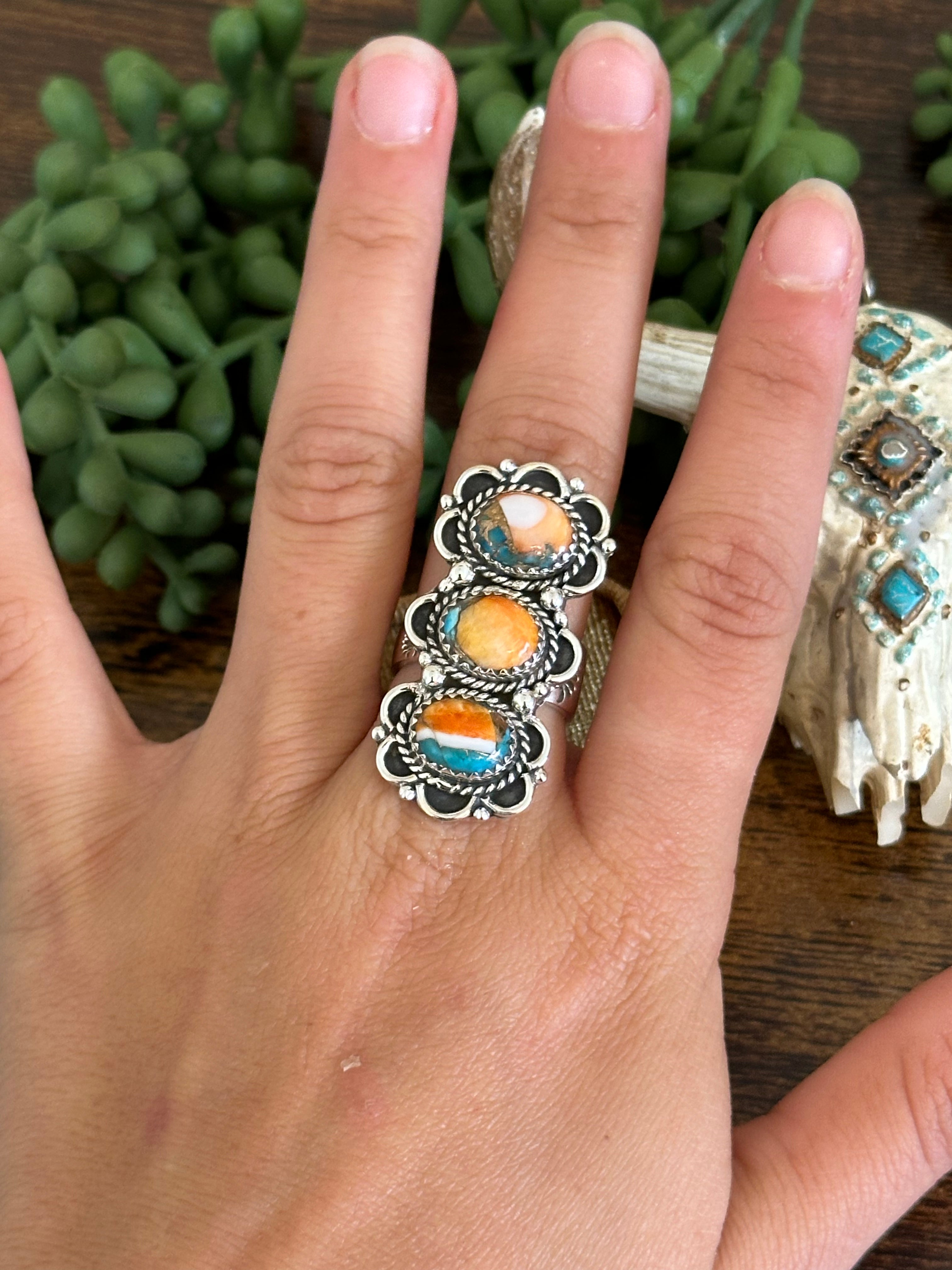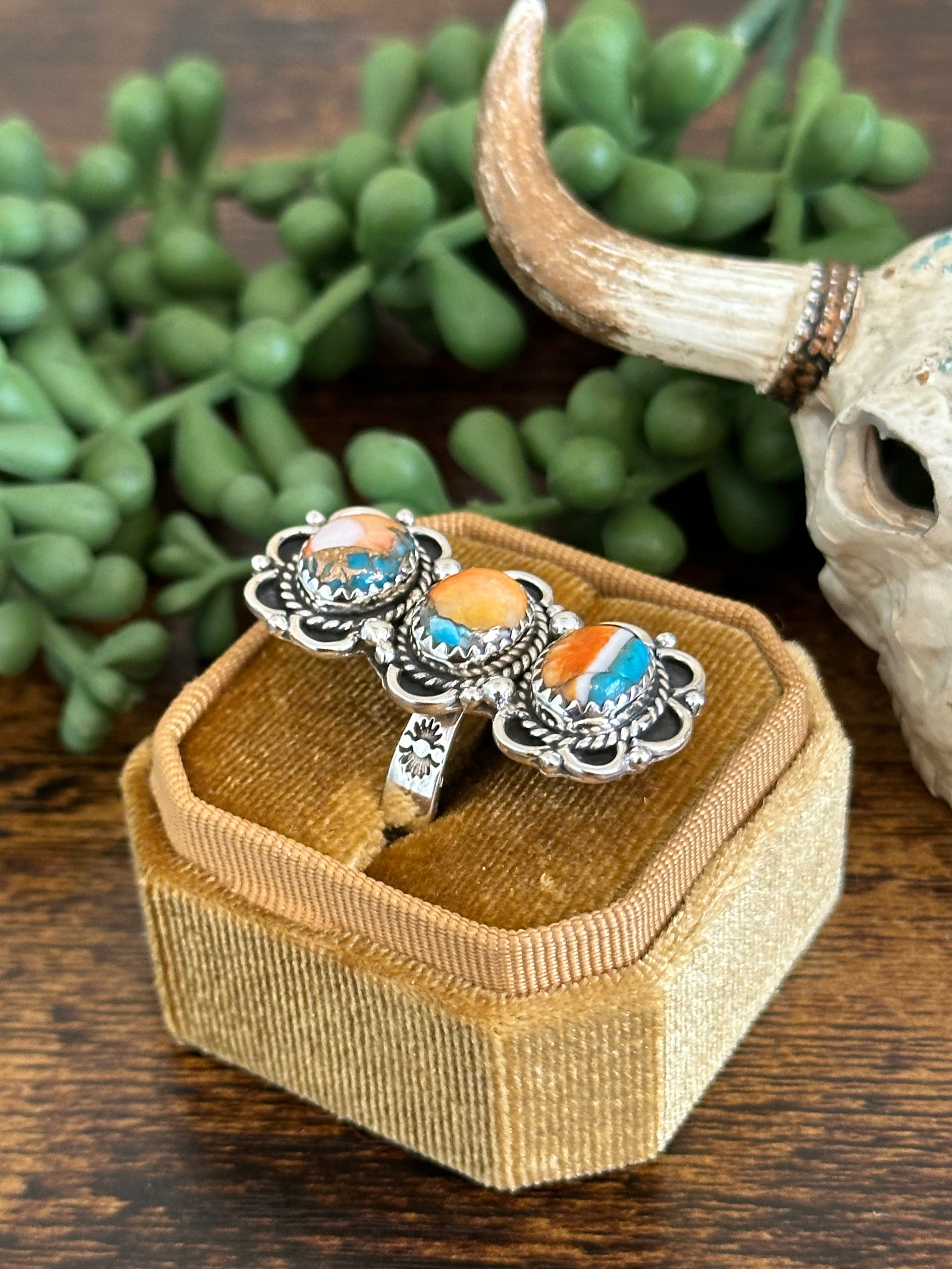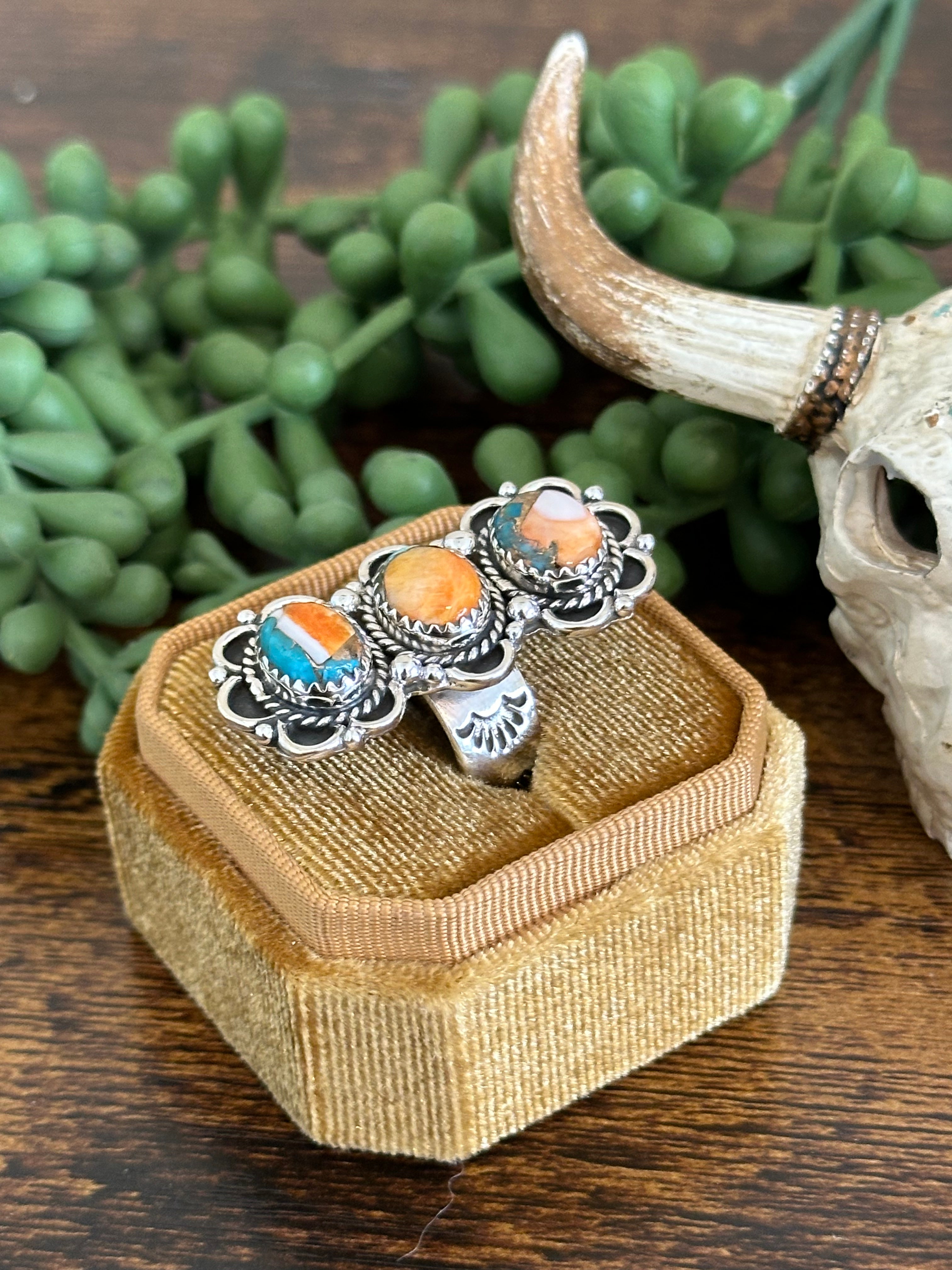 Beautiful climber ring. Southwest Handmade Mohave Turquoise & Sterling Silver Adjustable Ring. It measures just over 1 1/2 inches long and 3/4 of an inch wide. Signed by the artist and stamped sterling silver.