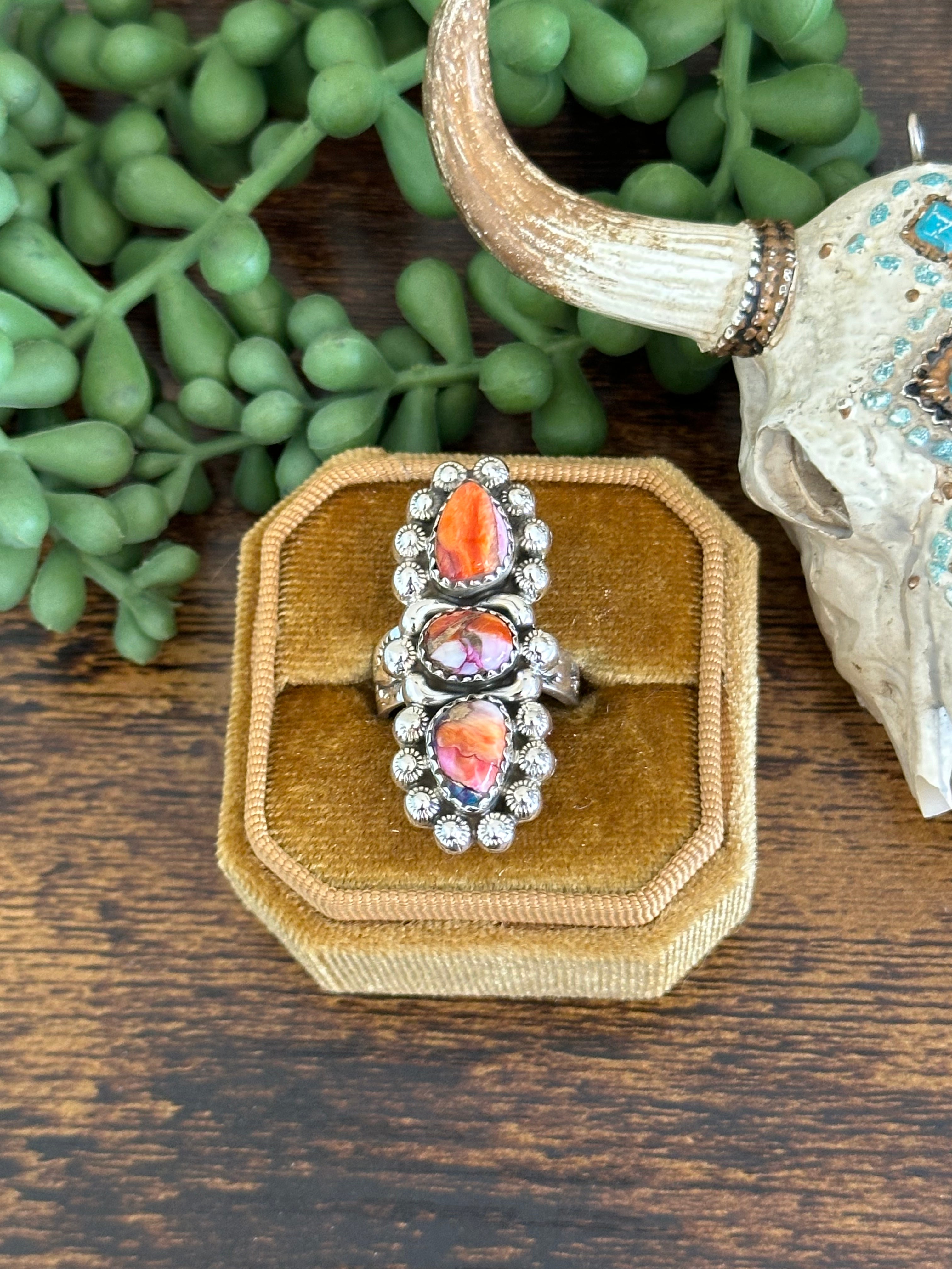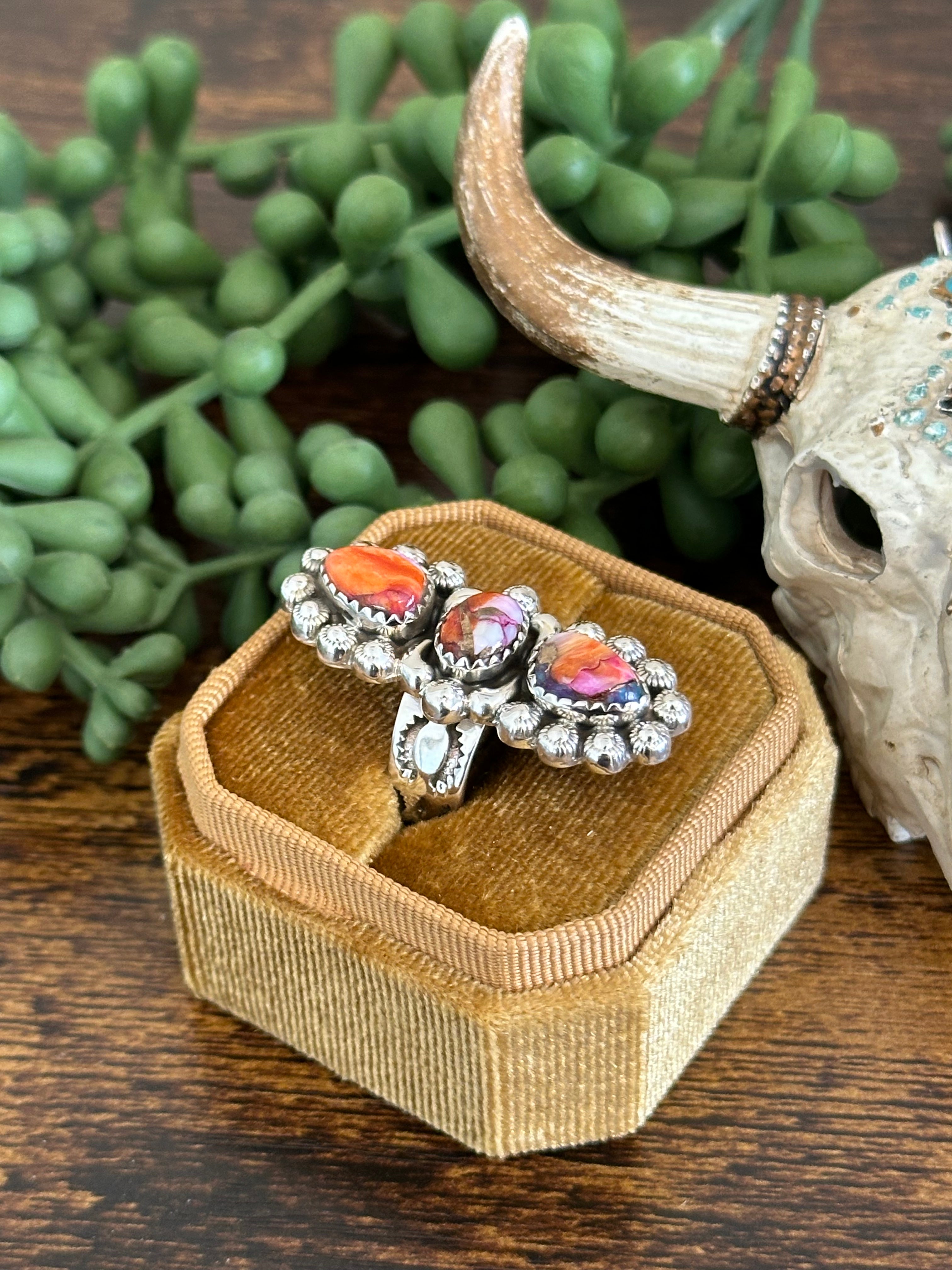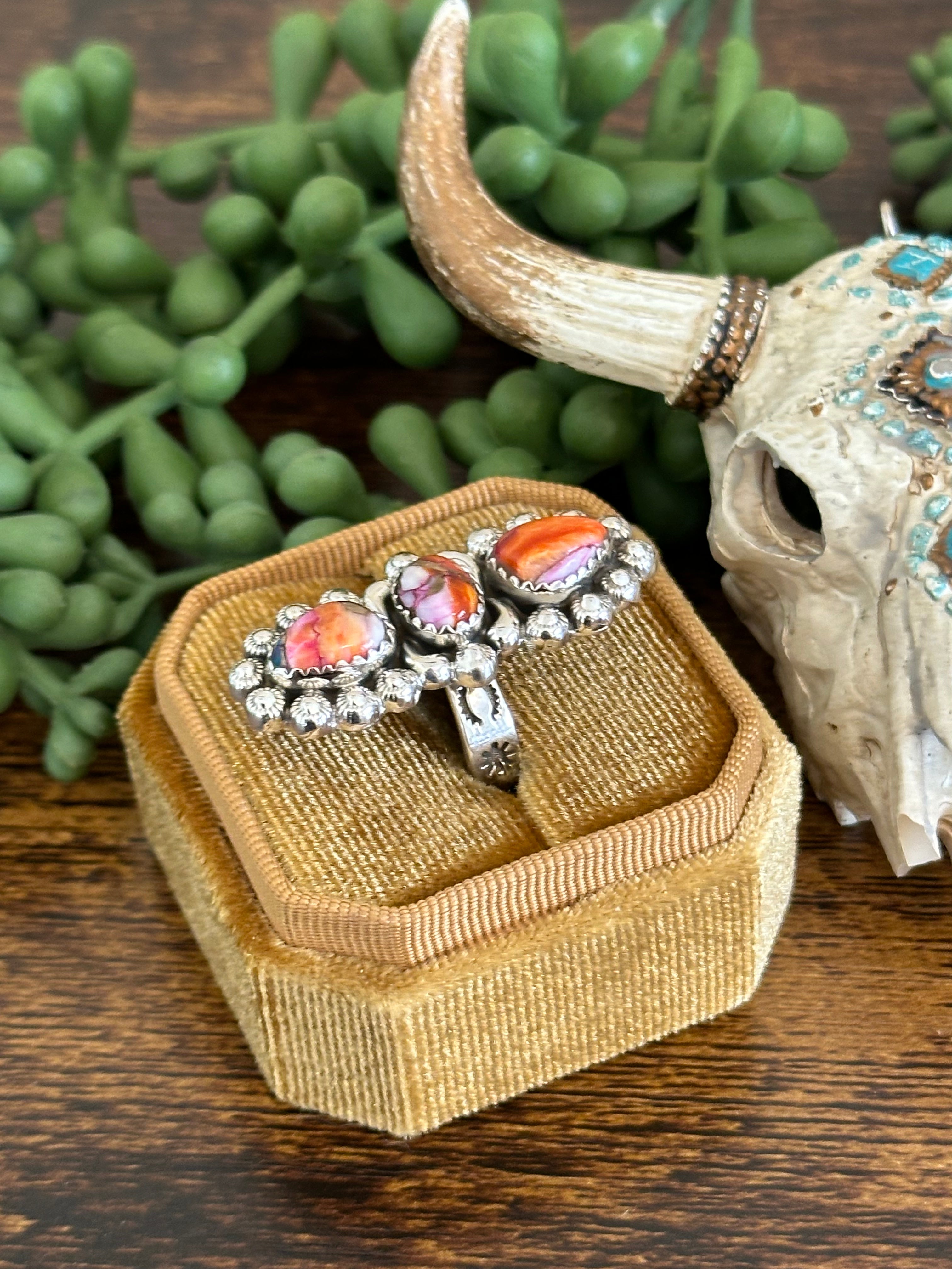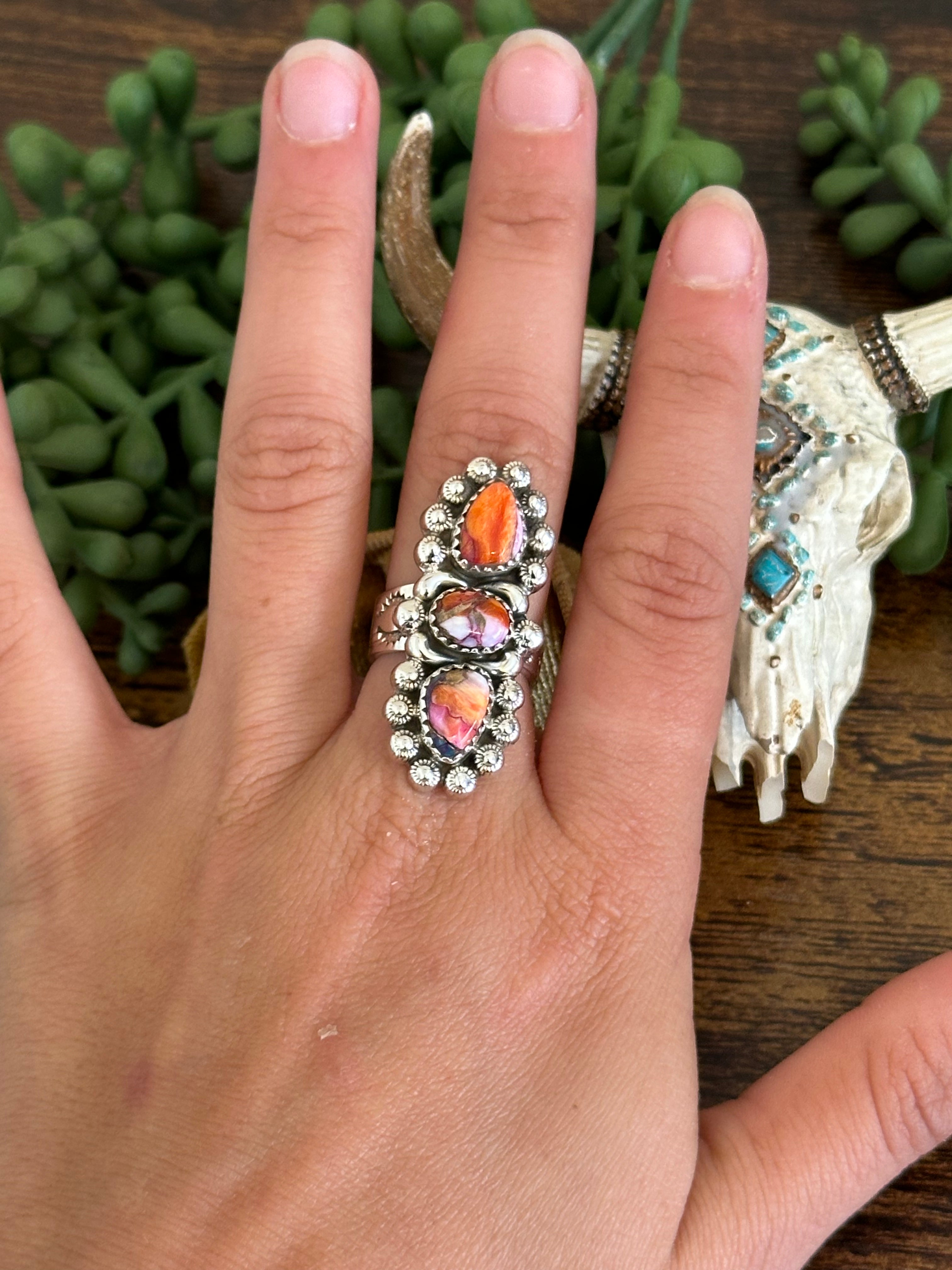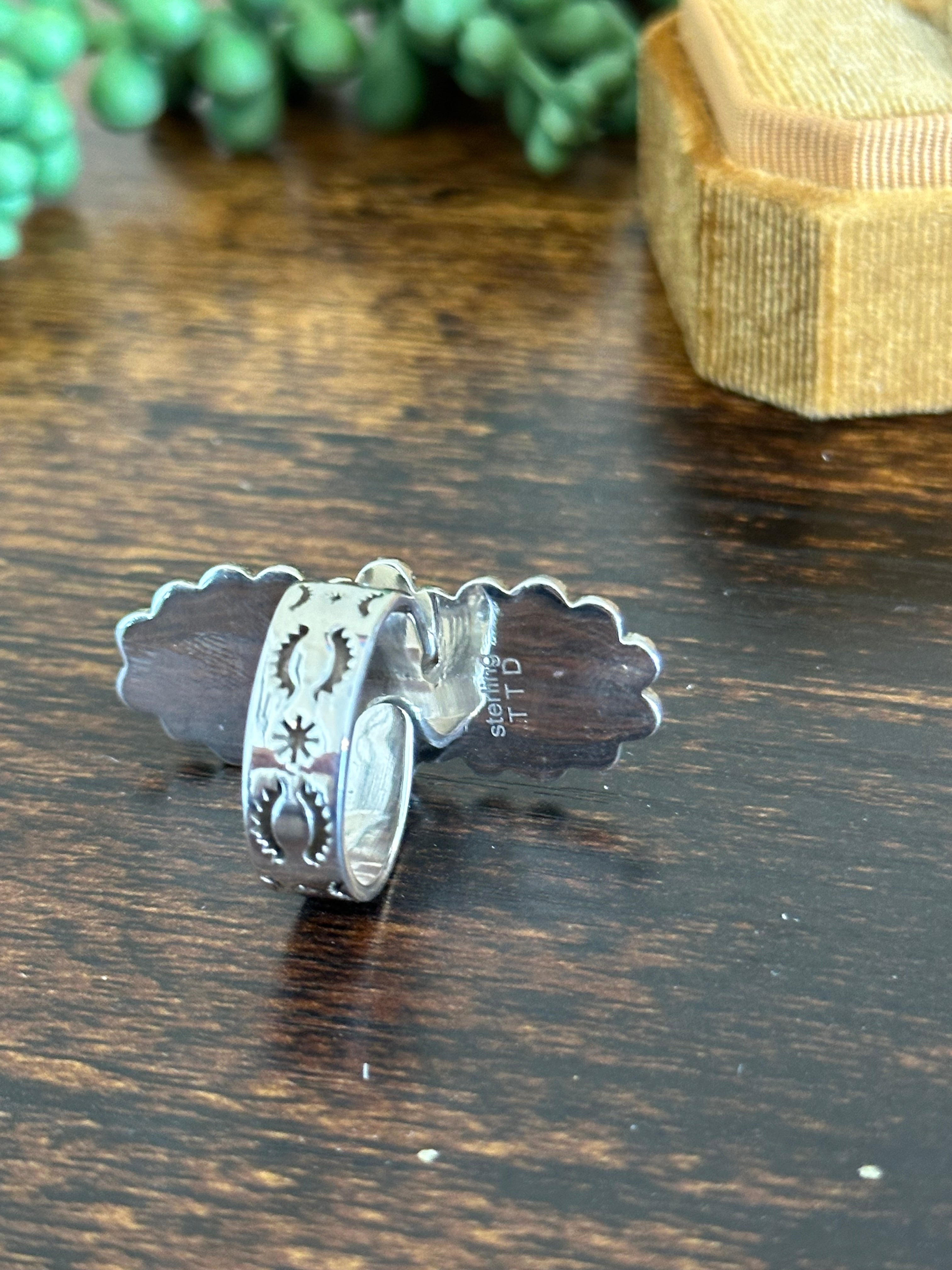 Beautiful climber ring. Southwest Handmade Mohave Turquoise & Sterling Silver Adjustable Ring. It measures just over 1 1/2 inches long and 5/8 an inch wide. Signed by the artist and stamped sterling silver.