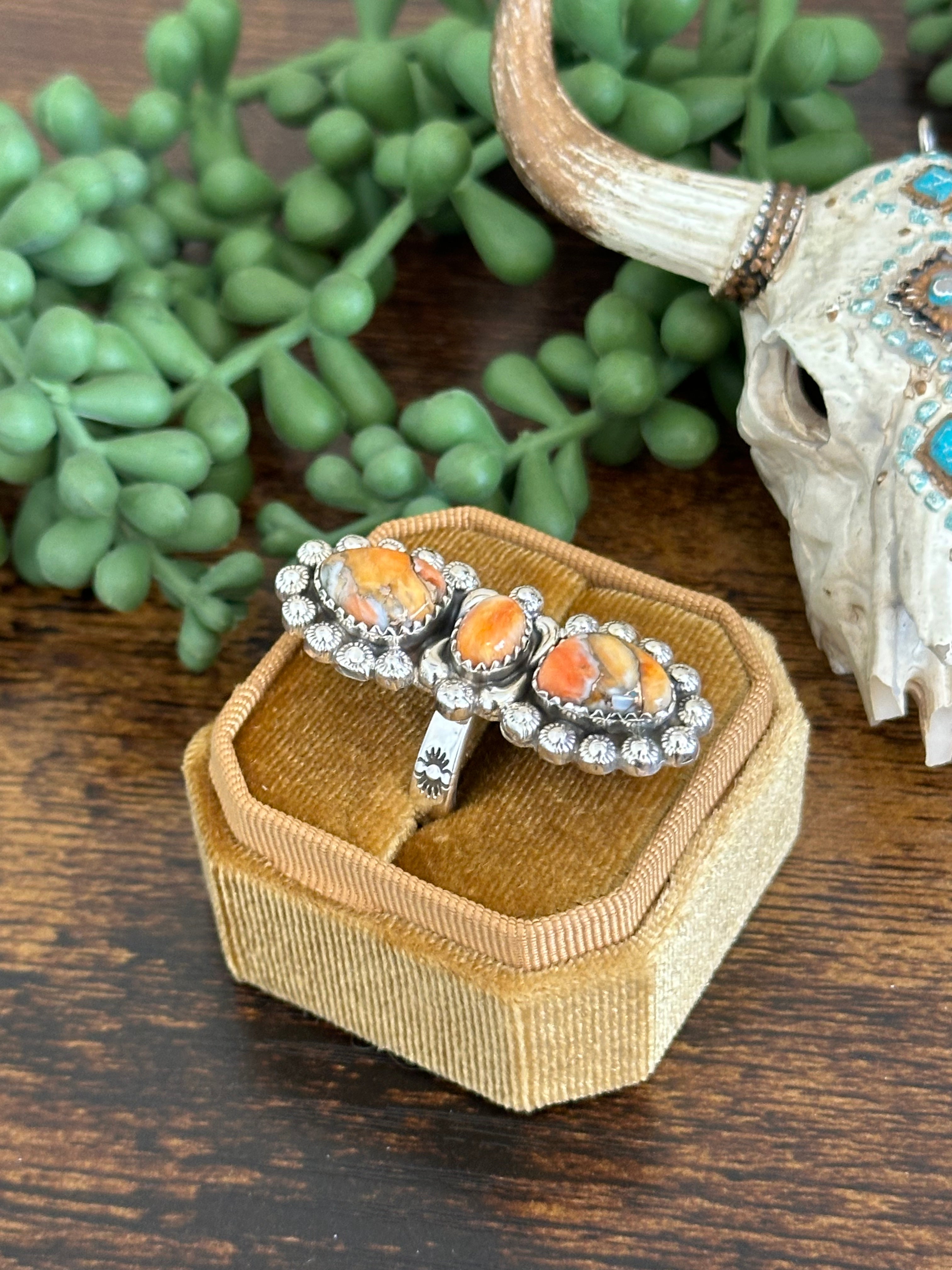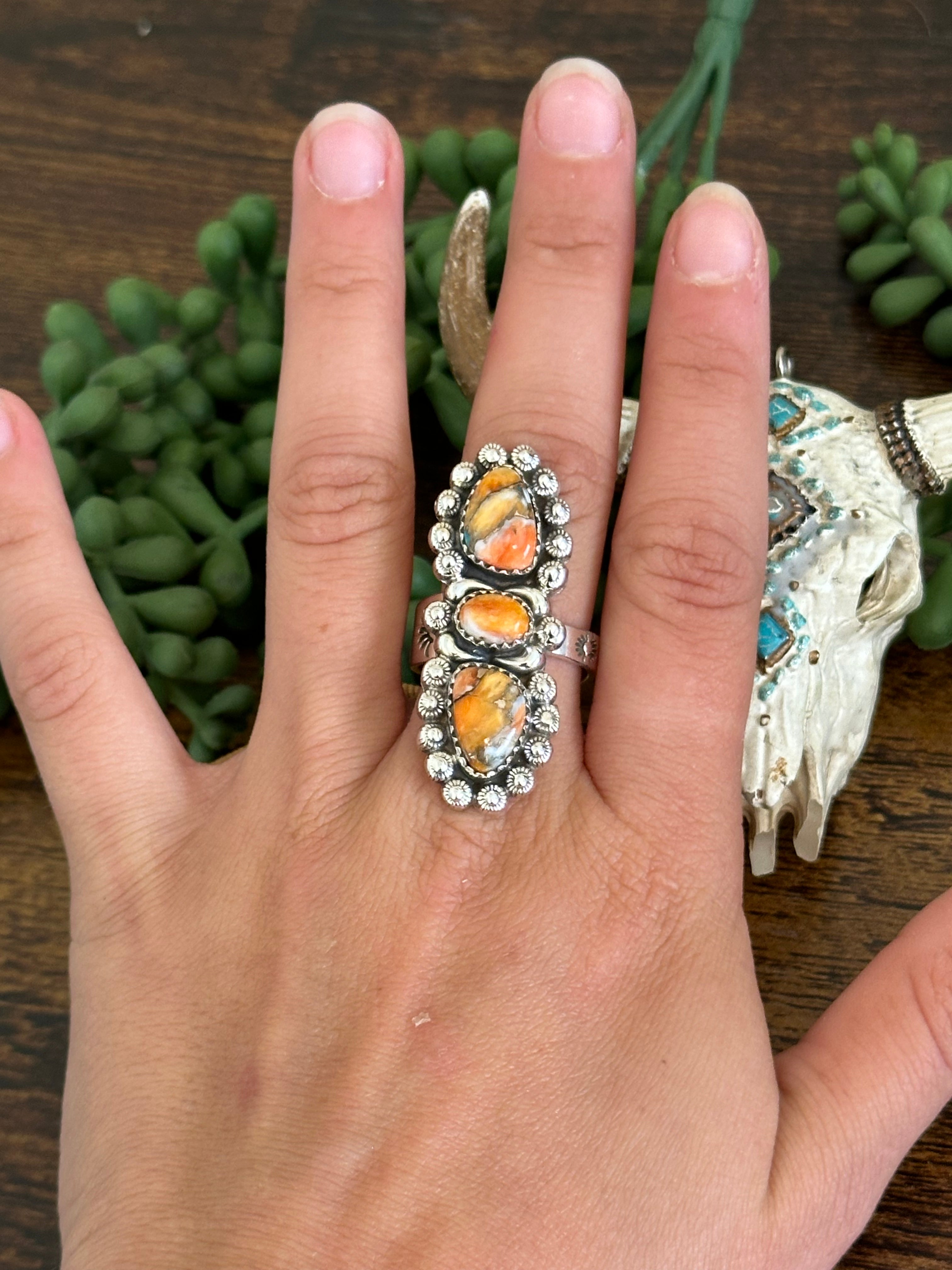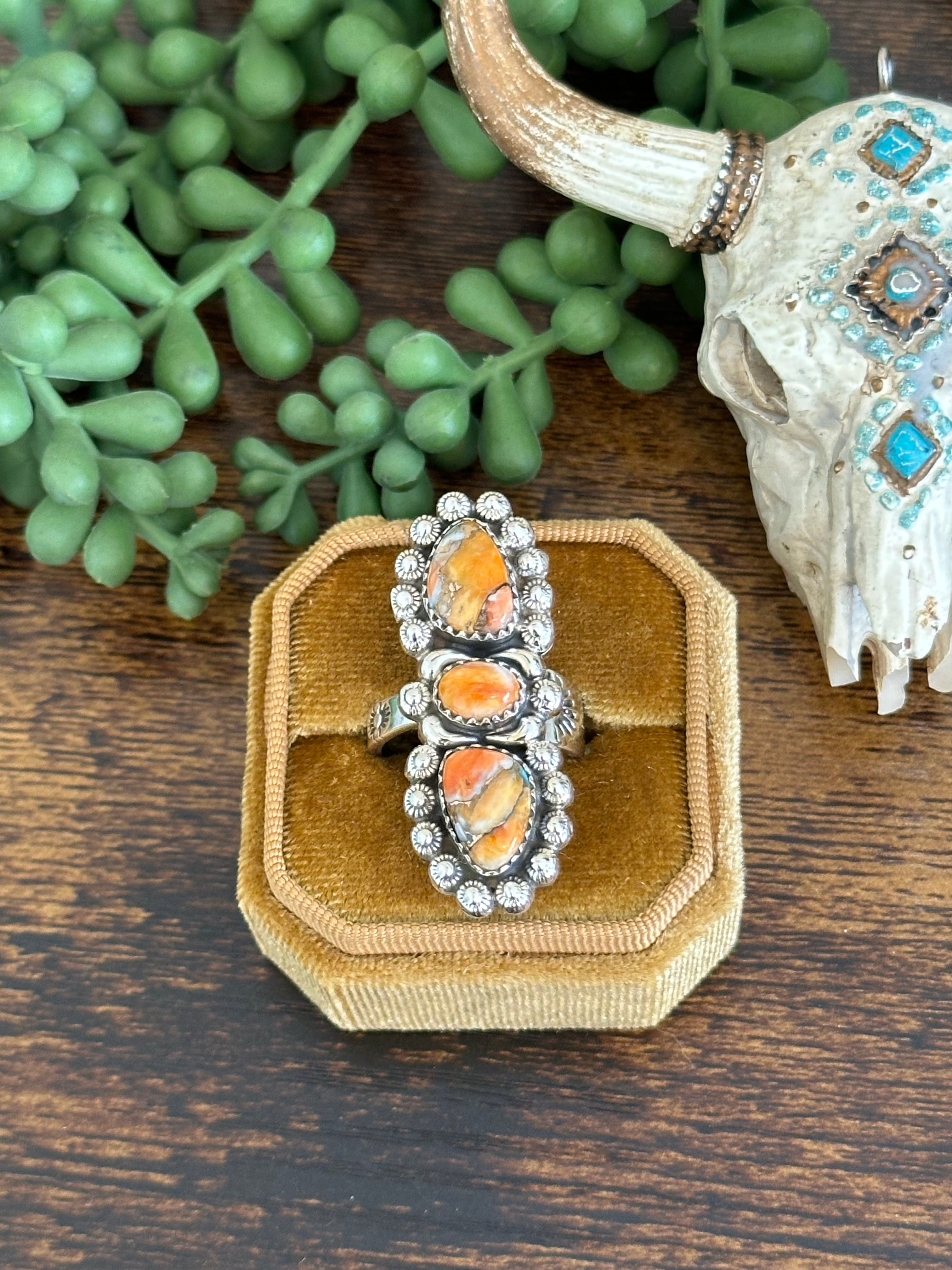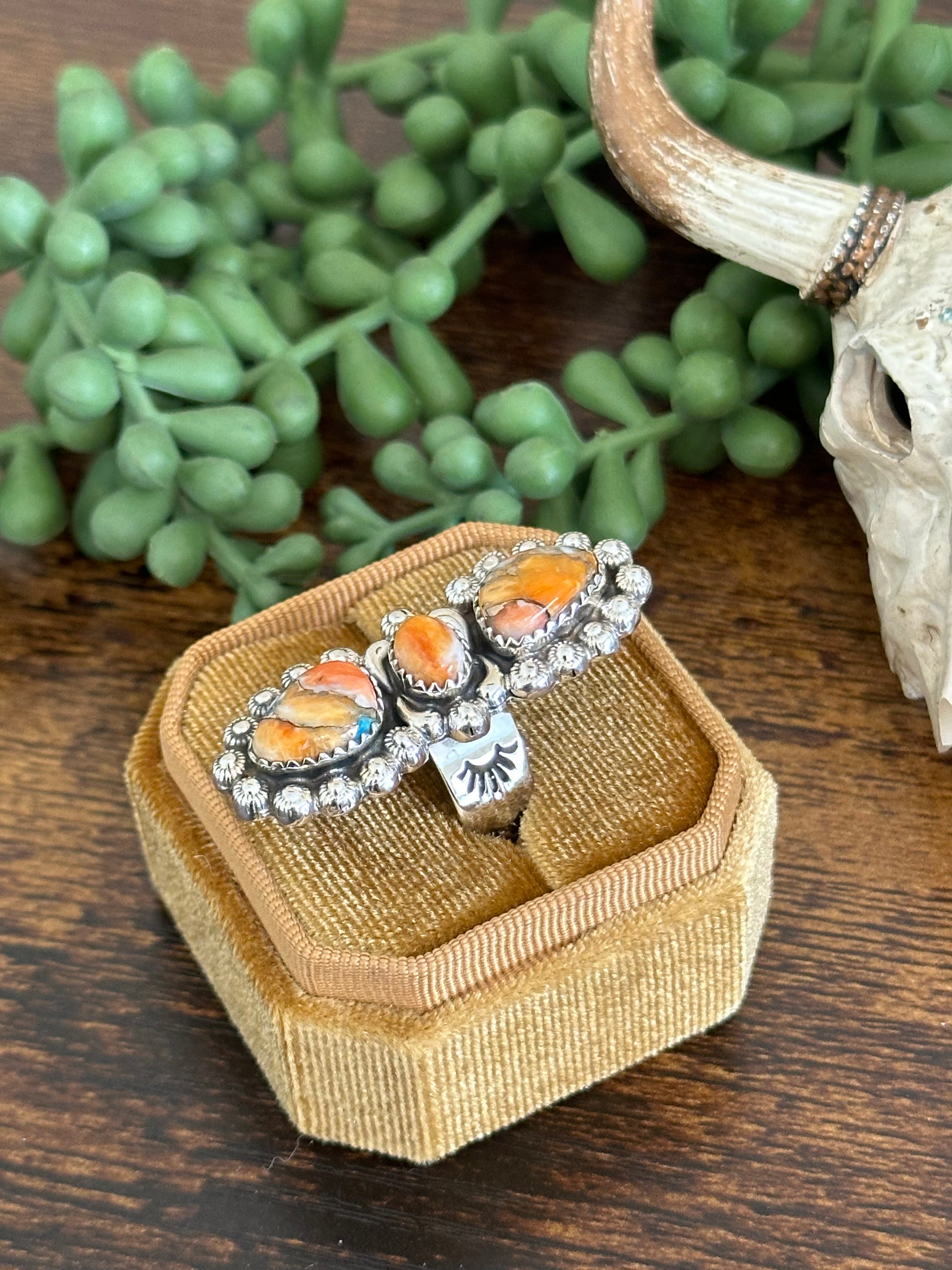 Beautiful climber ring. Southwest Handmade Mohave Turquoise & Sterling Silver Adjustable Ring. It measures just over 1 1/2 inches long and 5/8 an inch wide. Signed by the artist and stamped sterling silver.