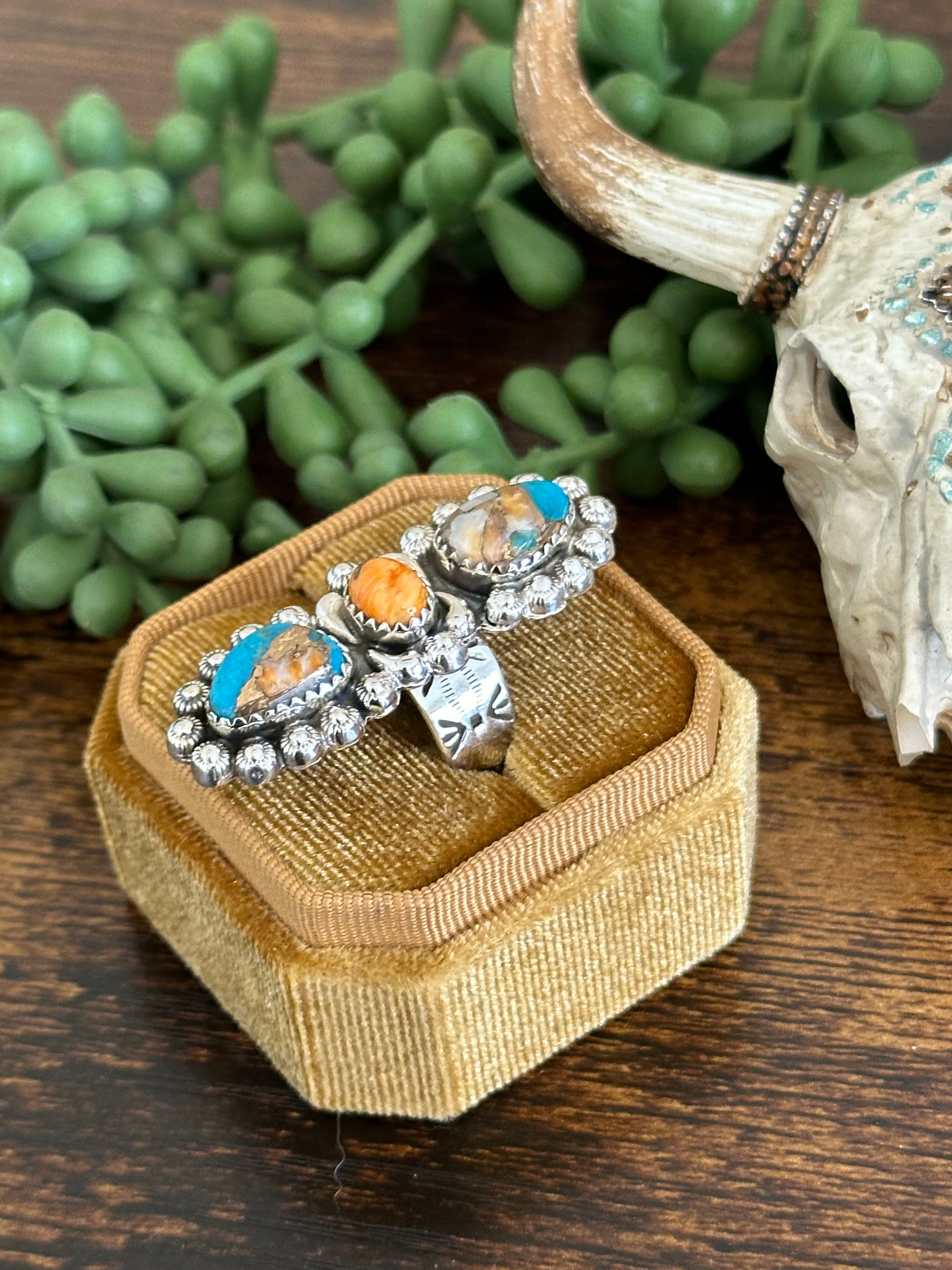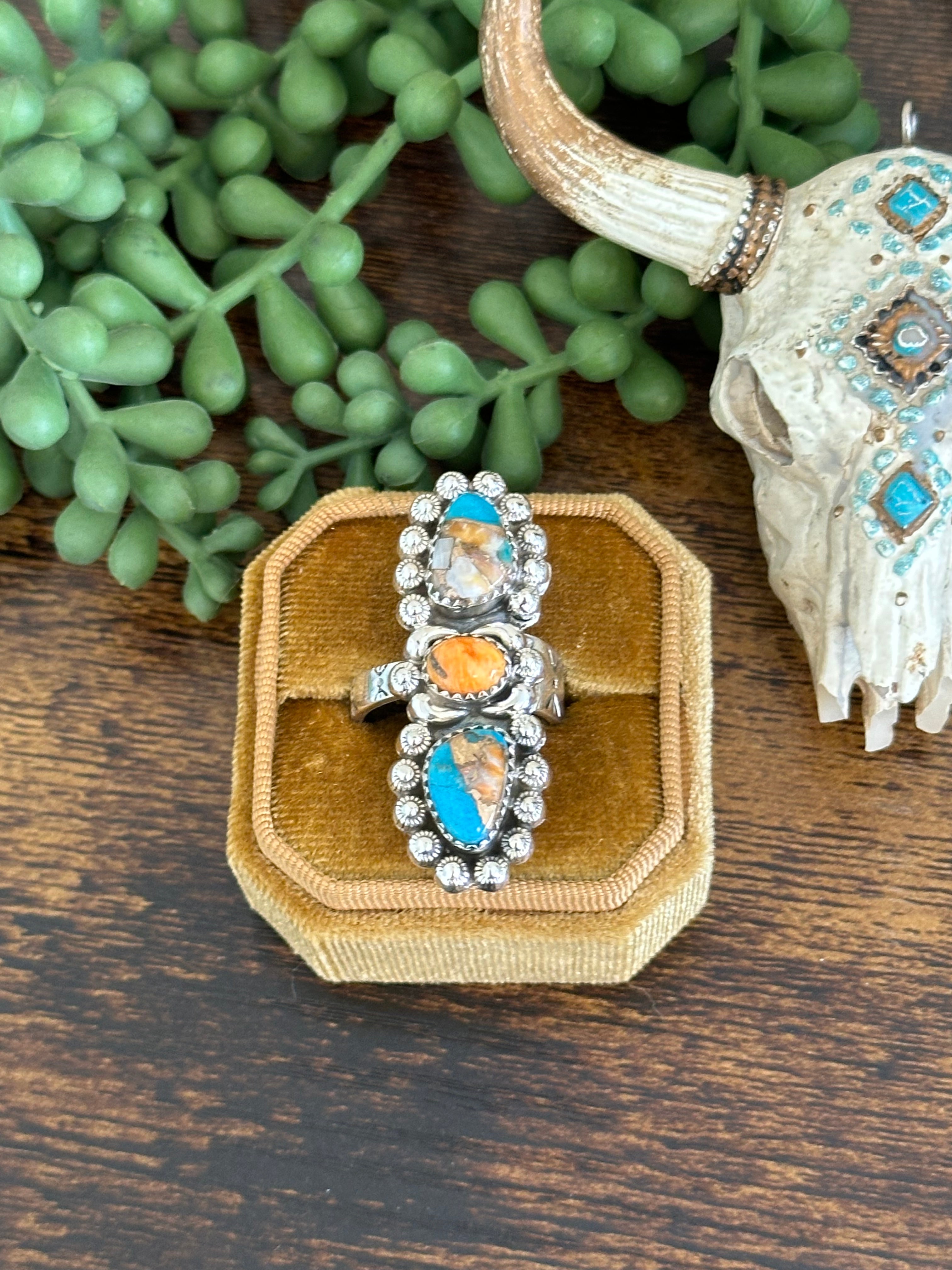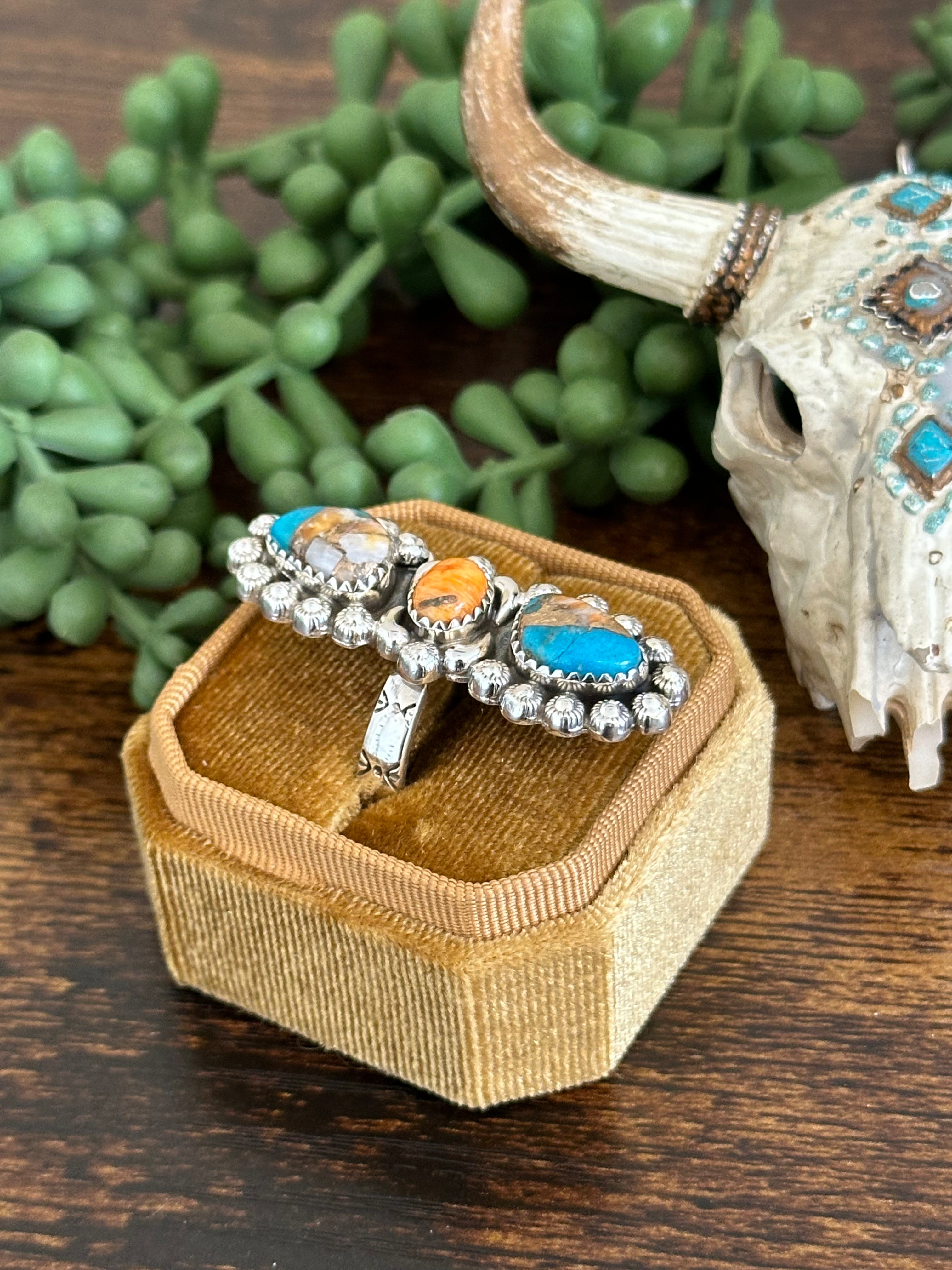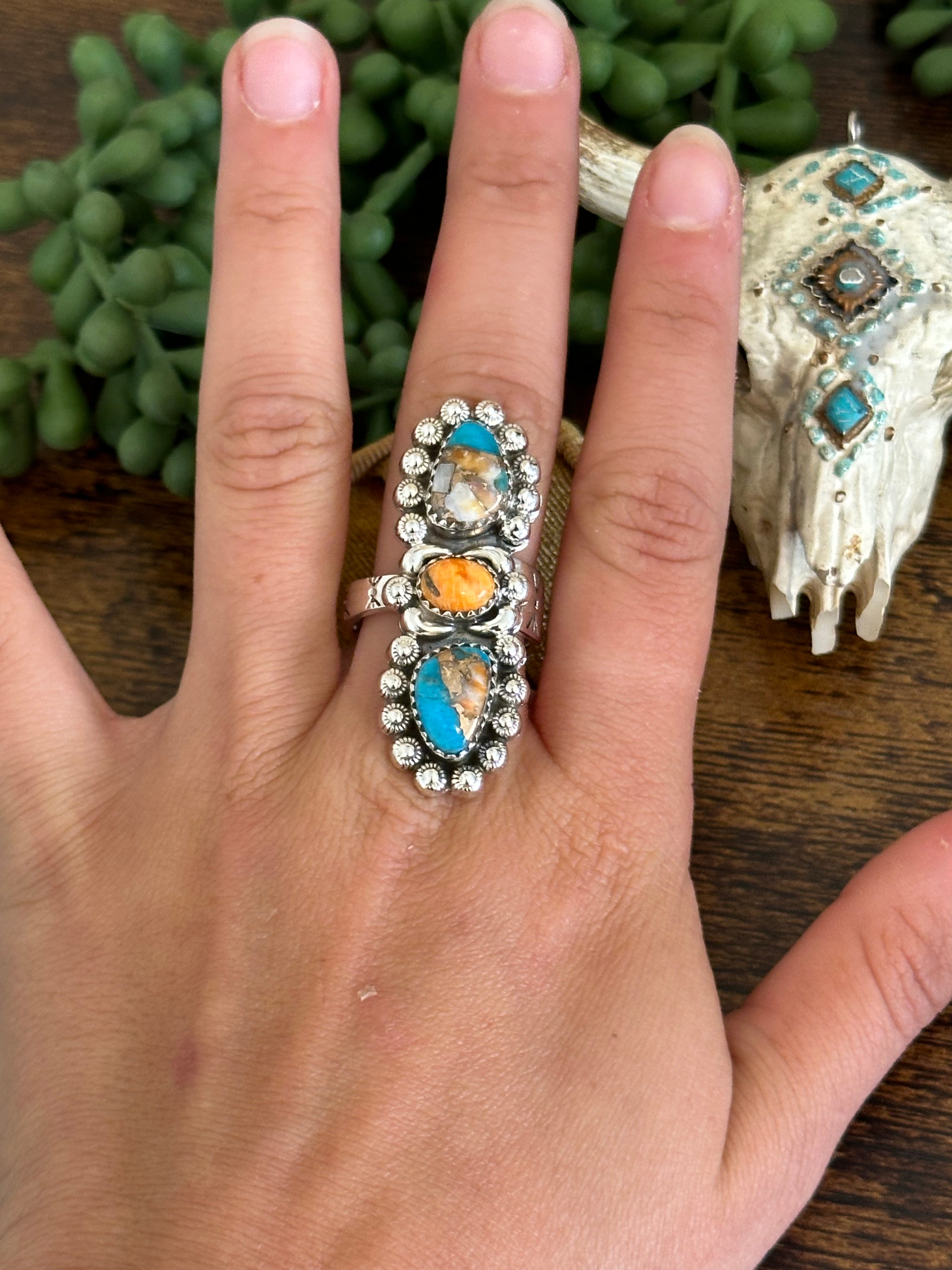 Beautiful climber ring. Southwest Handmade Mohave Turquoise & Sterling Silver Adjustable Ring. It measures just over 1 1/2 inches long and 5/8 an inch wide. Signed by the artist and stamped sterling silver.