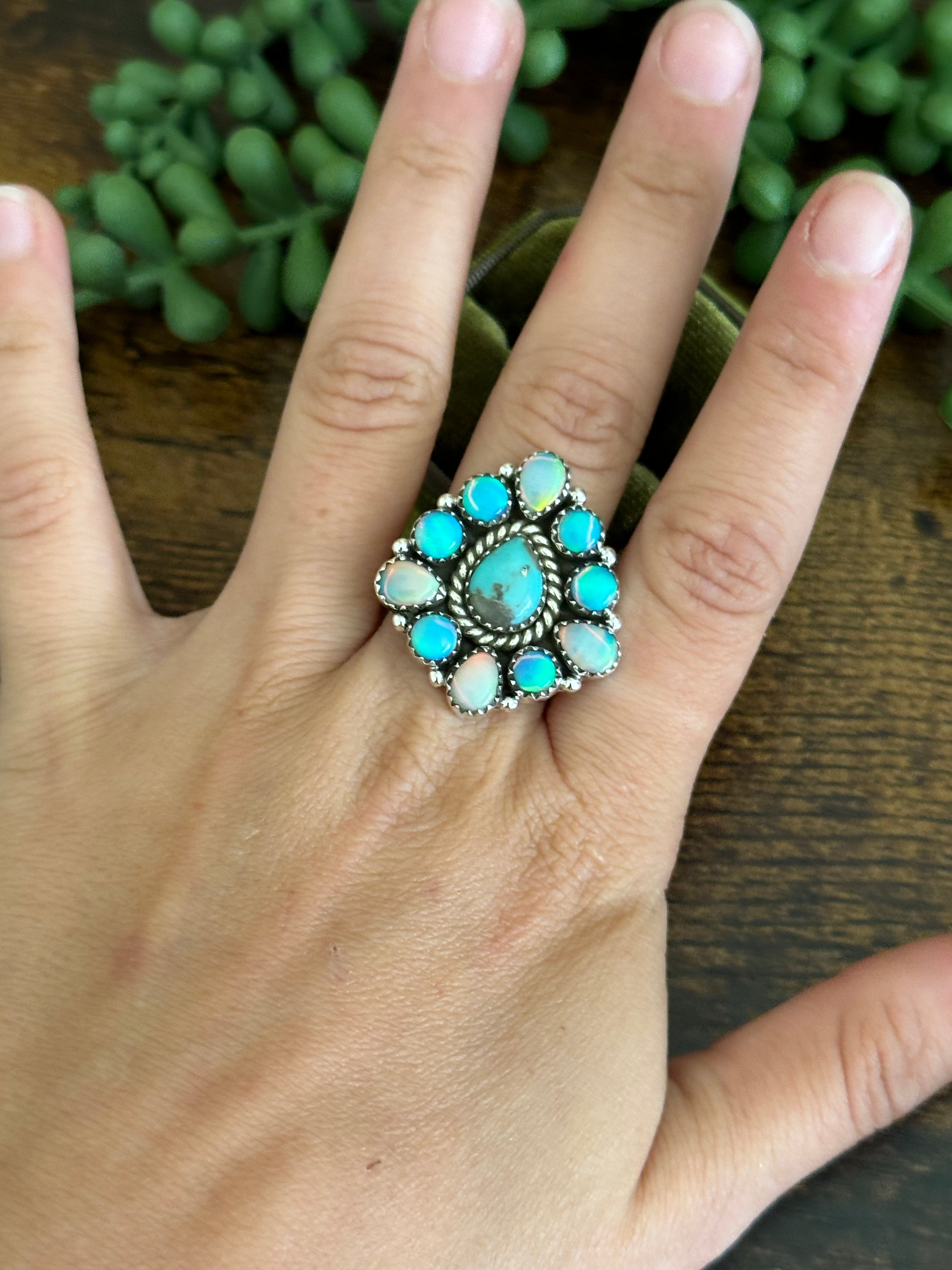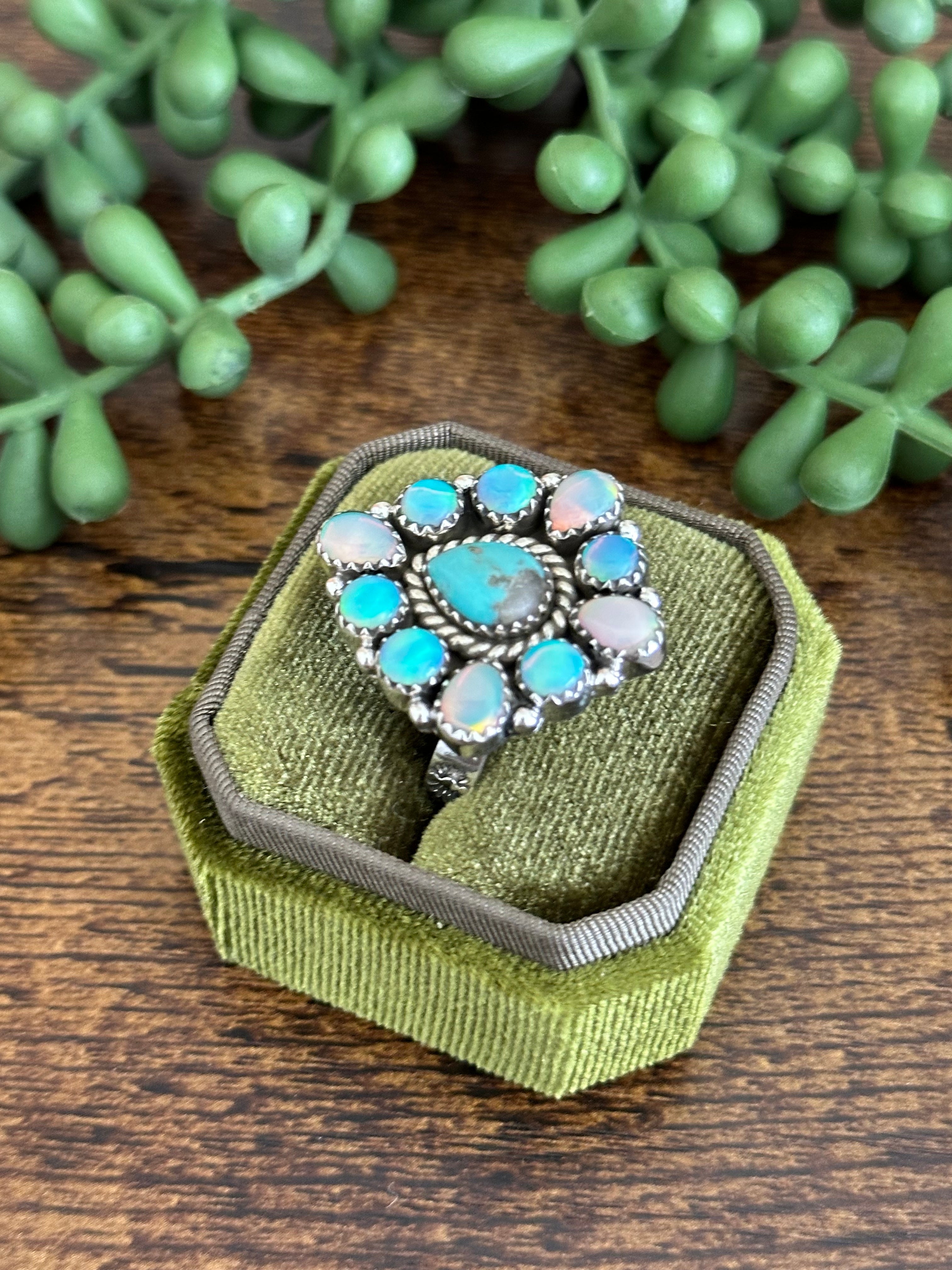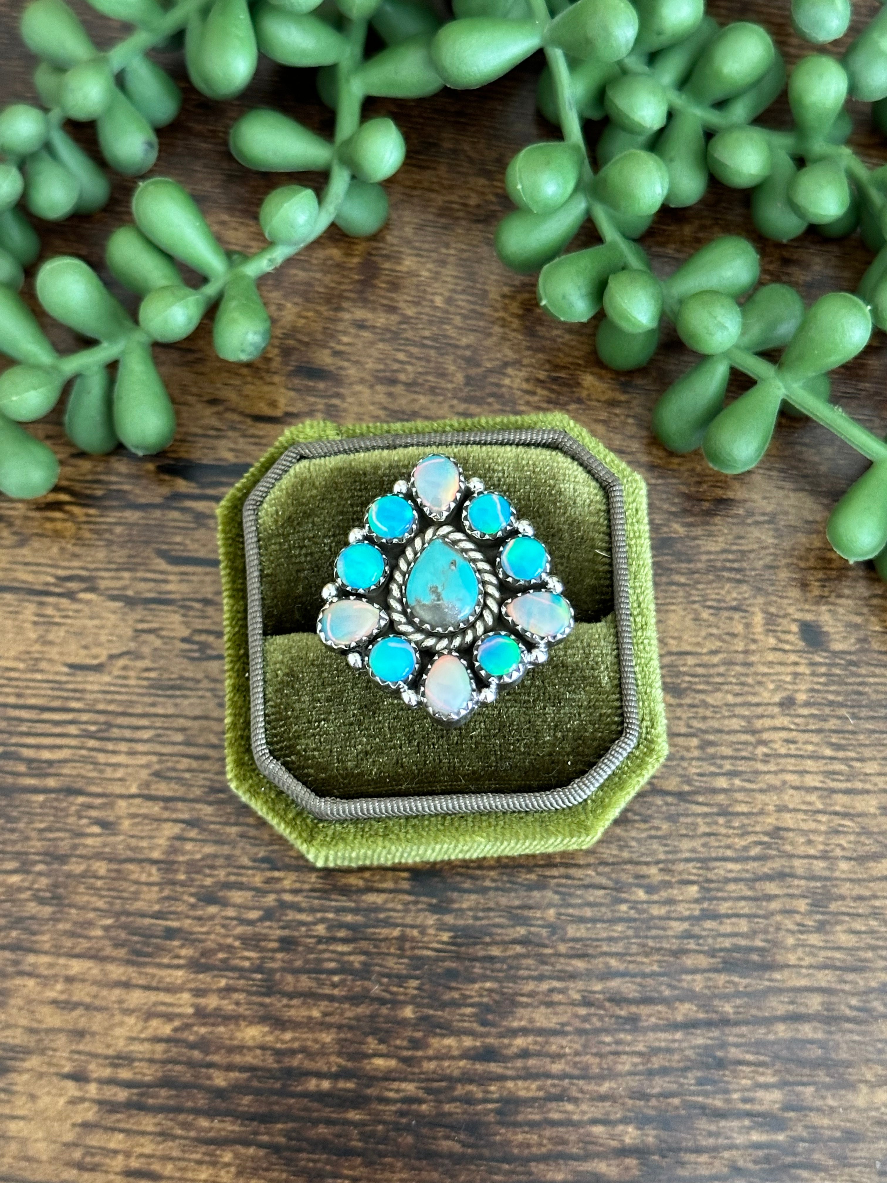Beautiful cluster ring. Southwest Handmade Multi Stone & Sterling Silver Adjustable Cluster Ring. It measures 1 1/4 inches long and 1 1/8 inches wide. Signed by the artist and stamped sterling silver.