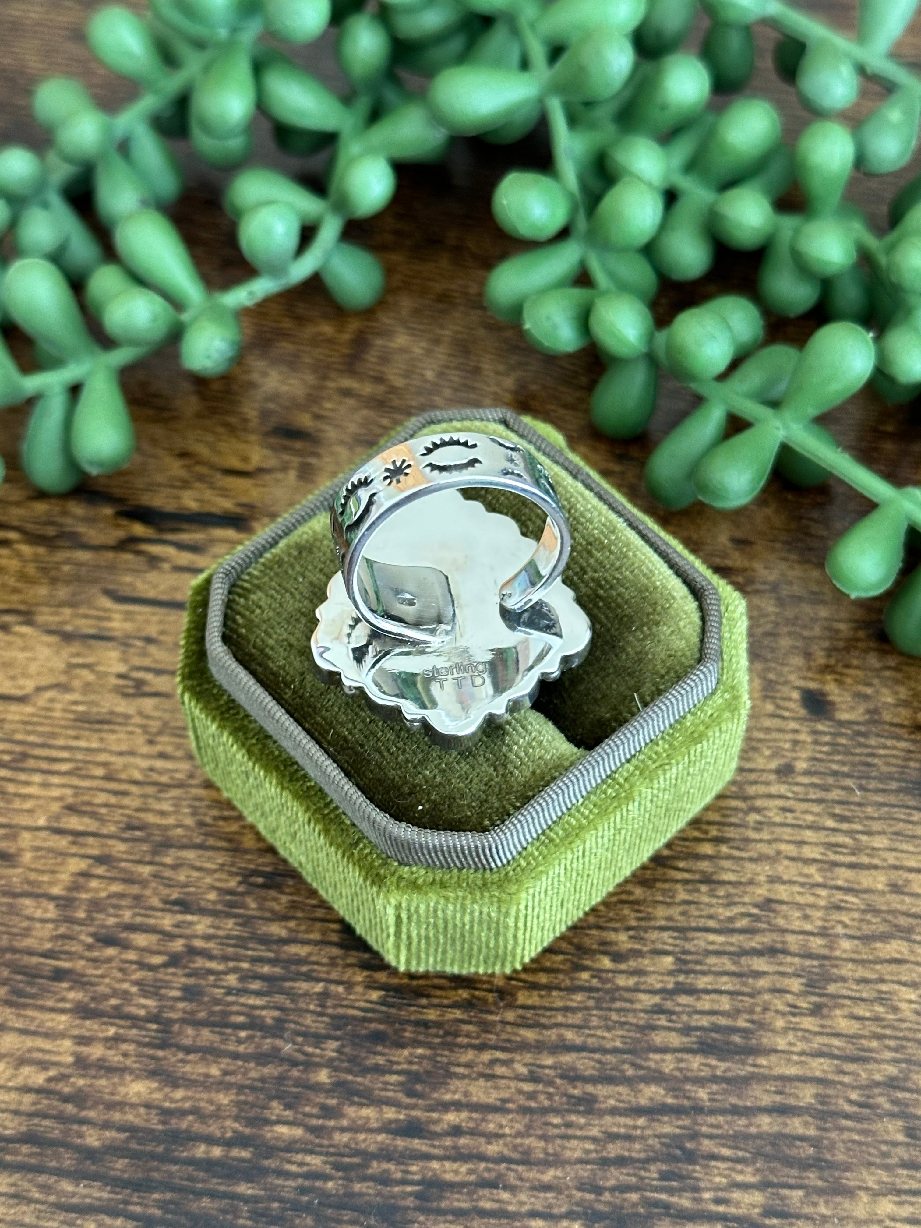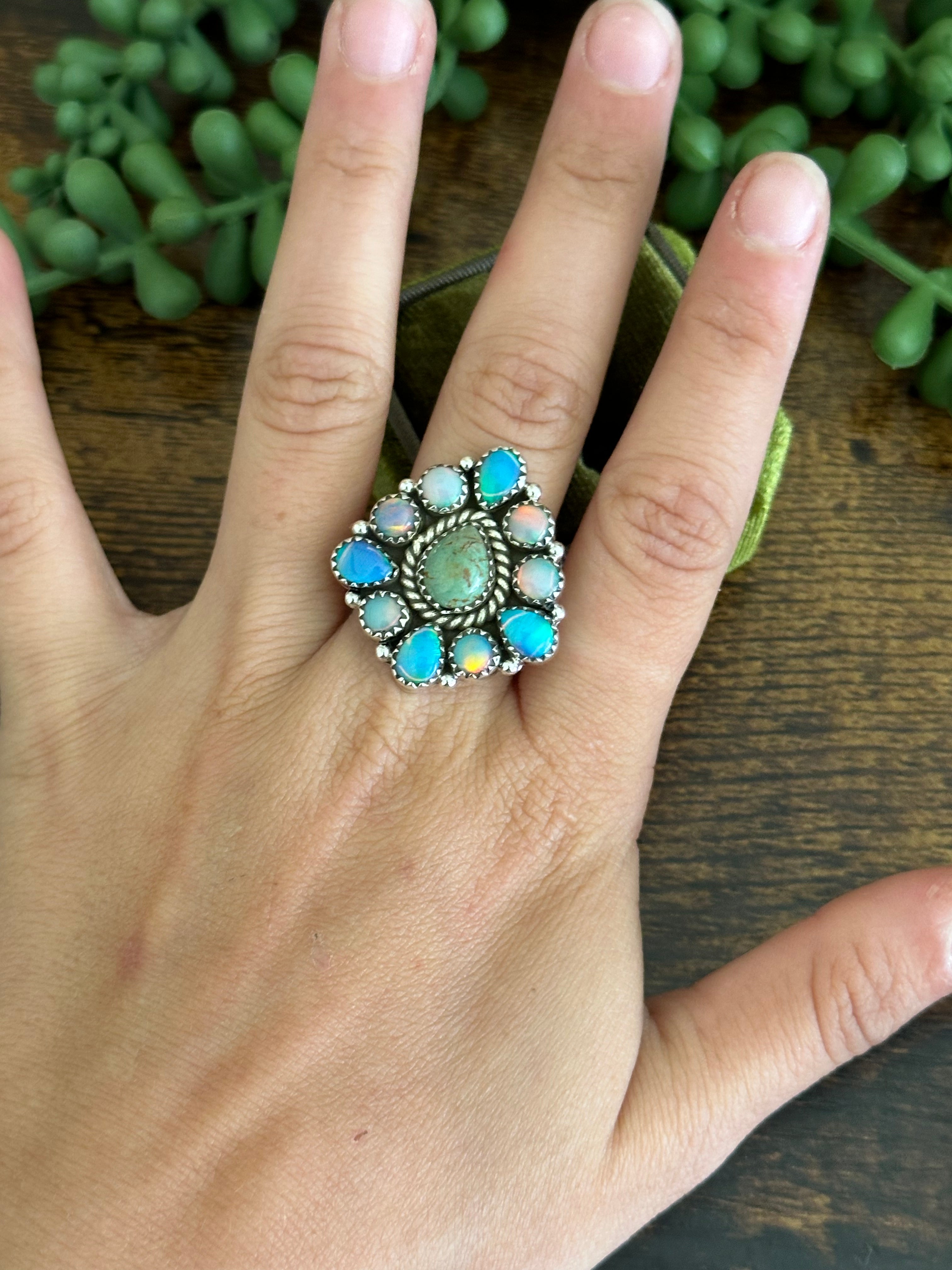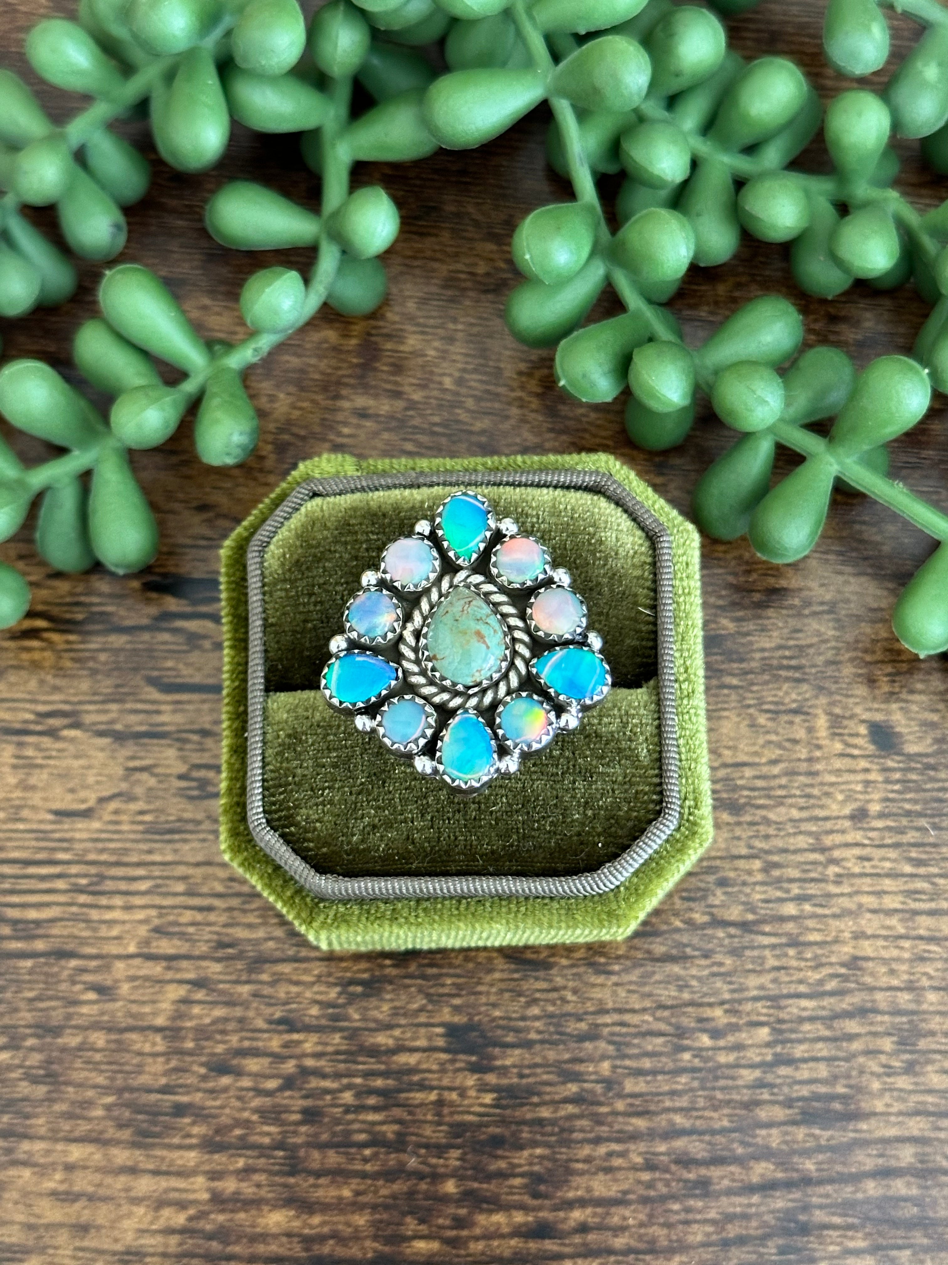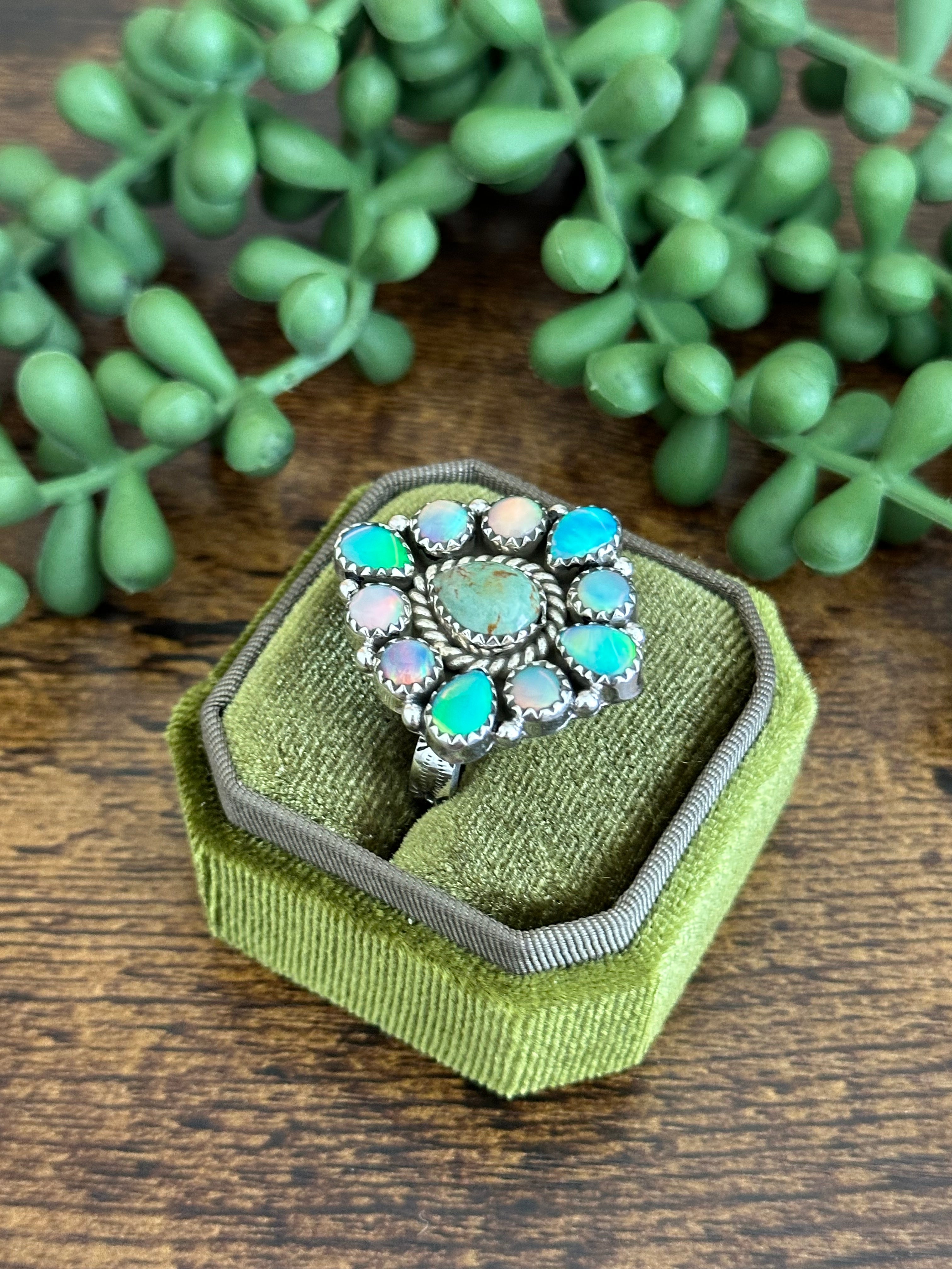 Beautiful cluster ring. Southwest Handmade Multi Stone & Sterling Silver Adjustable Cluster Ring. It measures 1 1/4 inches long and 1 1/8 inches wide. Signed by the artist and stamped sterling silver.