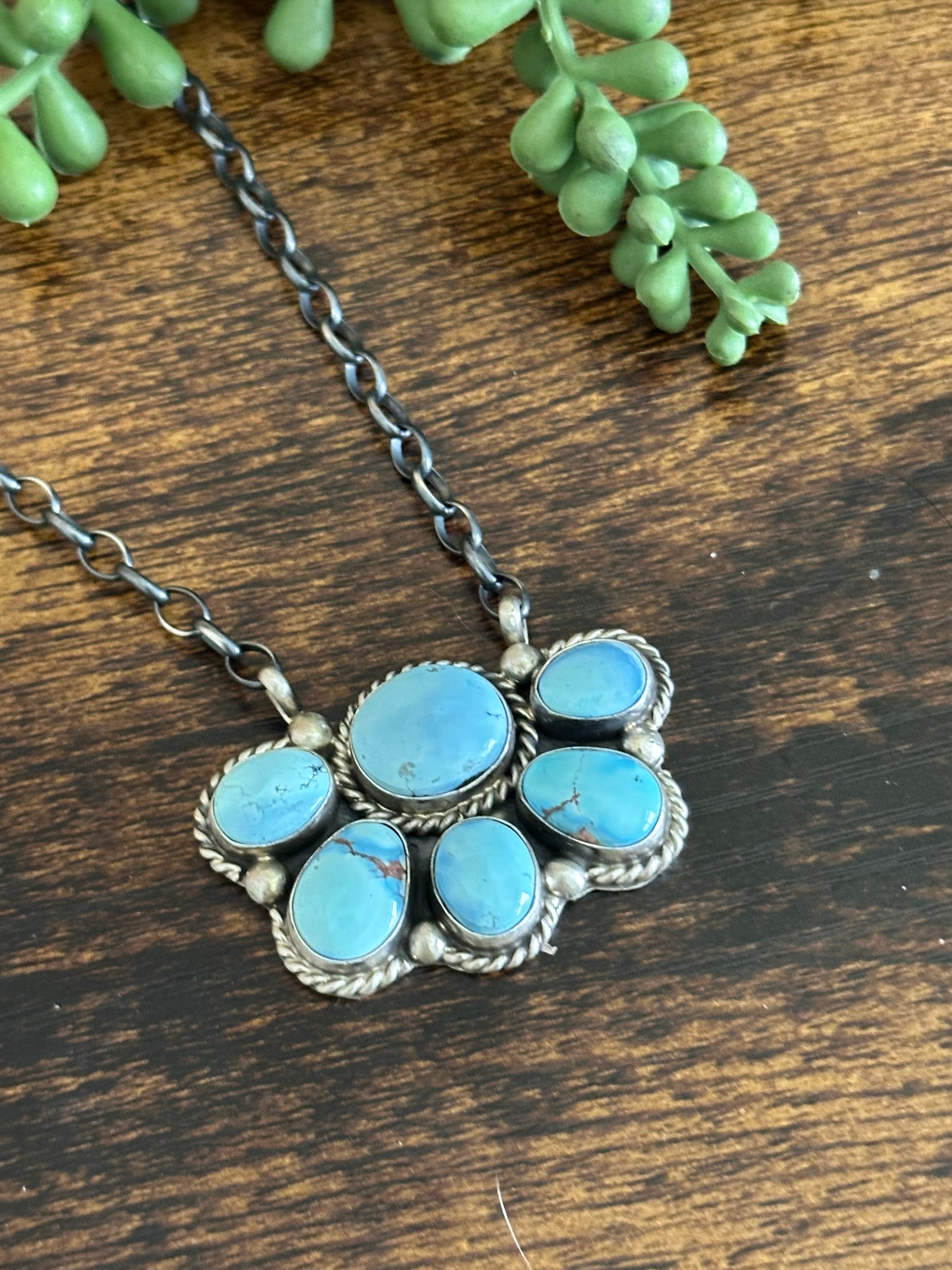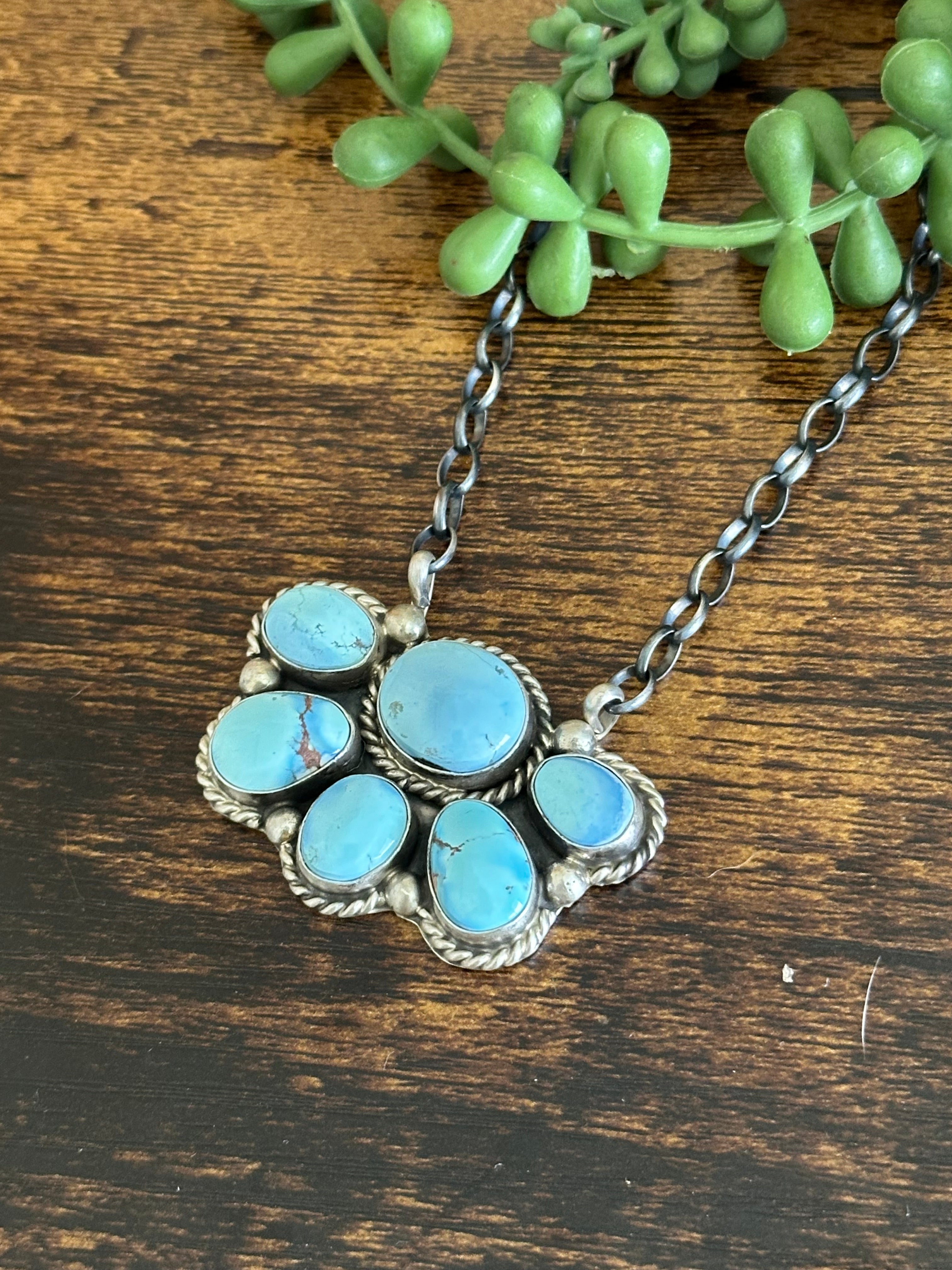 Beautiful necklace. Augustine Largo Golden Hills Turquoise & Sterling Silver Necklace. It measures 18 1/2 inches long with hang while the chain by itself measures 16 inches long. Signed by the artist and stamped sterling silver.