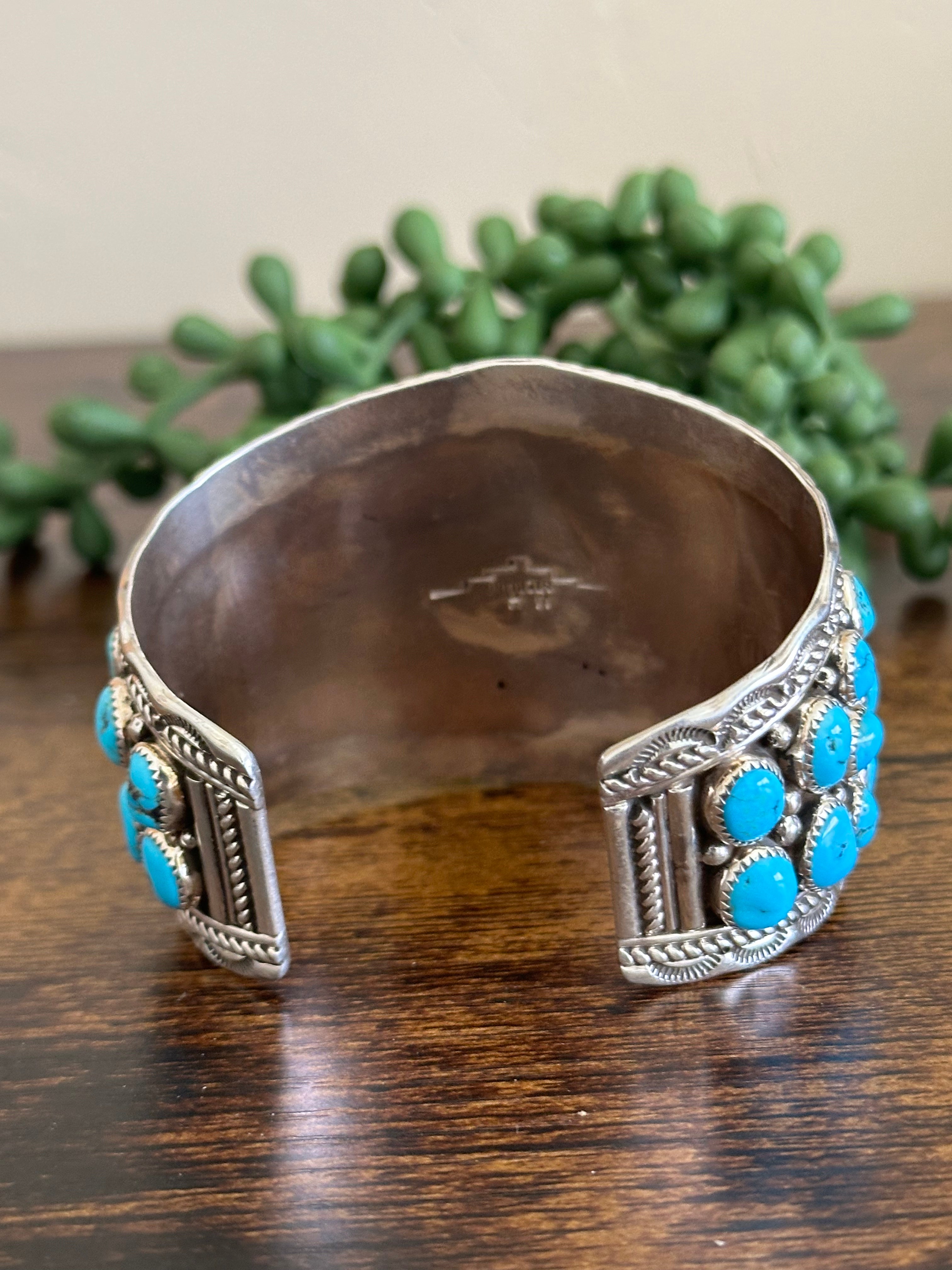 Merle House Kingman Turquoise & Sterling Silver Cuff Bracelet. It measures 2 1/8 inches wide with an inside circumference of 5 7/8 inches and a gap of just over 1 1/8 inches. Signed by artist and stamped sterling silver.