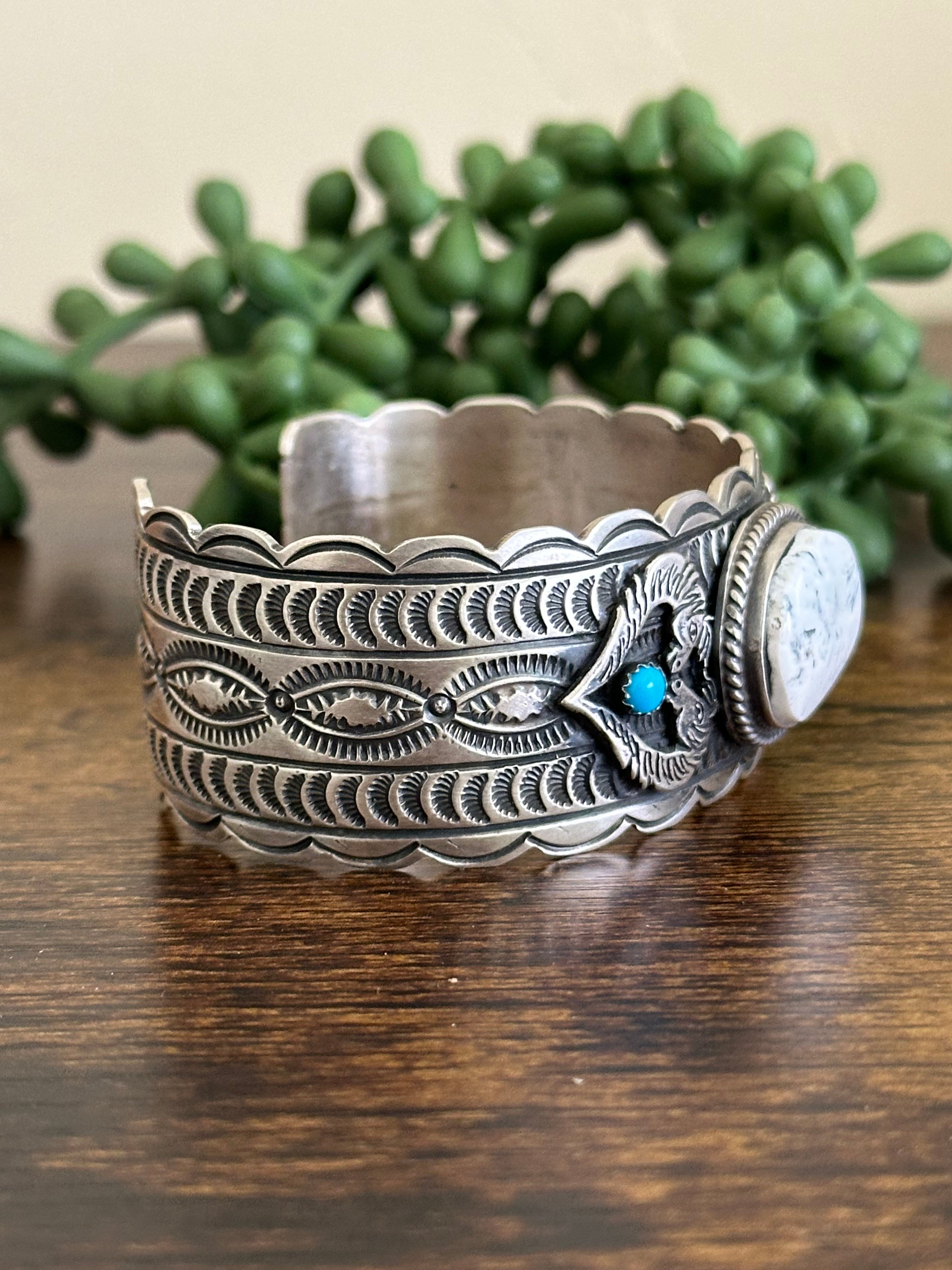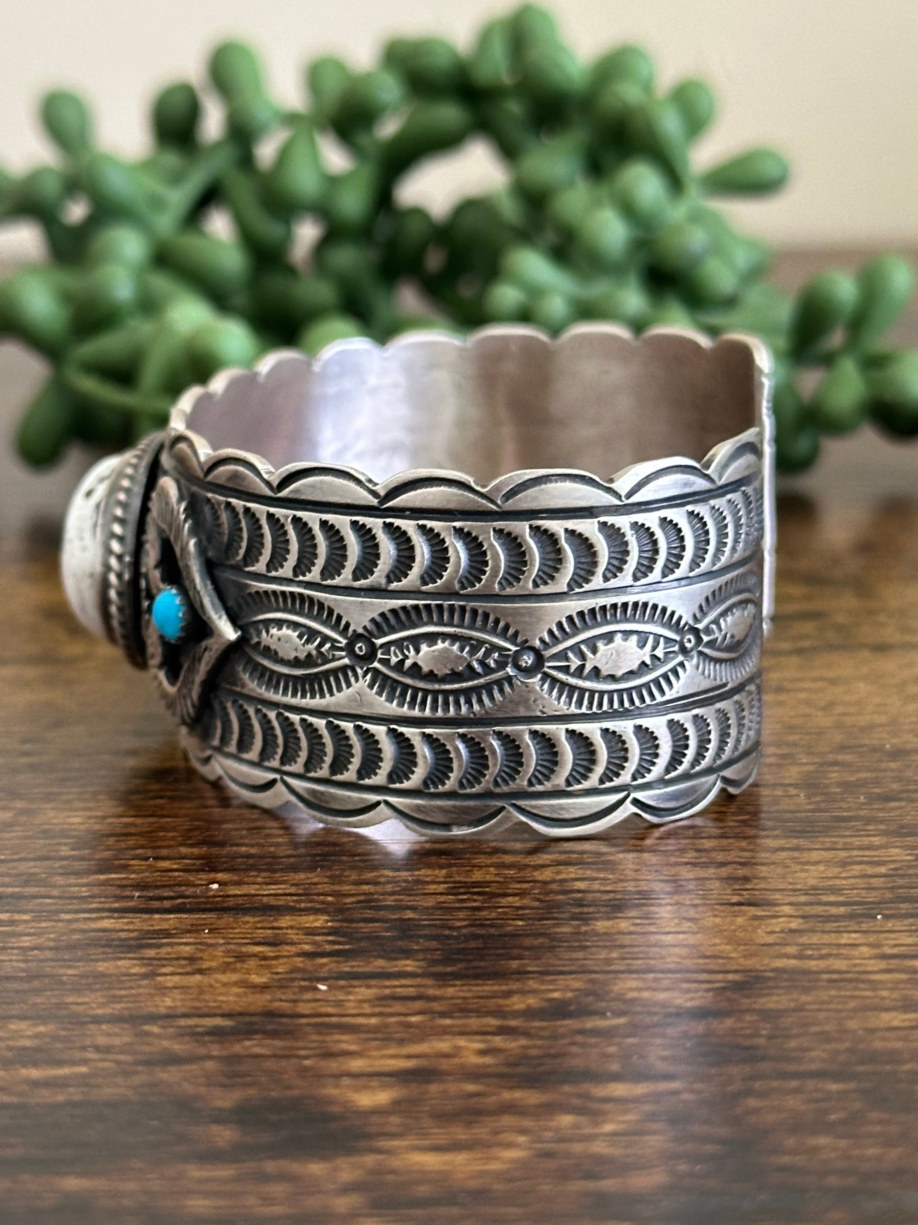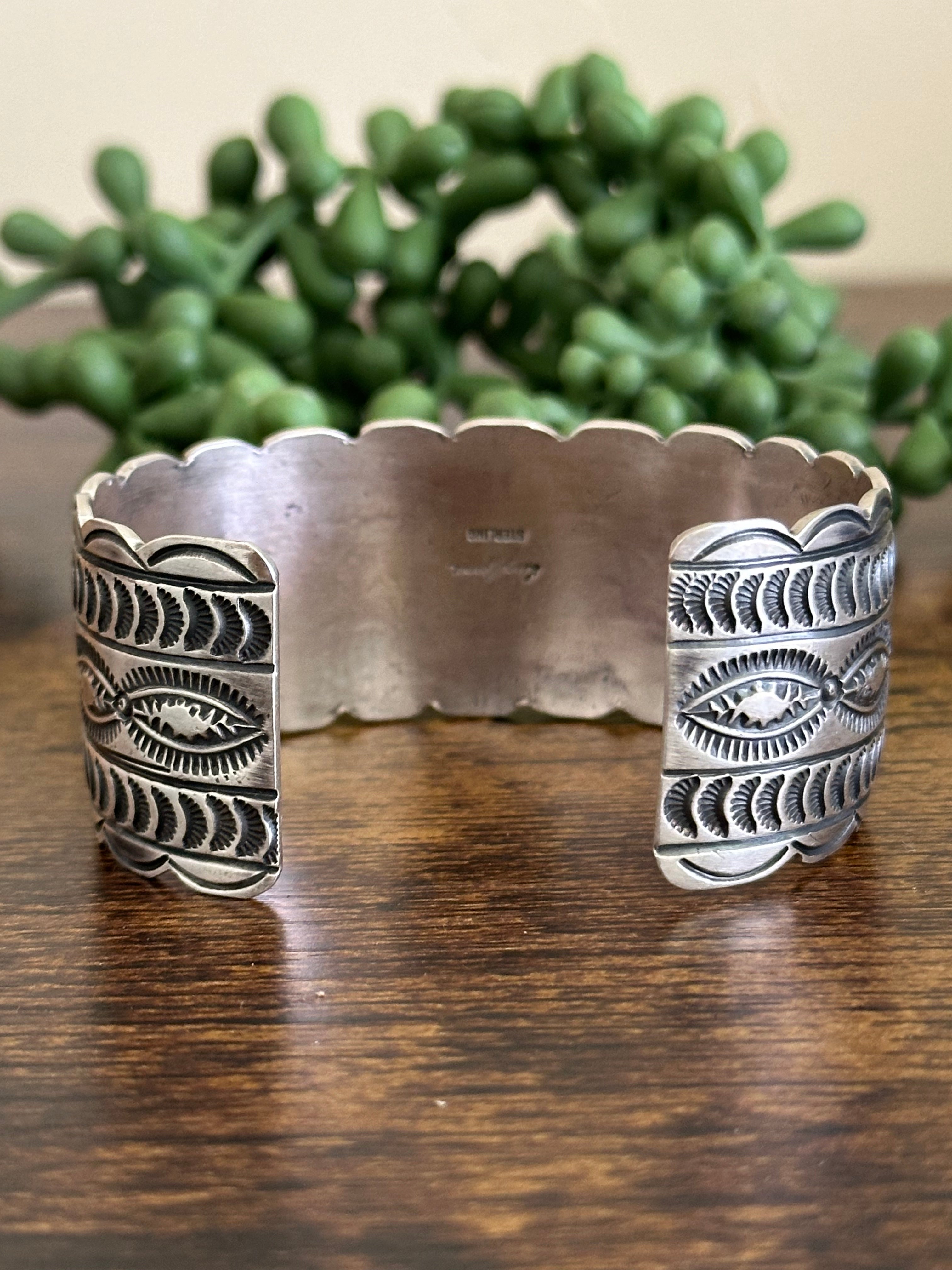 Leroy James Multi Stone & Sterling Silver Cuff Bracelet. It measures 1 1/8 inches wide with an inside circumference of 6 inches and a gap of just over 1 1/8 inches. Signed by artist and stamped sterling silver.