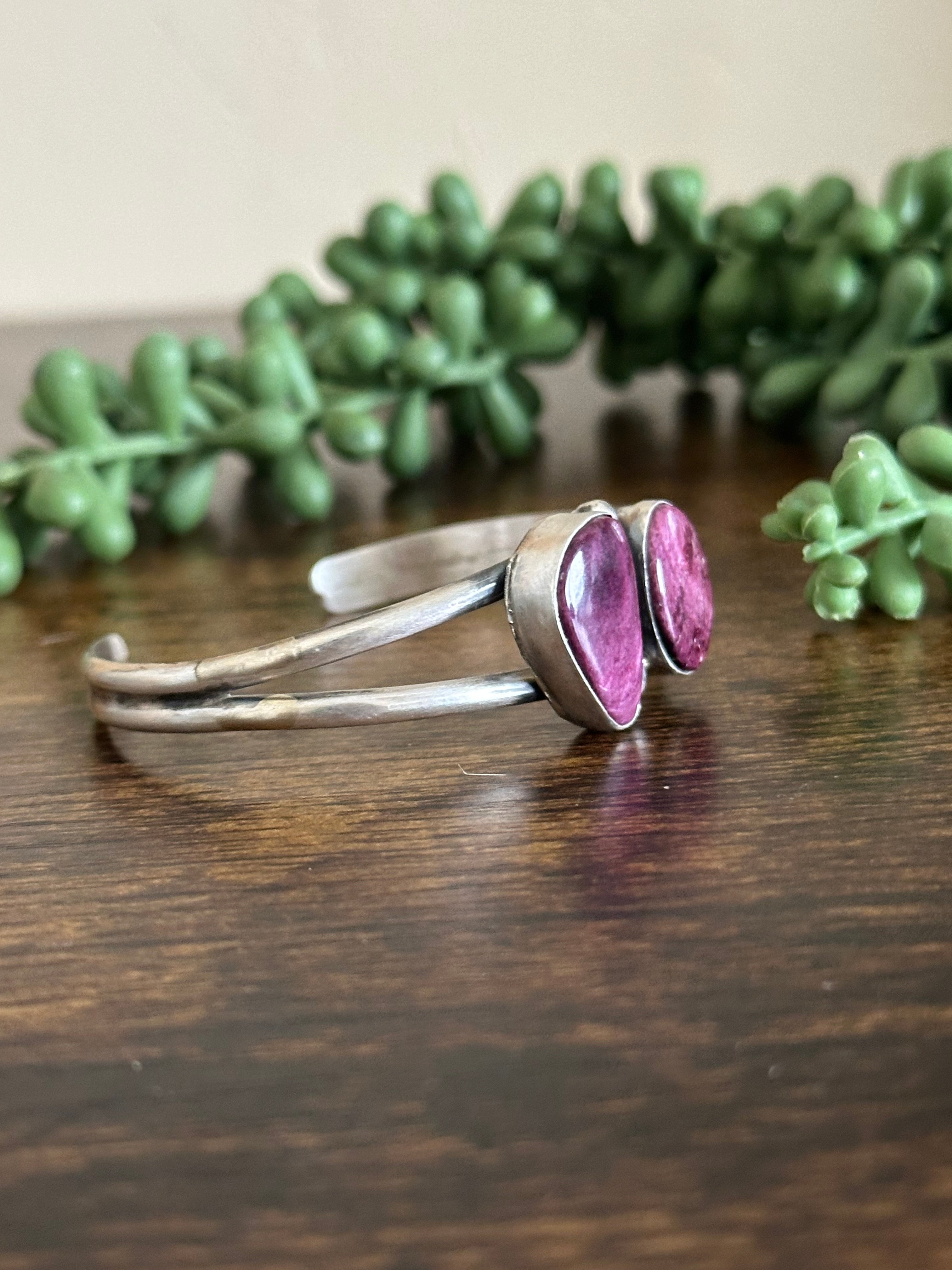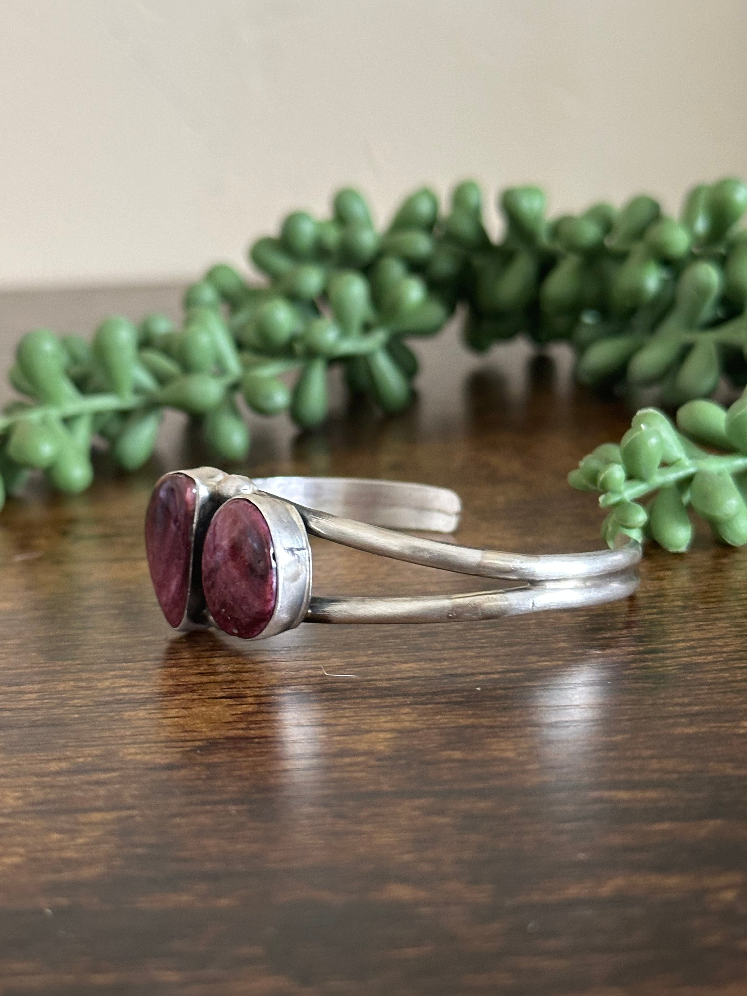 Augustine Largo Spiny Oyster & Sterling Silver Cuff Bracelet. It measures 7/8 of an inch wide with an inside circumference of 5 5/8inches and a gap of 1 1/4 inches. Signed by artist and stamped sterling silver.