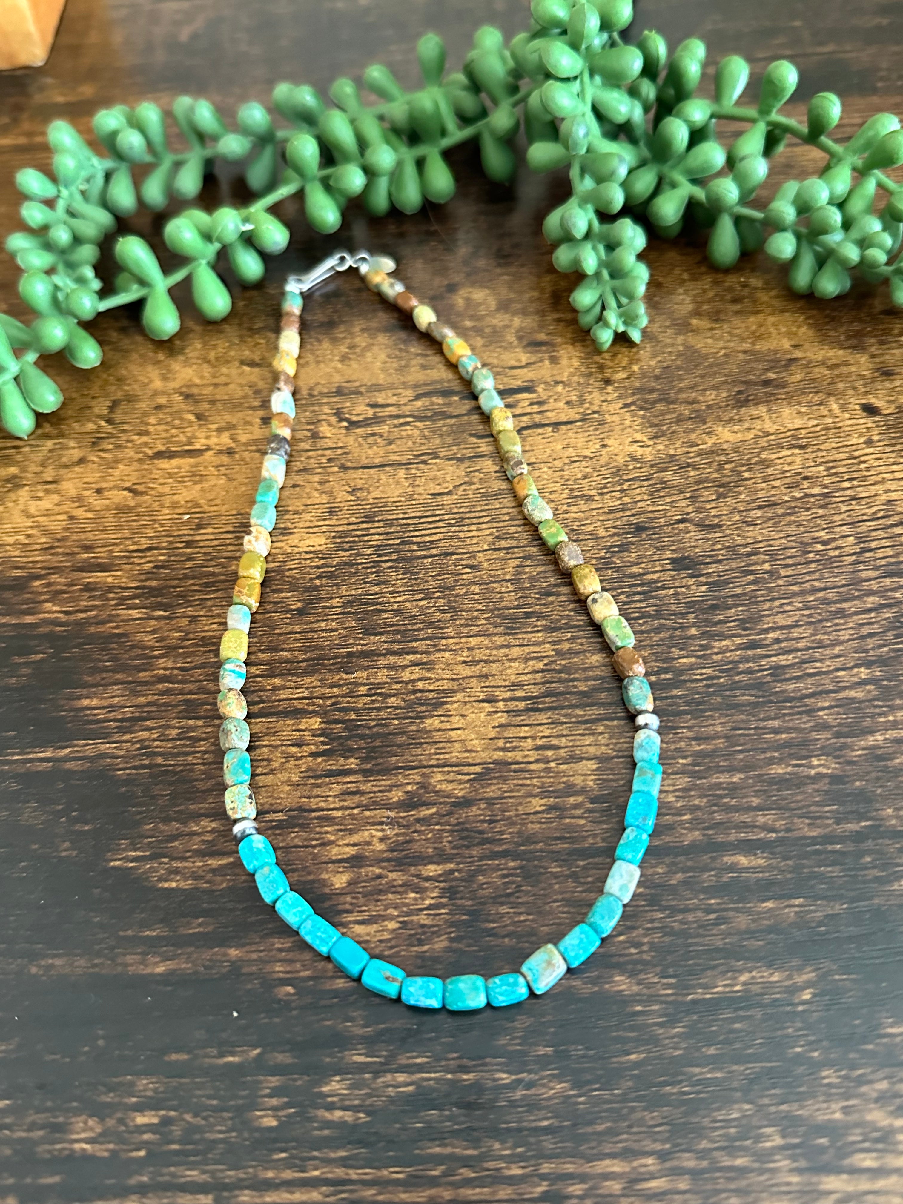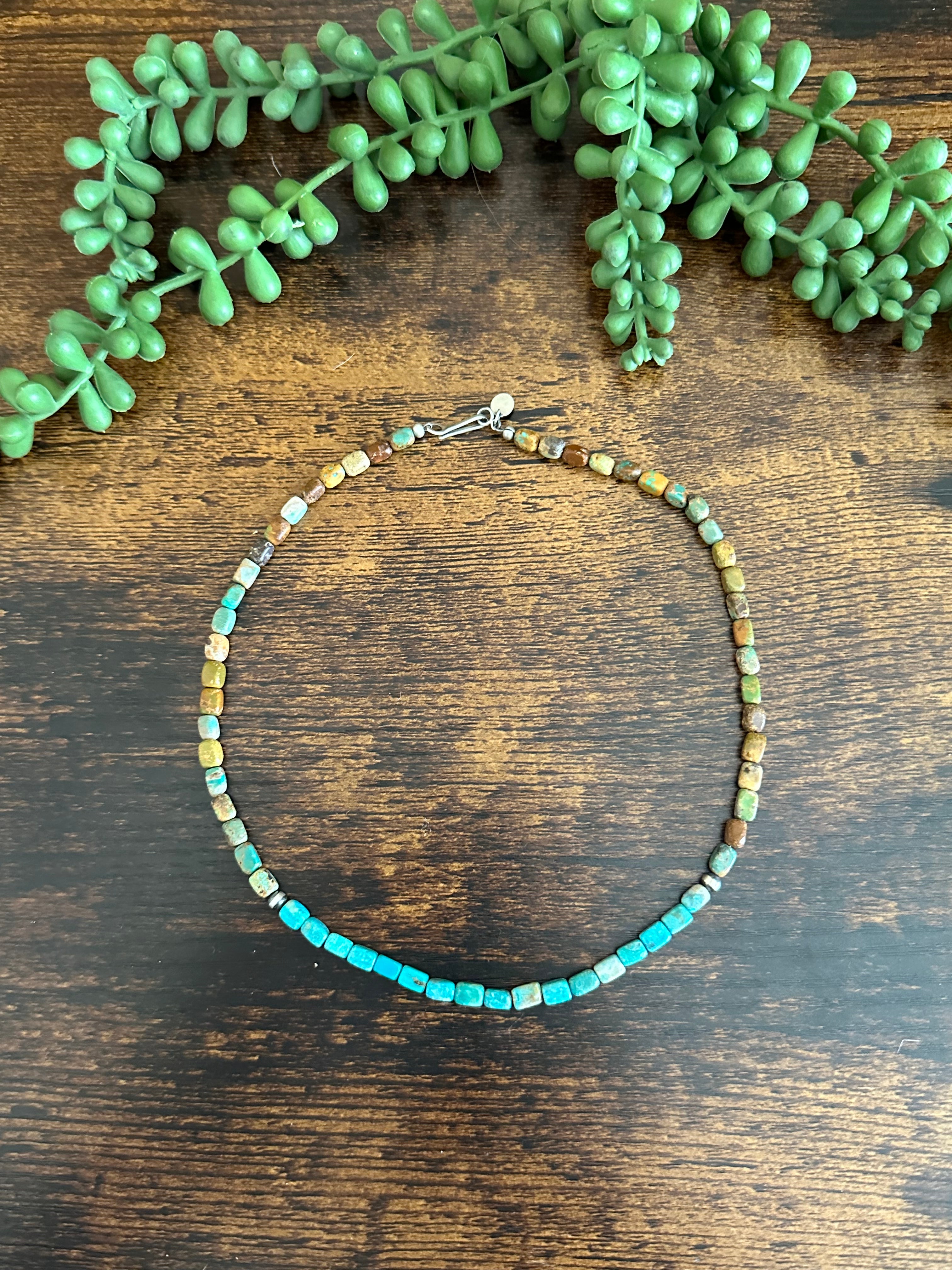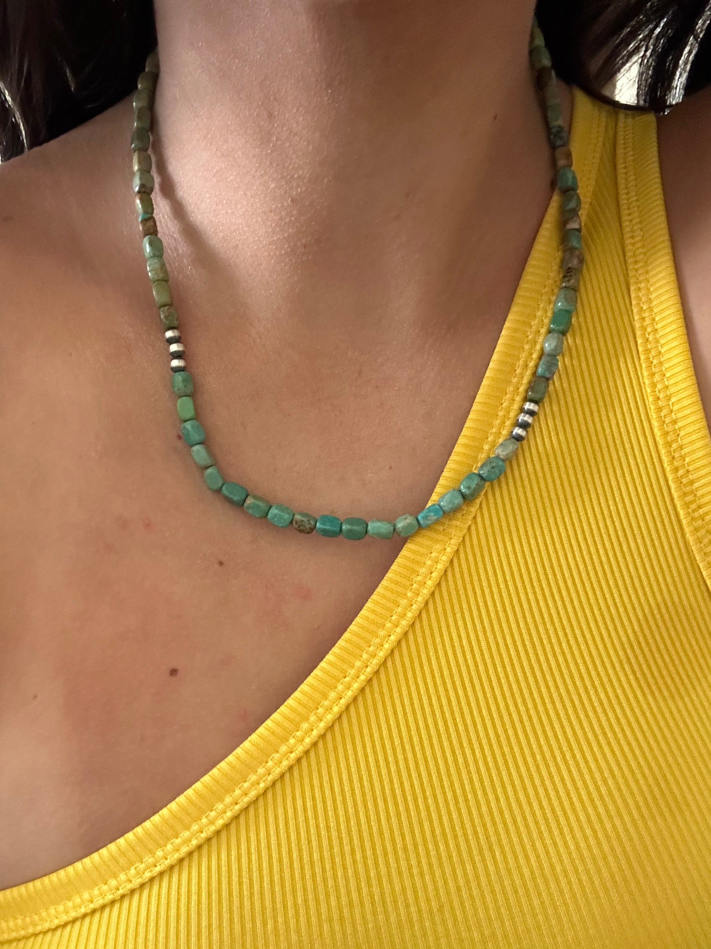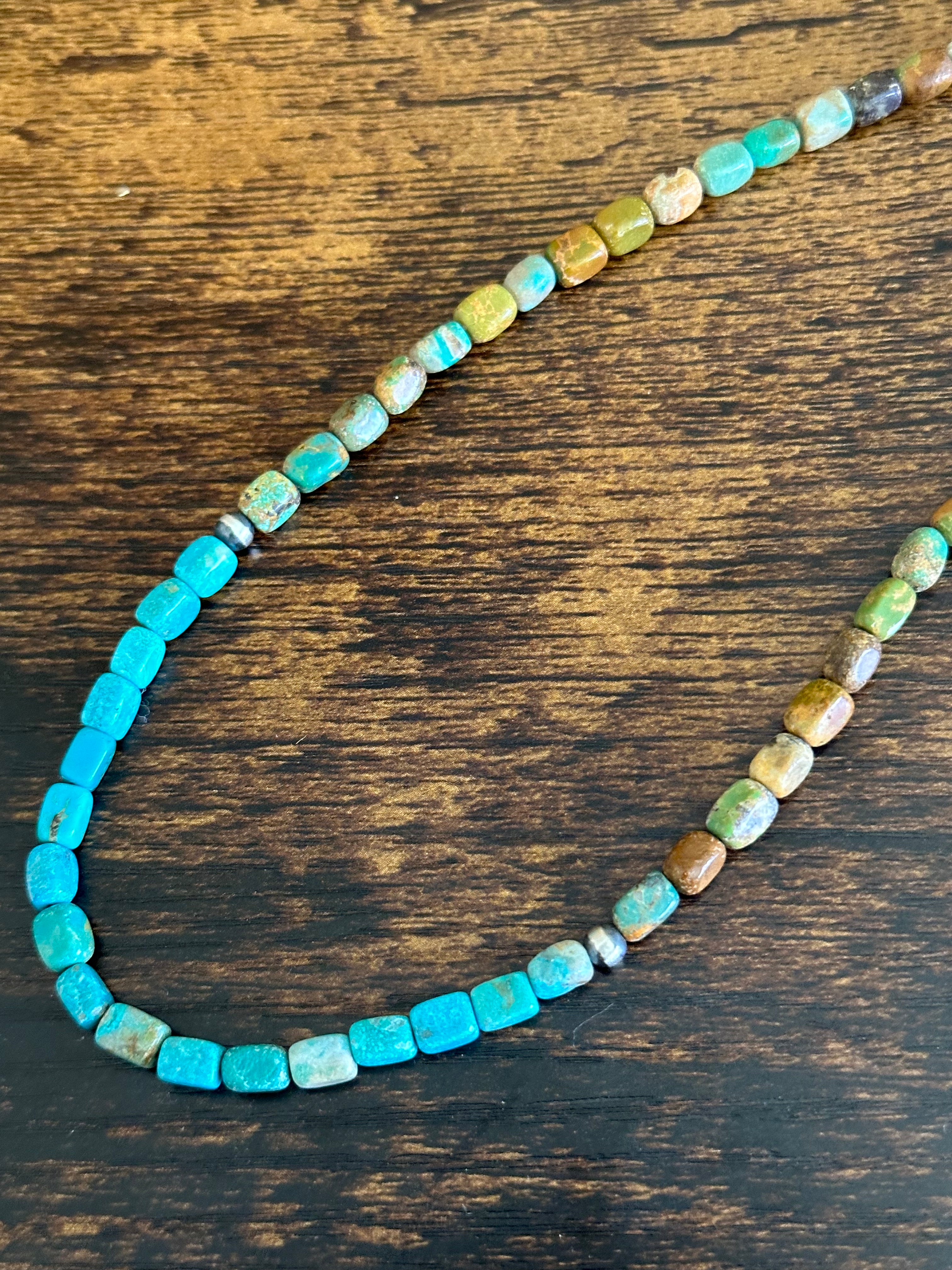Navajo Strung Royston Turquoise & Sterling Silver Pearls Beaded Necklace. It measures 18 inches long. Stones will differ due to natural stones.