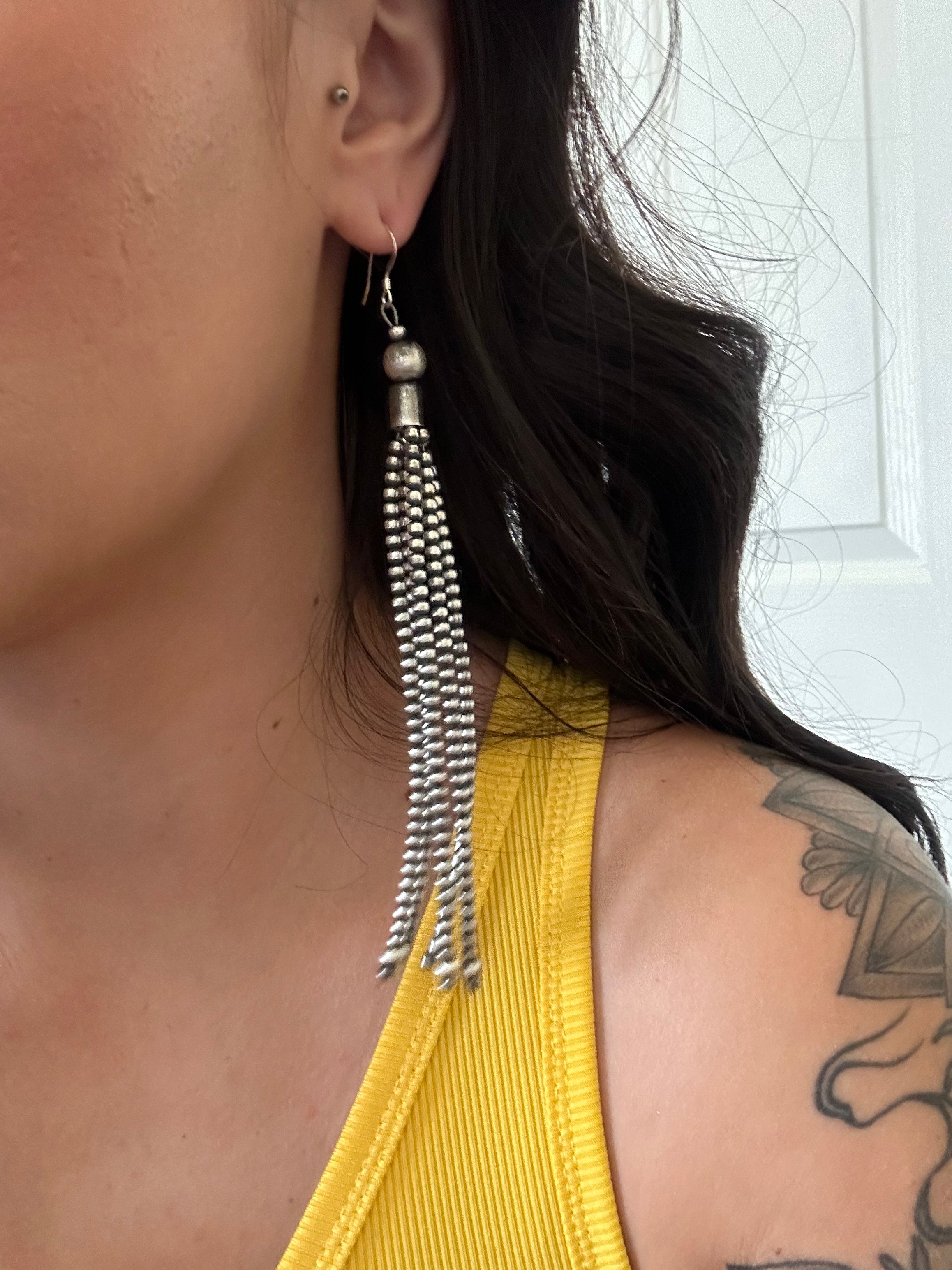 Have a spice in your everyday. Navajo Strung Sterling Silver Graduated Pearls Dangle Earrings. It measures 5 5/8 inches long.