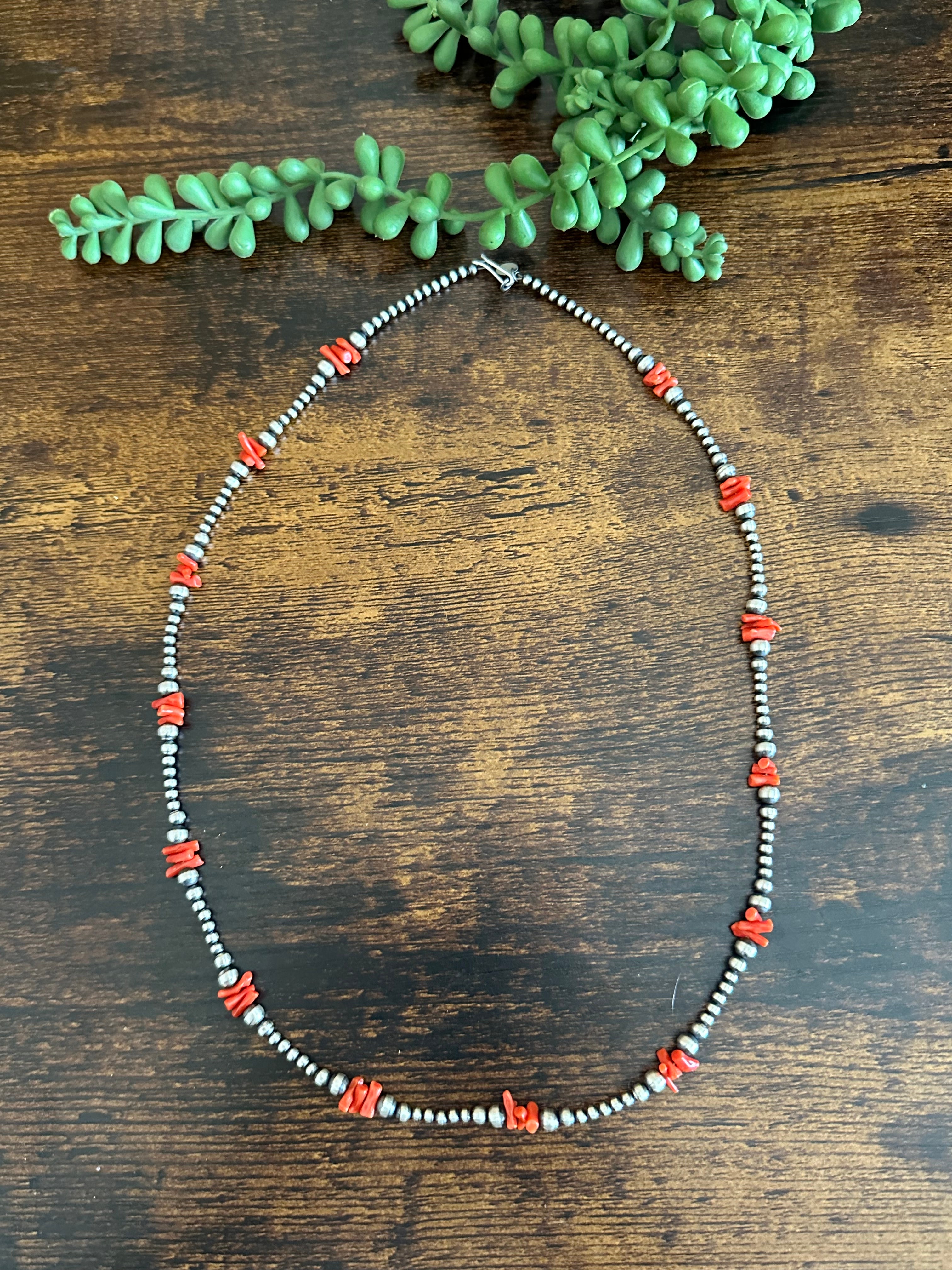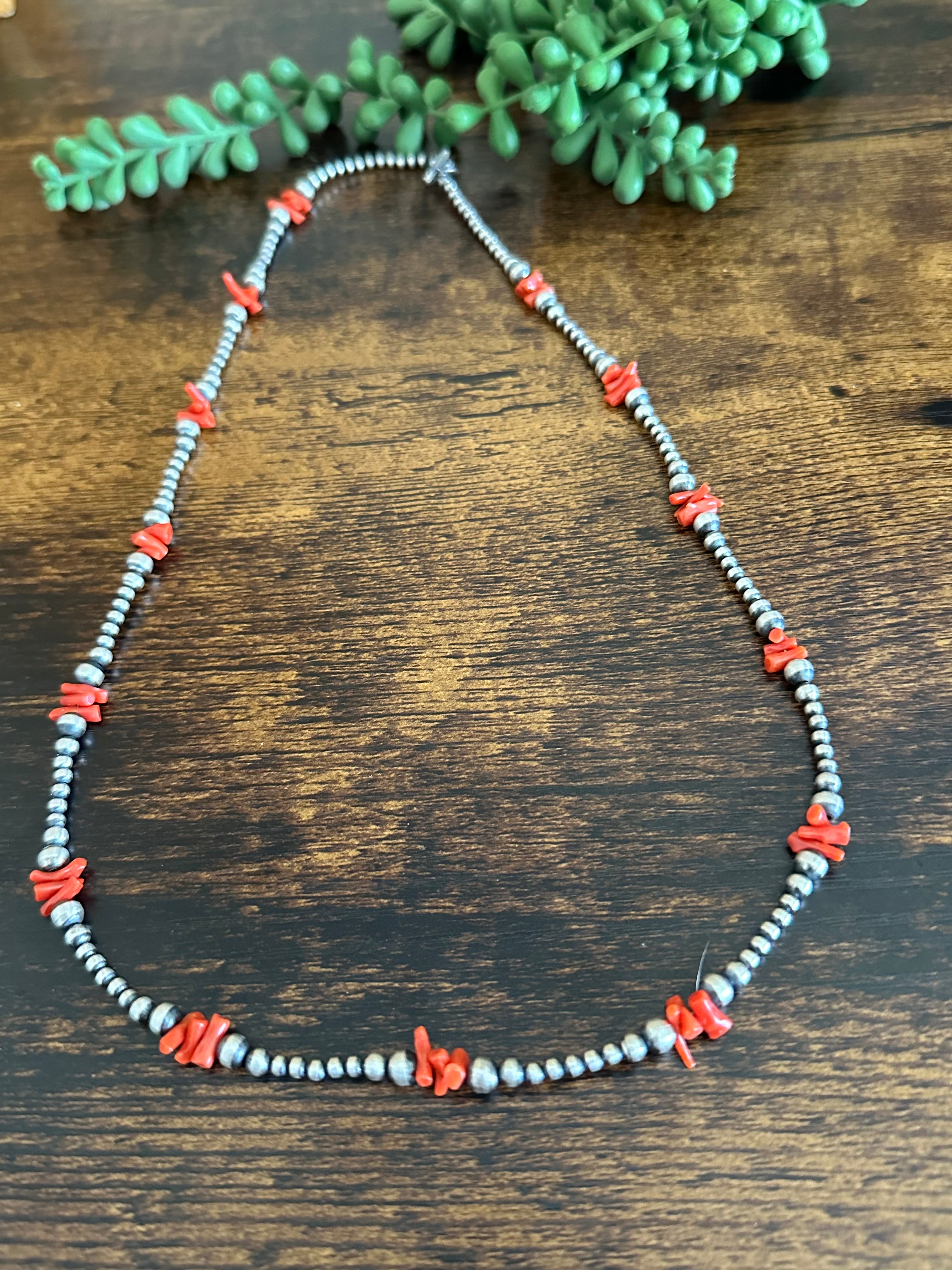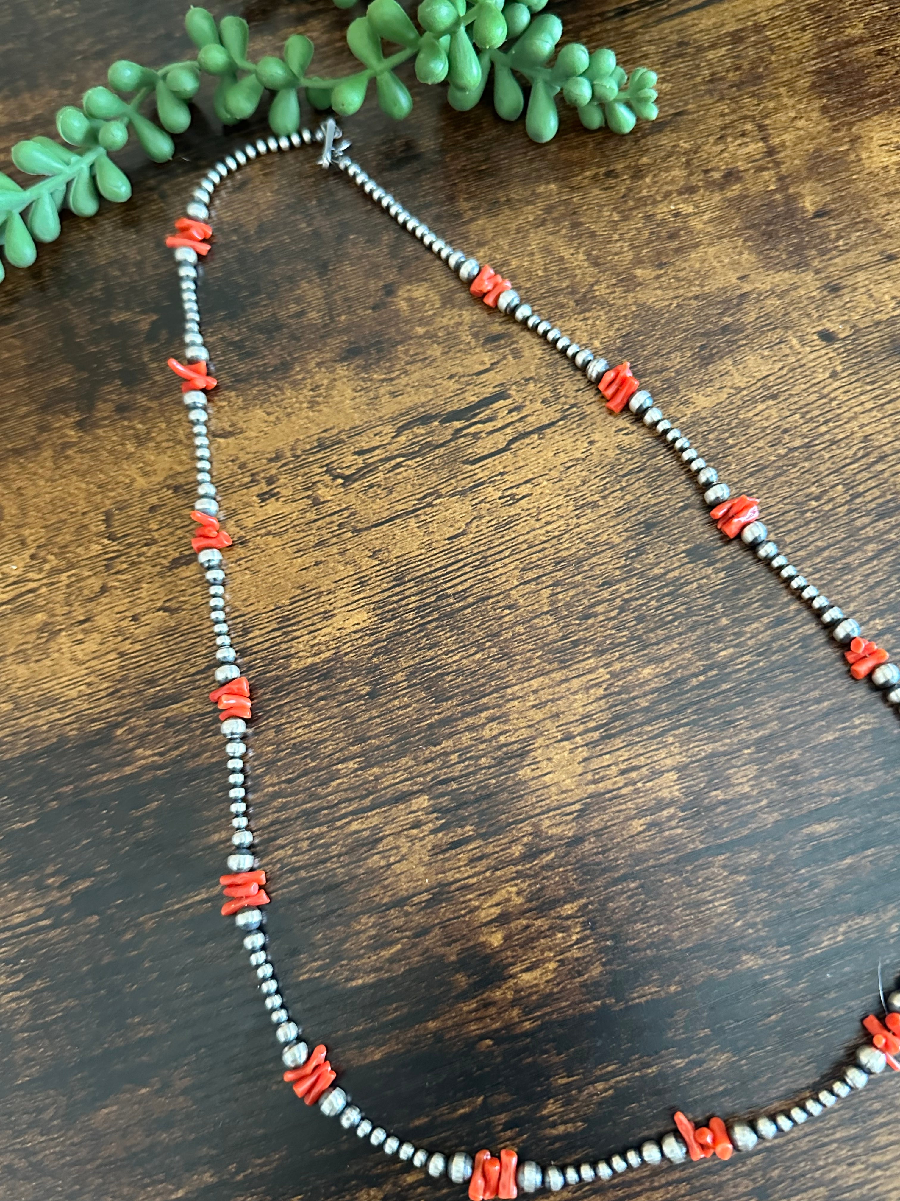Navajo Strung Red Coral & Sterling Silver Graduated Pearls Beaded Necklace. It measures 24 inches long.