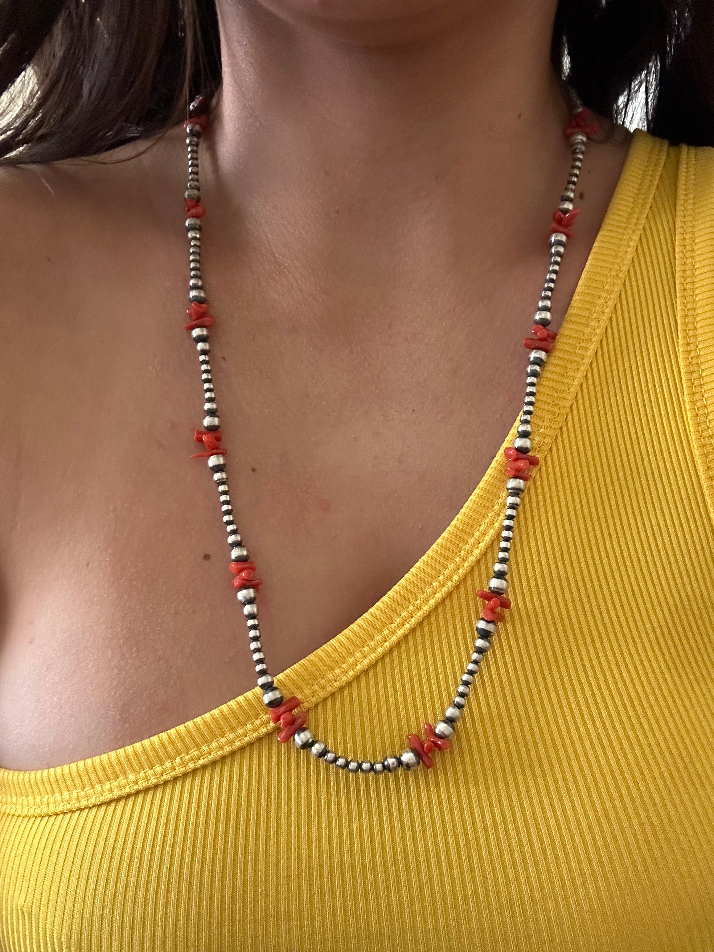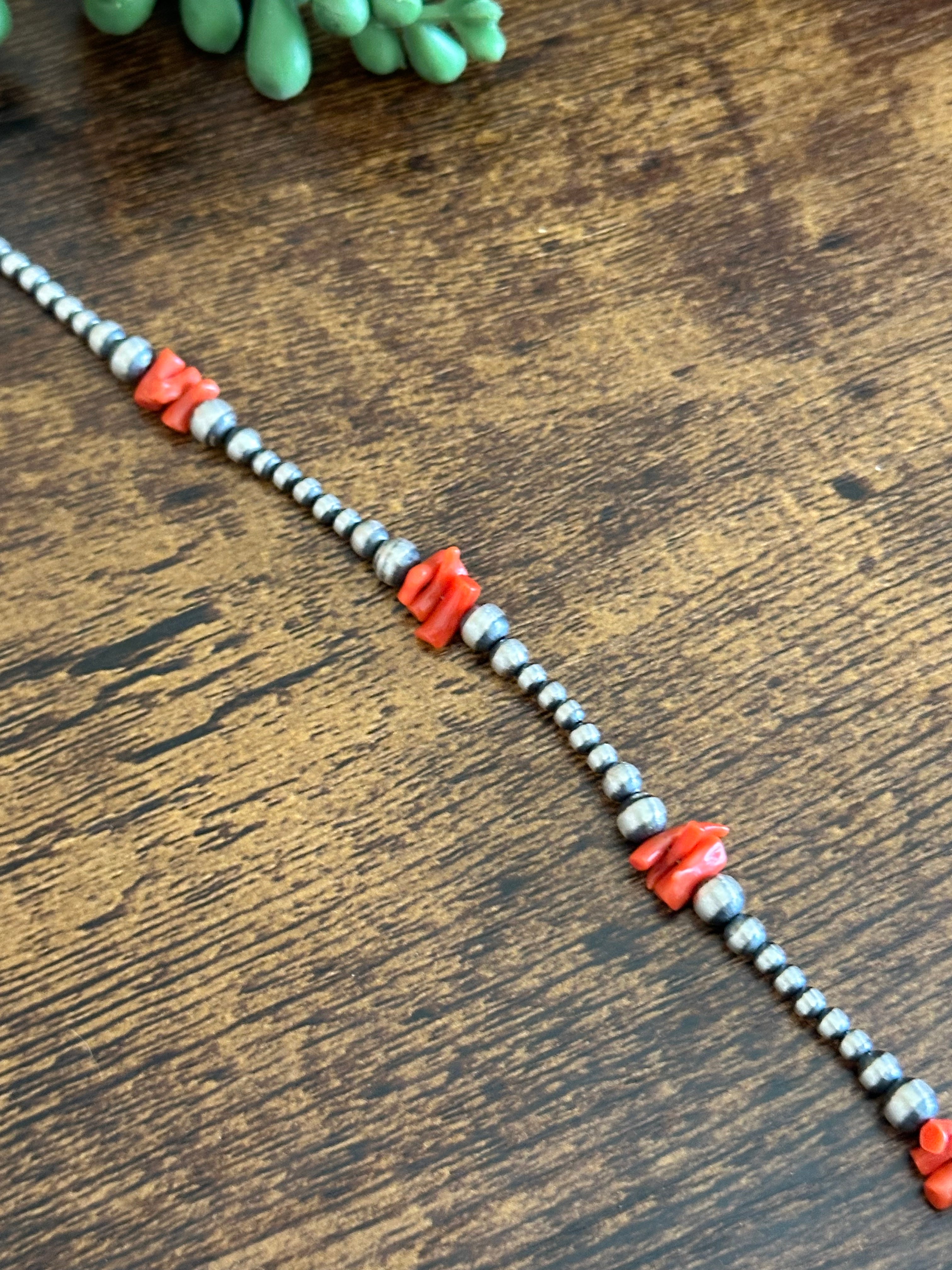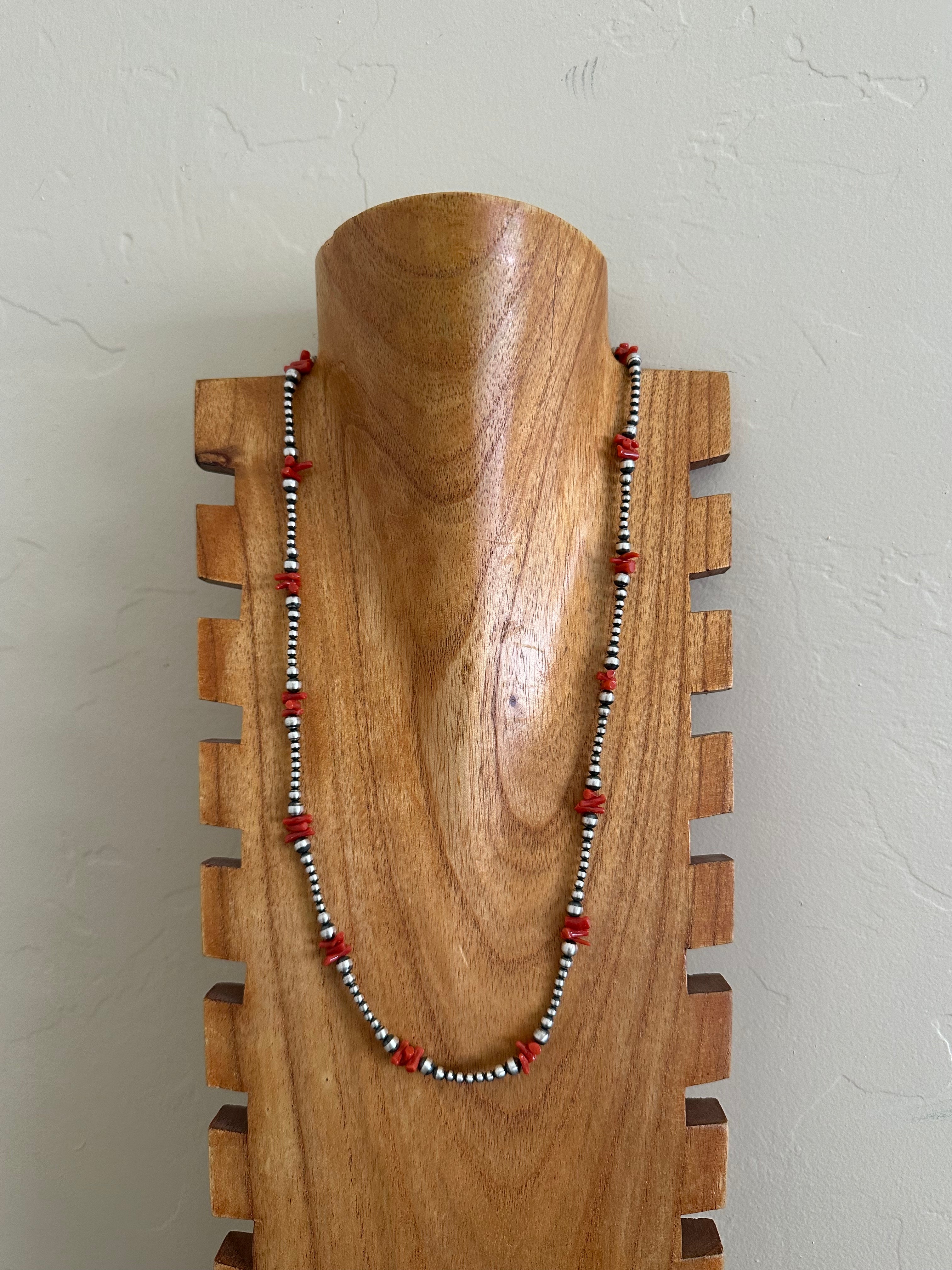 Navajo Strung Red Coral & Sterling Silver Graduated Pearls Beaded Necklace. It measures 24 inches long.