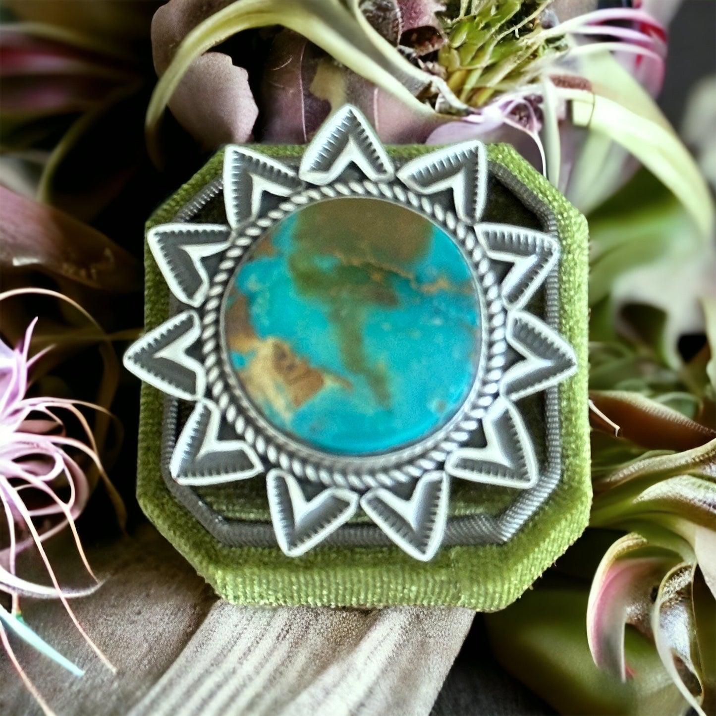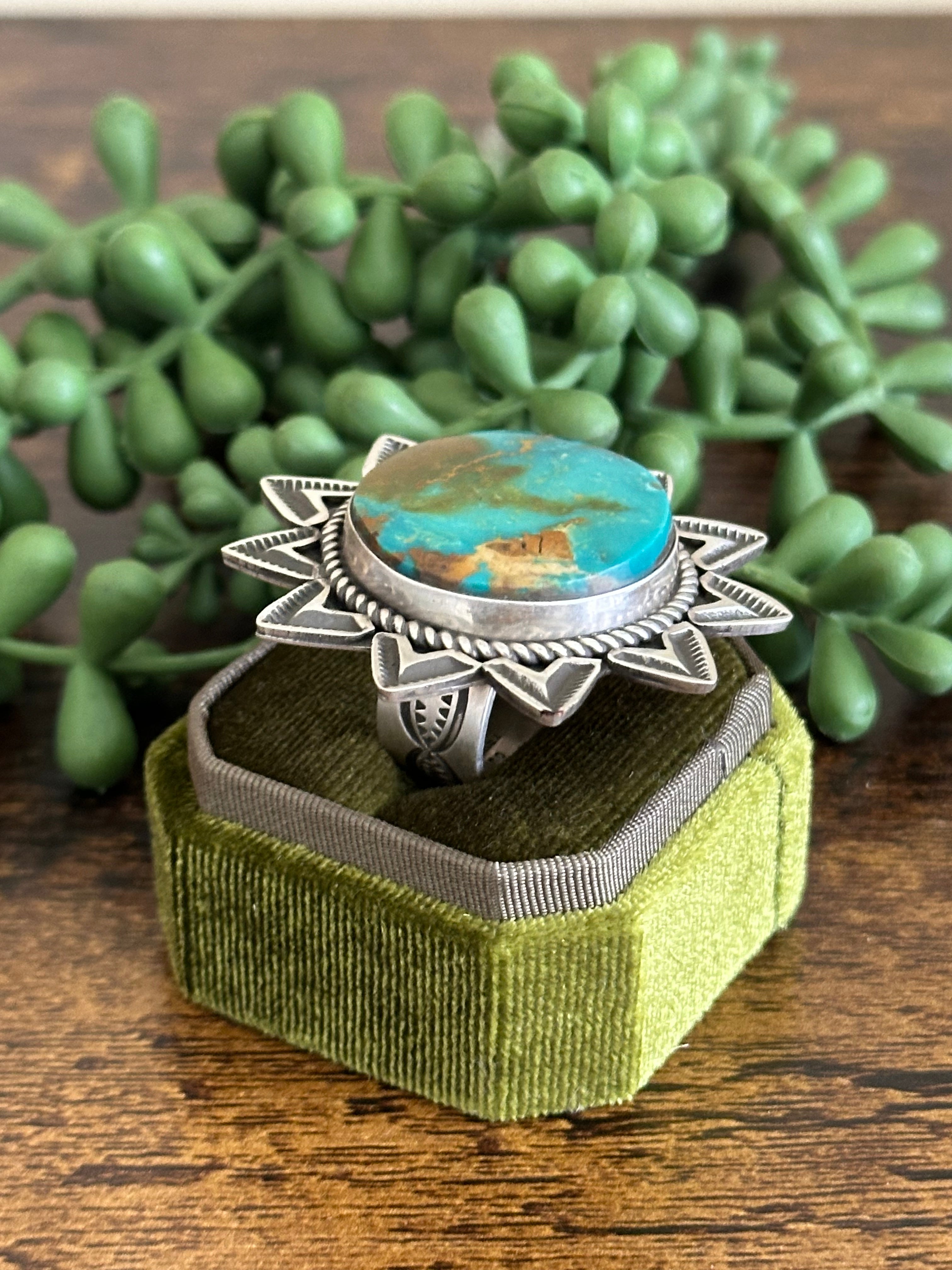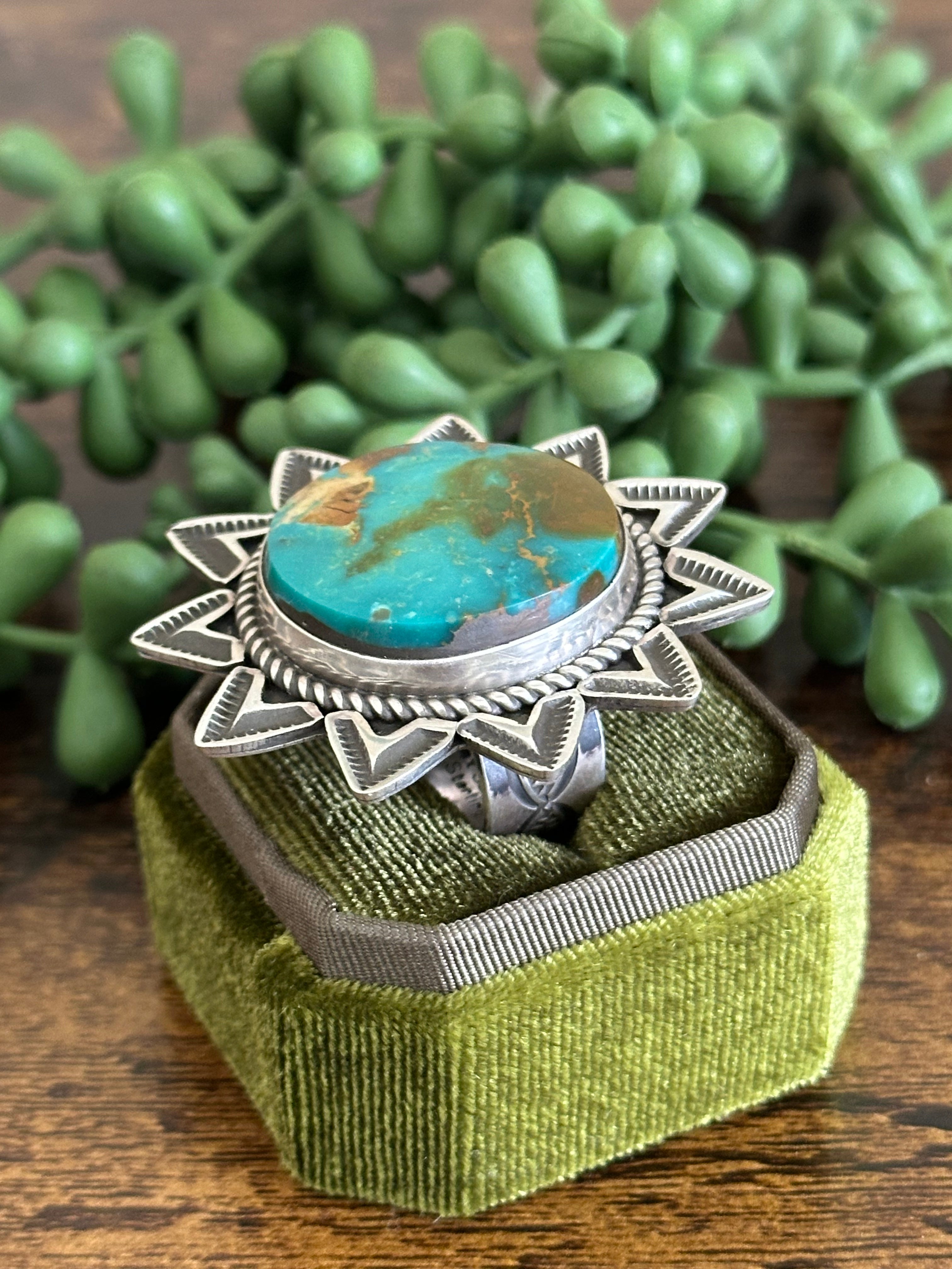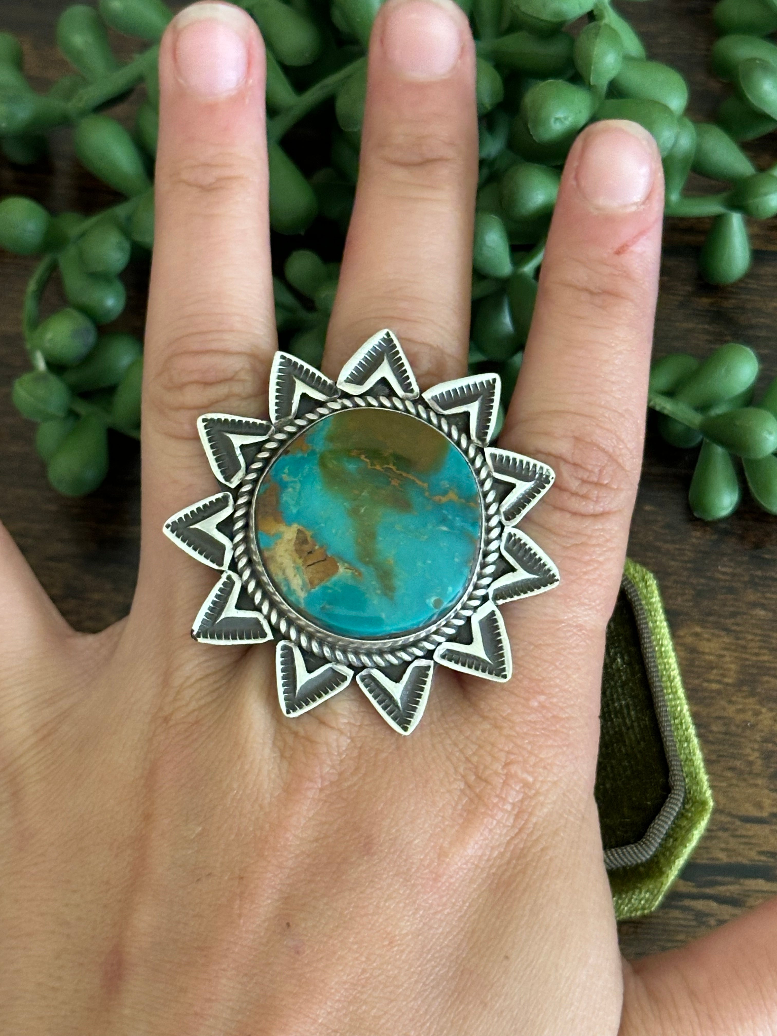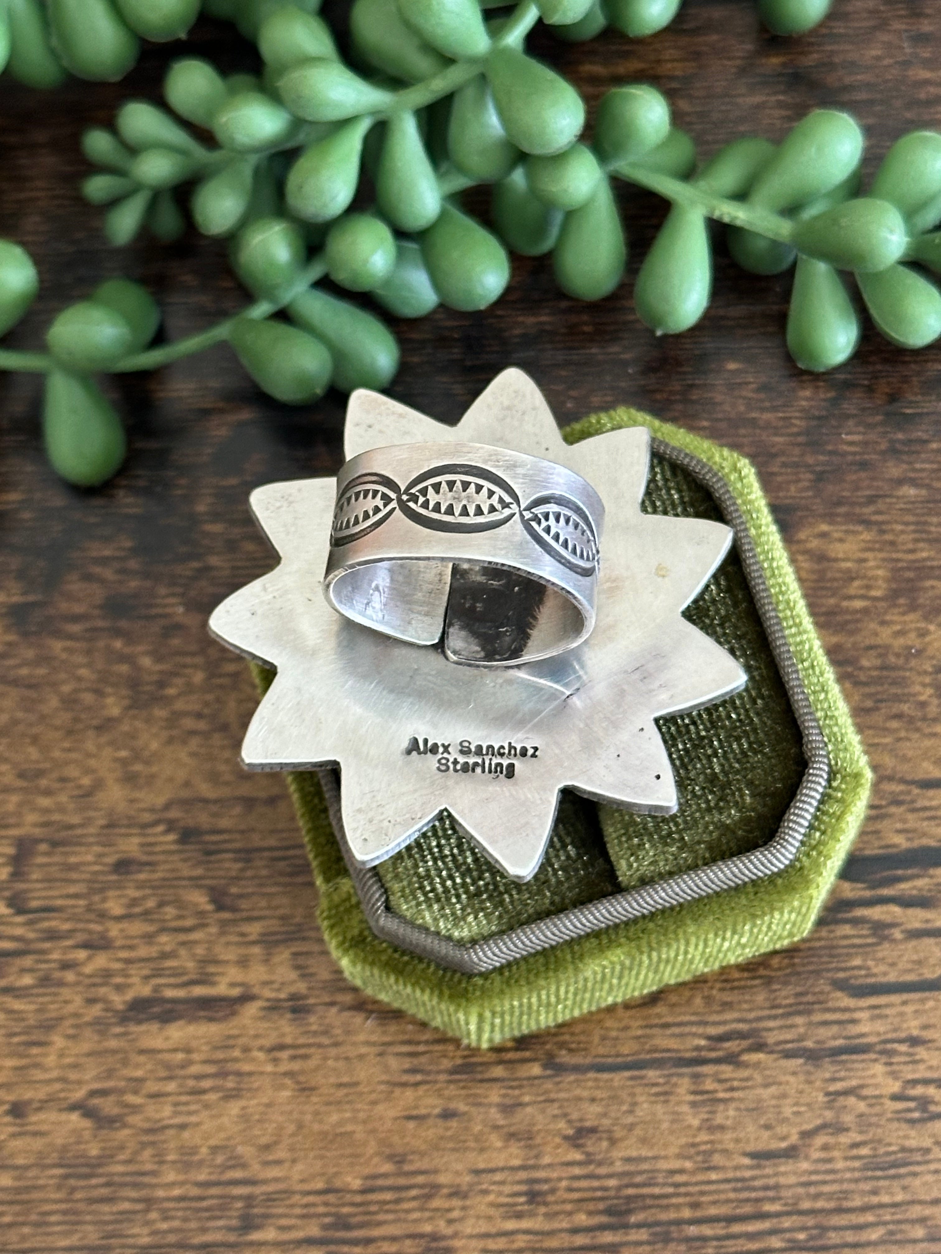 Beautiful stone/ ring. Alex Sanchez Royston Turquoise & Sterling Silver Adjustable Ring. It measures just under 2 inches round. Signed by the artist and stamped sterling silver.
