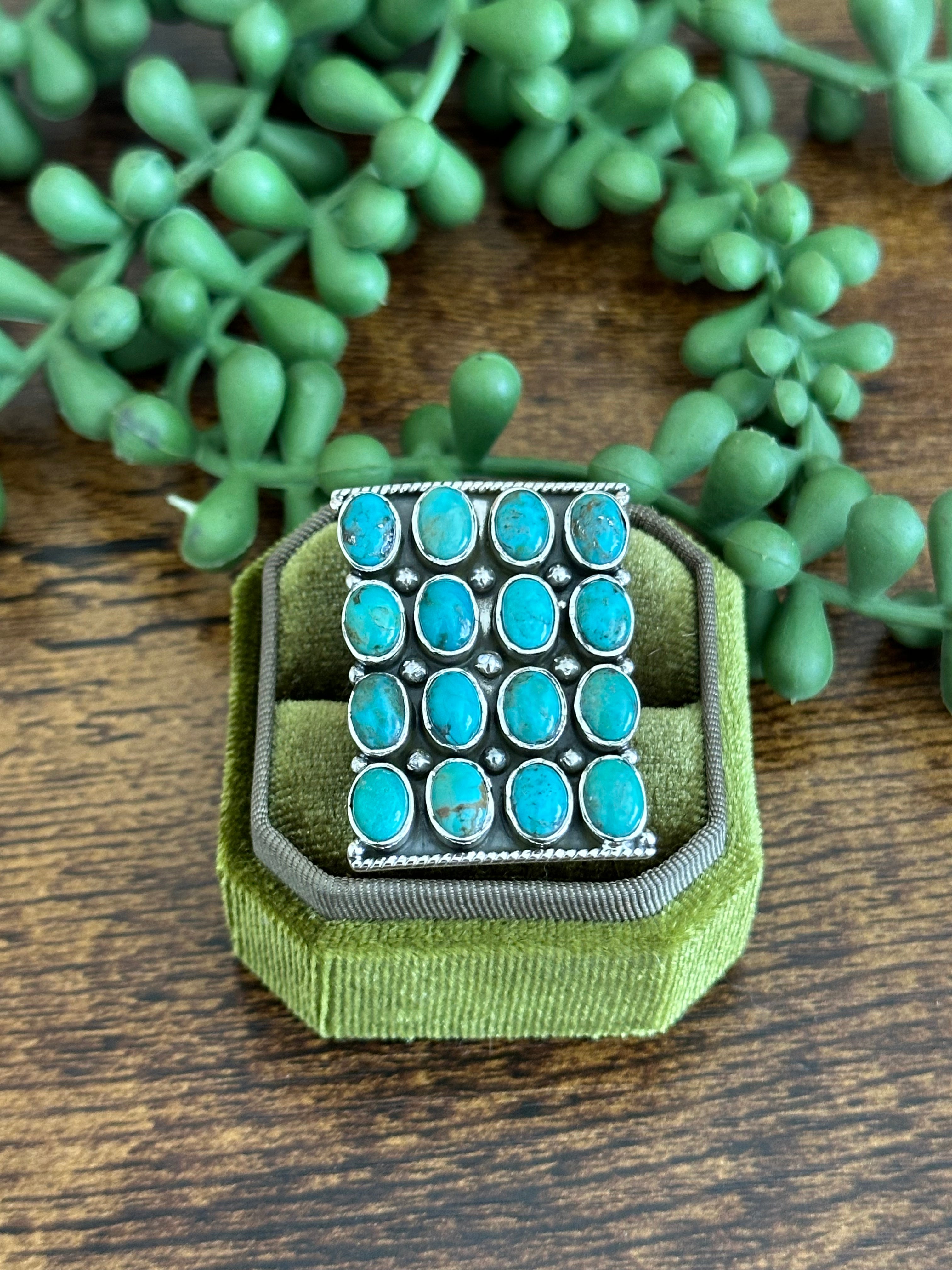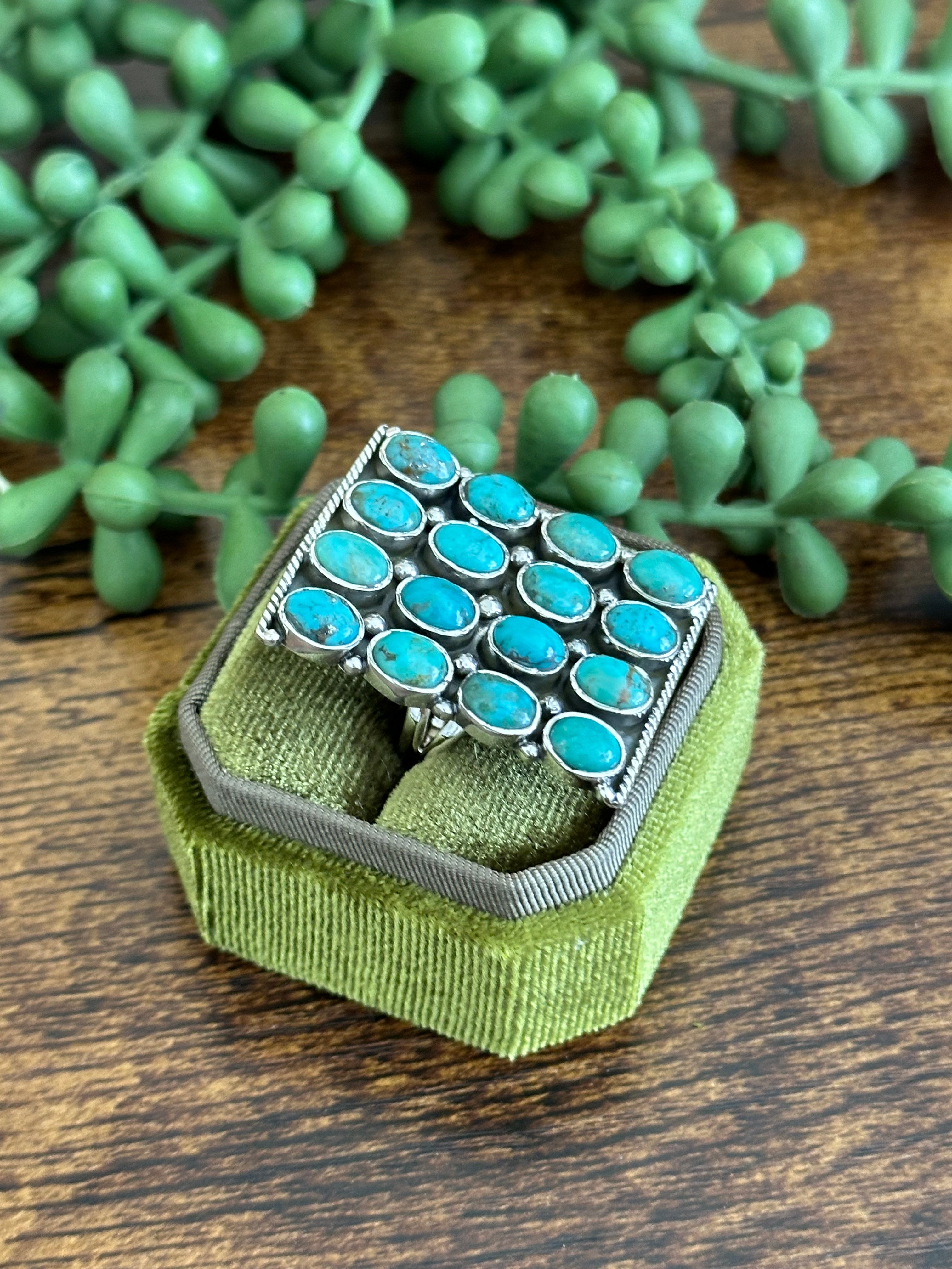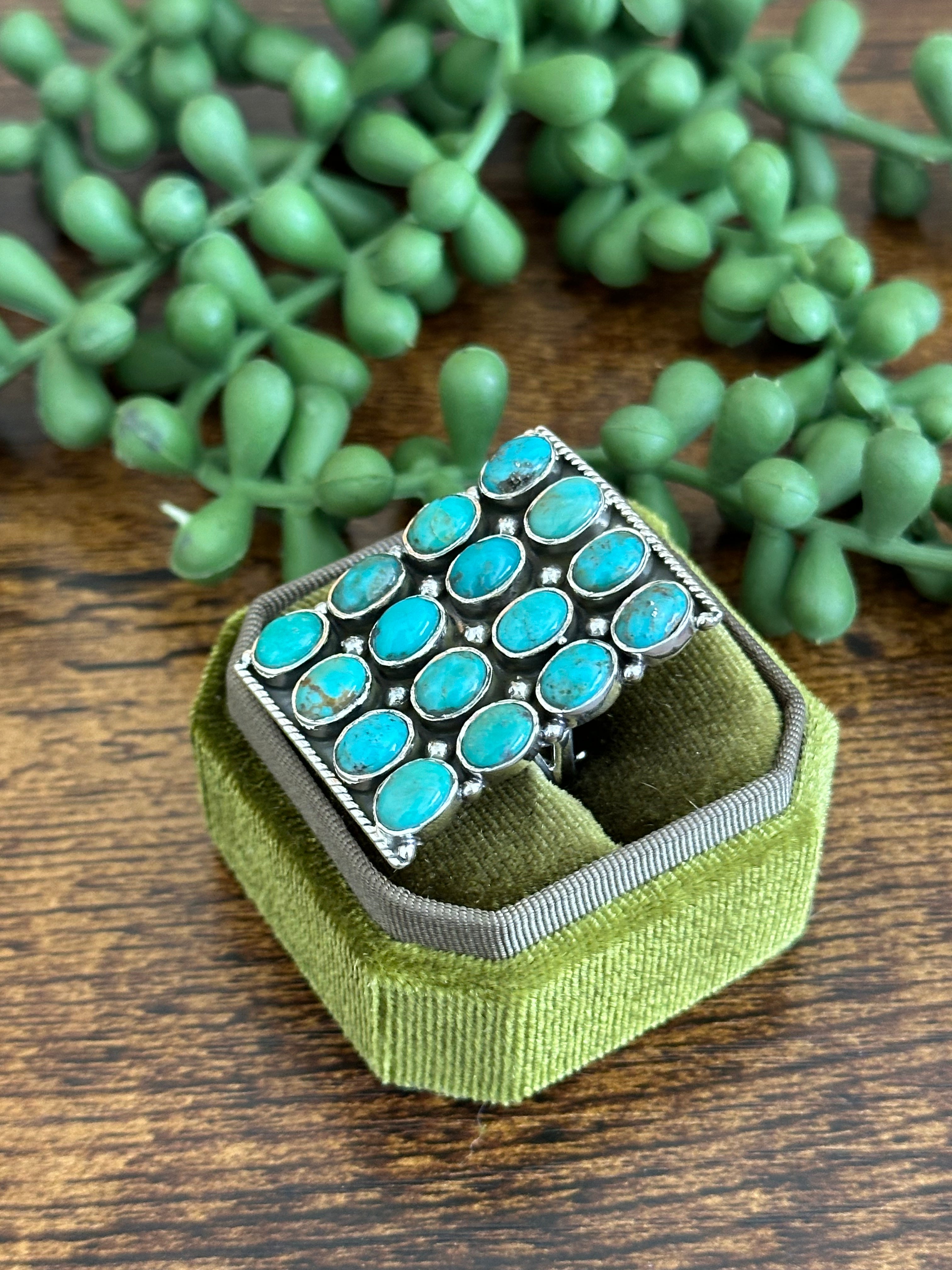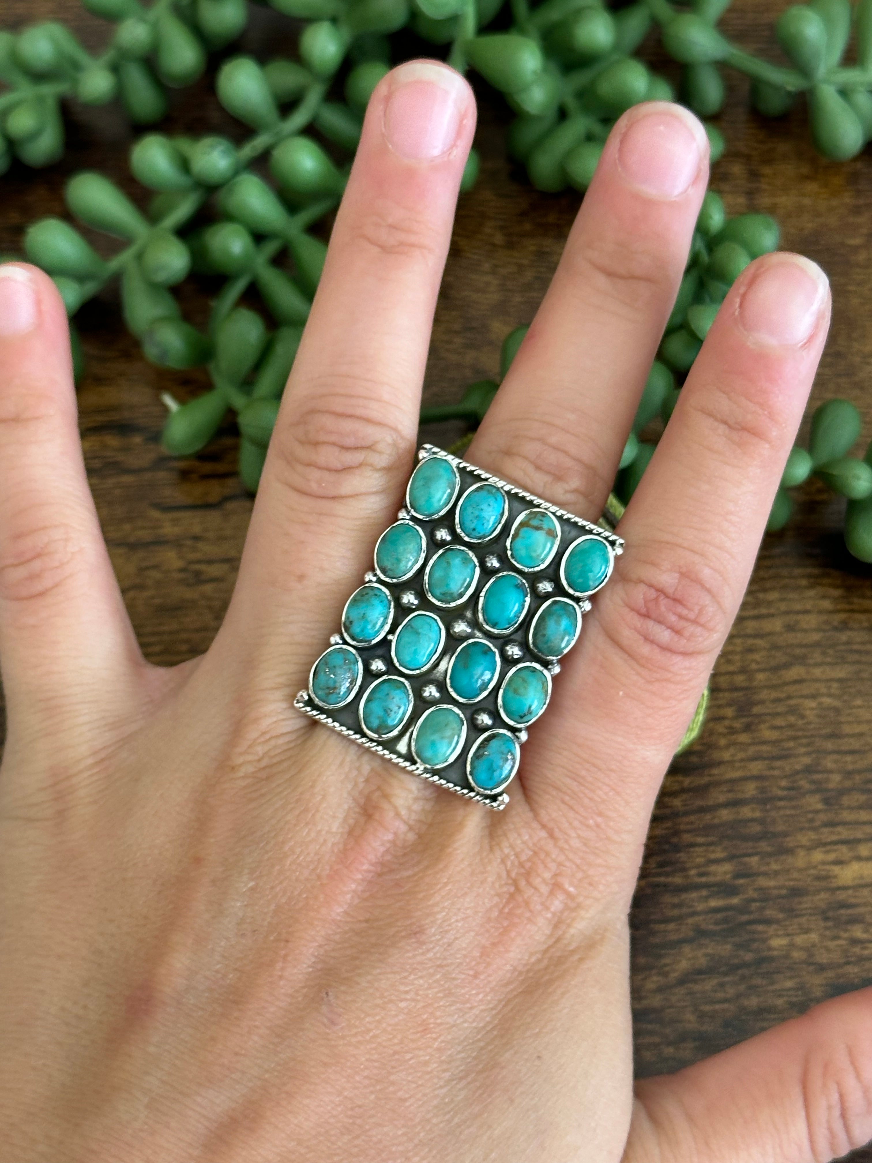 The most stunning ring. Southwest Handmade Kingman Turquoise & Sterling Silver Adjustable Cluster Ring. It measures just over 1 3/8 inches long and 1 inch wide. Signed by the artist and stamped sterling silver.