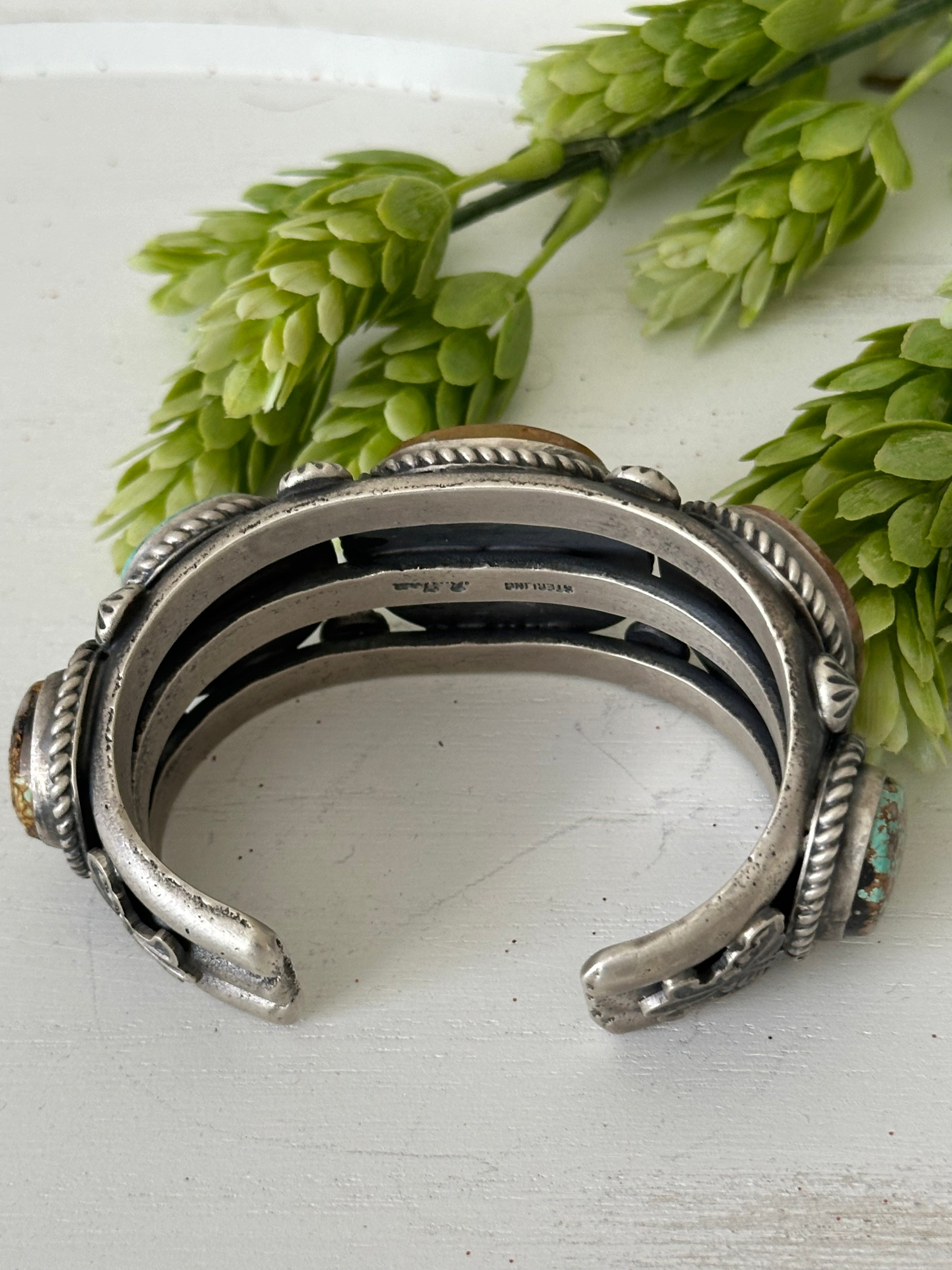 Ronald Tom Royston Turquoise & Sterling Silver Cuff Bracelet. It measures 1 1/2 inches wide with an inside circumference of 5 5/8 inches and a gap 1 inch. Signed by the artist and stamped sterling silver.