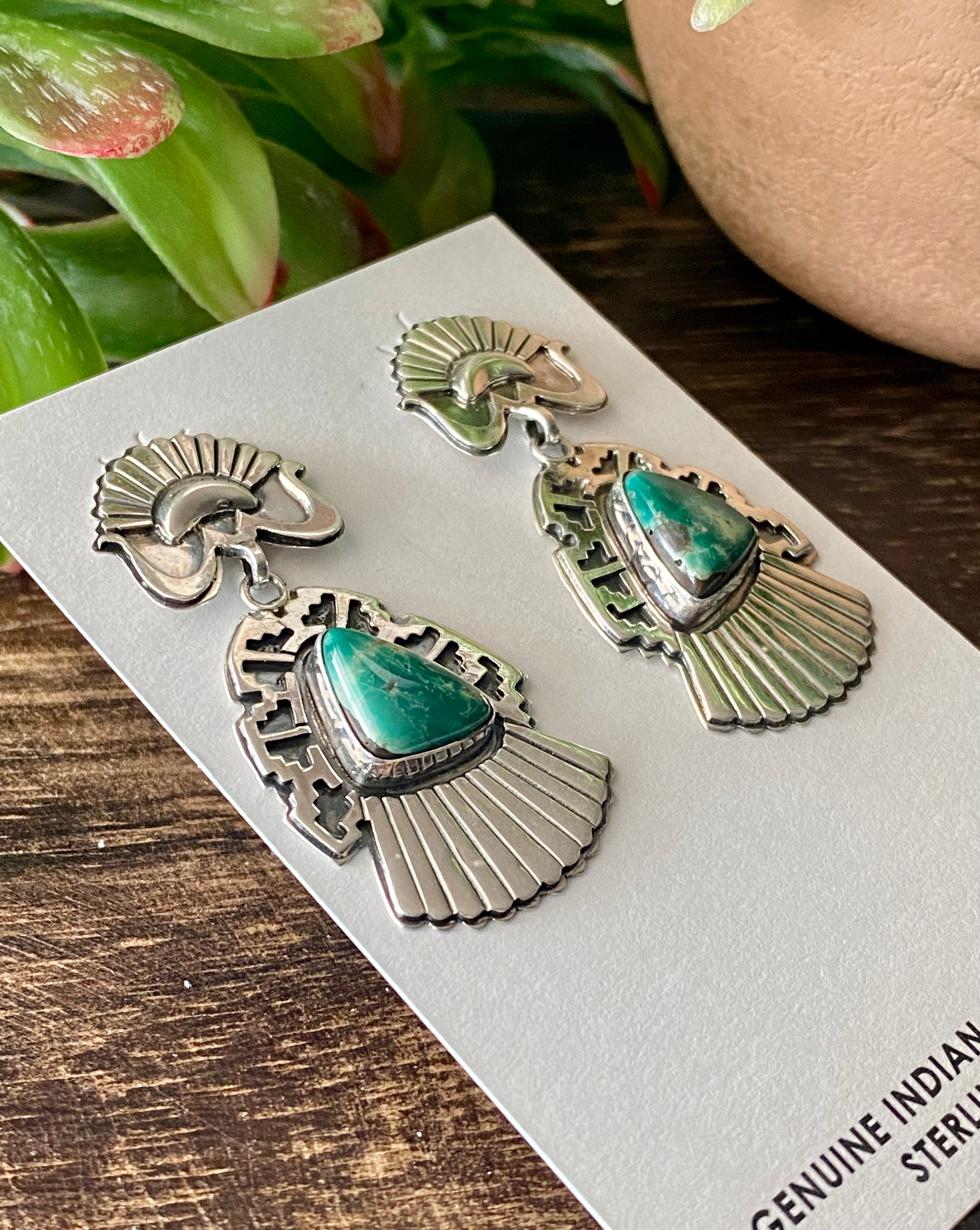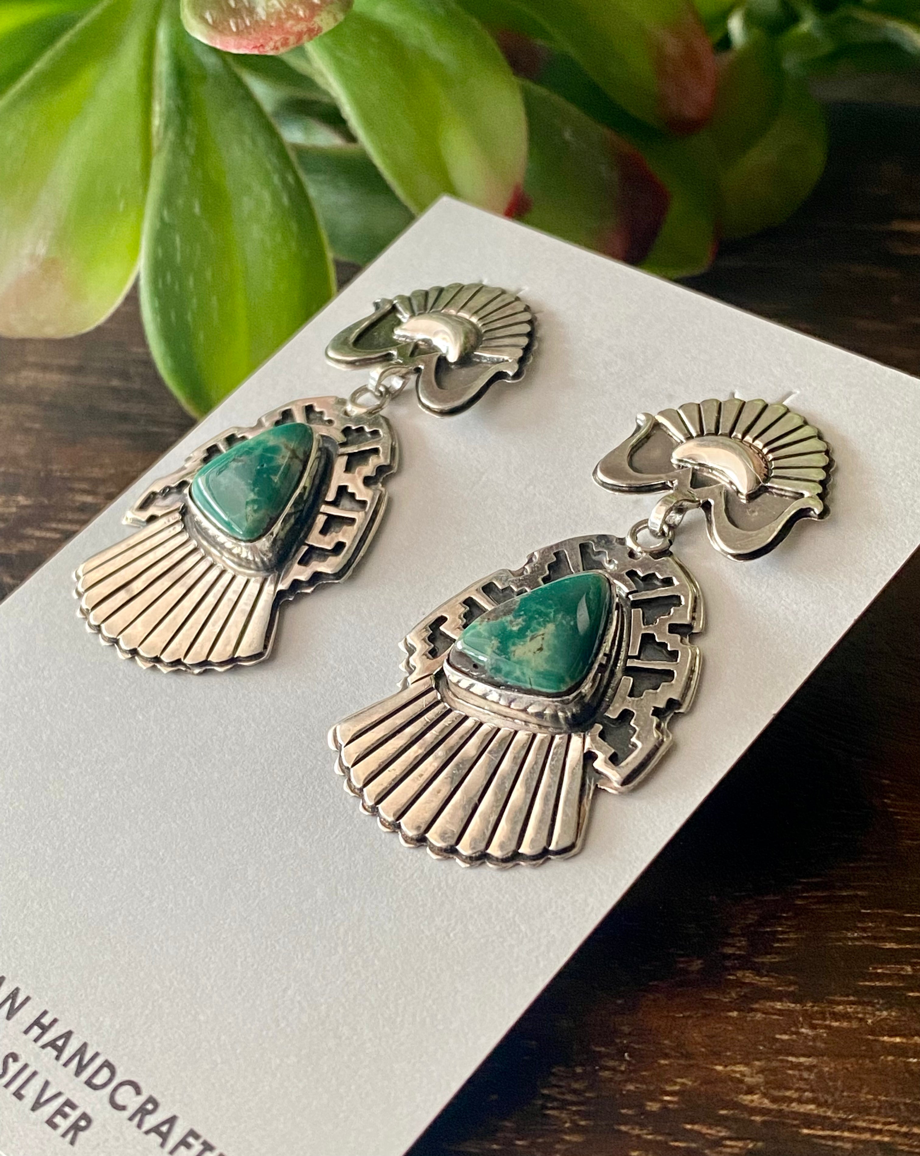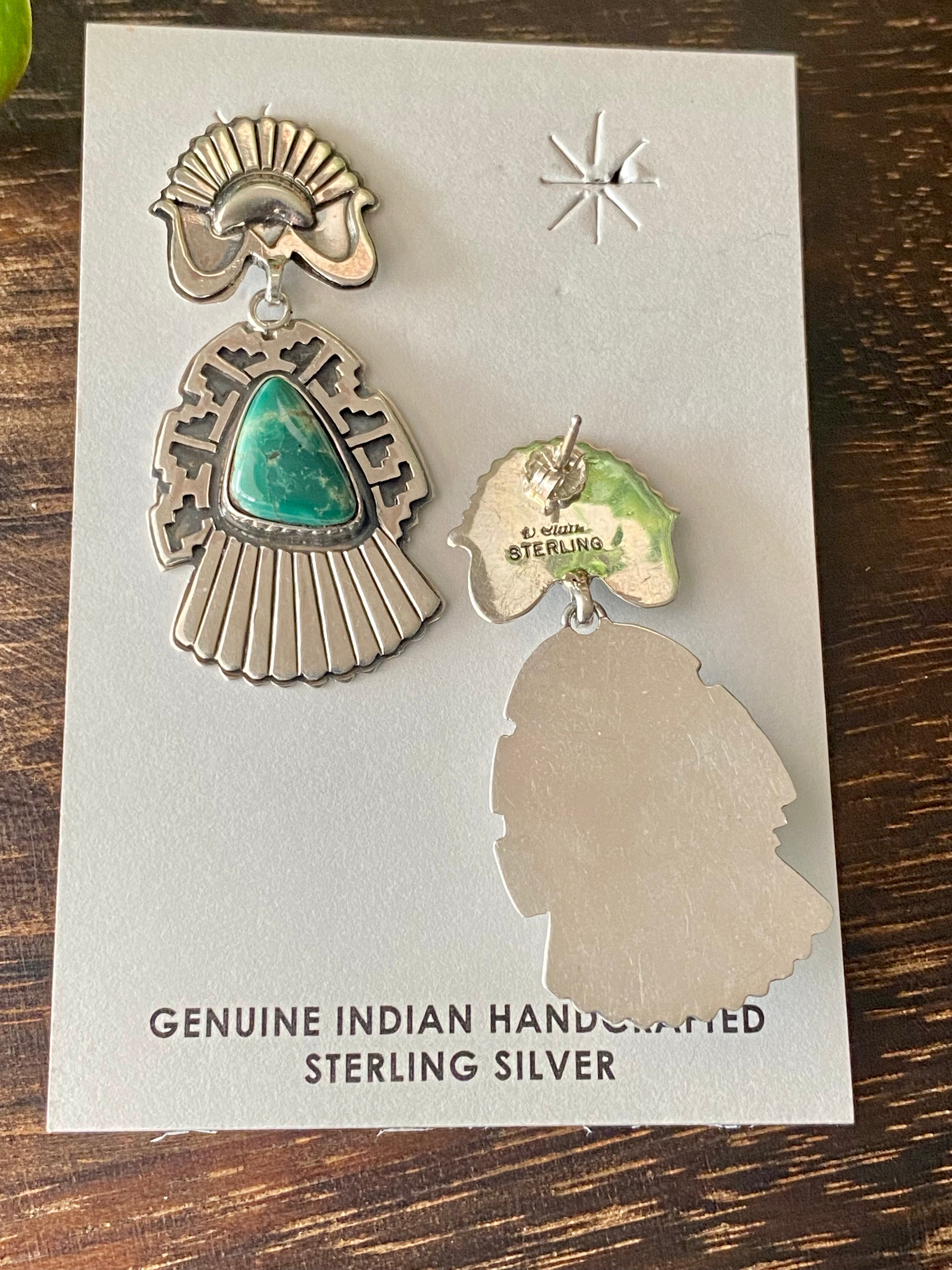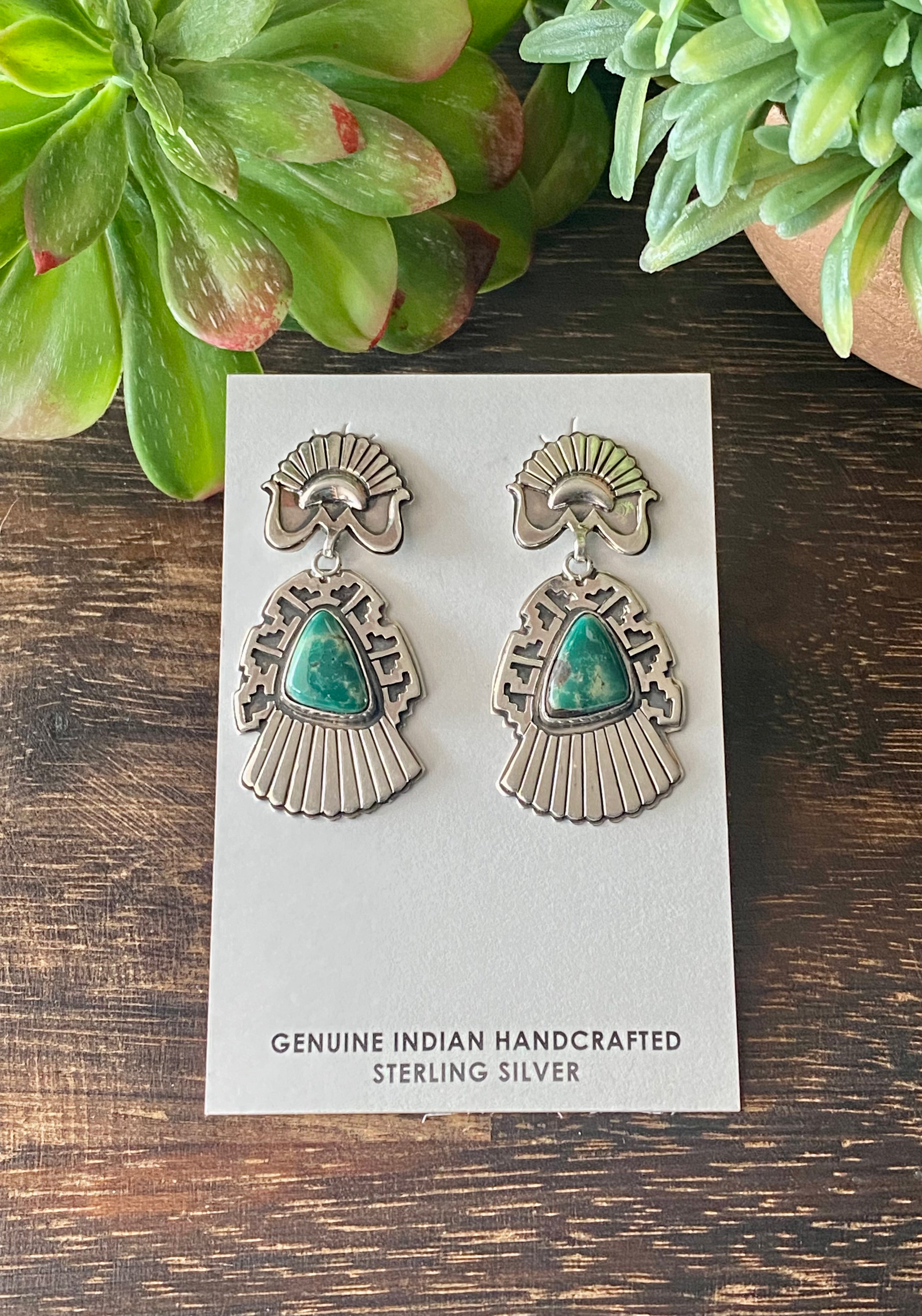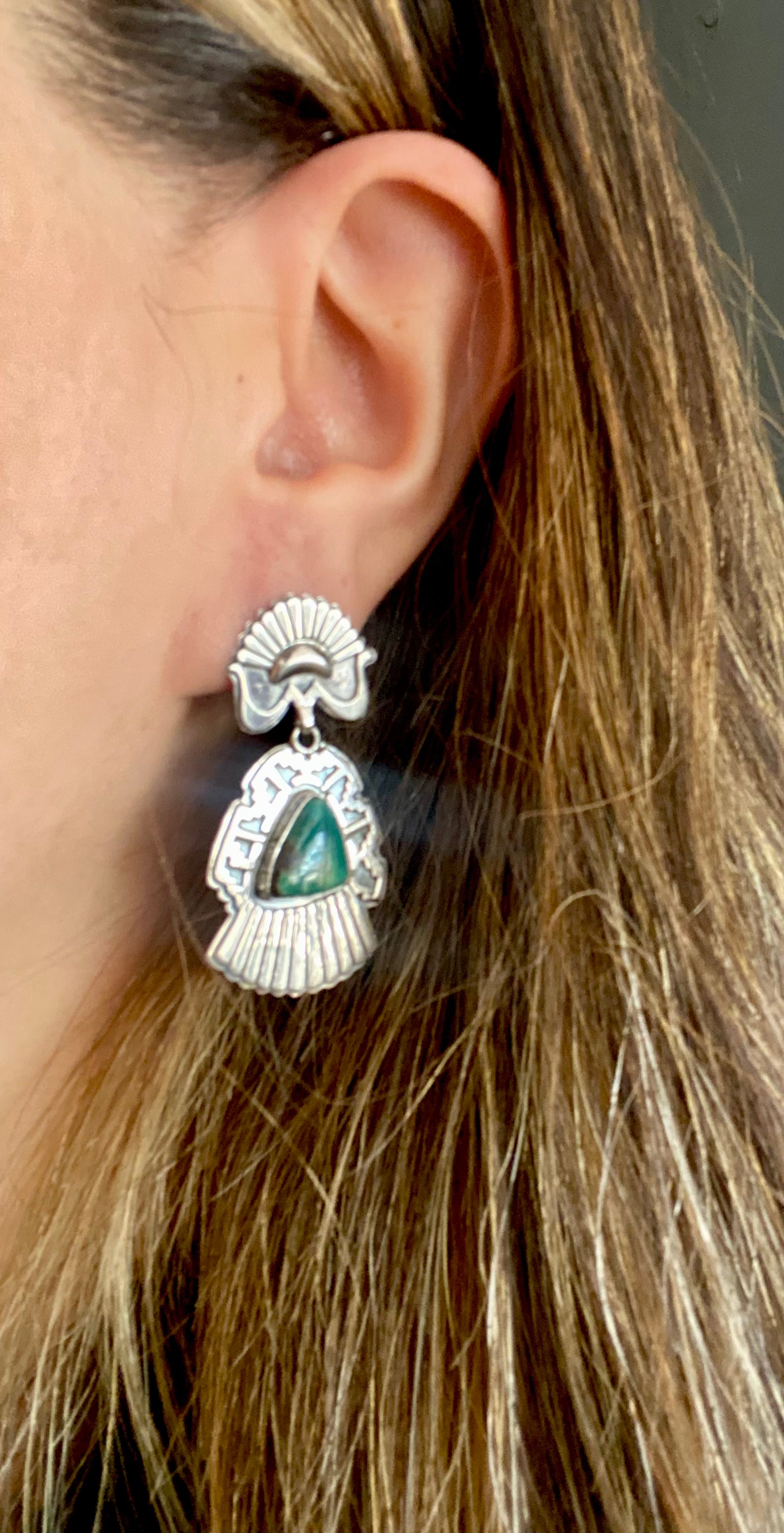 Vintage Danny Clark Royston Turquoise & Sterling Silver Post Dangle Earrings. They measure just under 2 inches long and just under 1 inch wide. Signed by the artist and stamped sterling silver.
