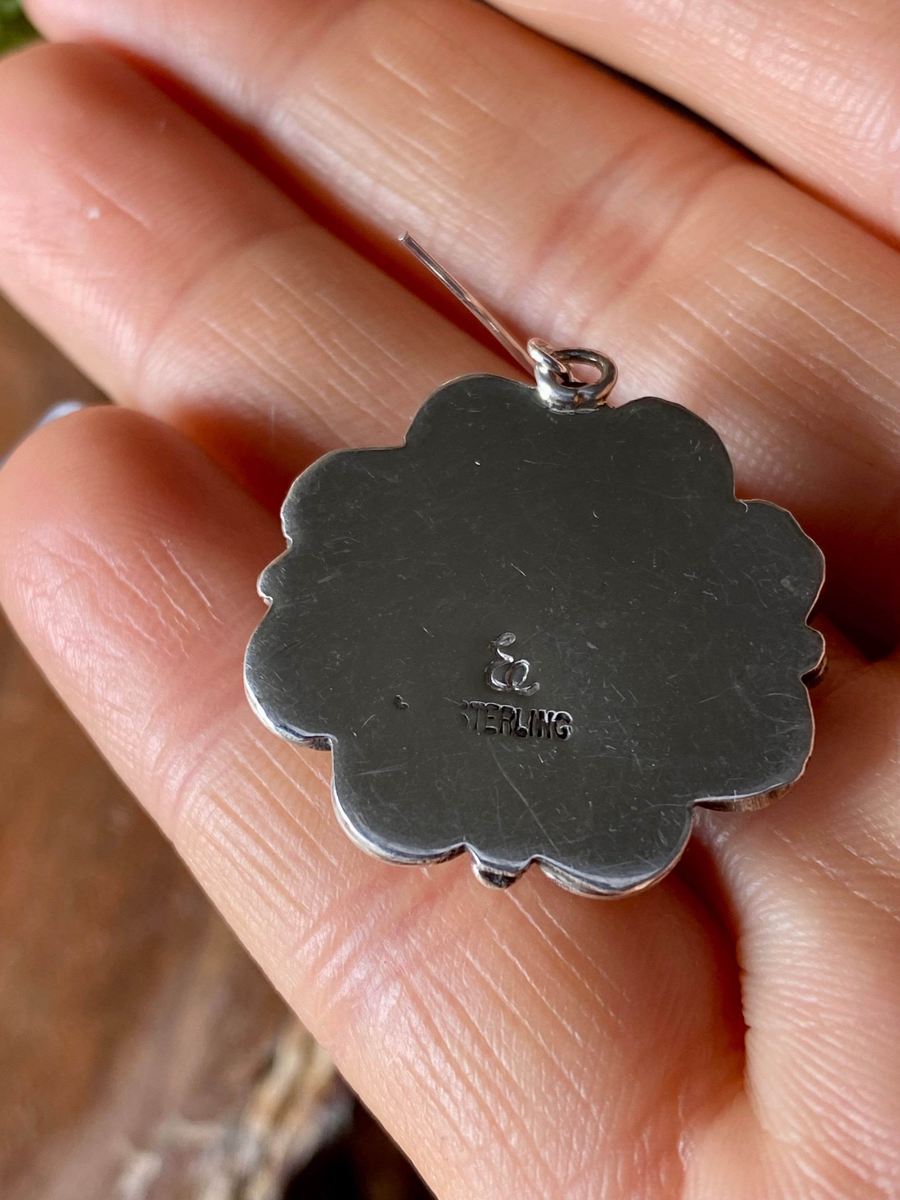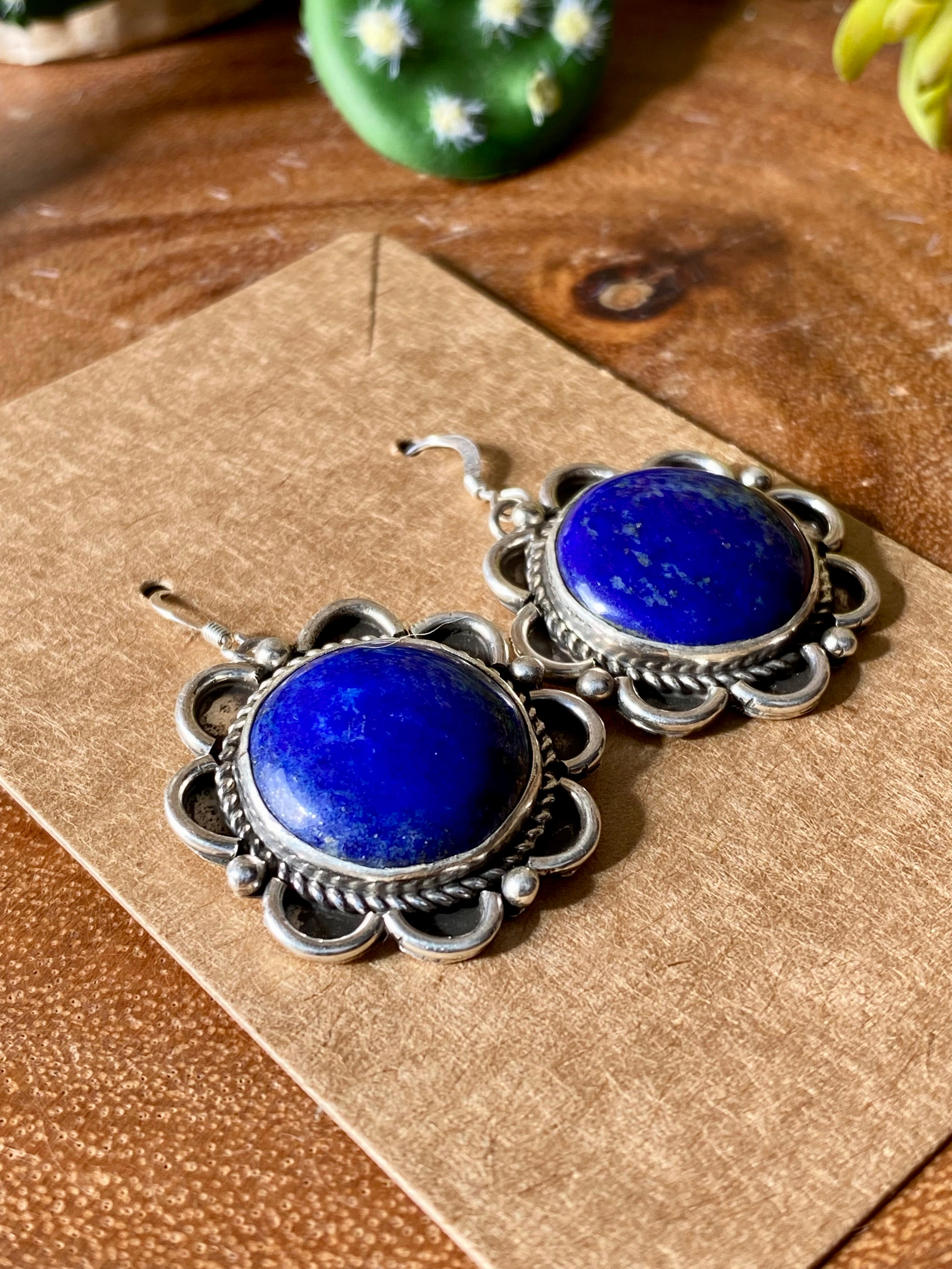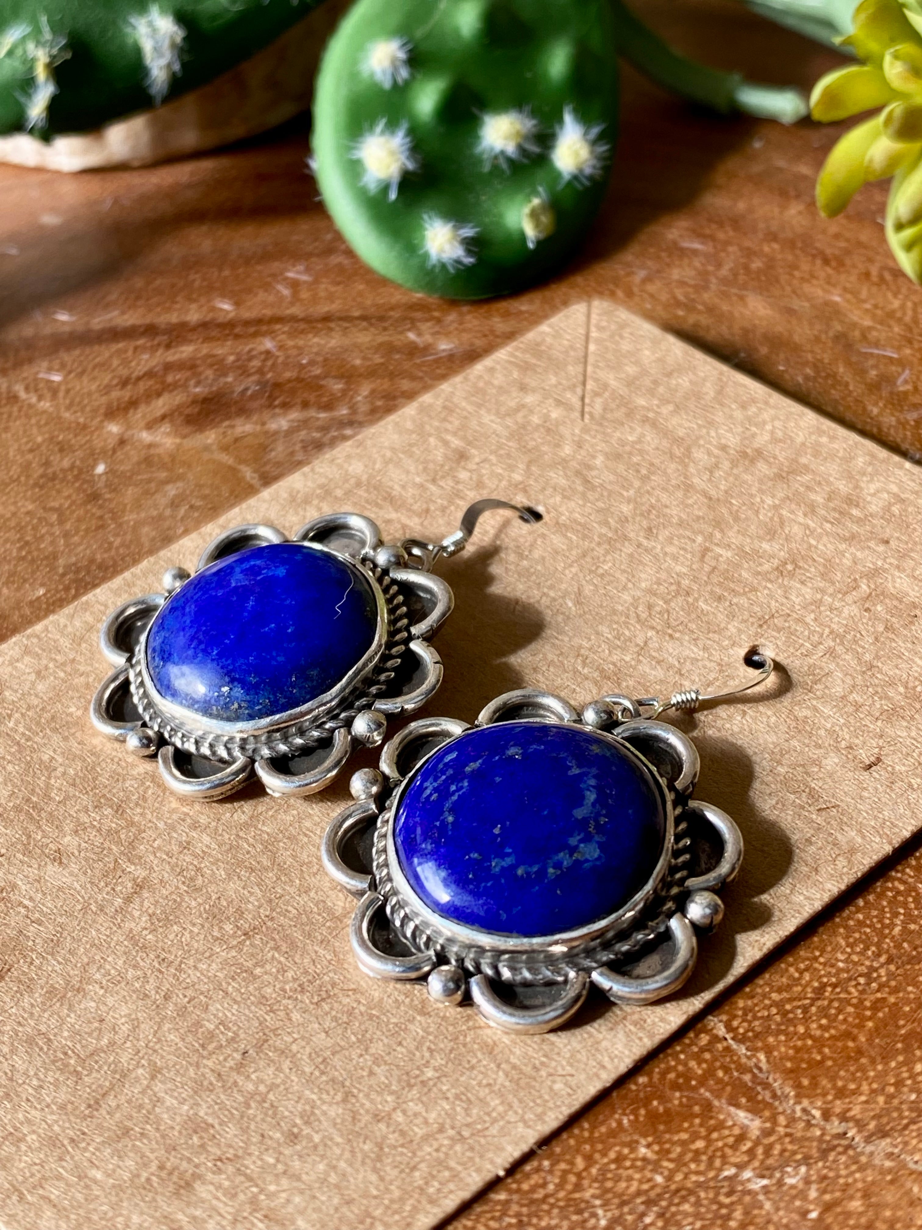 Vintage Etta Endito Lapis & Sterling Silver Dangle Earrings. It measures just over 1 1/2 inches long and just over 1 inch wide. Signed by the artist and stamped sterling silver.