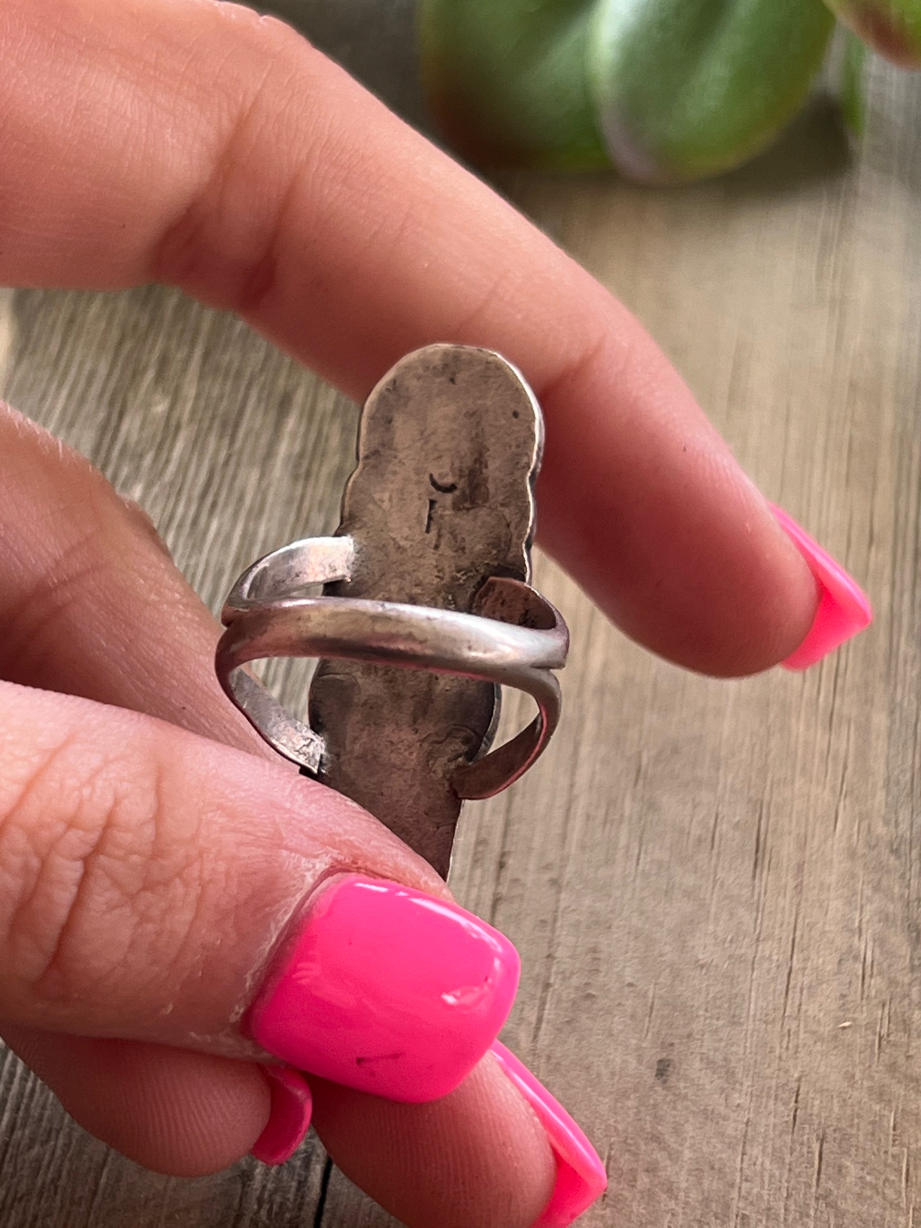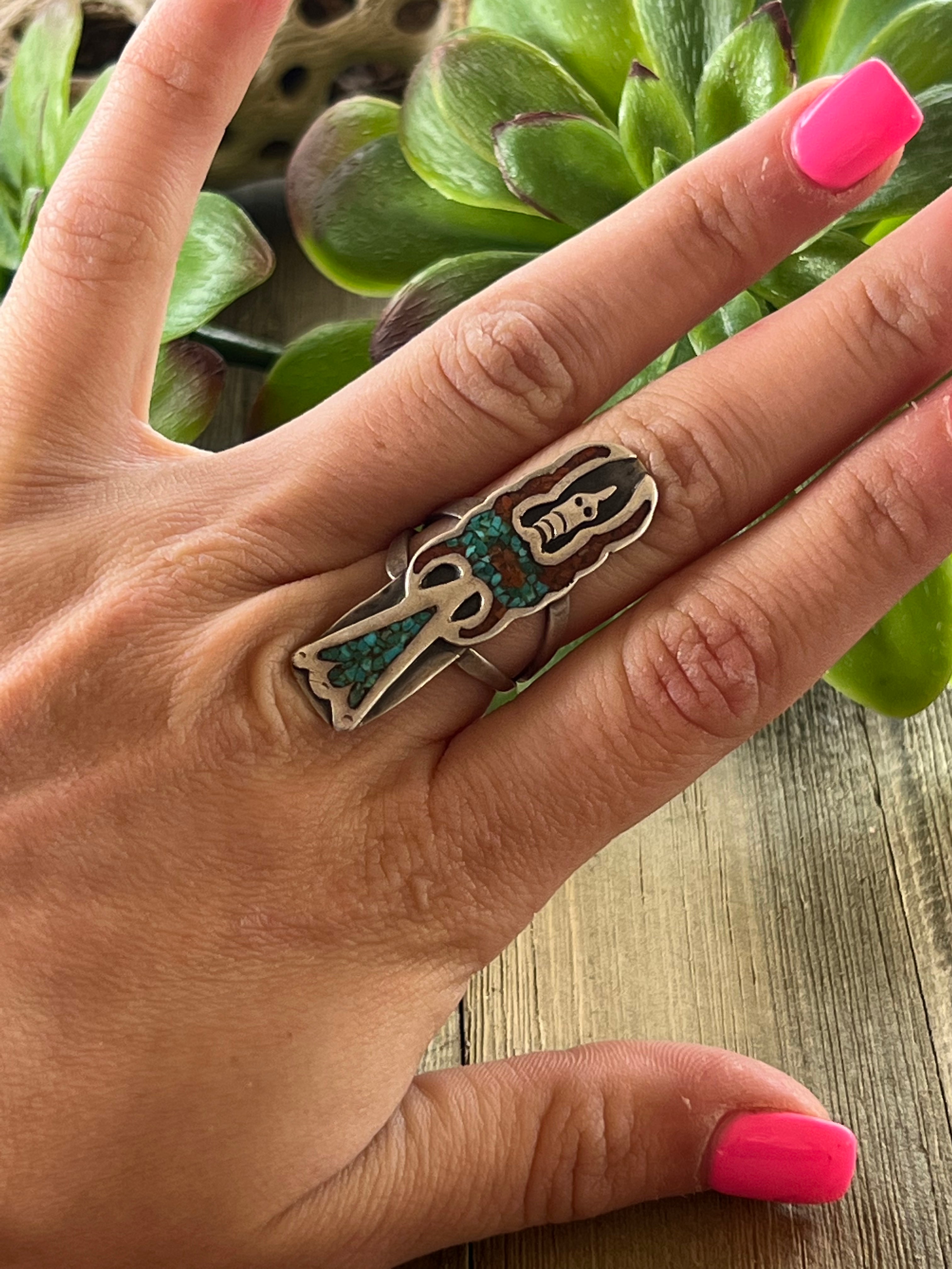 Vintage Navajo Made Multi Stone Flake & Sterling Silver Ring Size 6.25. It measures just over 1 1/2 inches long and just under 1/2 of an inch wide. Signed by artist and stamped sterling silver.
