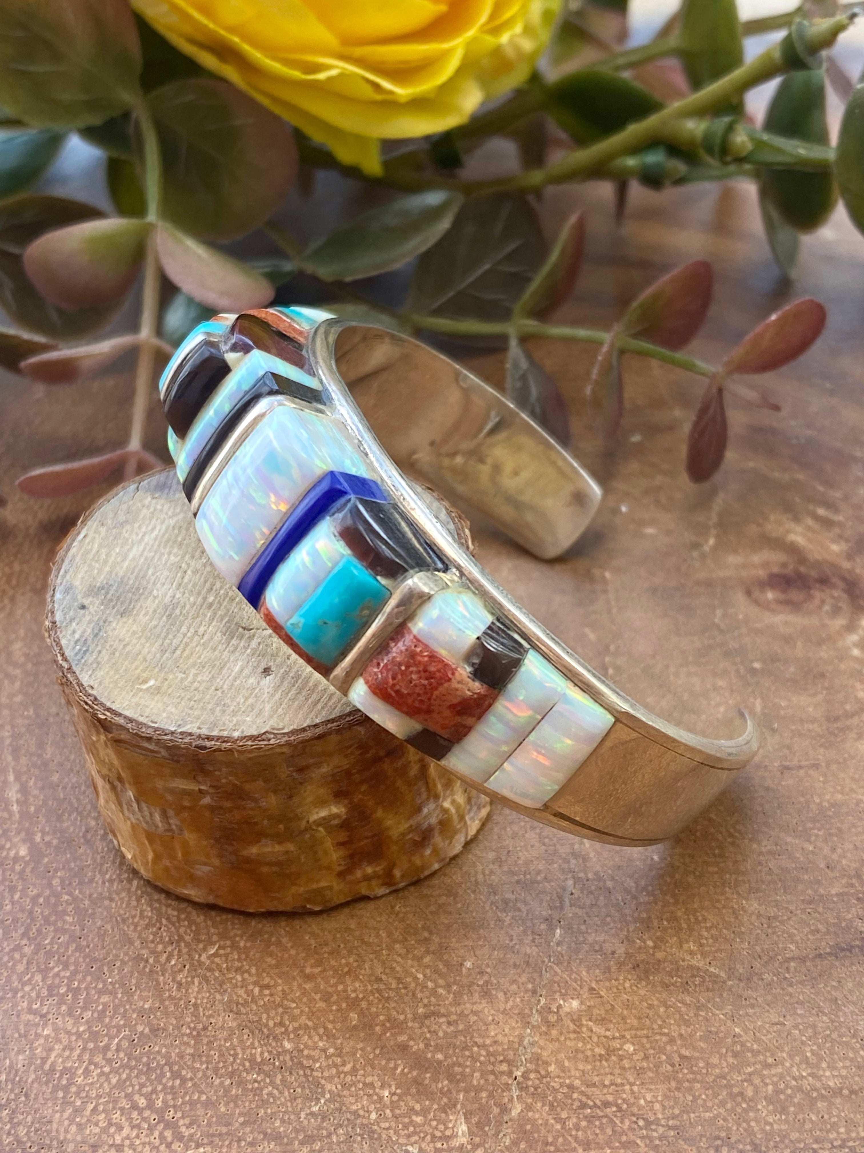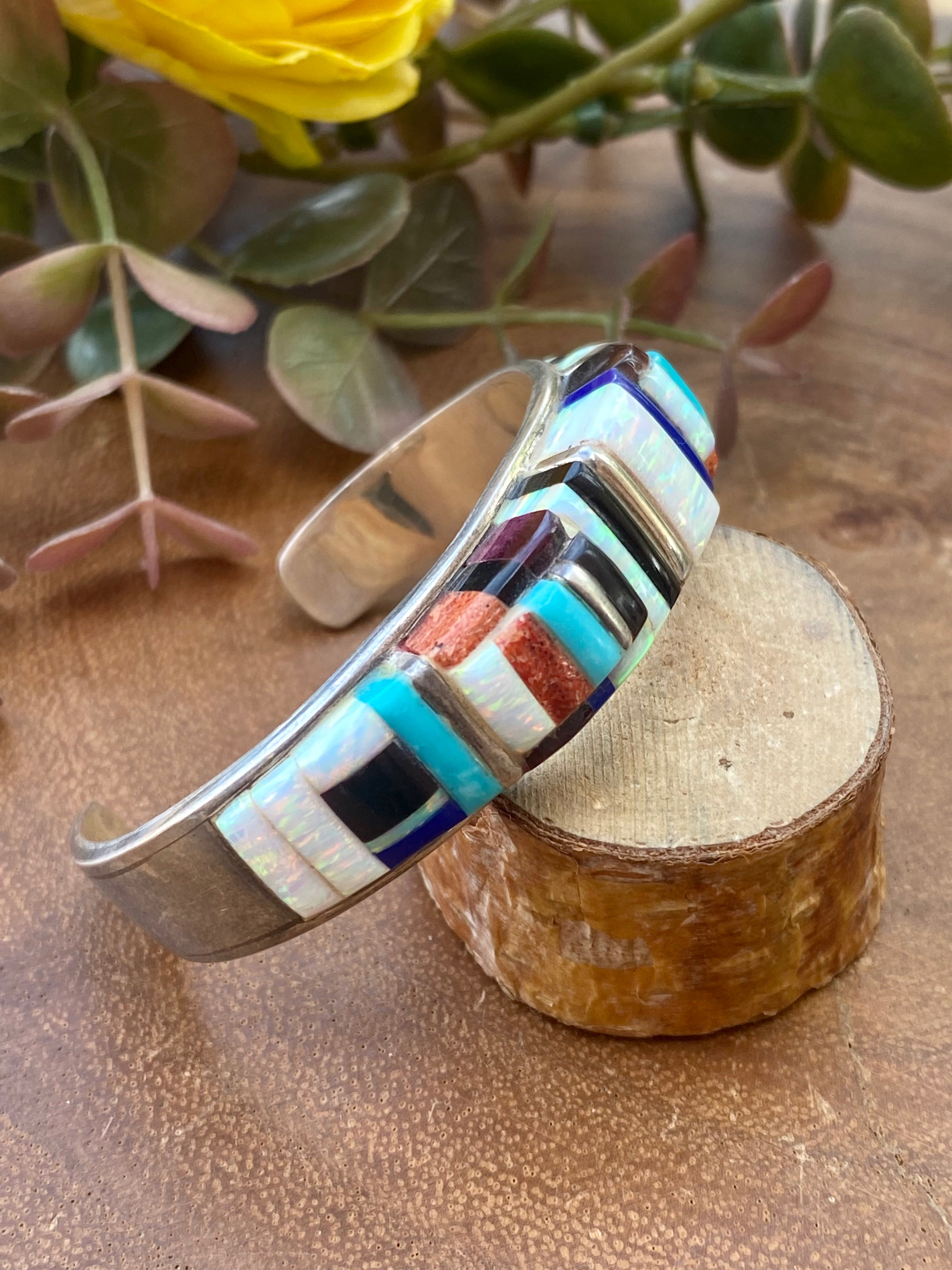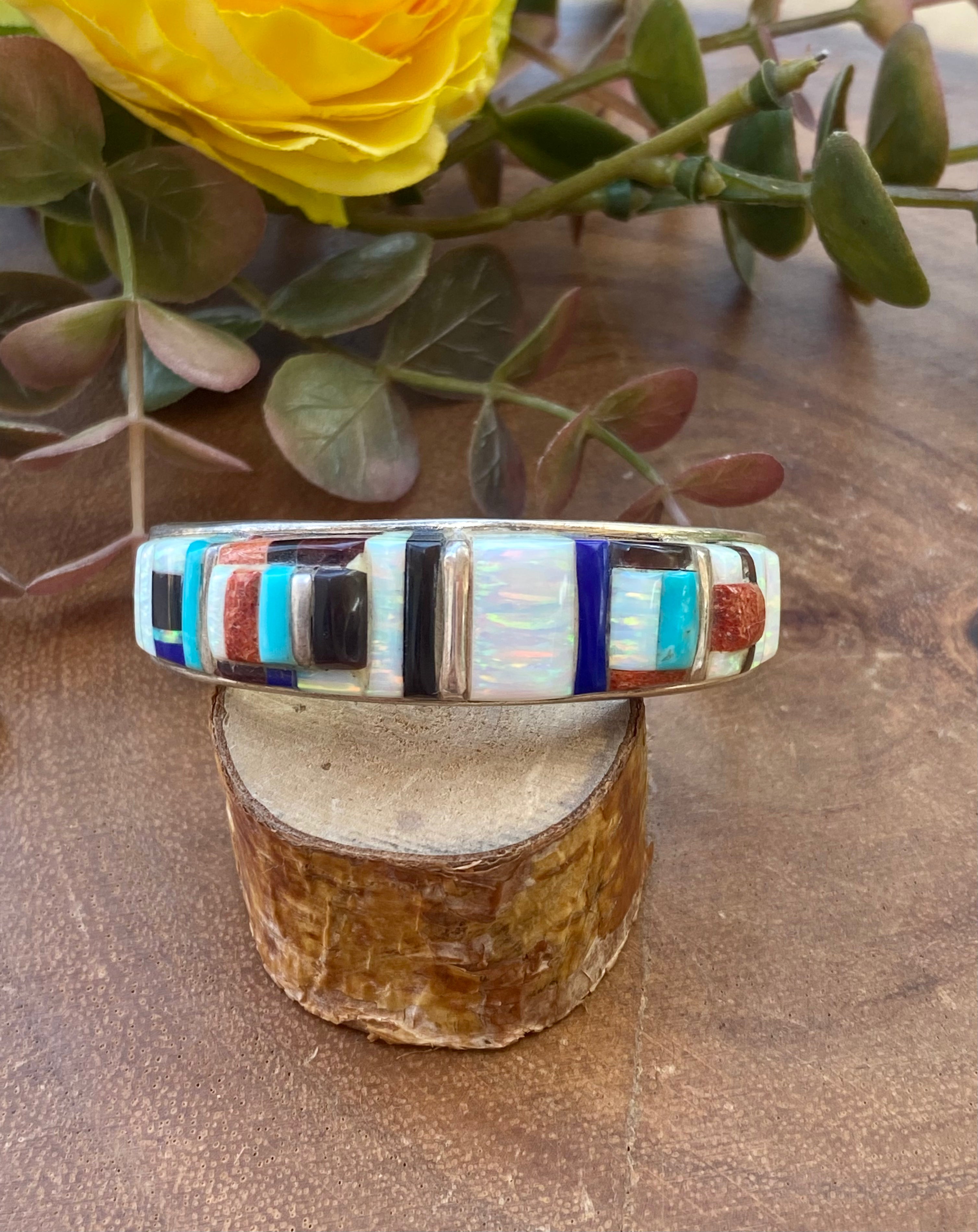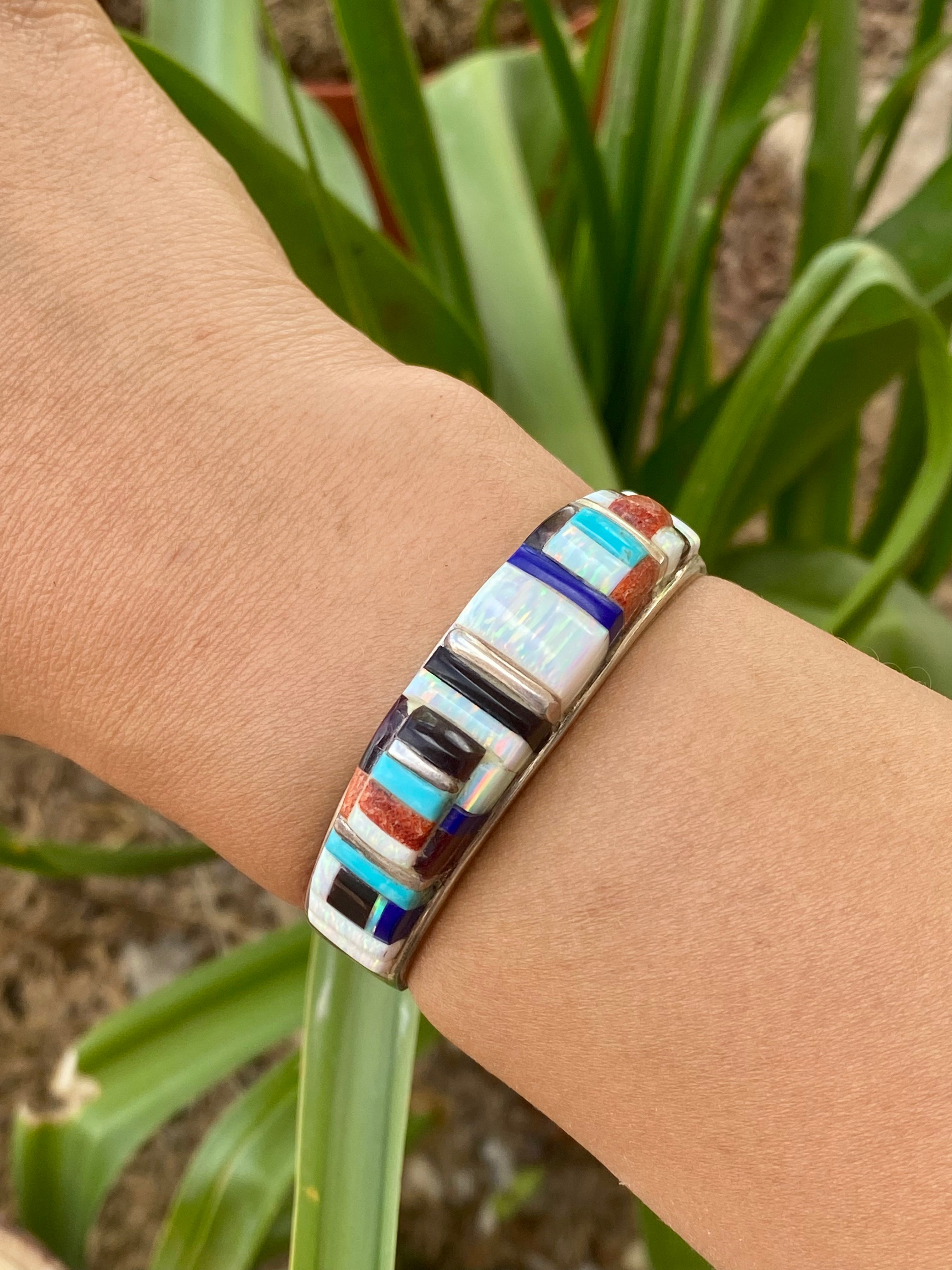 Vintage Navajo Made Multi Stone & Sterling Silver Cobblestone Cuff Bracelet