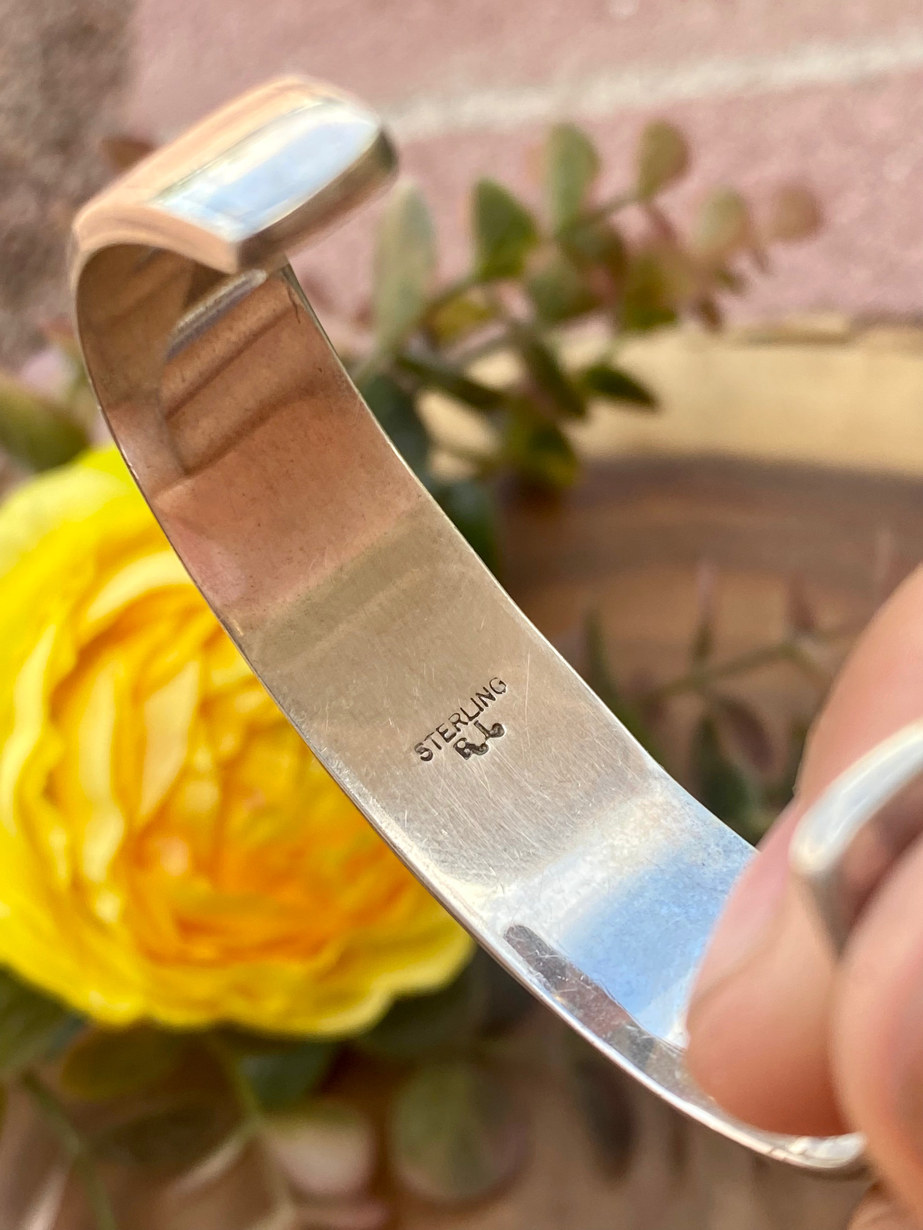 Vintage Navajo Made Multi Stone & Sterling Silver Cobblestone Cuff Bracelet. It measures just over 1/2 of an inch wide with an inside circumference of 4 1/2 inches and a gap of 1 1/8 inches. Signed by the artist and stamped sterling silver.