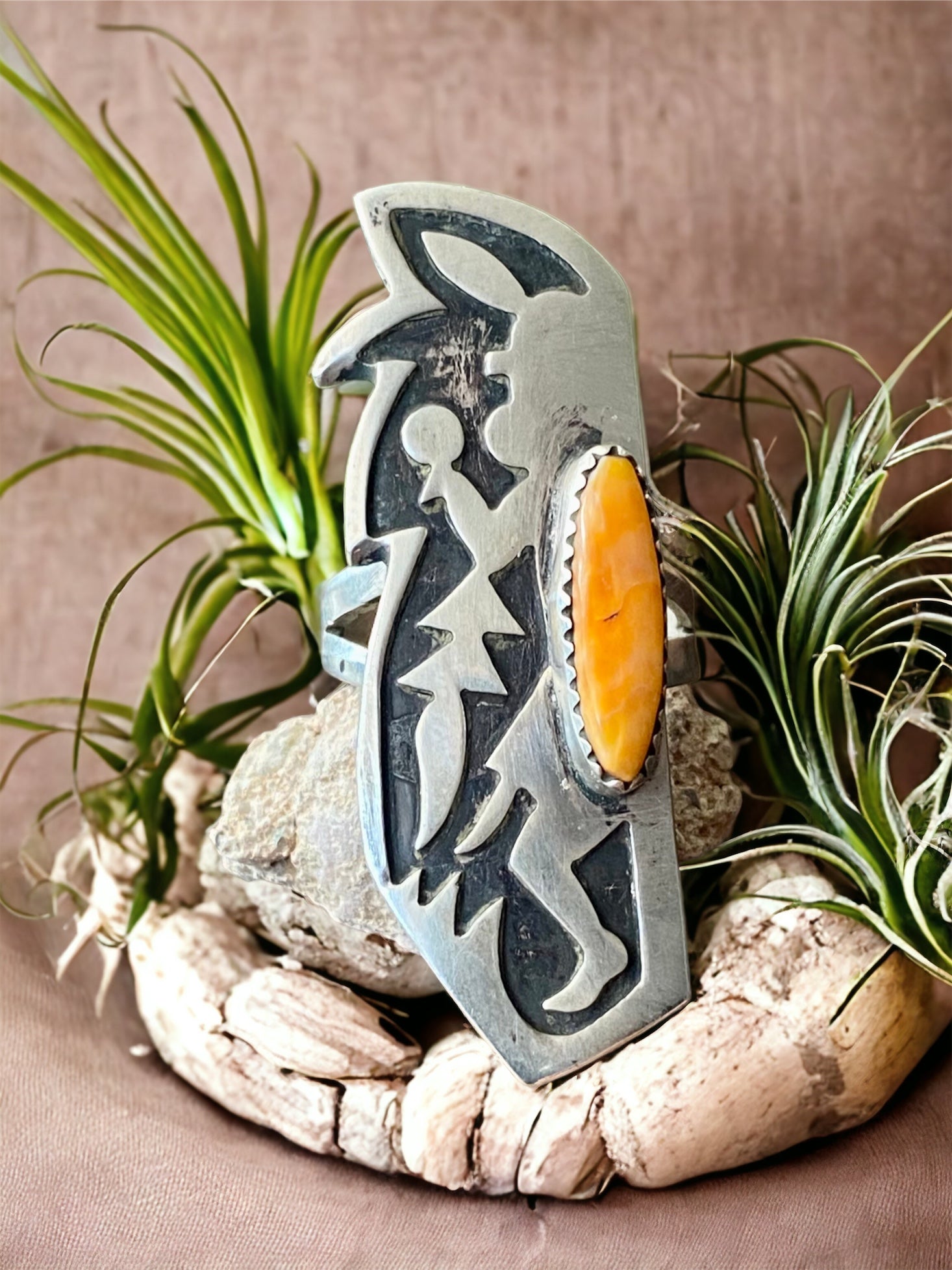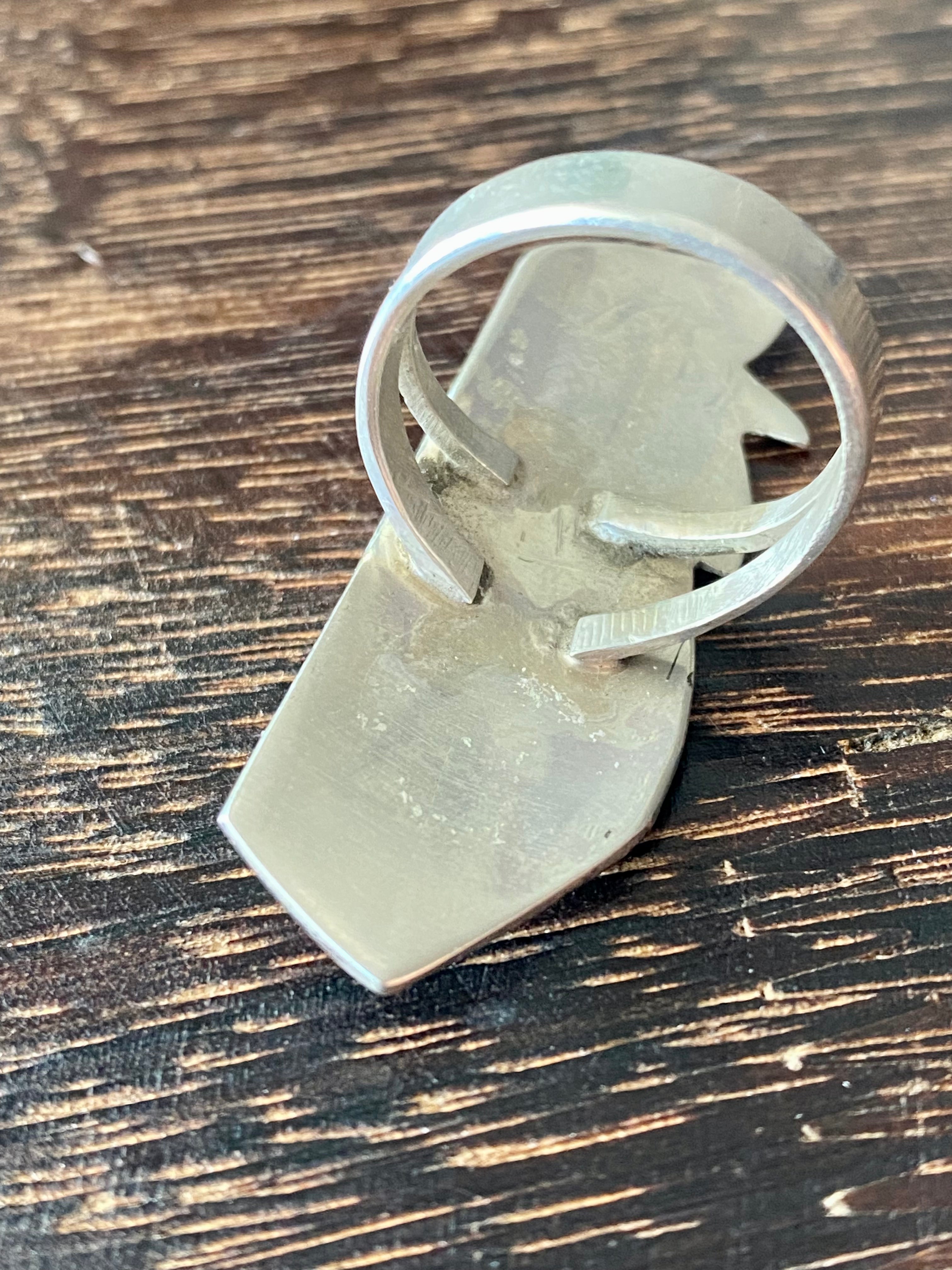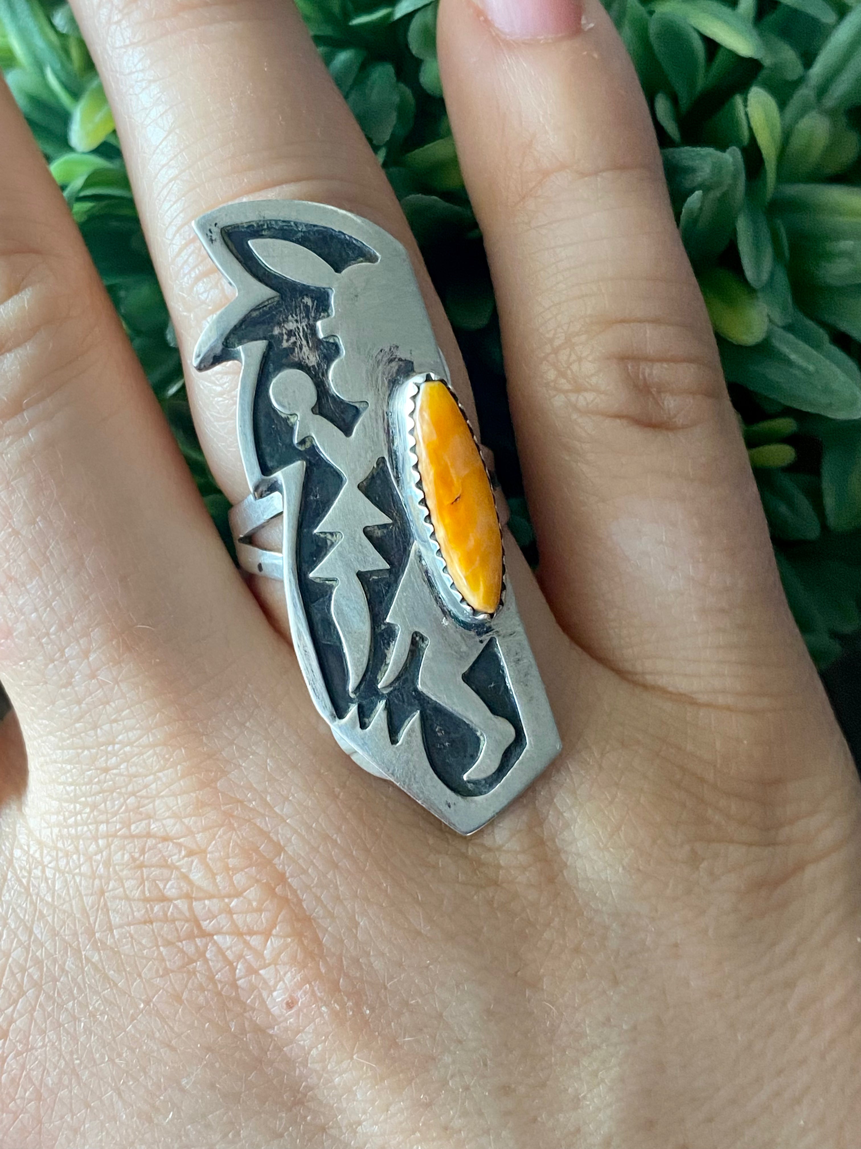 Vintage Navajo Made Spiny Oyster & Sterling Silver Ring Size 8.5. It measures just over 1 7/8 inches long and just over 5/8 of an inch wide.