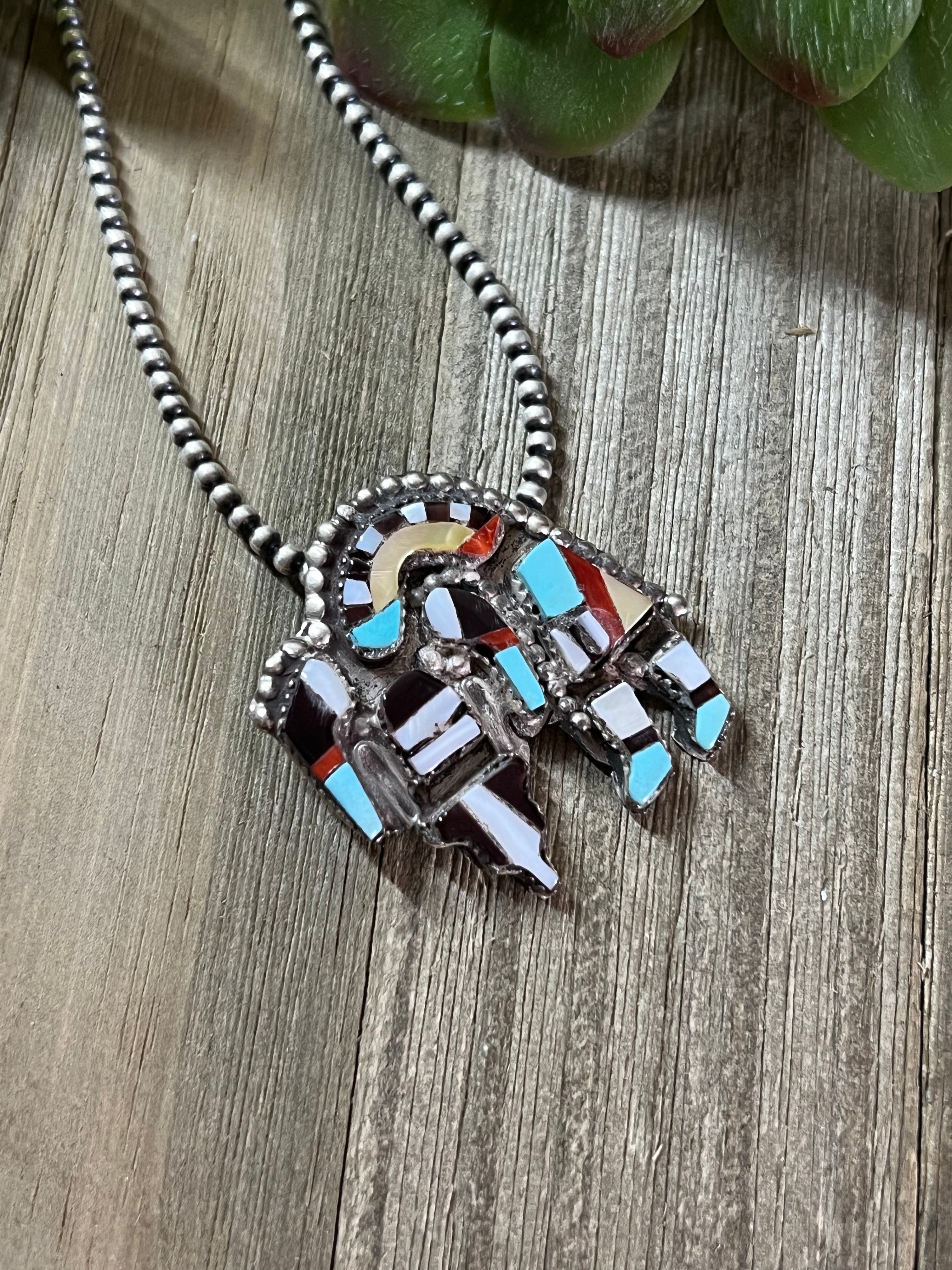 Vintage Zuni Made Multi Stone & Sterling Silver Inlay Pendant. It measures just under 1 5/8 inches long and 1 1/2 inches wide. Pendant Only!! Signed by the artist and stamped sterling silver.