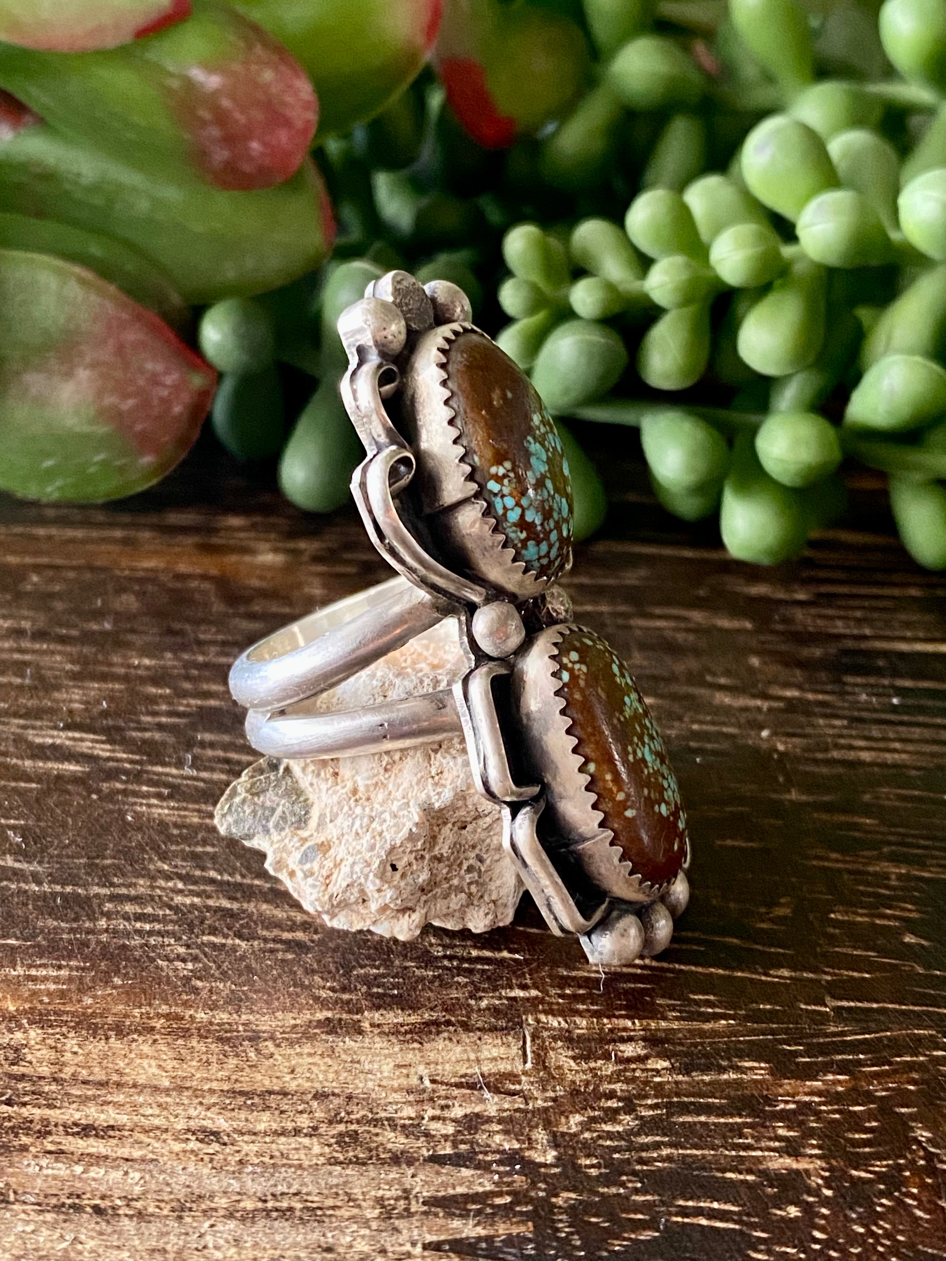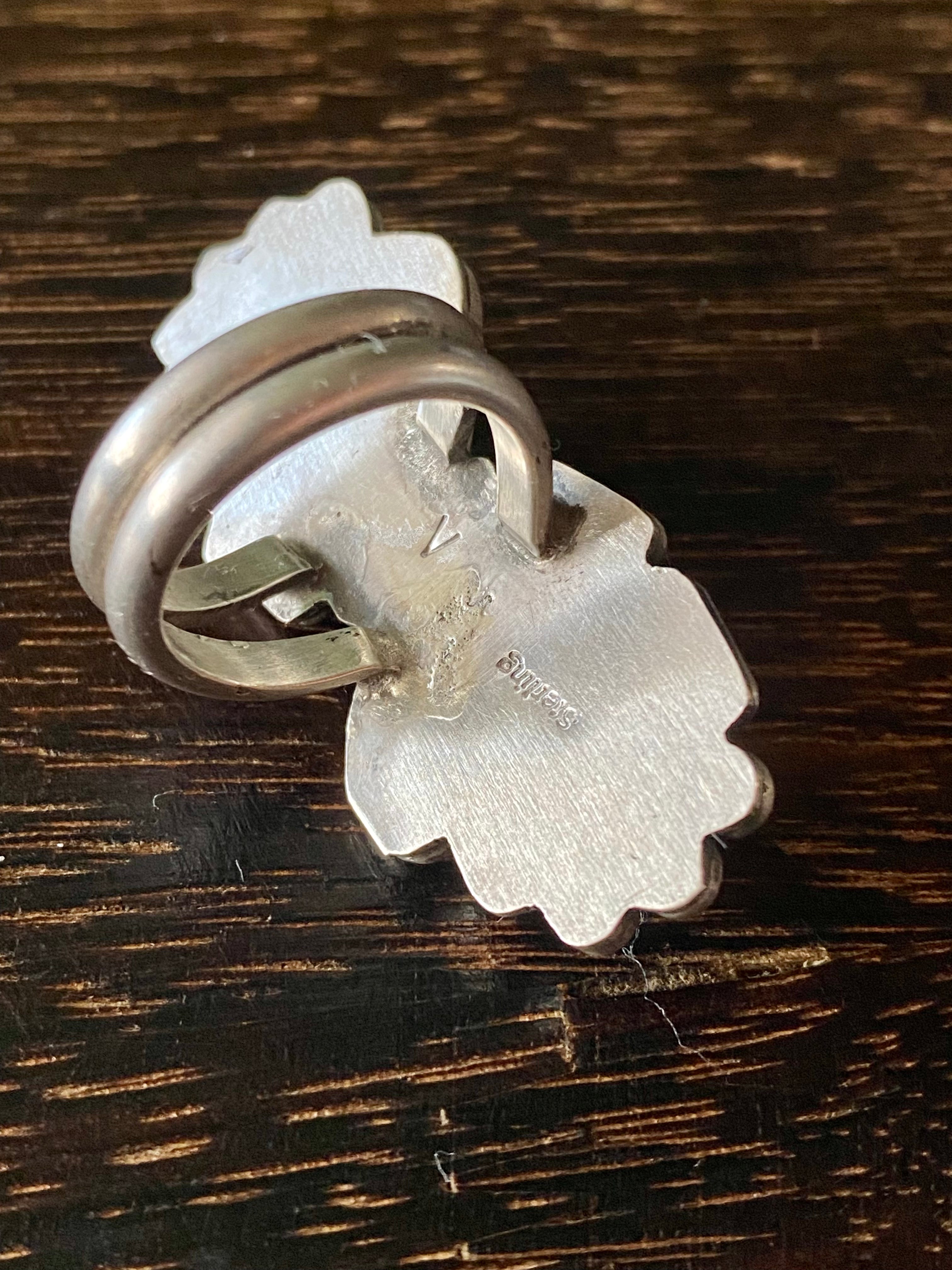 Virginia Hinio #8 Turquoise & Sterling Silver Ring Size 6.75. It measures 1 7/8 inches long and 7/8 of an inch wide. Signed by the artist and stamped sterling silver.