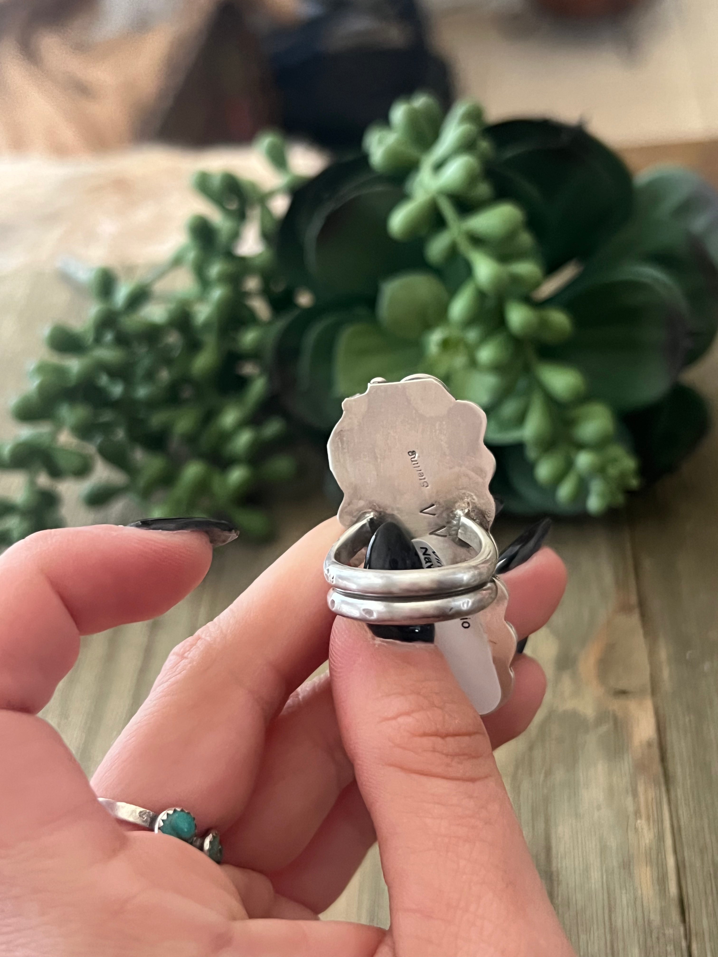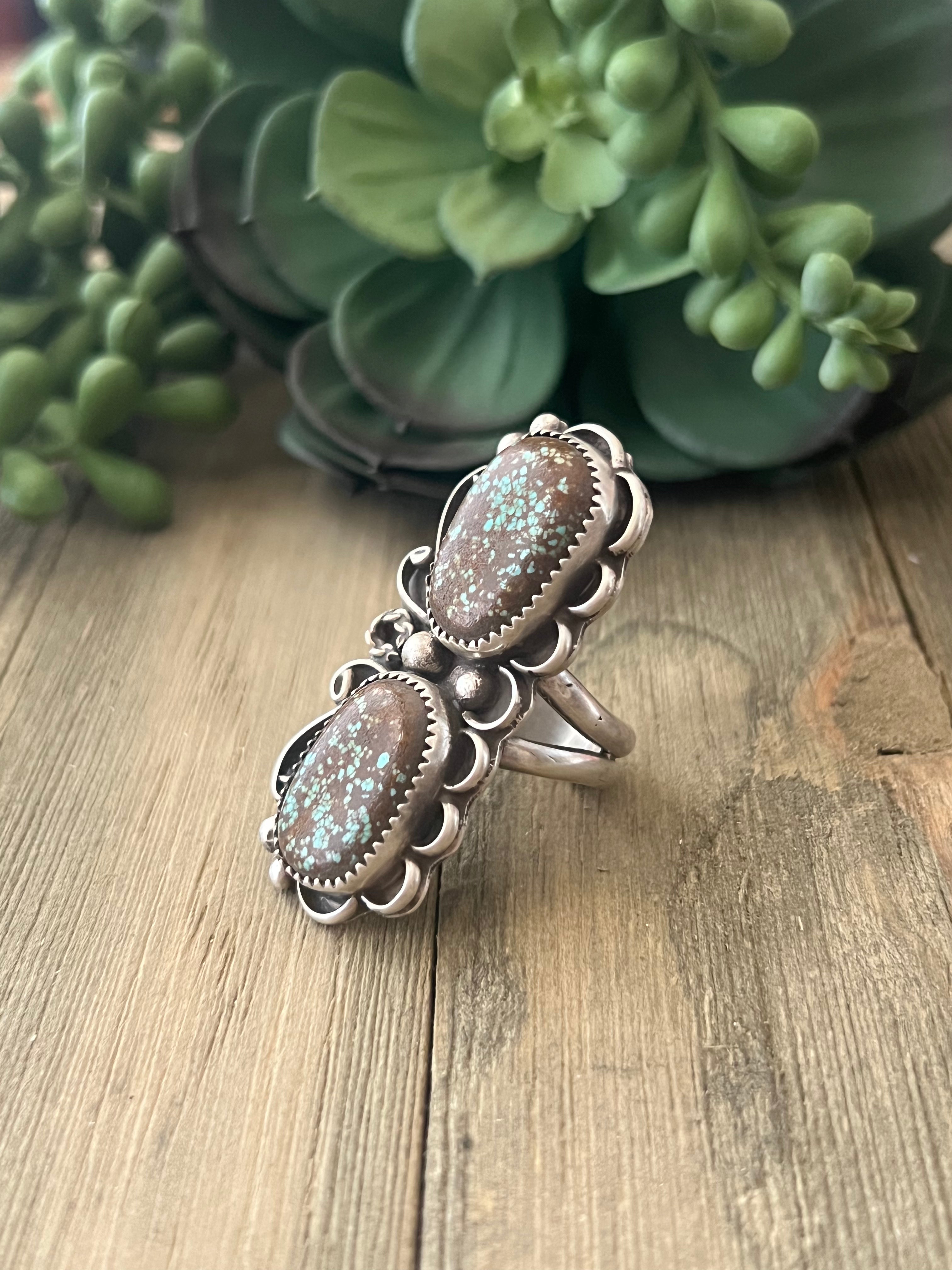 Virginia Hinio #8 Turquoise & Sterling Silver Ring Size 7.25. It measures 2 inches long and just over 7/8 of an inch wide. Signed by artist and stamped sterling silver.