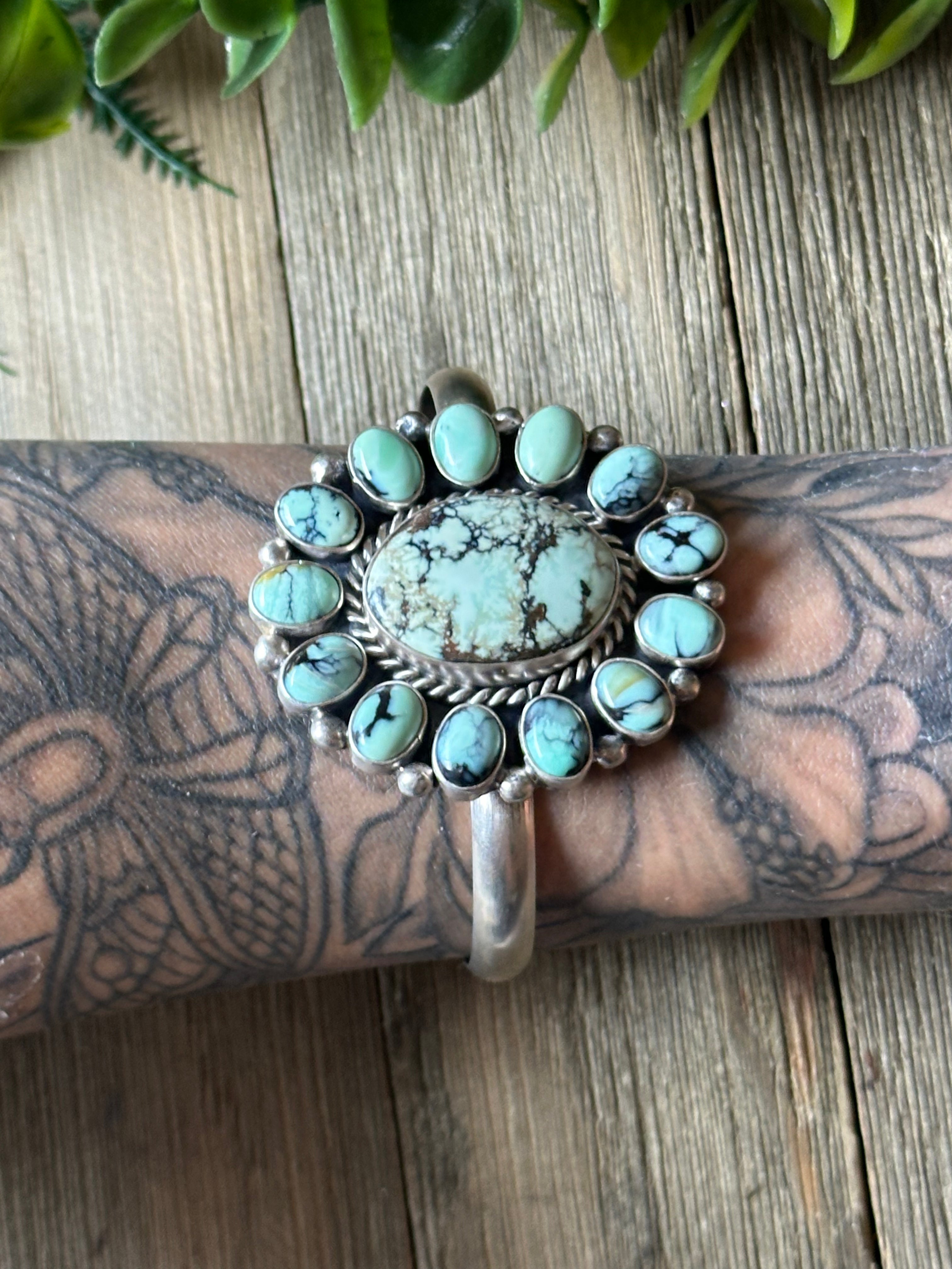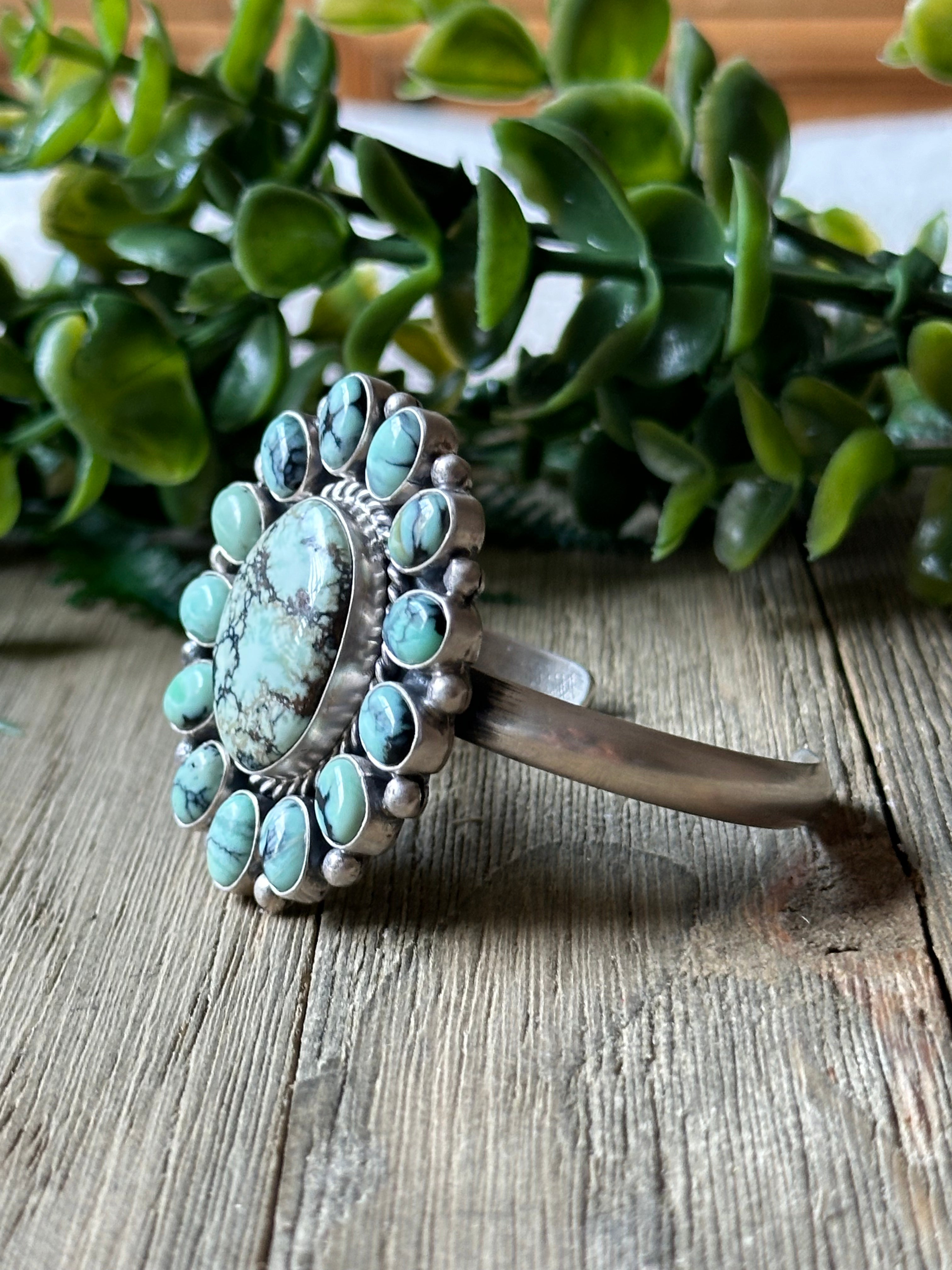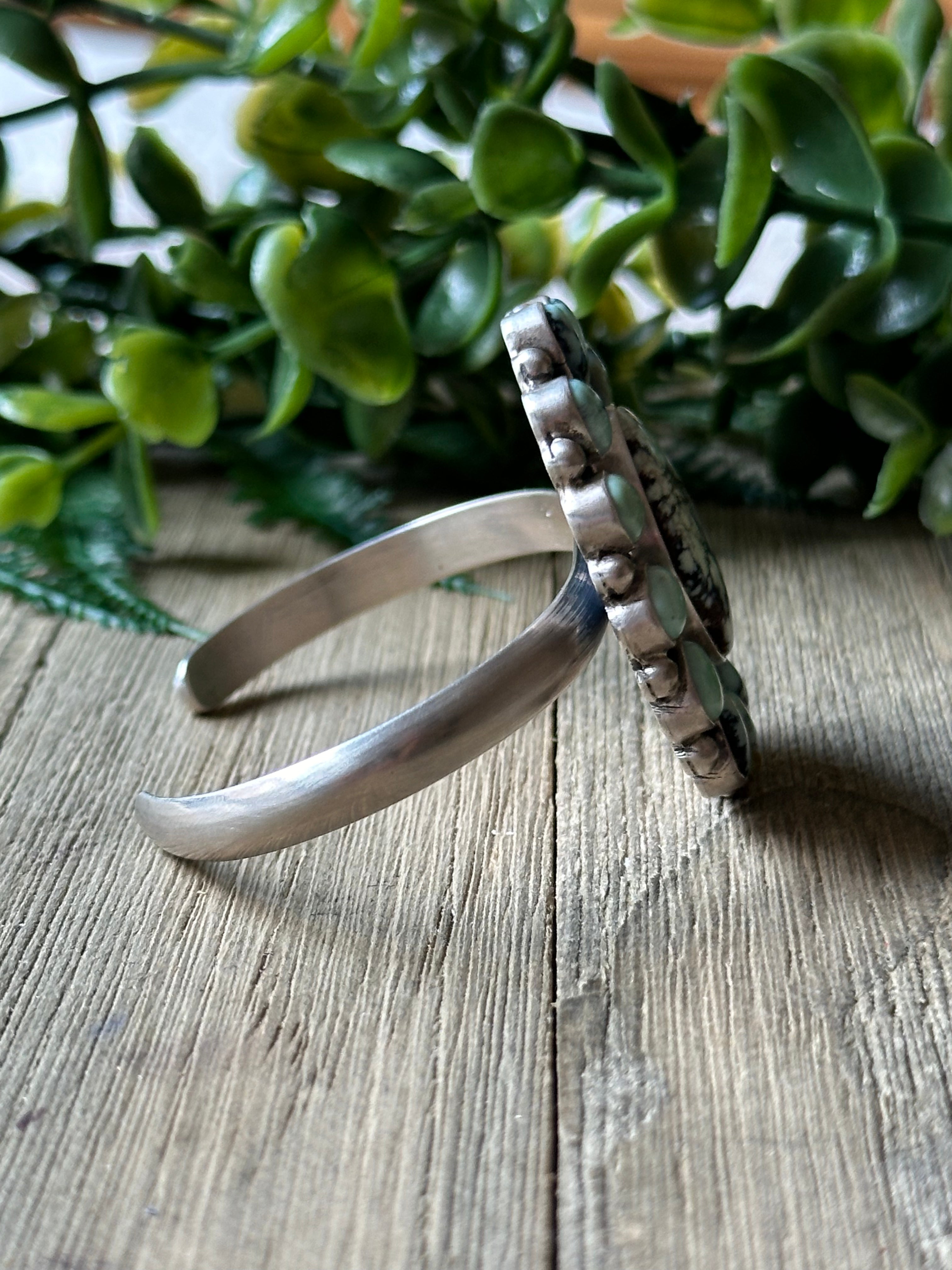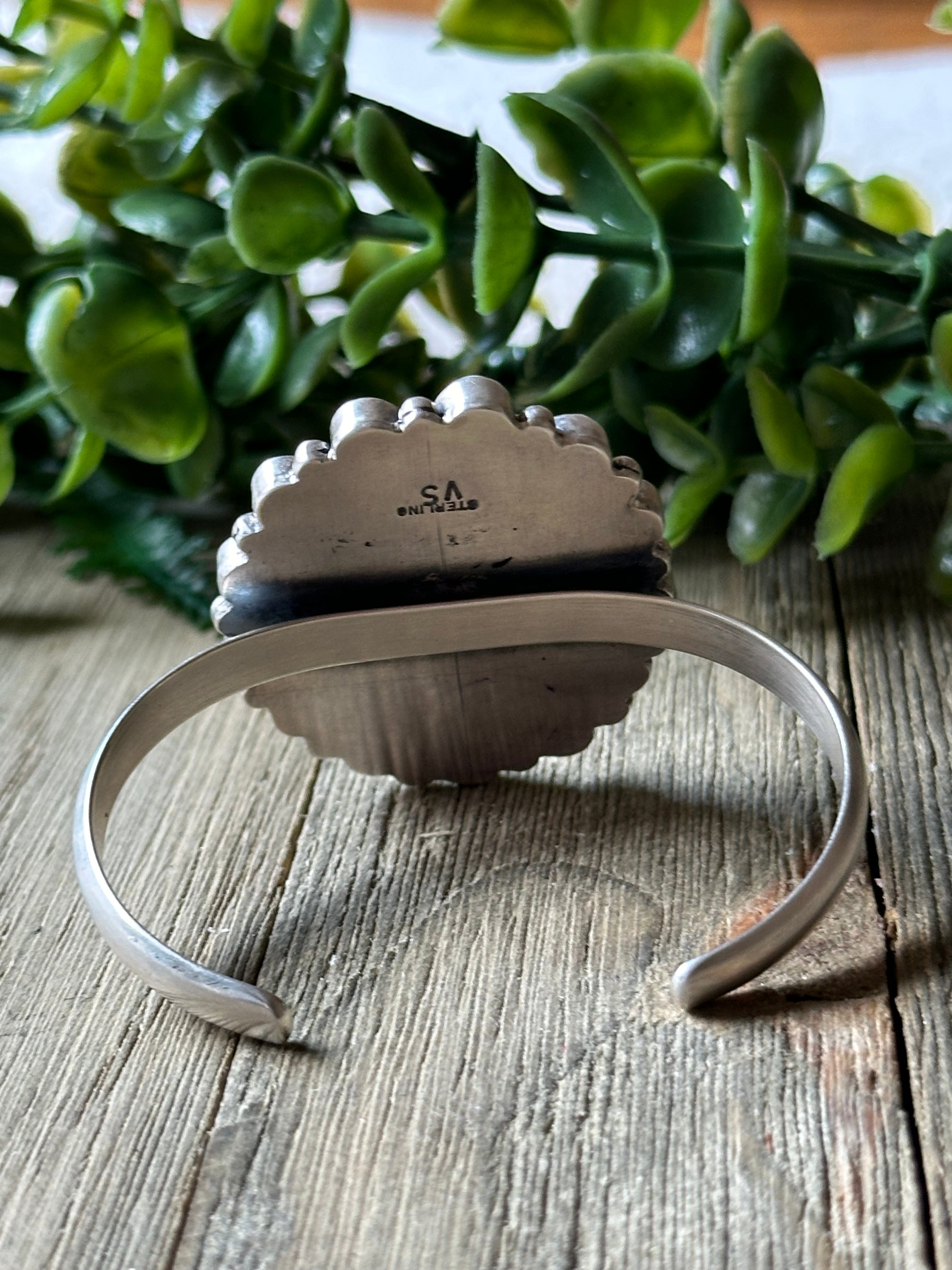 Virginia Sandoval New Lander Varasite & Sterling Silver Cuff Bracelet. It measures 1 3/4 inches wide with an inside circumference of 5 1/4 inches and a gap of 1 1/8 inches. Signed by artist and stamped sterling silver.