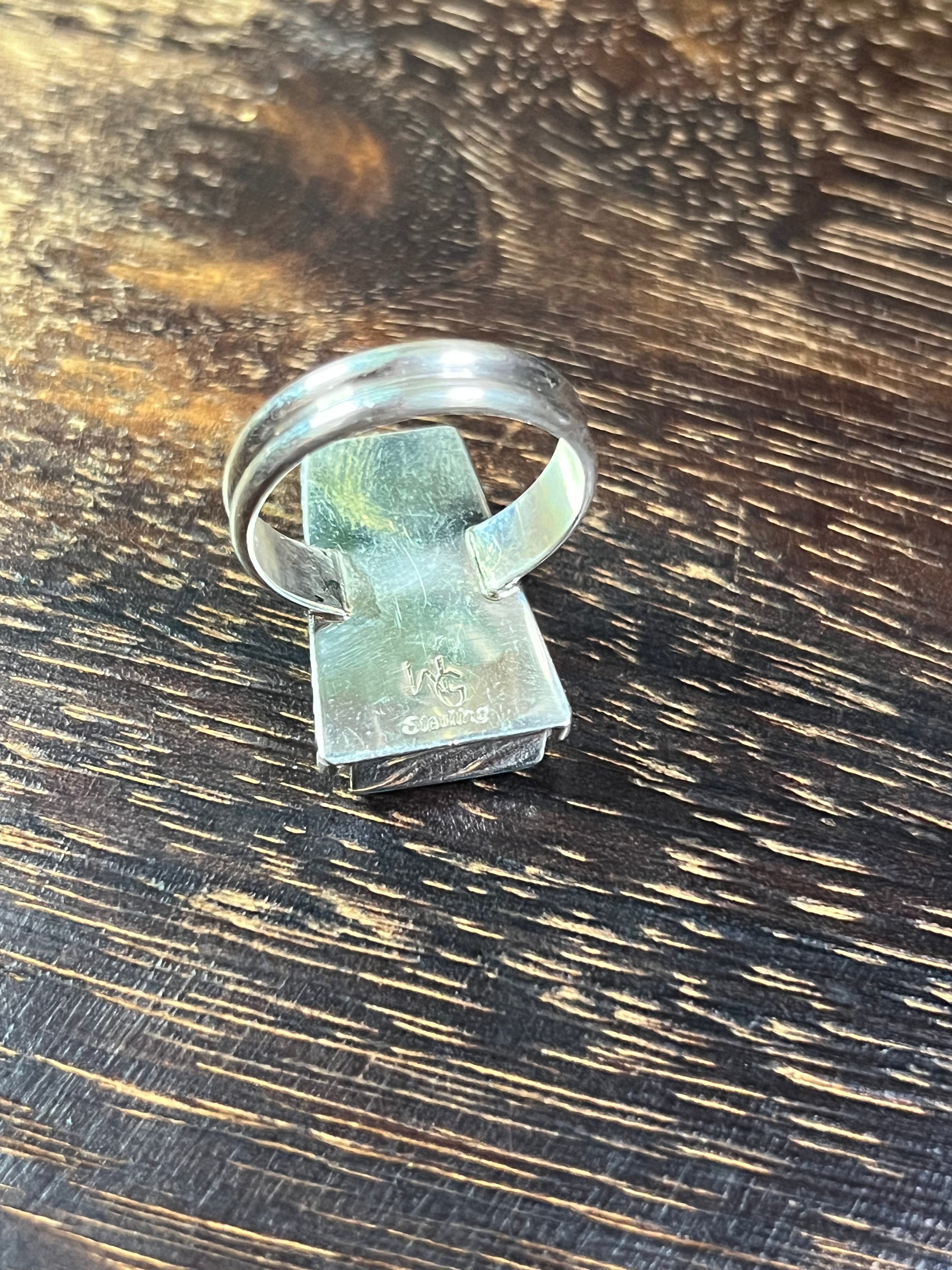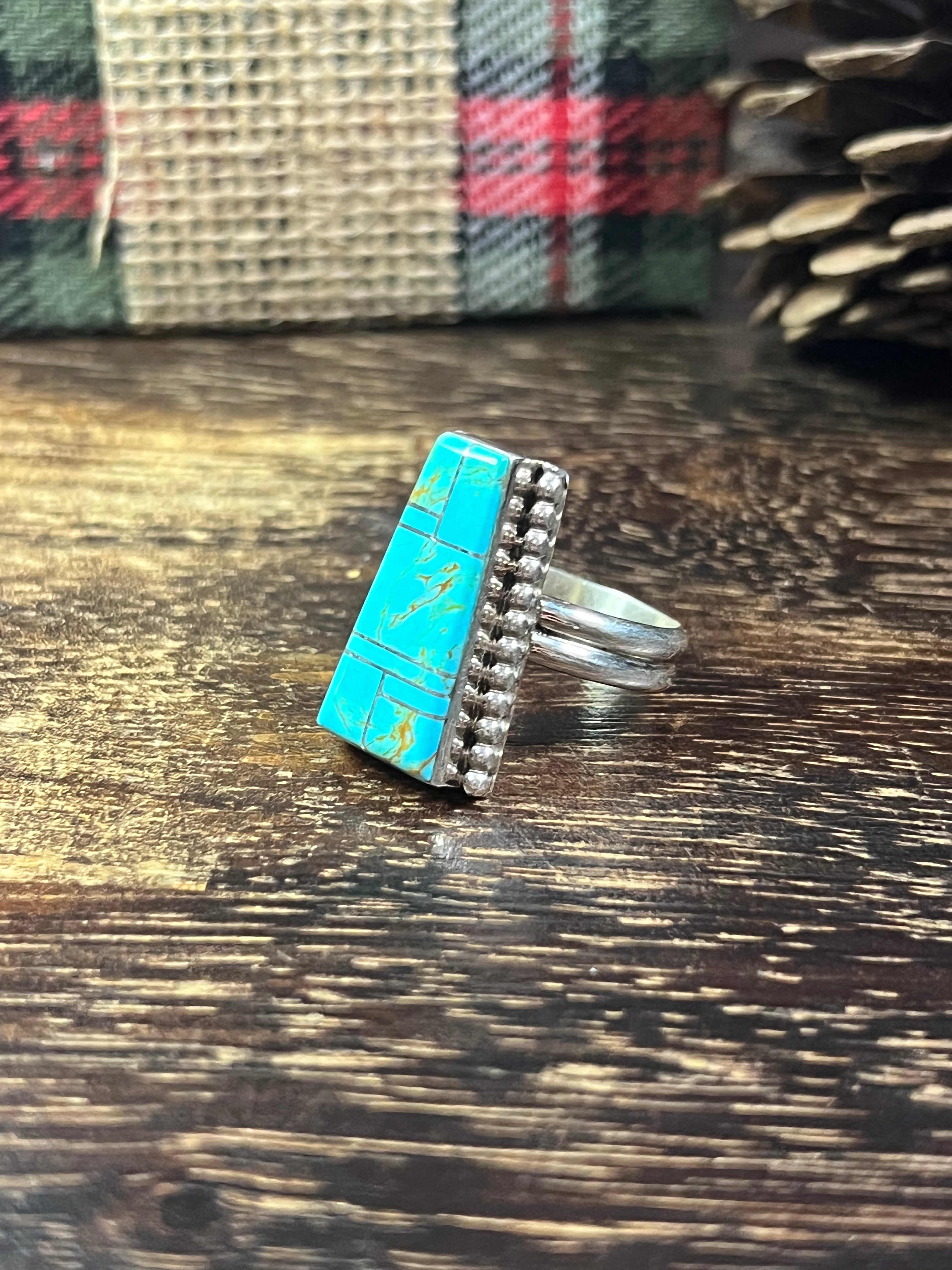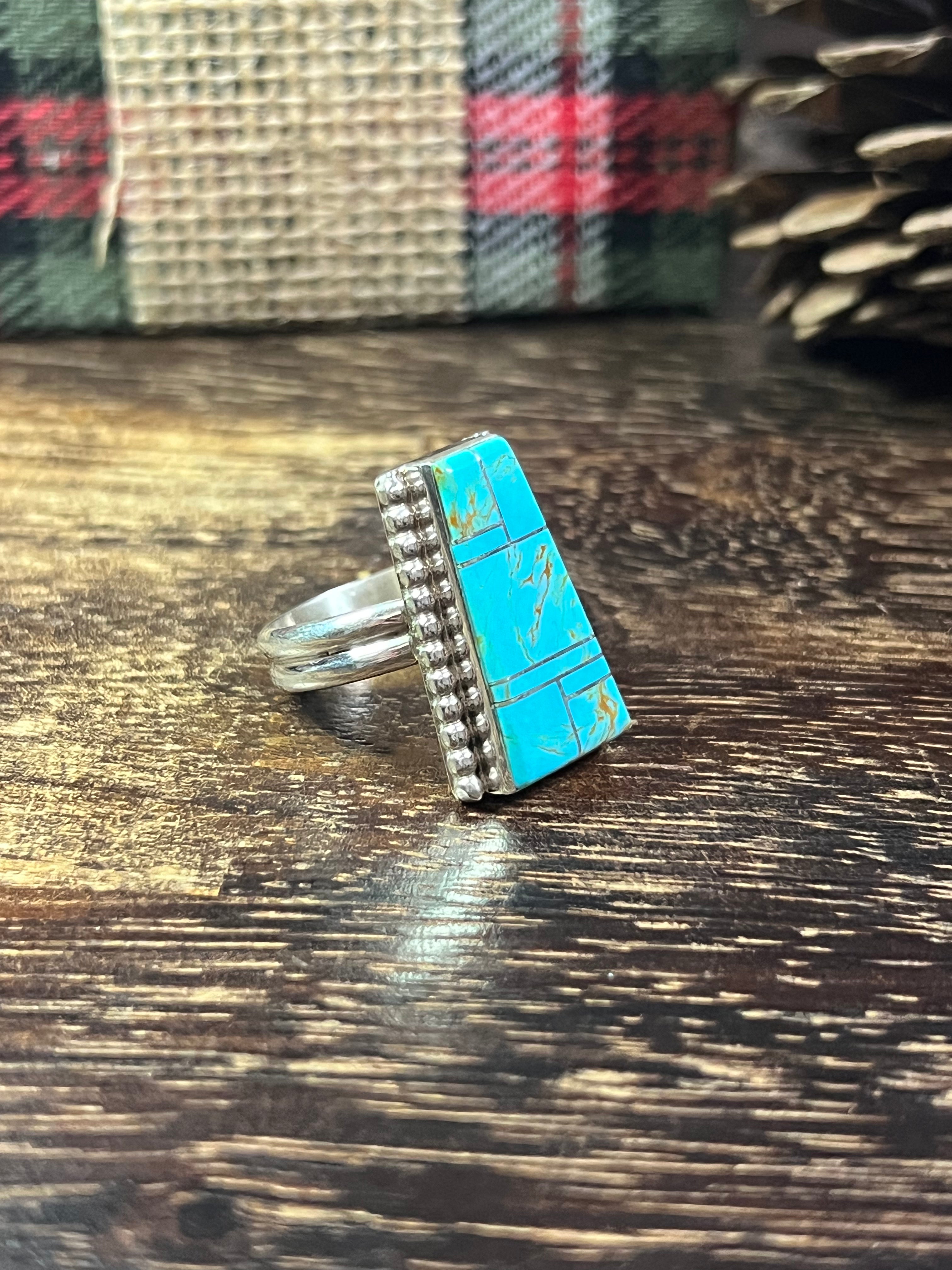 Wilbert Grey #8 Turquoise & Sterling Silver Inlay Ring Size 10. It measures 1 inch long and just under 5/8 of an inch wide. Signed by artist and stamped sterling silver.