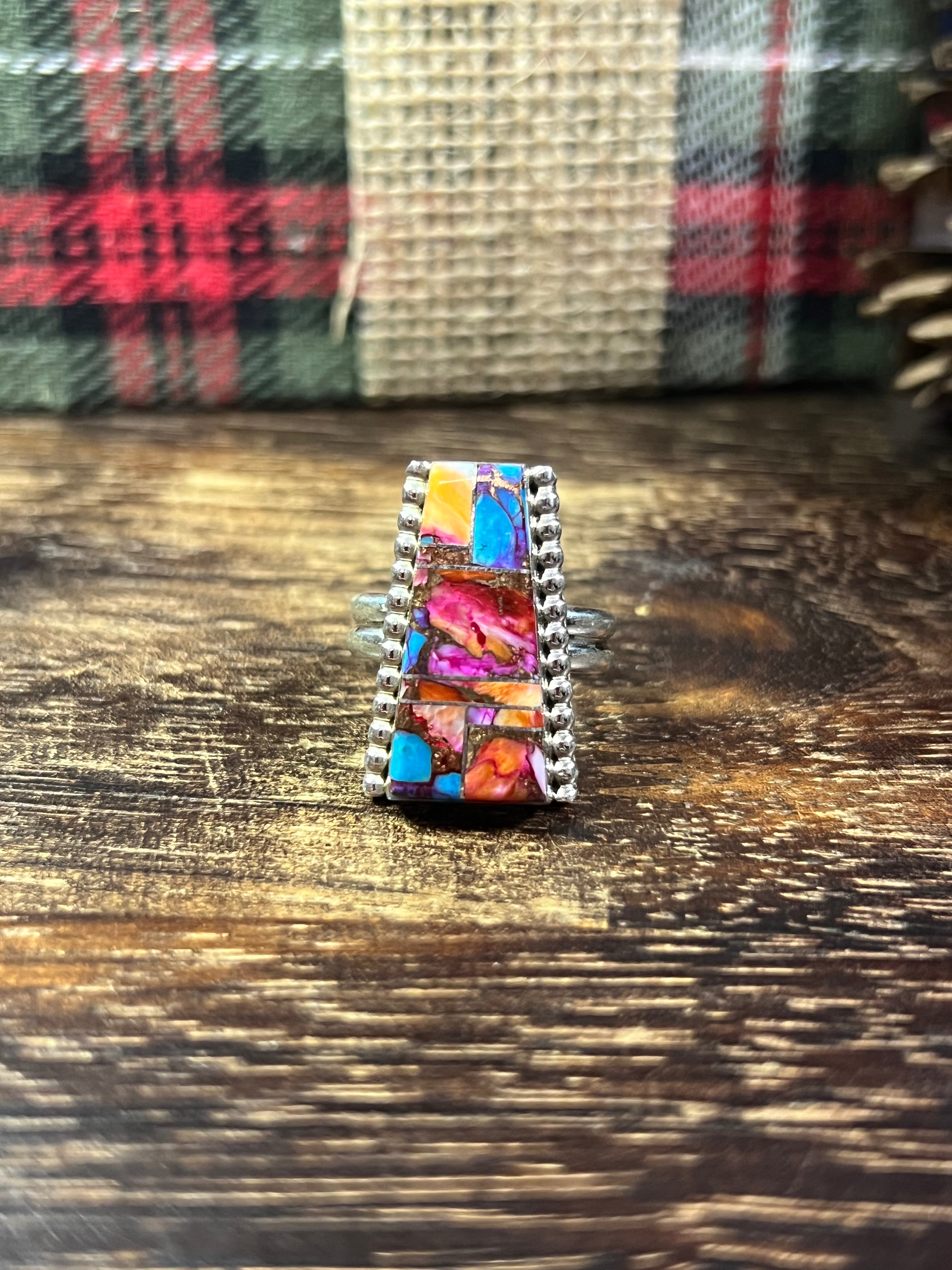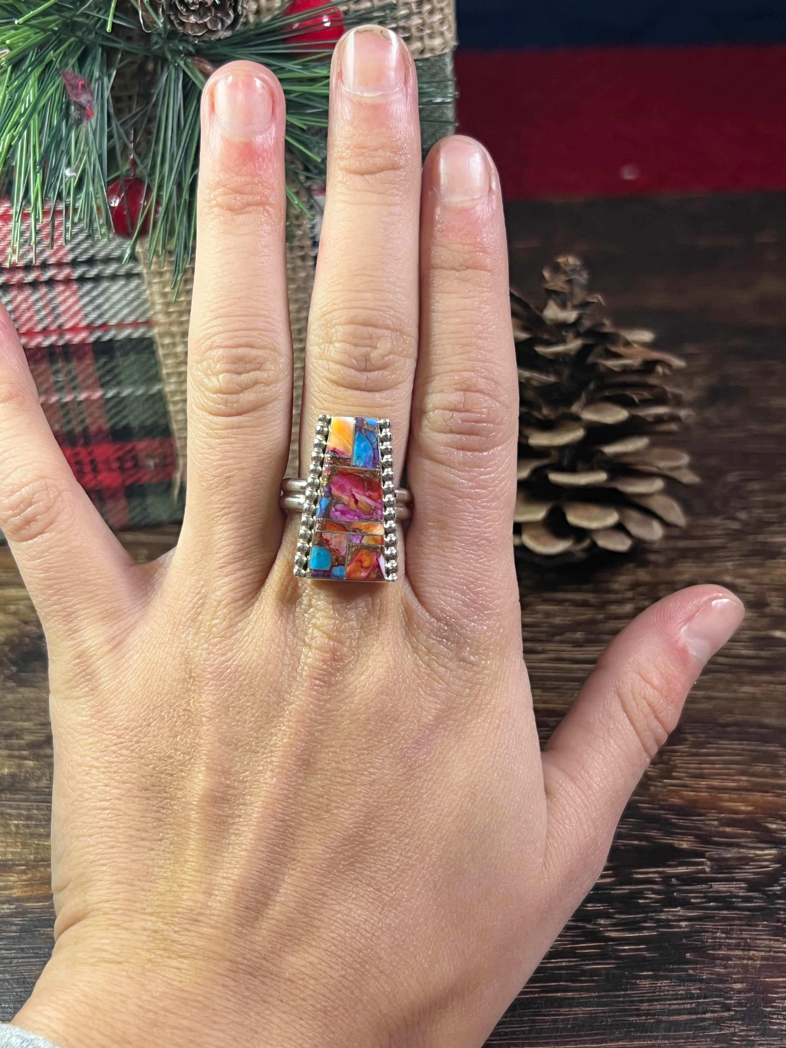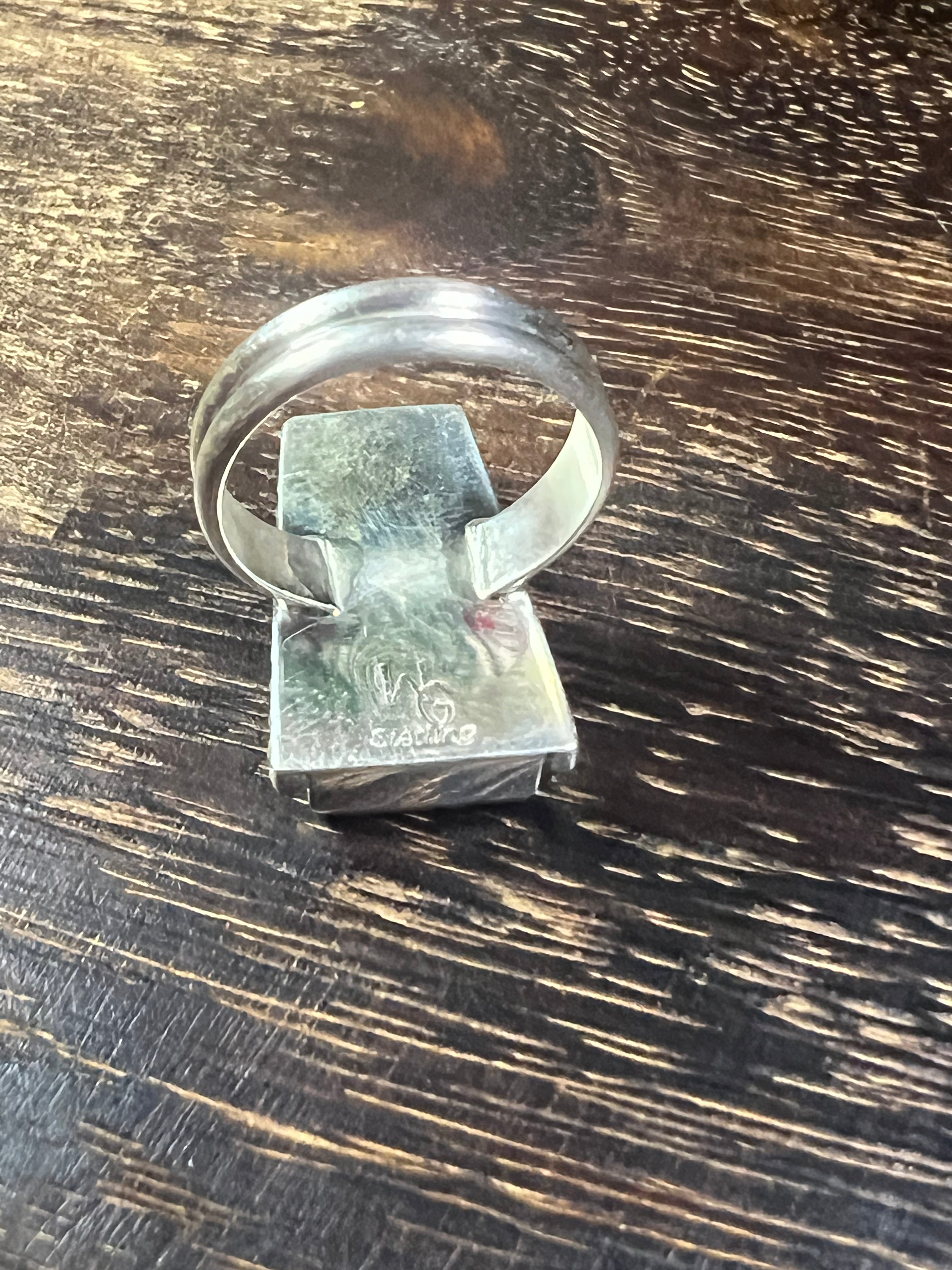 Wilbert Grey Mohave Turquoise & Sterling Silver Ring Size 8.5. It measures 1 inch long and just under 5/8 of an inch wide. Signed by artist and stamped sterling silver.