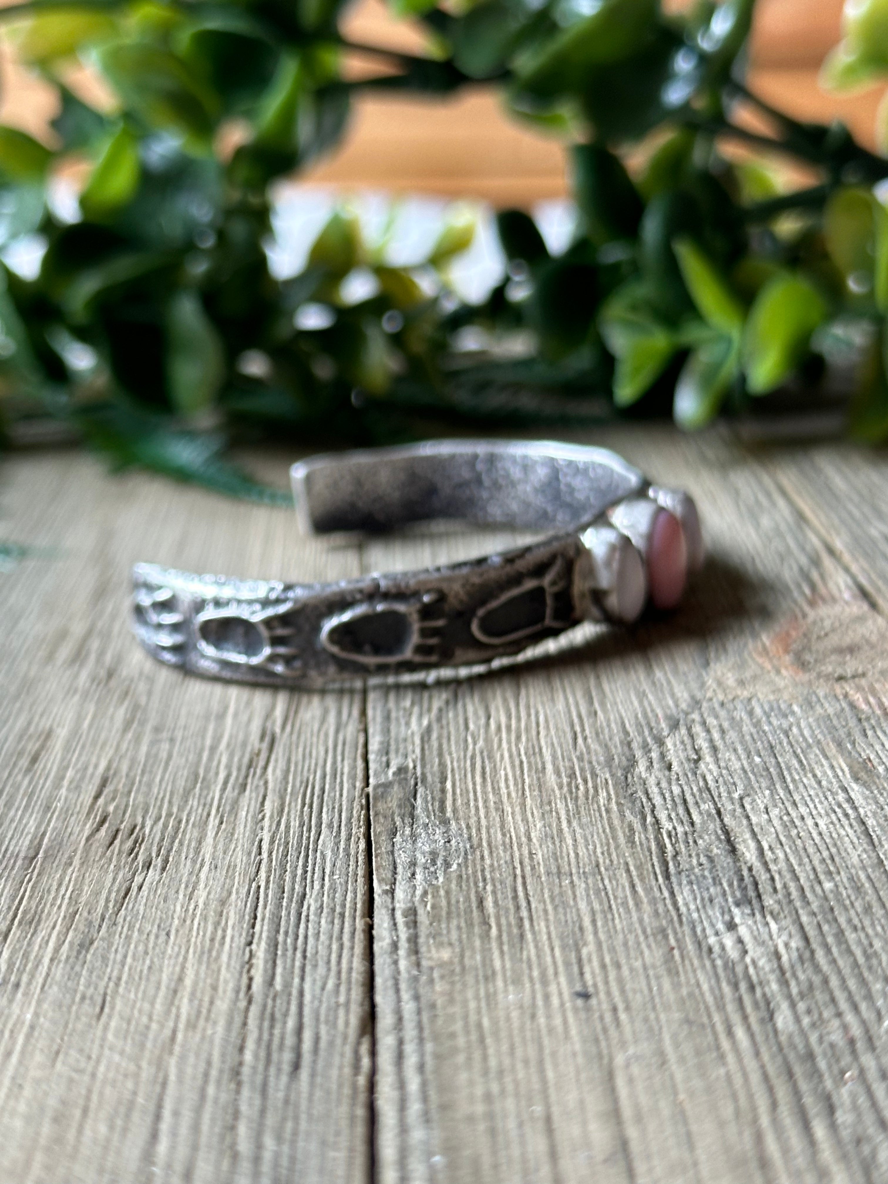 Wilson Dawes Pink Conch & Sterling Silver Tufa Cast Cuff Bracelet. It measures 3/8 of an inch wide with an inside circumference of 4 3/4 inches and a gap of 1 3/8 inches. Signed by artist and stamped sterling silver.