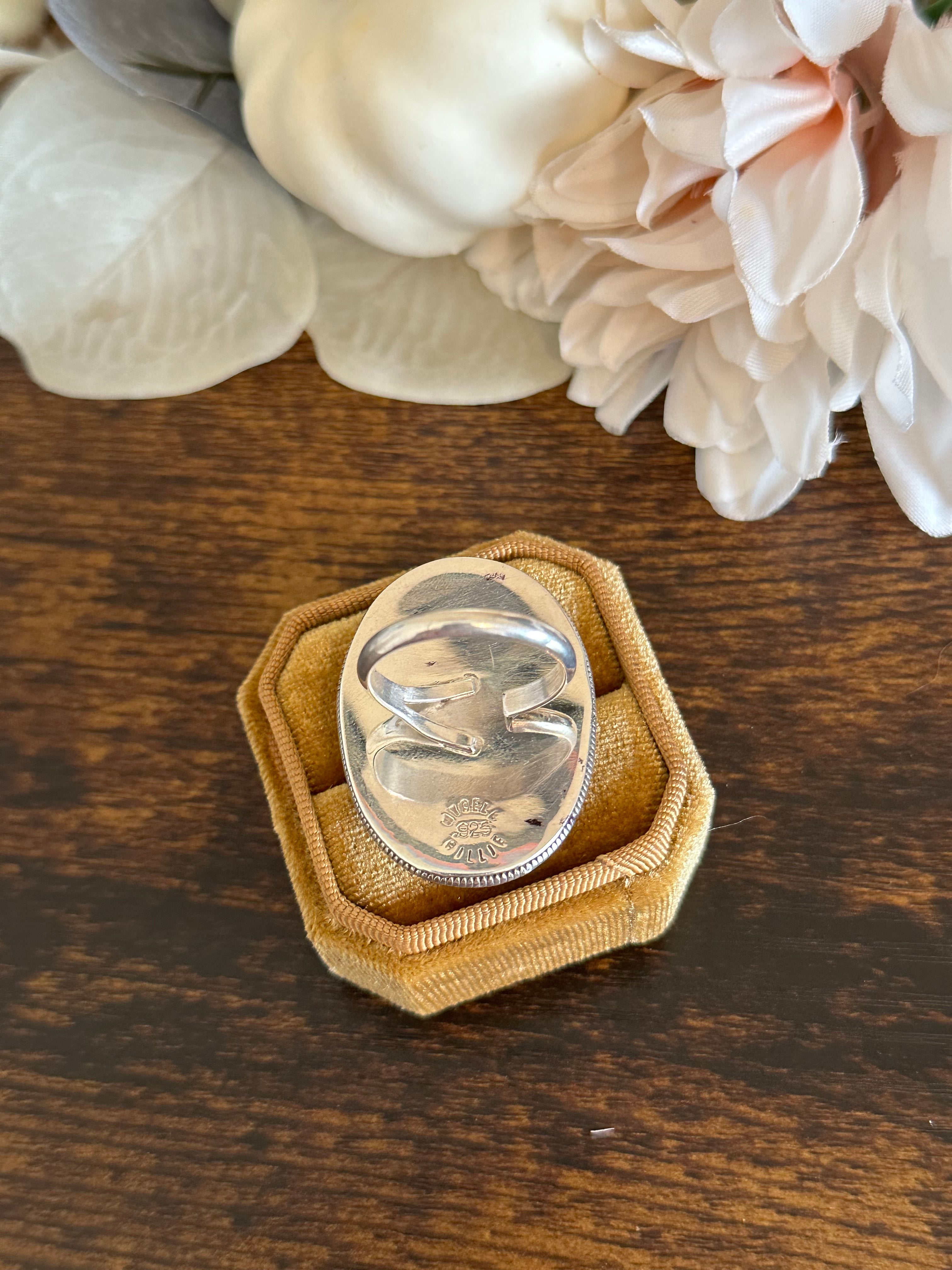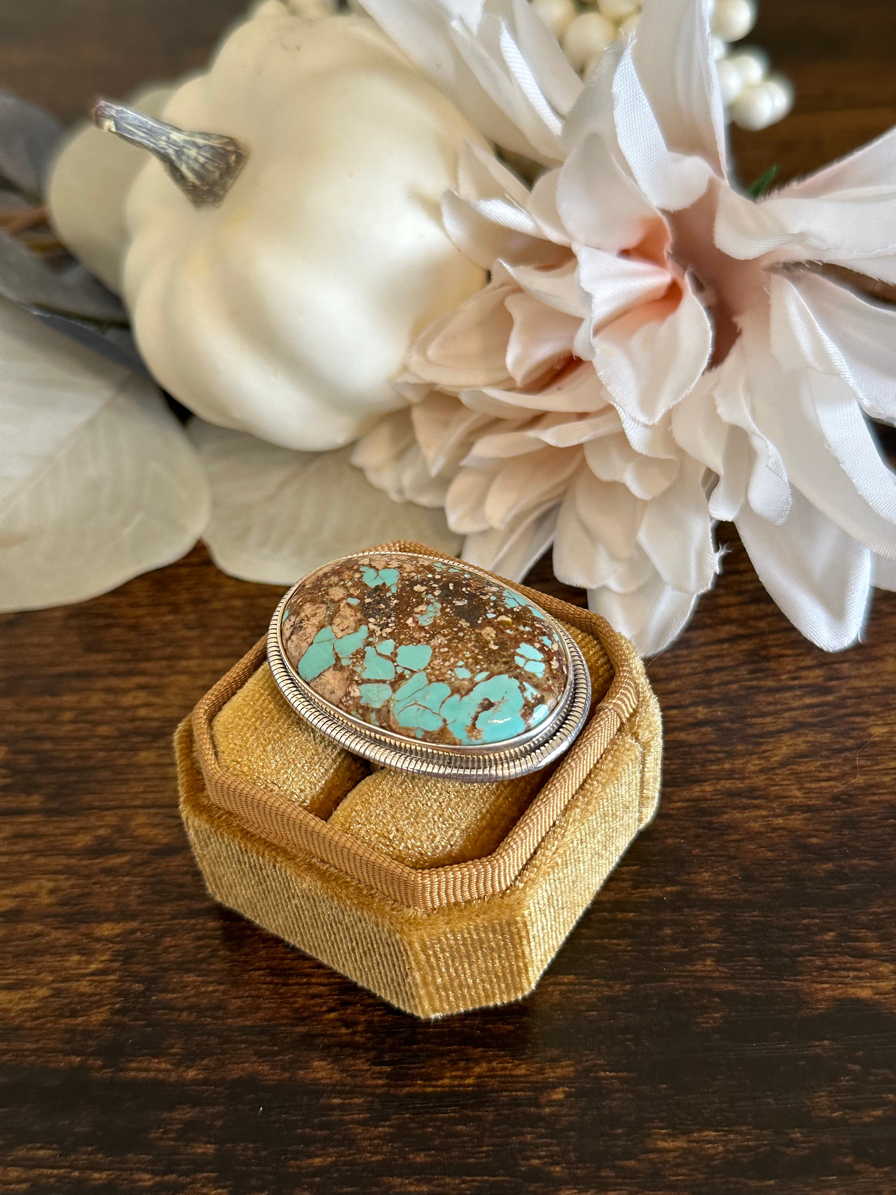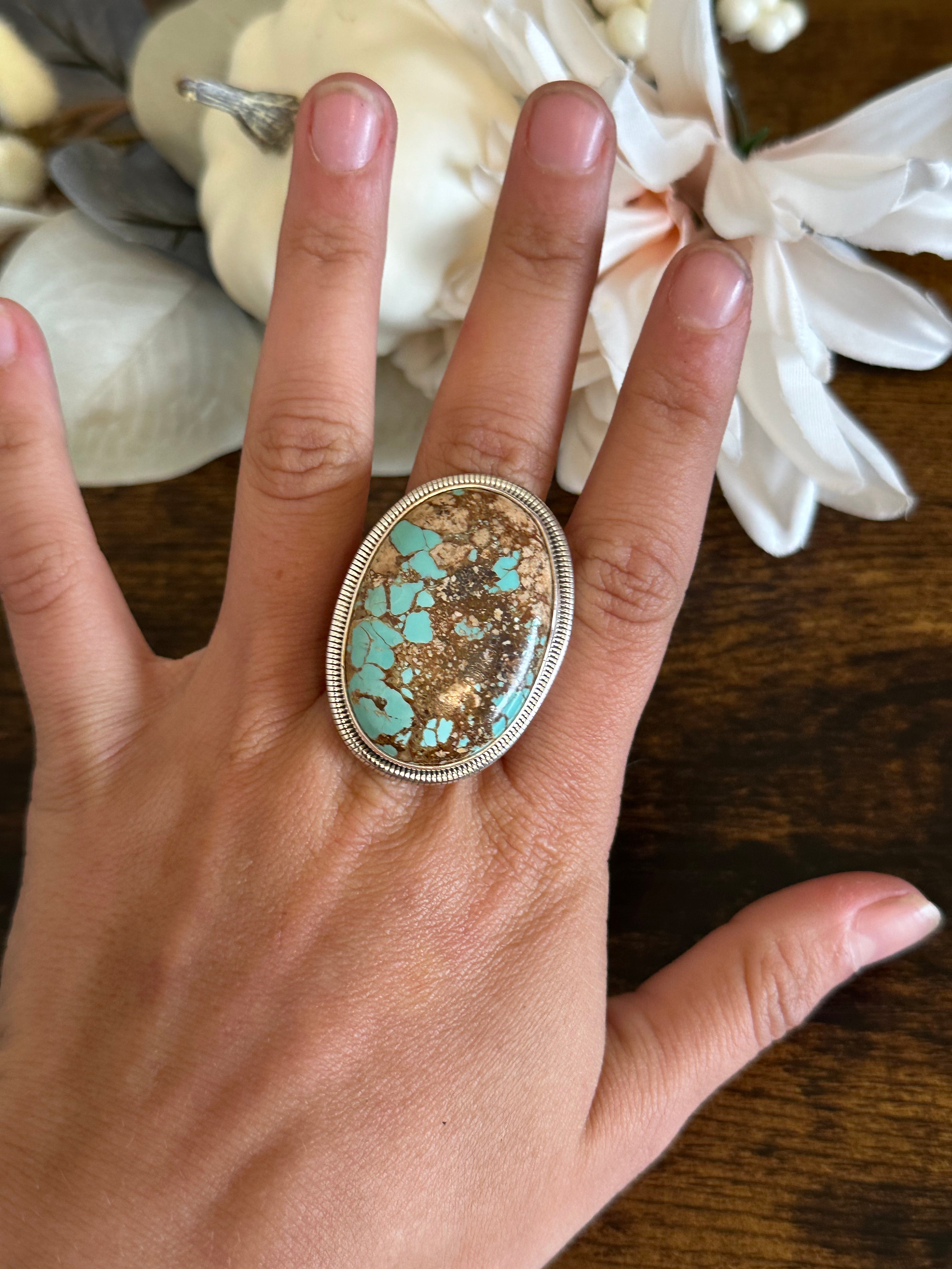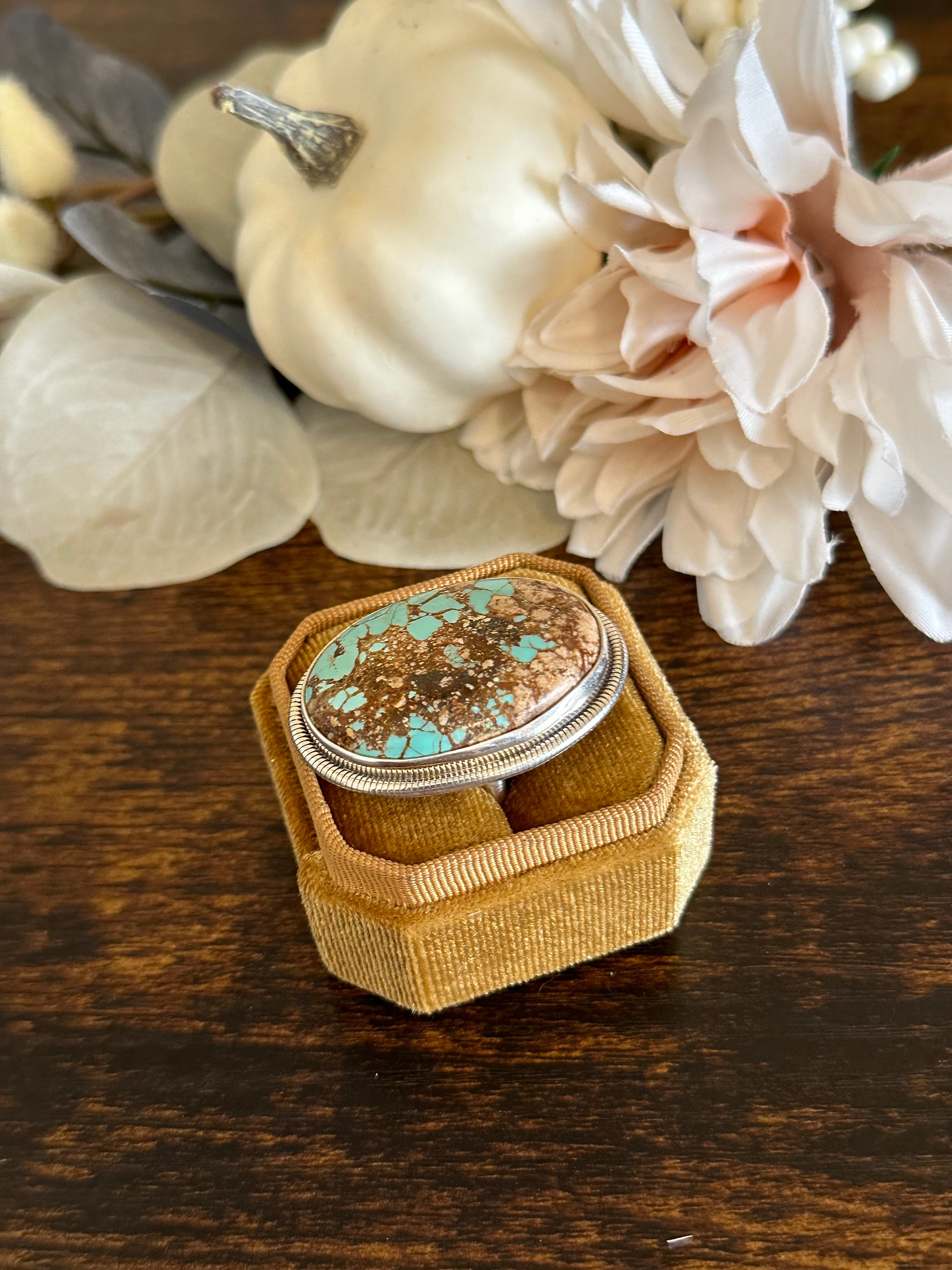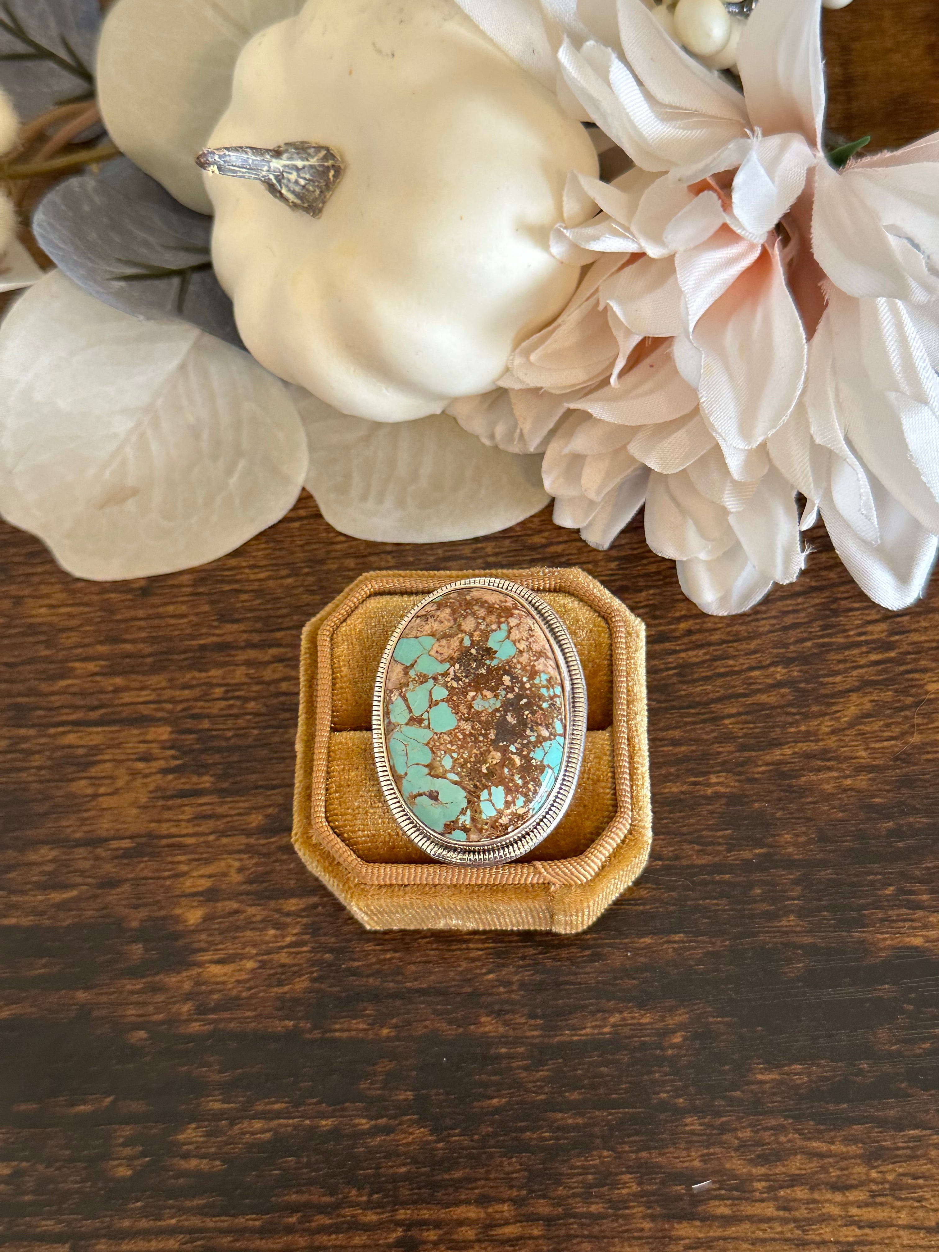 The most stunning ring. Wydell Billie Royston Turquoise & Sterling Silver Adjustable Ring. It measures 1 5/8 inches long and 1 1/8 inches wide. Signed by the artist and stamped sterling silver.