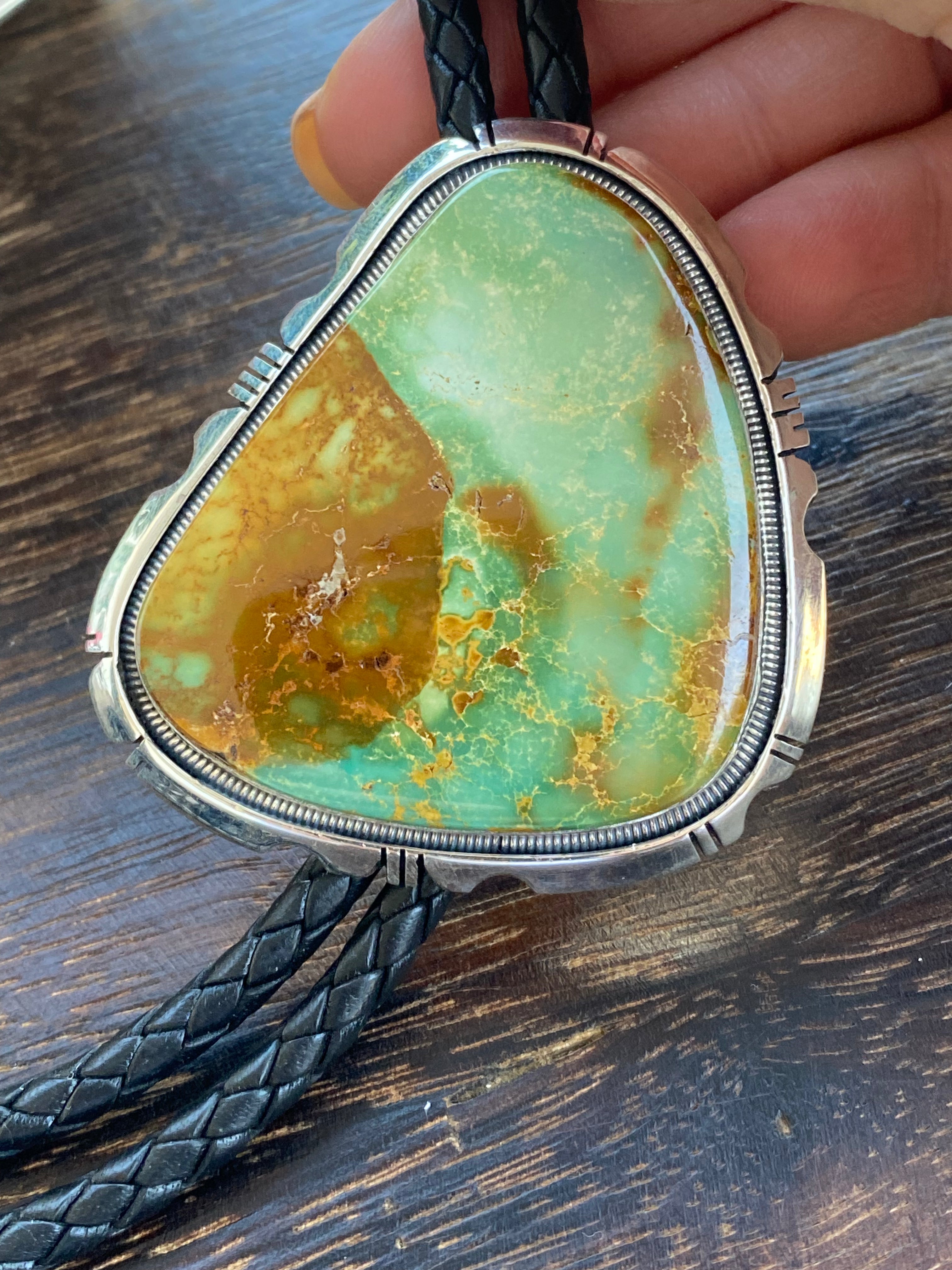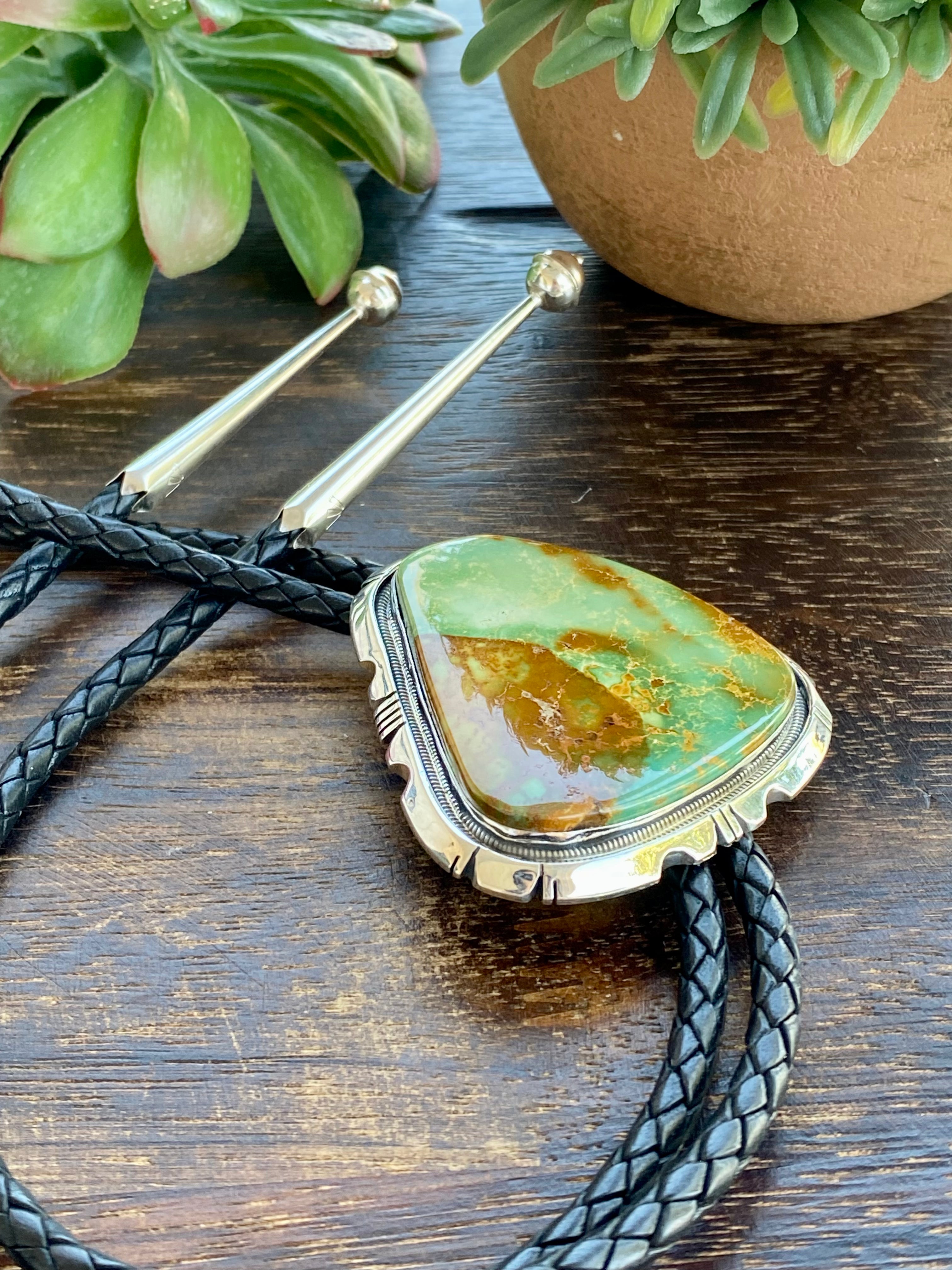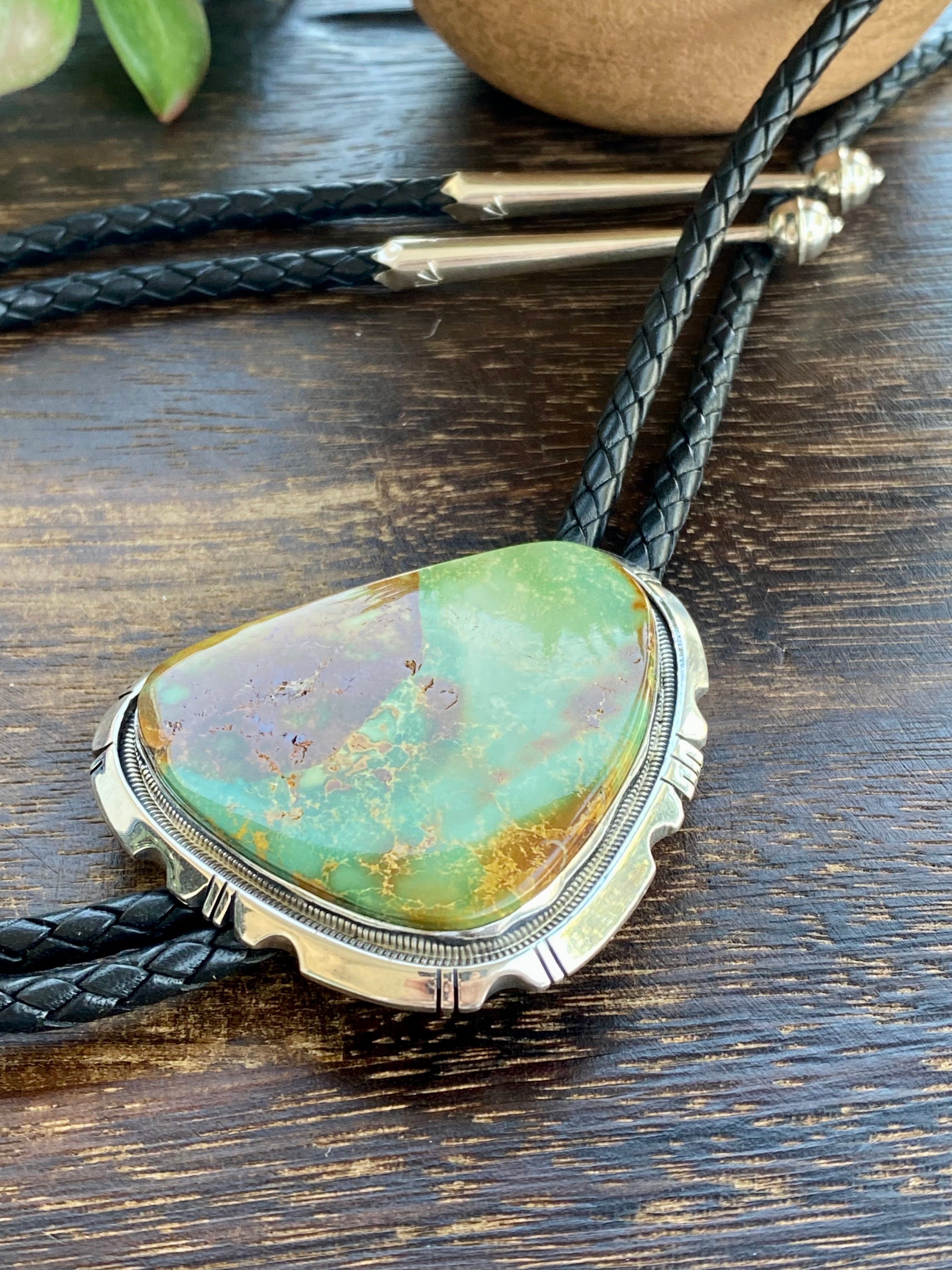 Wydell Billie Royston Turquoise & Sterling Silver Bolo Tie. It measures 22 inches long while the setting measures 2 3/8 inches long and 2 1/4 inches wide. Signed by the artist and stamped sterling silver.