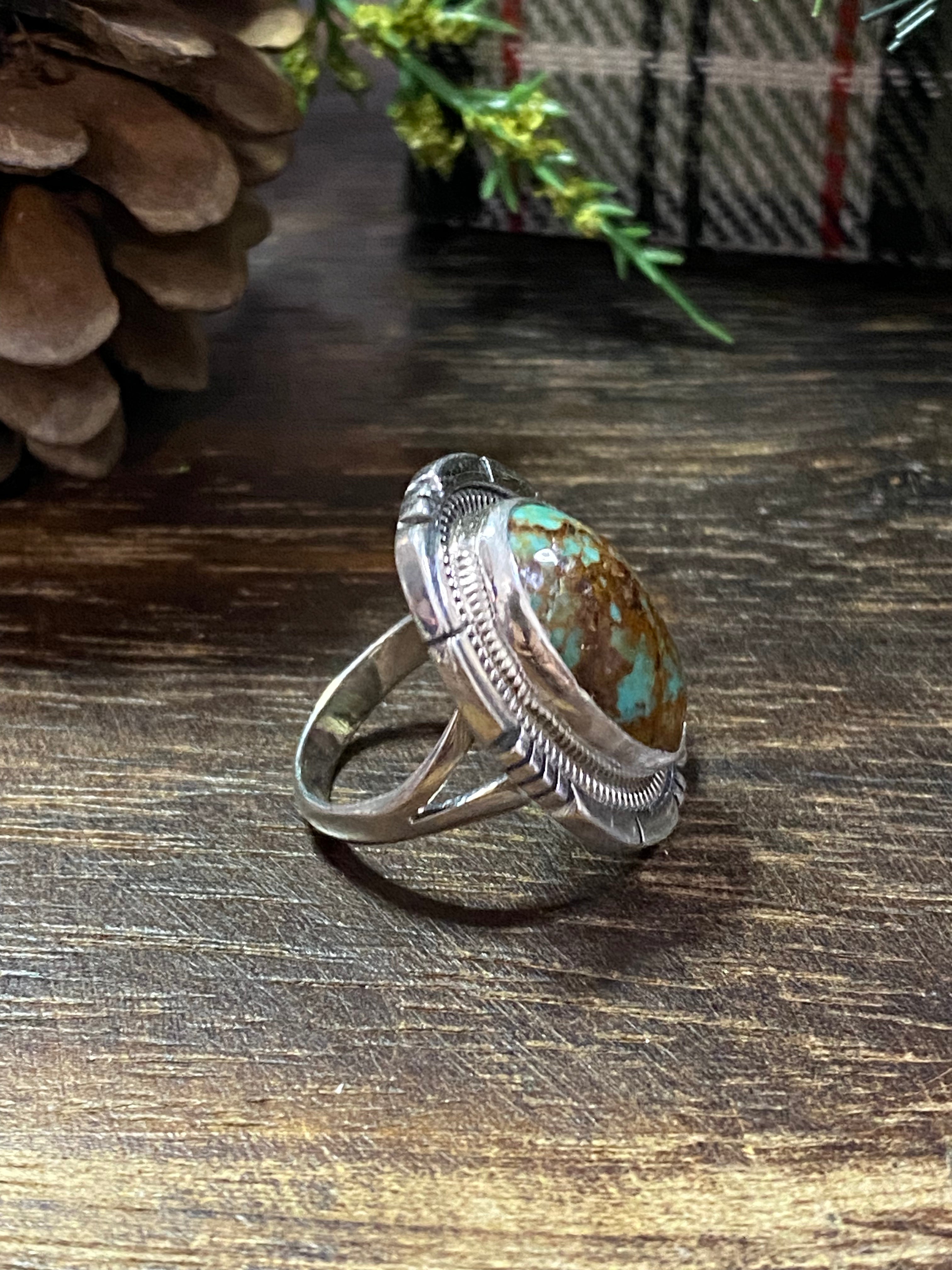 Wydell Billie Royston Turquoise & Sterling Silver Ring Size 6.25. It measures 1 1/8 inches long and just over 7/8 of an inch wide. Signed by the artist and stamped sterling silver.