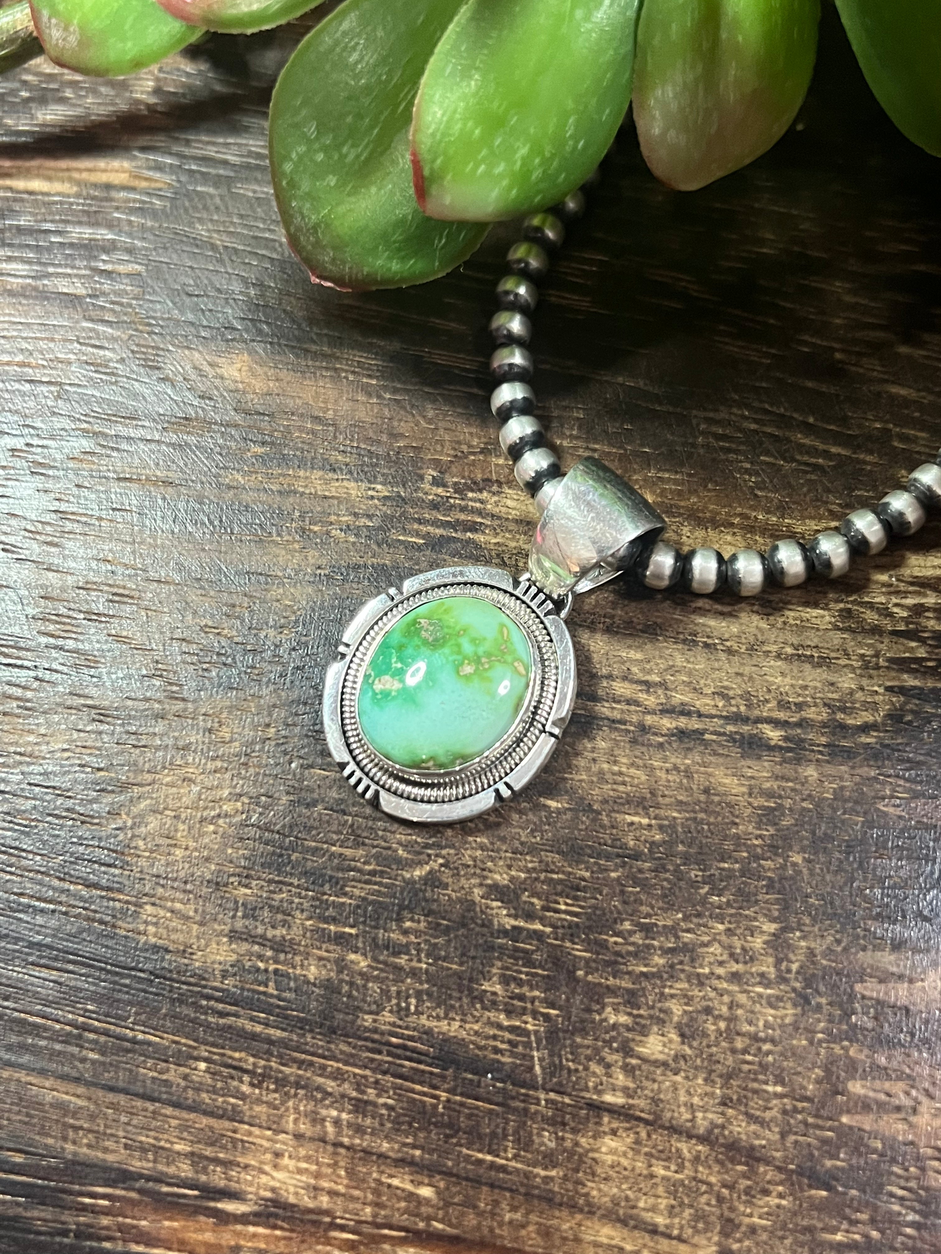 Wydell Billie Sonoran Mountain & Sterling Silver Pendant. It measures 1 1/2 inches long and 1 inch wide. Pendant Only!! Signed by the artist and stamped sterling silver.