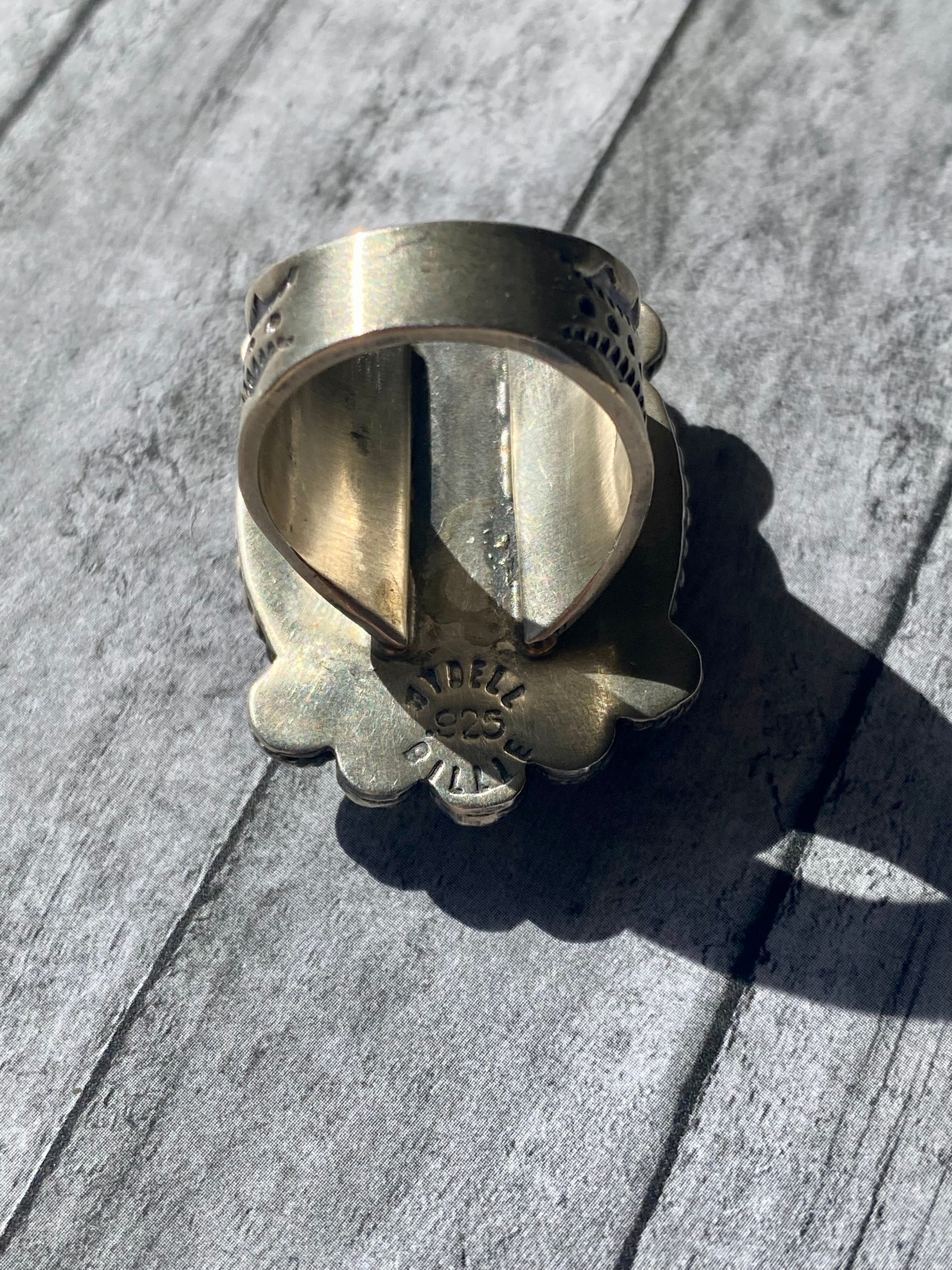 Wydell Billie Spiny Oyster & Sterling Silver Ring Size 7.25. It measures 1 1/2 inches long and 1 inch wide. Signed by the artist and stamped sterling silver.