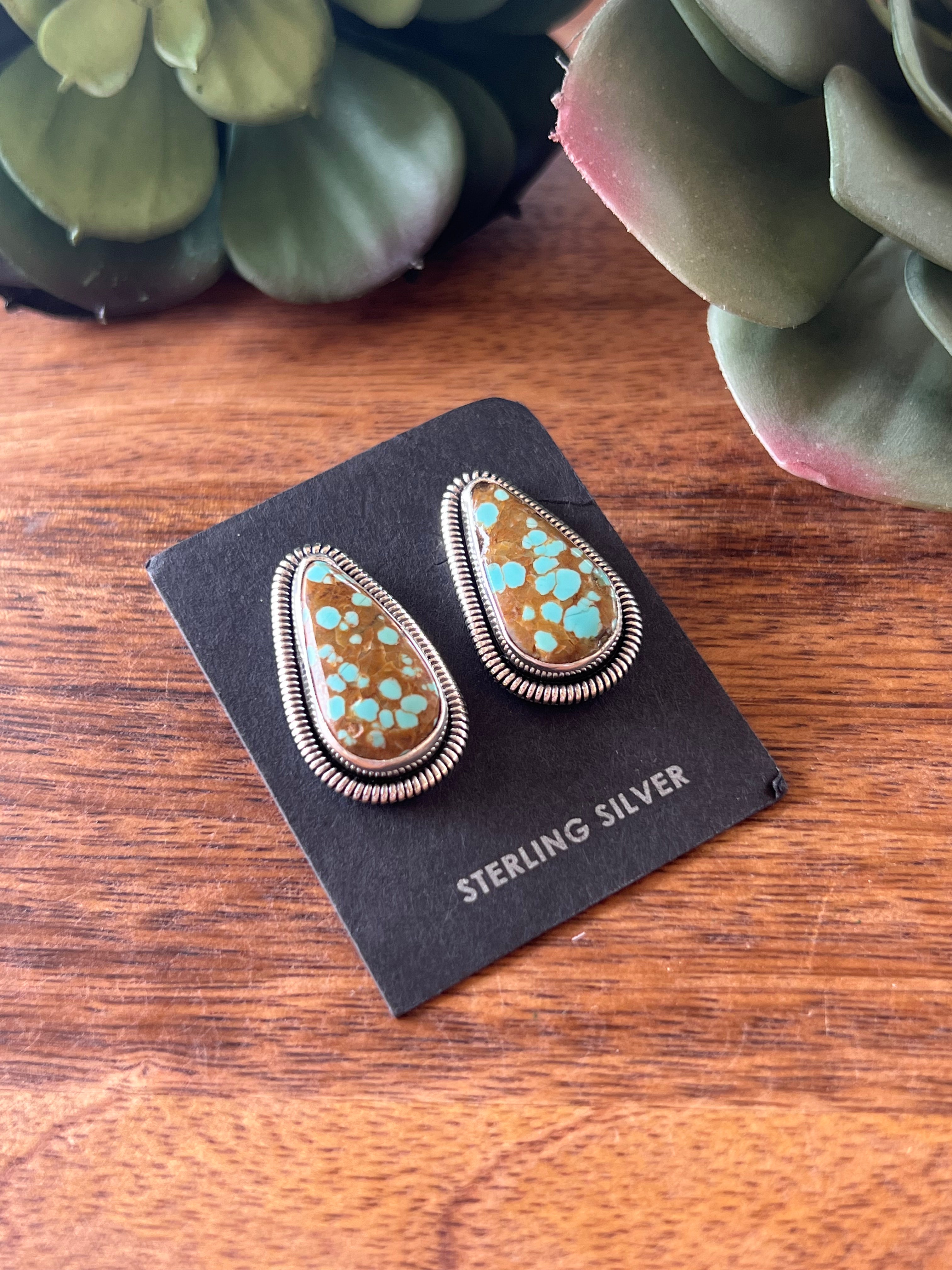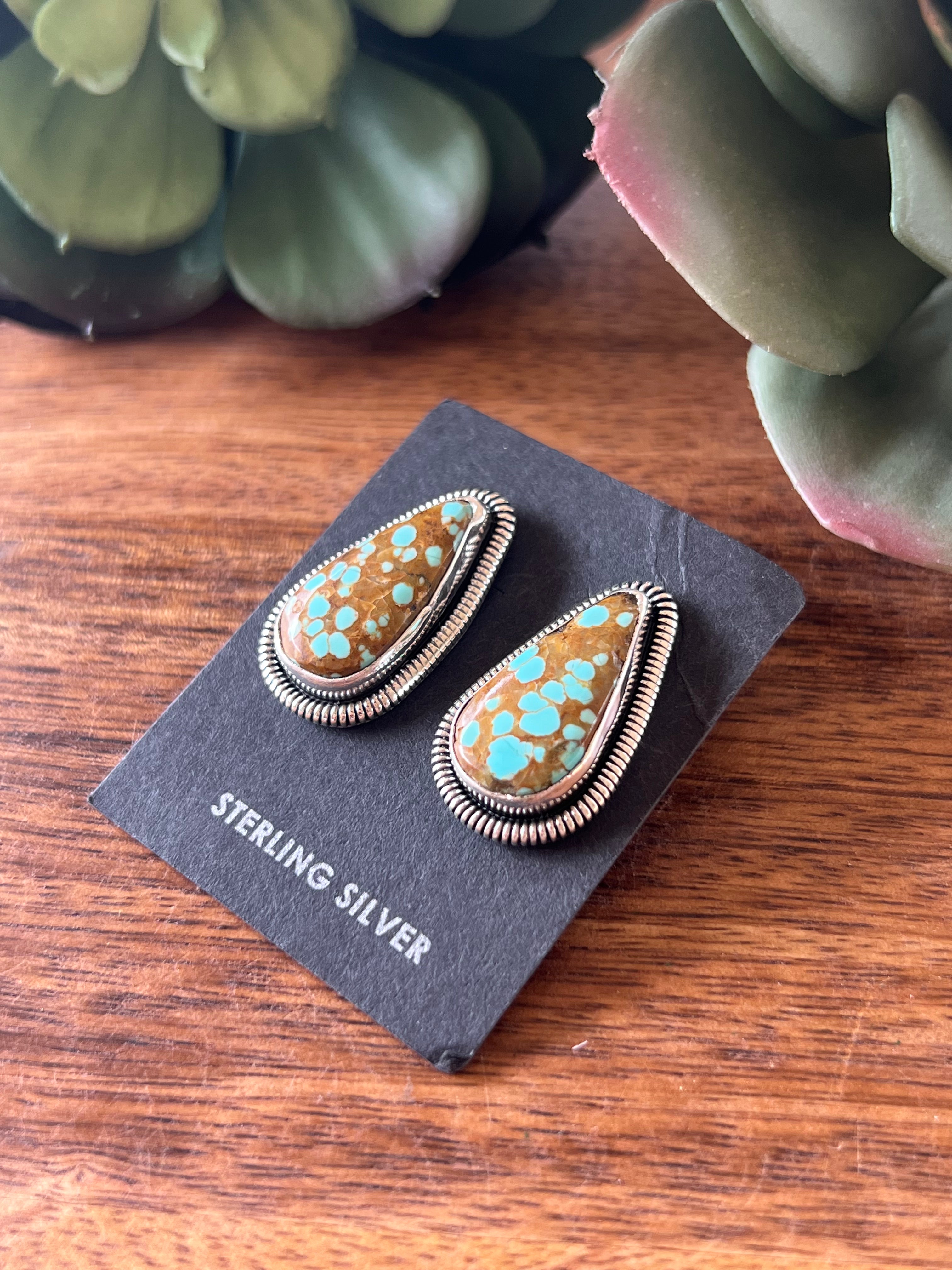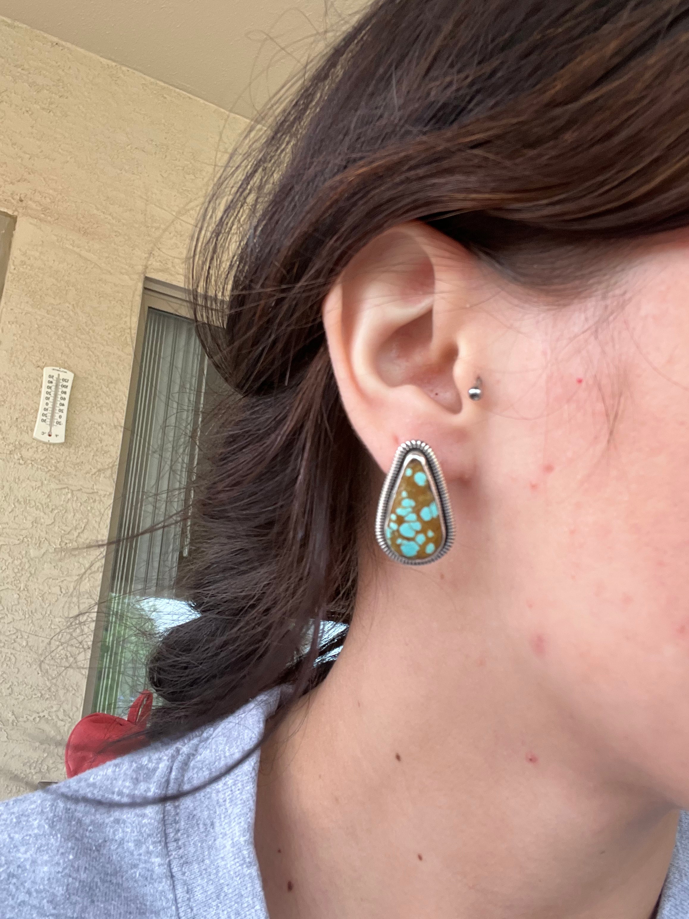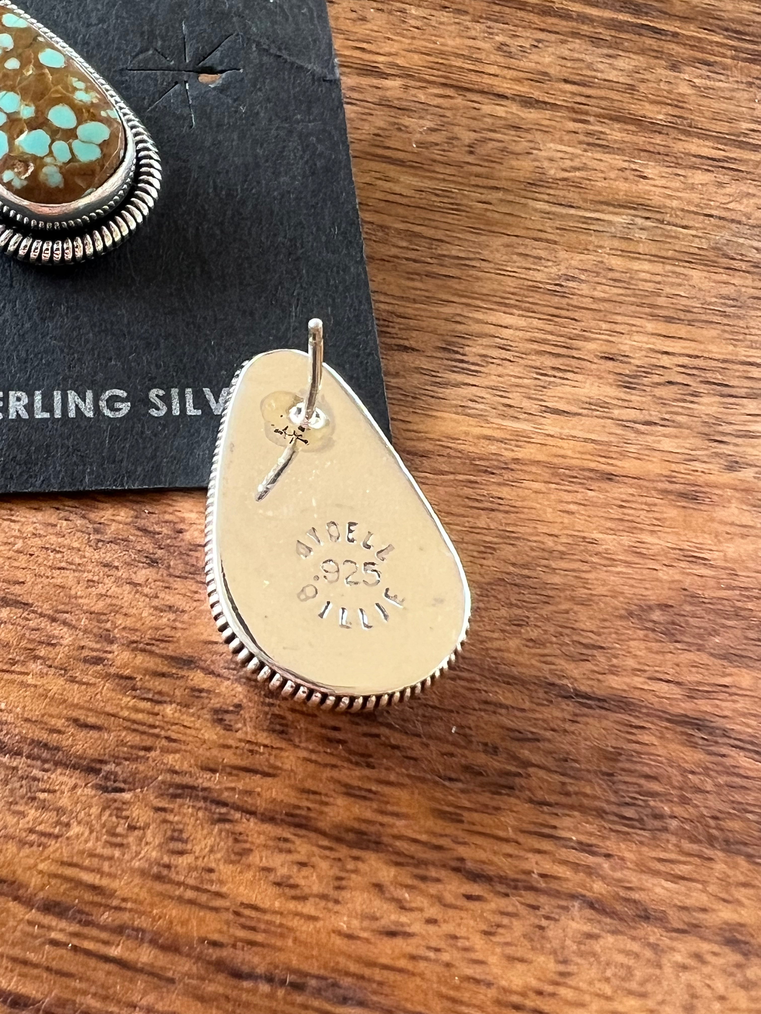 Wydelle Billie #8 Turquoise & Sterling Silver Post Earrings. It measures 1 inch long and 5/8 of an inch wide. Signed by artist and stamped sterling silver.