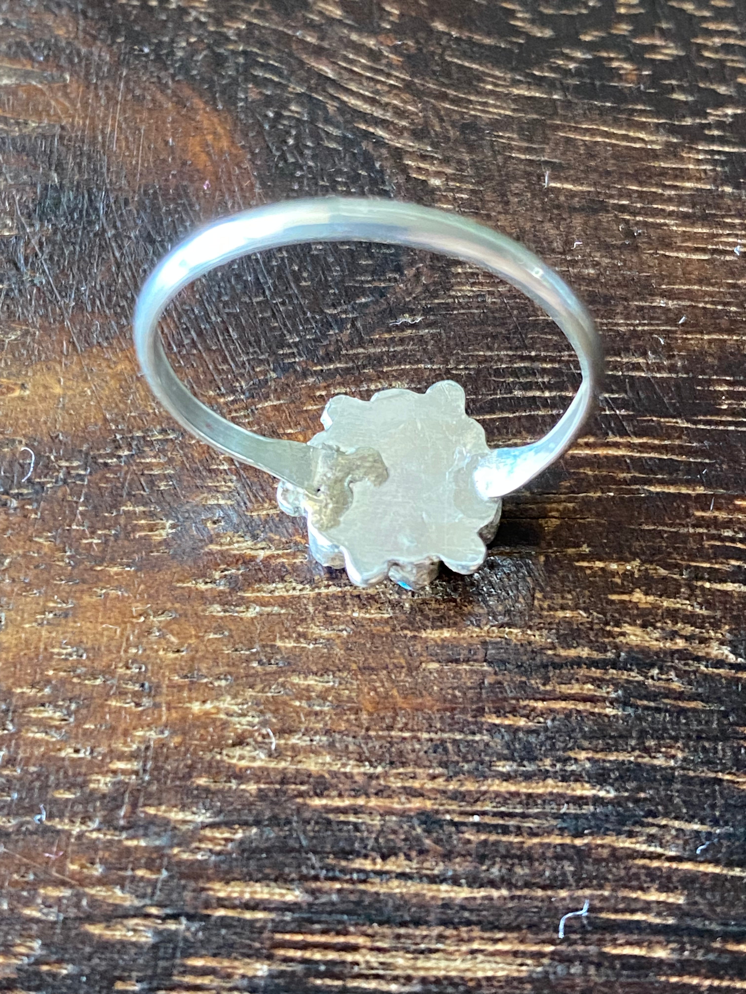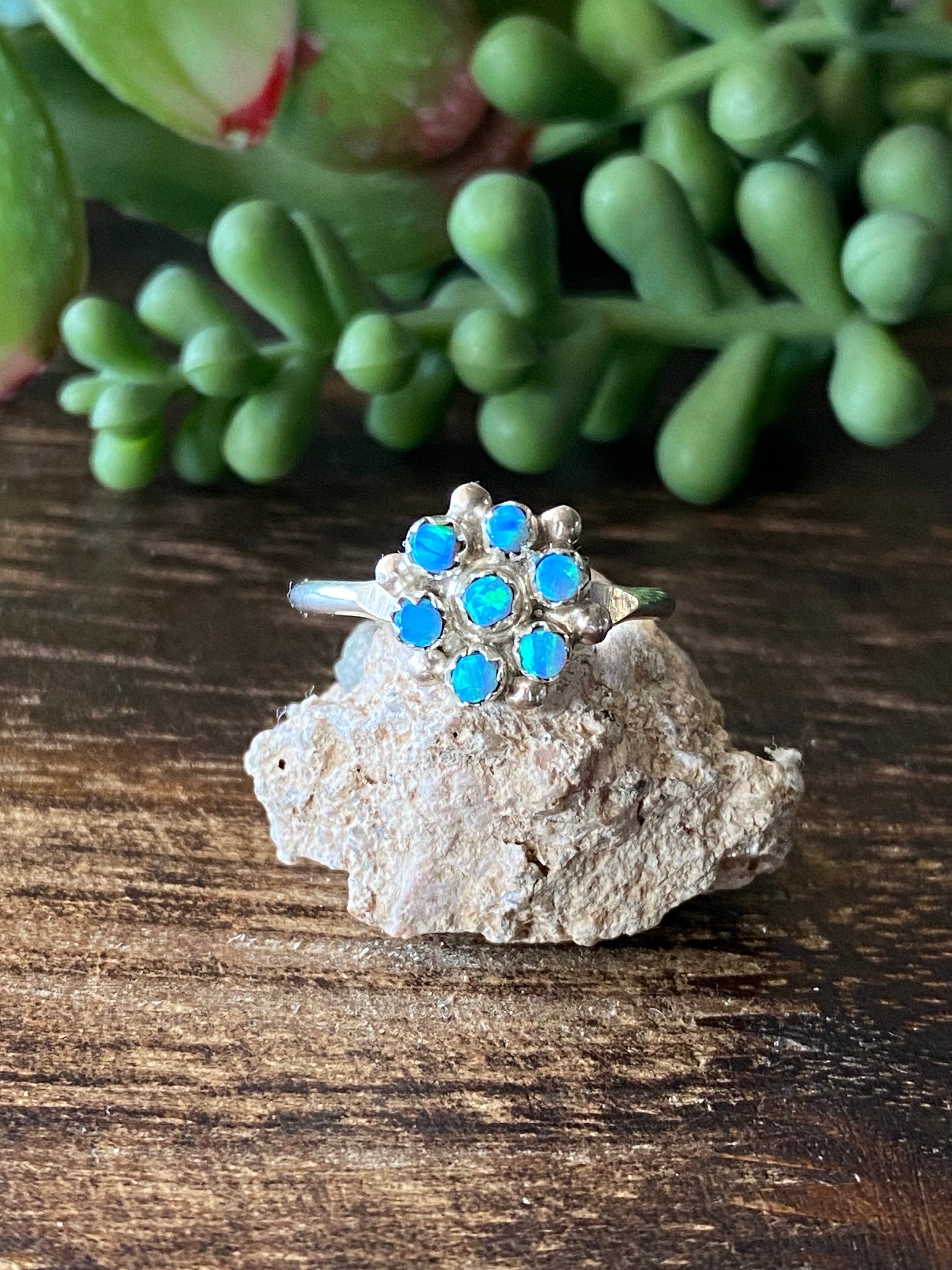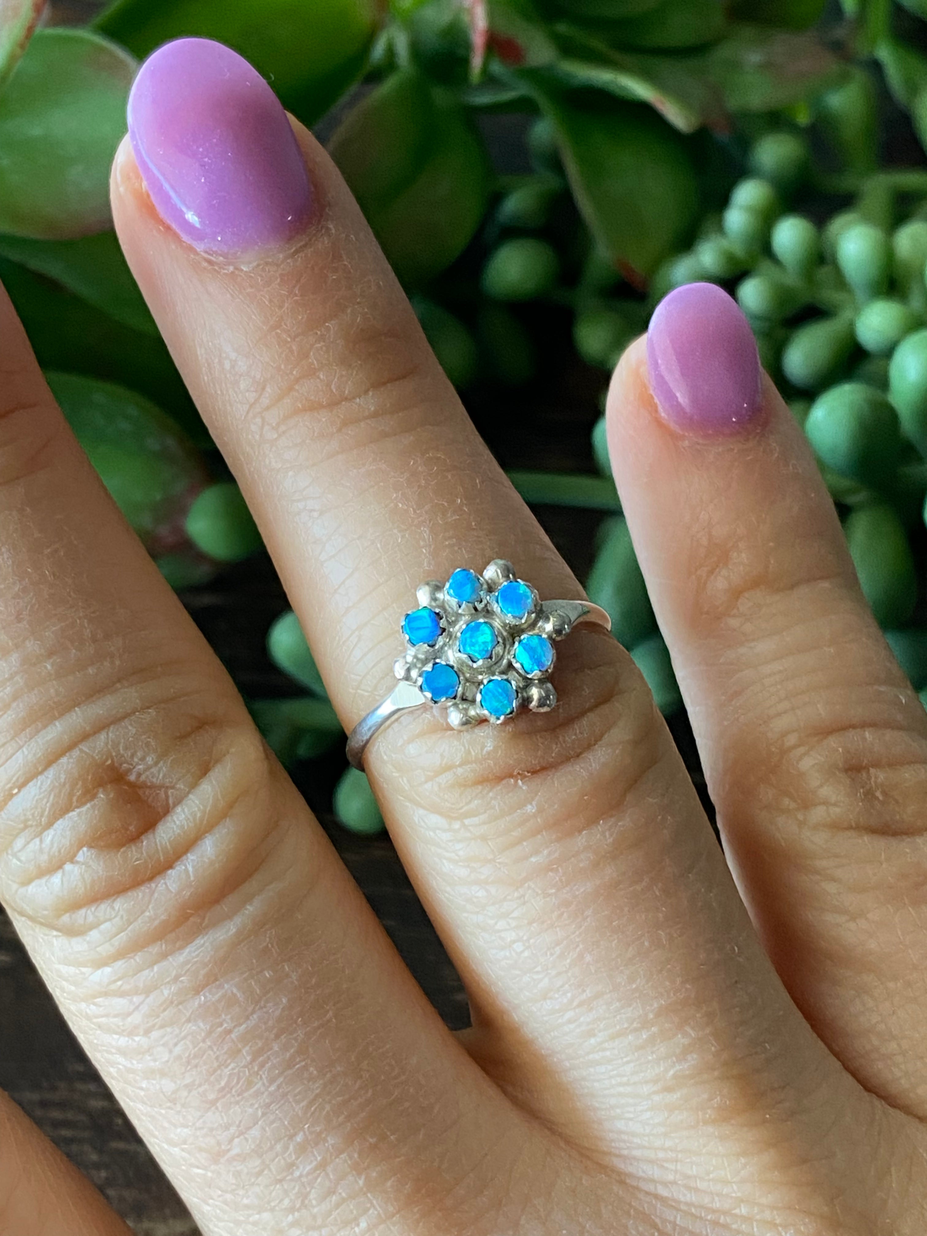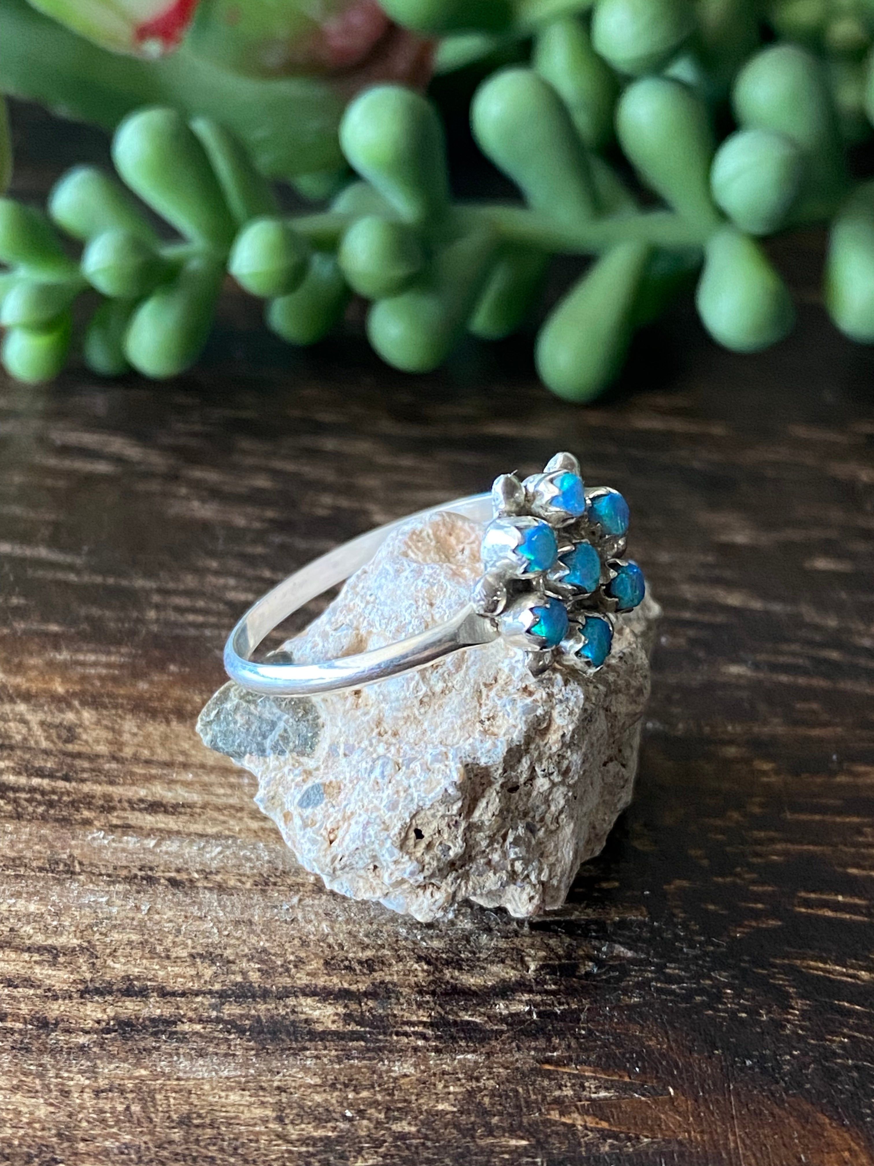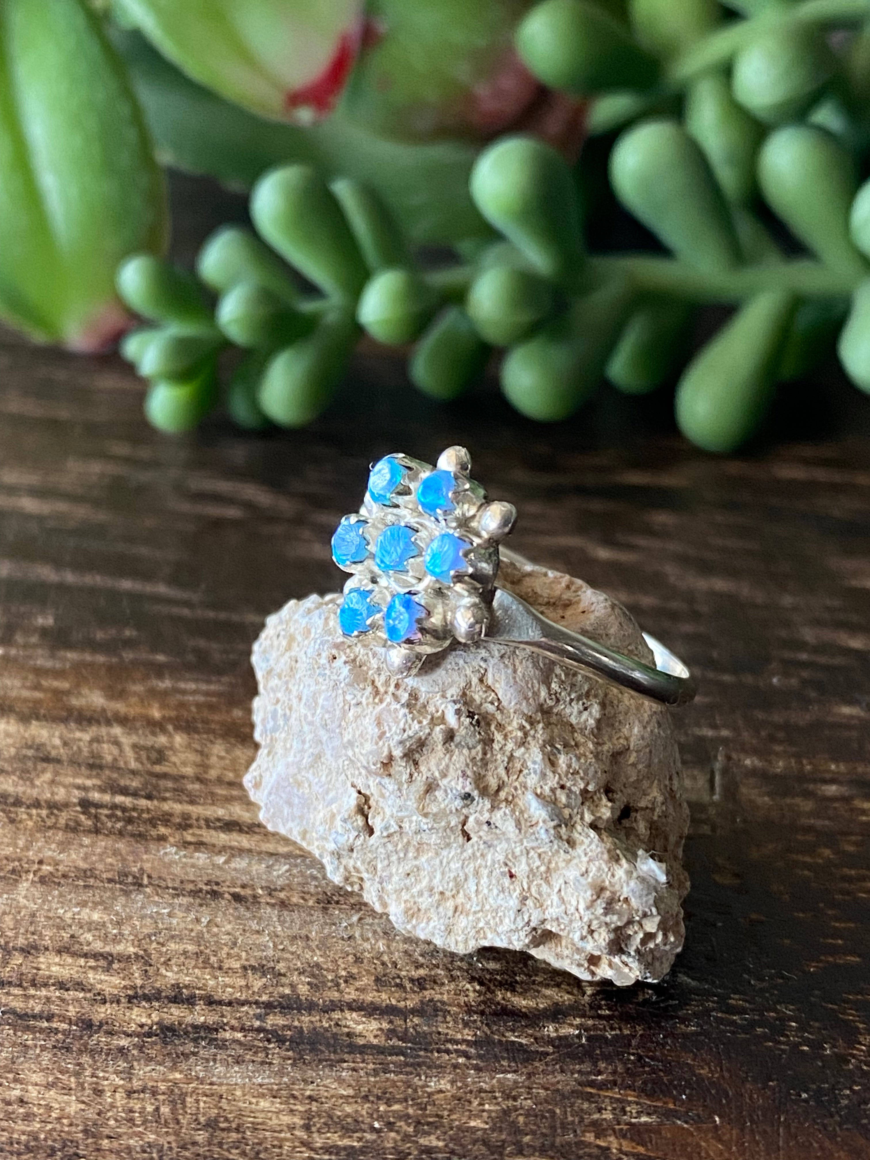 Zuni Made Blue Opal (Man-Made) & Sterling Silver Cluster Rings. It measures just under 1/2 of an inch long and just over 3/8 of an inch wide.
