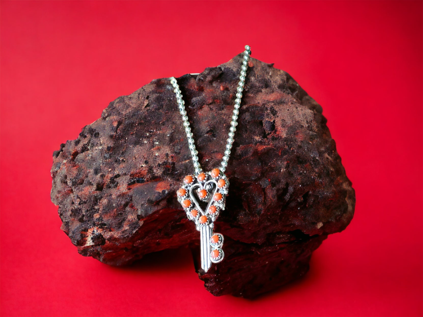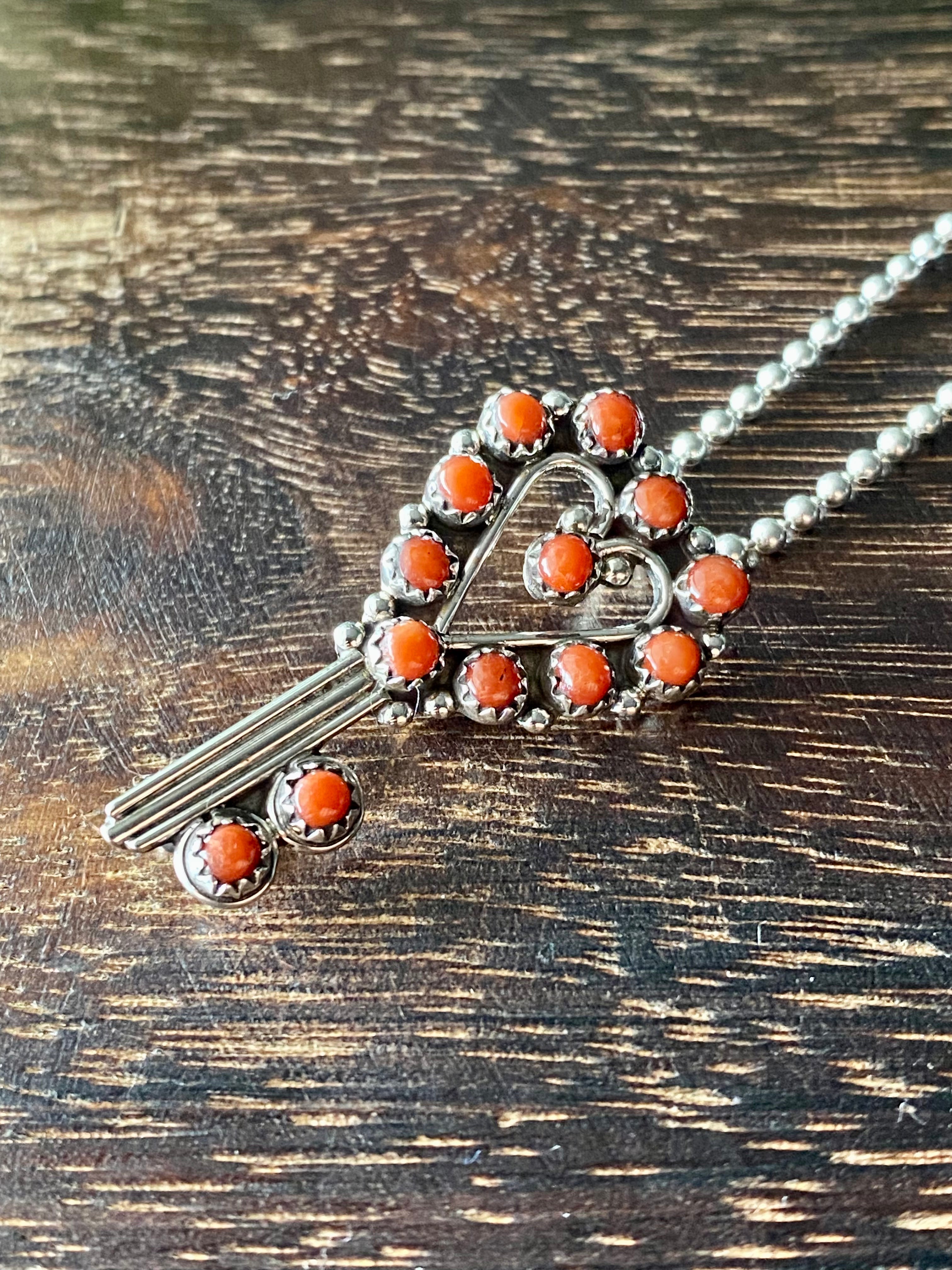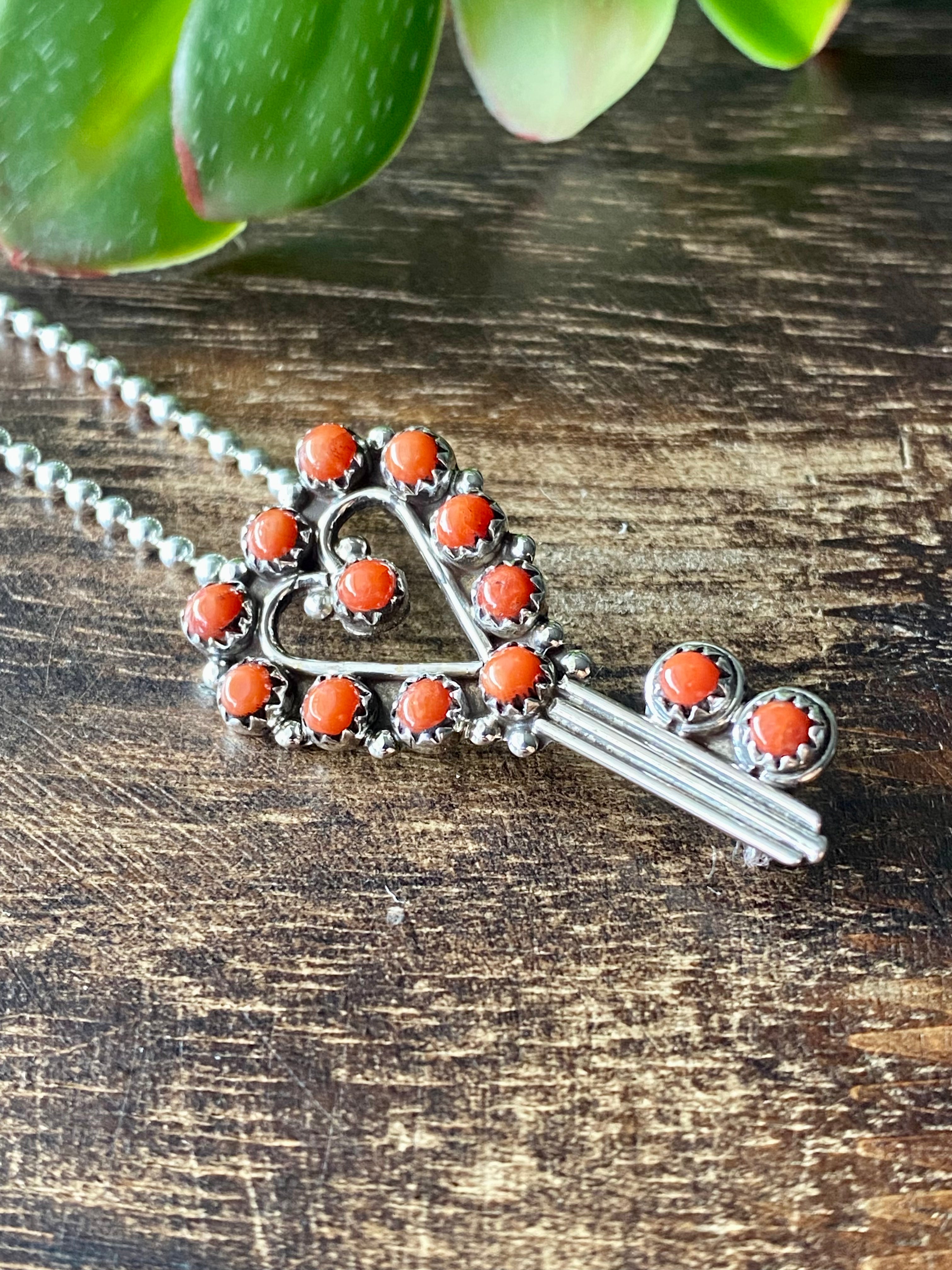 Zuni Made Coral & Sterling Silver Heart Pin/Pendant. It measures 1 5/8 inches long and 7/8 of an inch wide. Pendant Only!! Stones will differ due to natural stones. Signed by the artist.