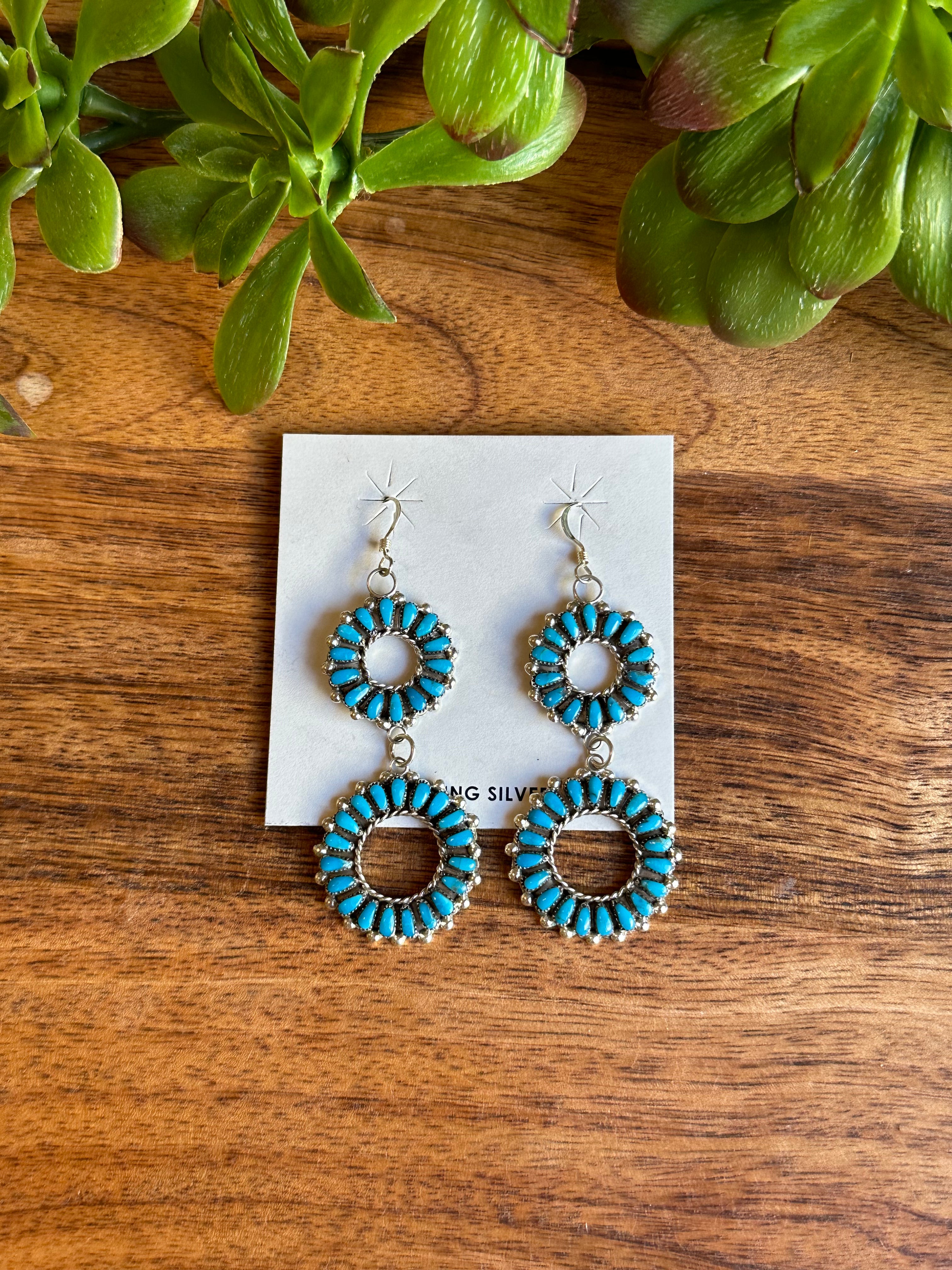 Zuni Made Kingman Turquoise & Sterling Silver Cluster Dangle Earrings
