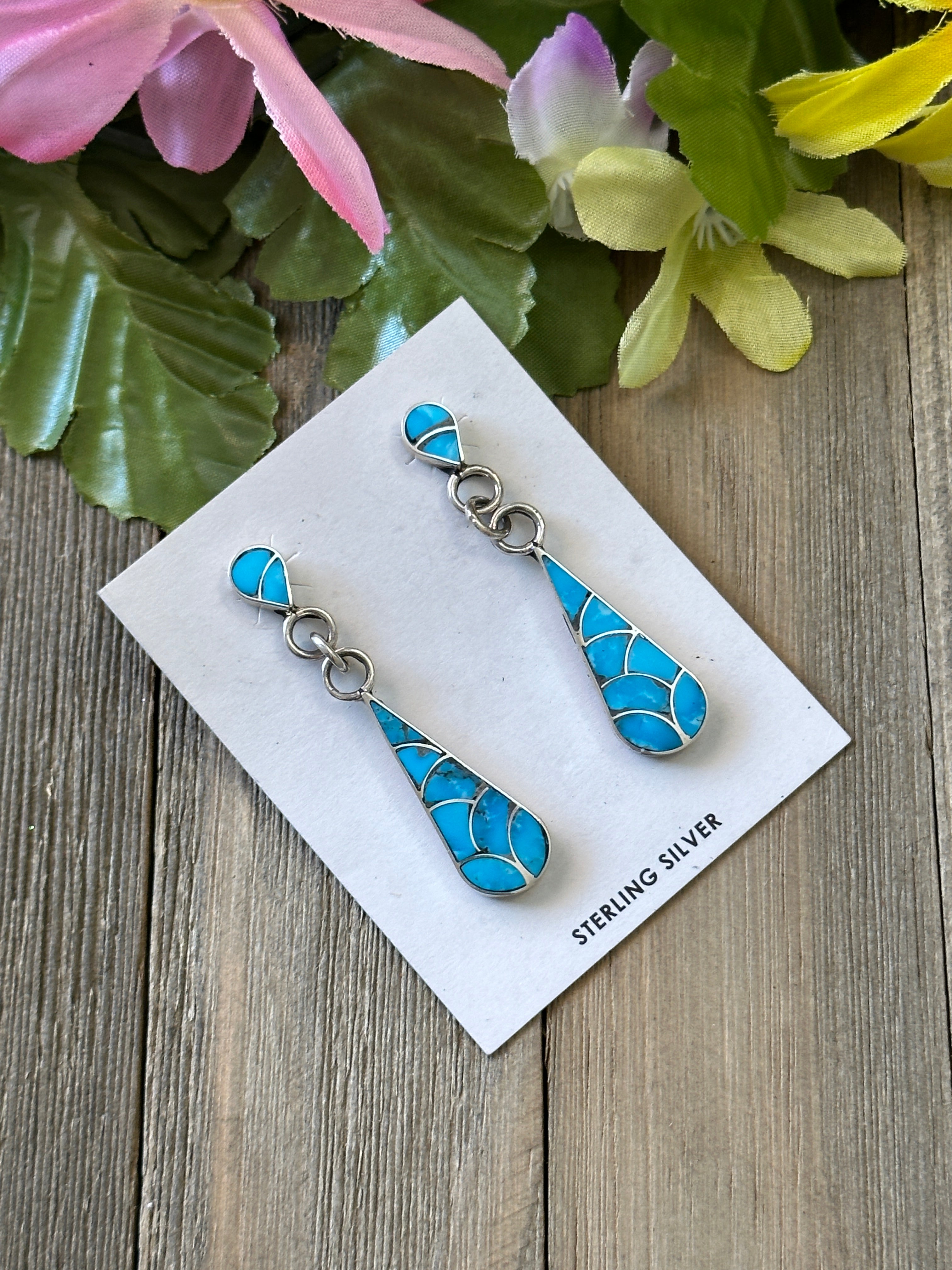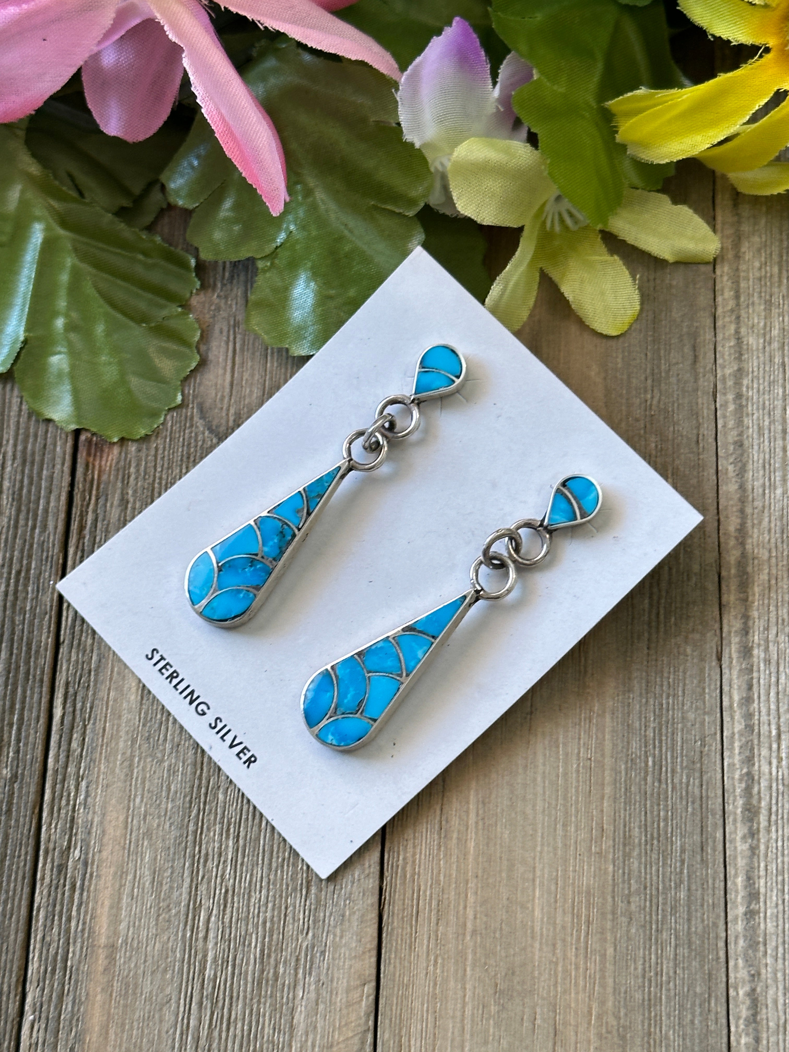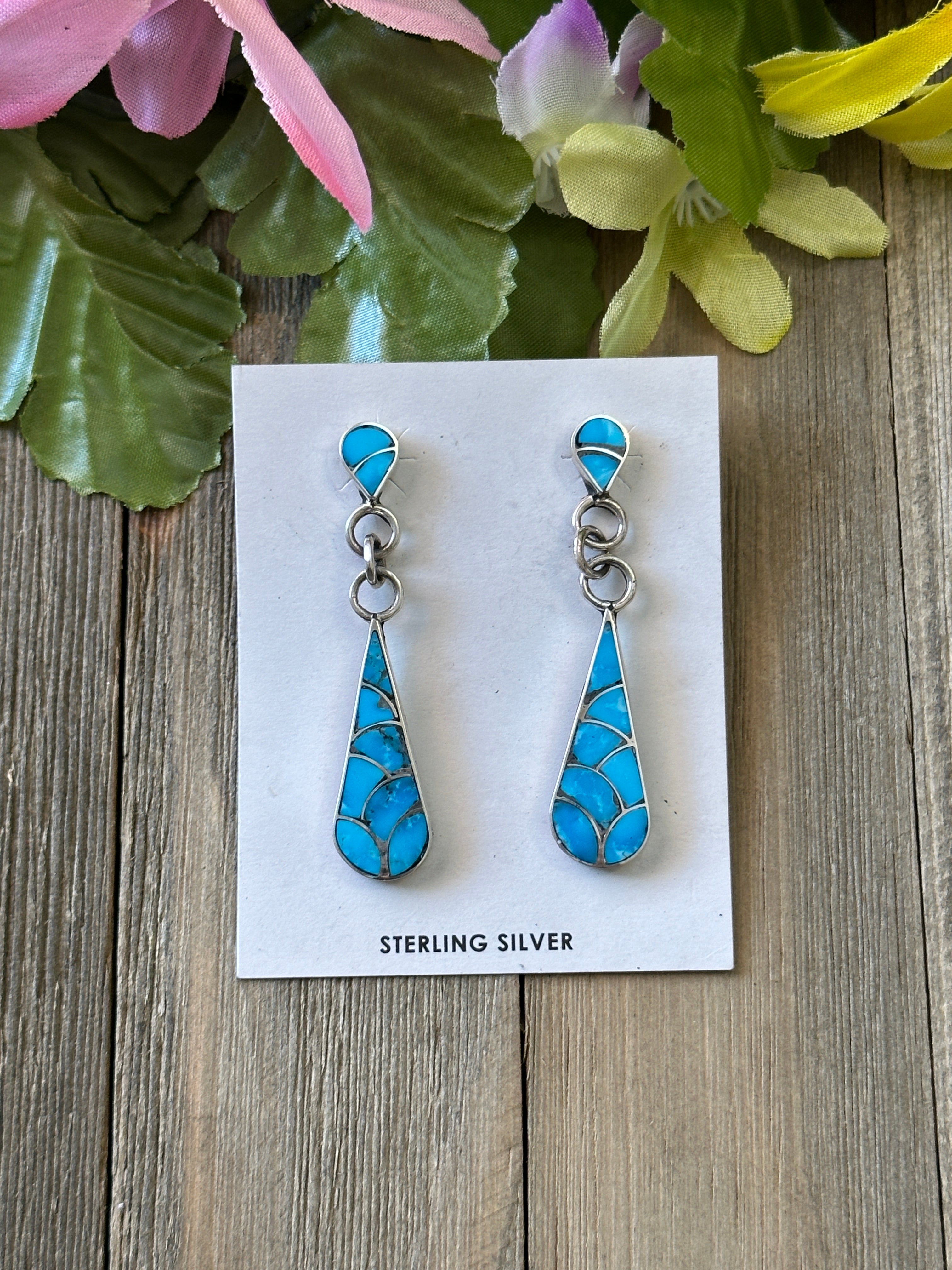 Zuni Made Kingman Turquoise & Sterling Silver Inlay Dangle Post Earrings