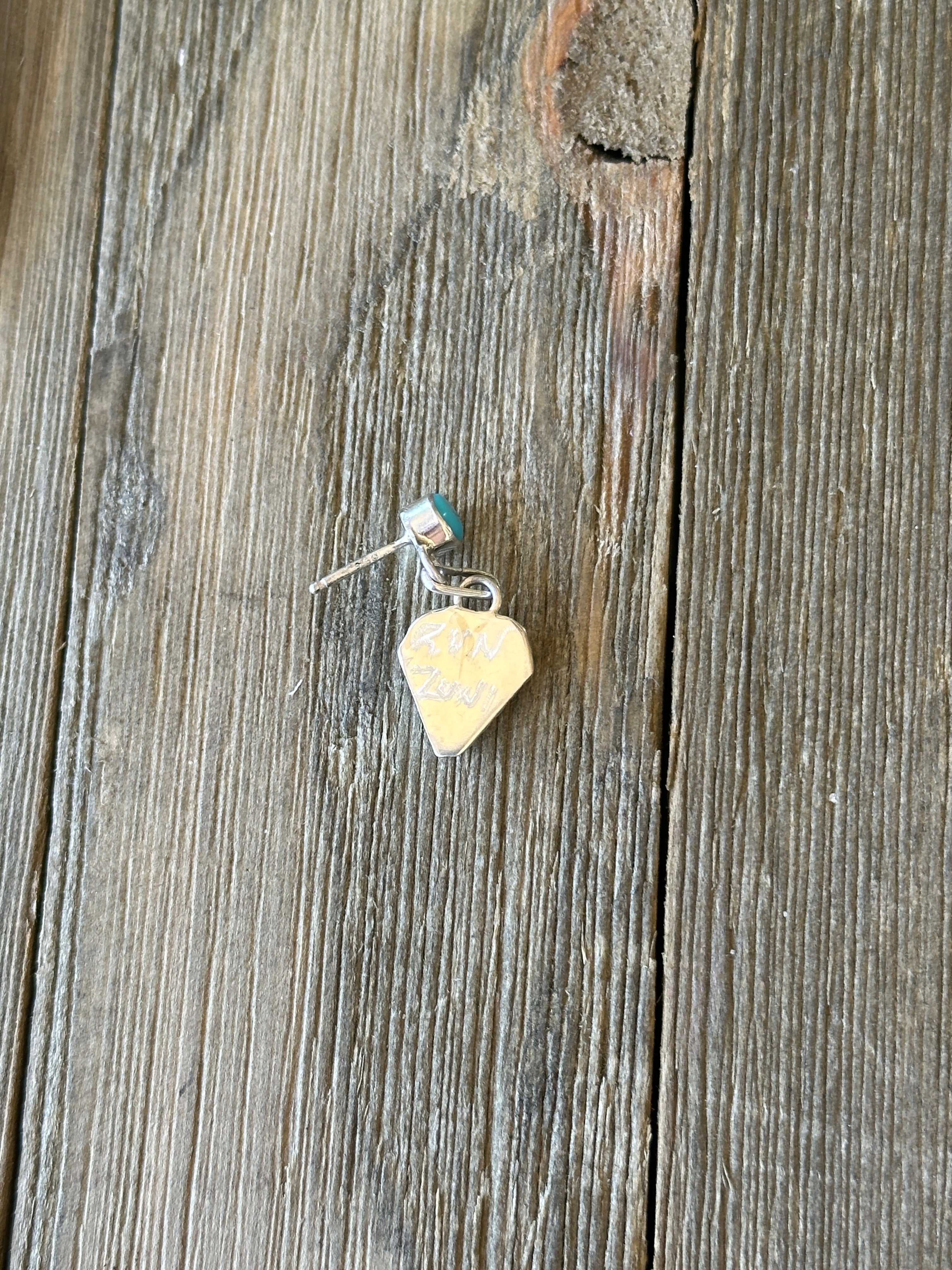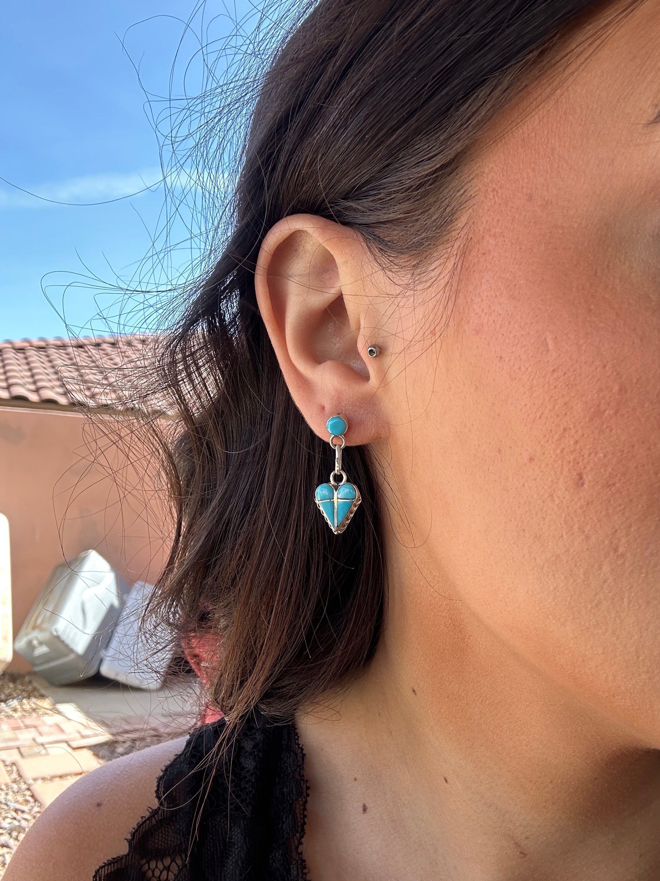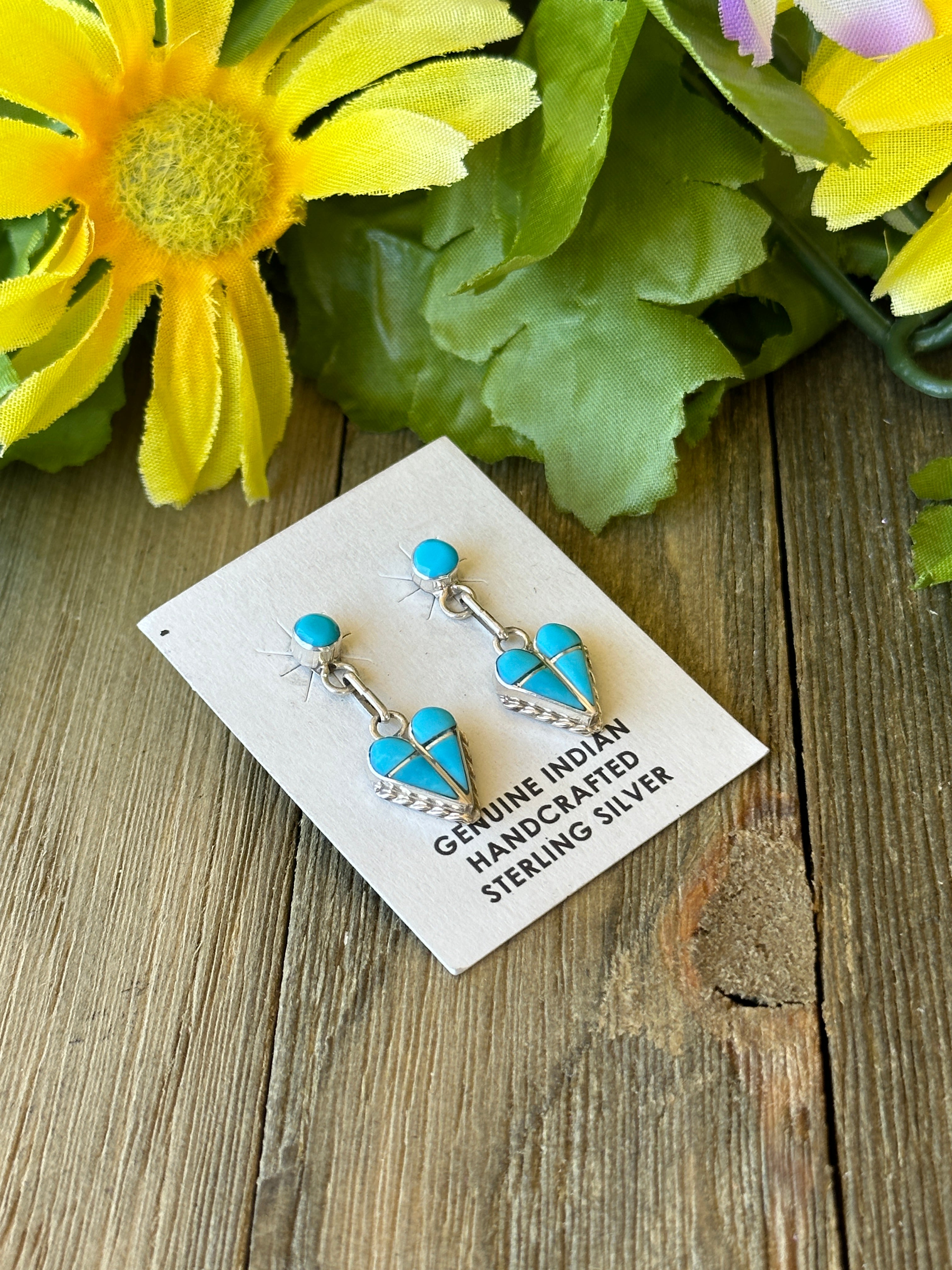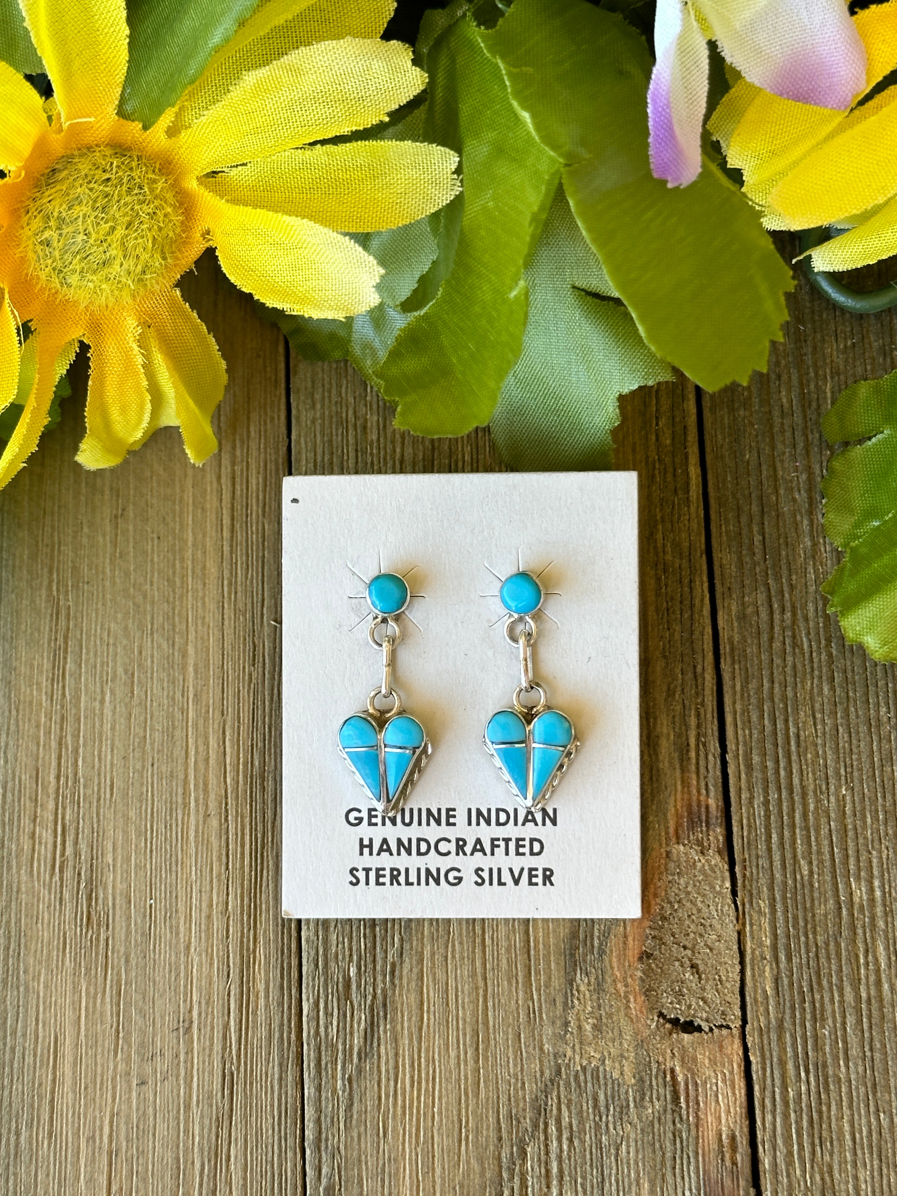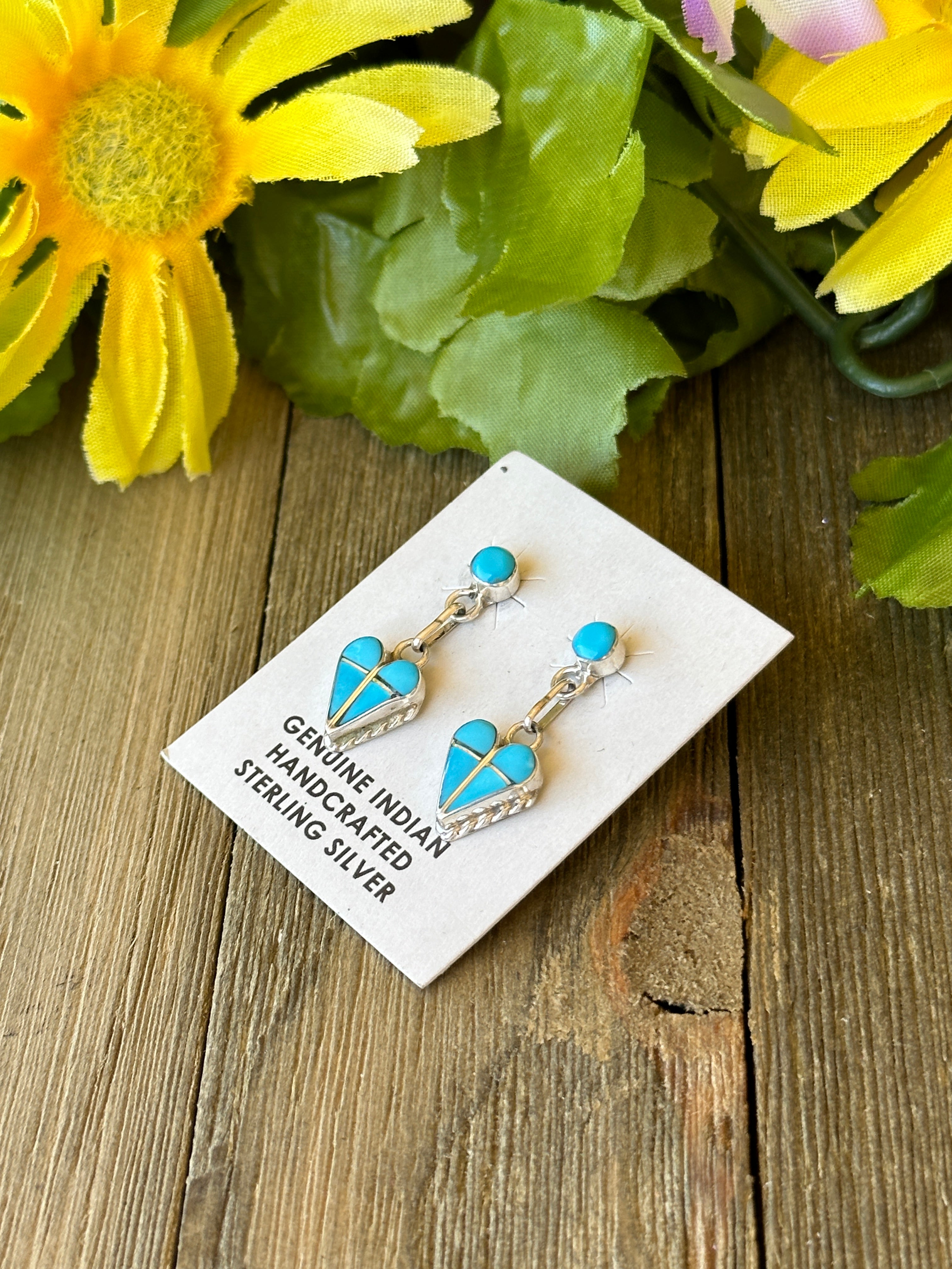 Zuni Made Kingman Turquoise & Sterling Silver Inlay Heart Post Dangle Earrings