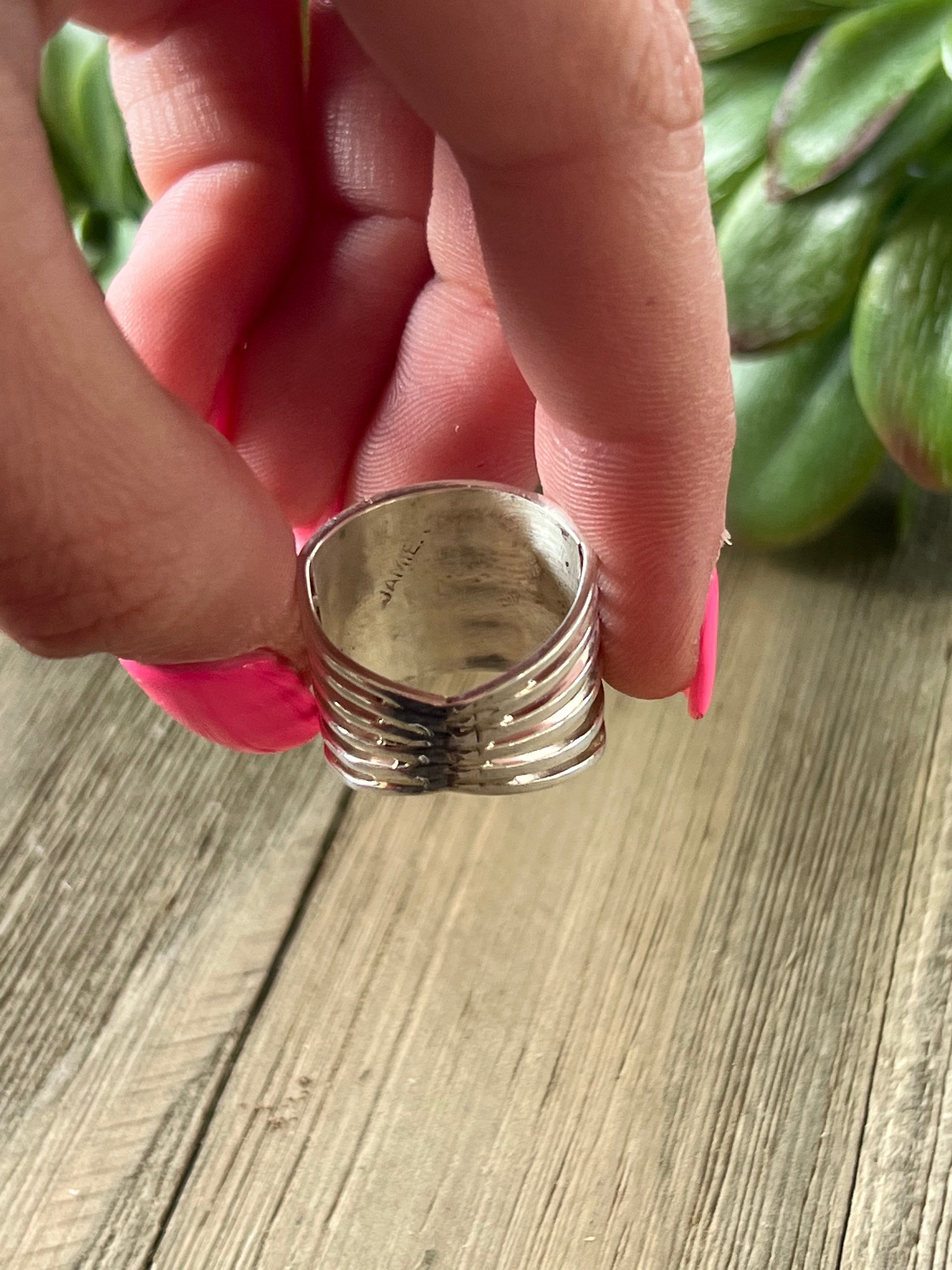 Zuni Made Multi Colored Opal (Man Made) & Sterling Silver Ring. It measures 5/8 of an inch long and 3/4 of an inch wide. Signed by artist and stamped sterling silver.