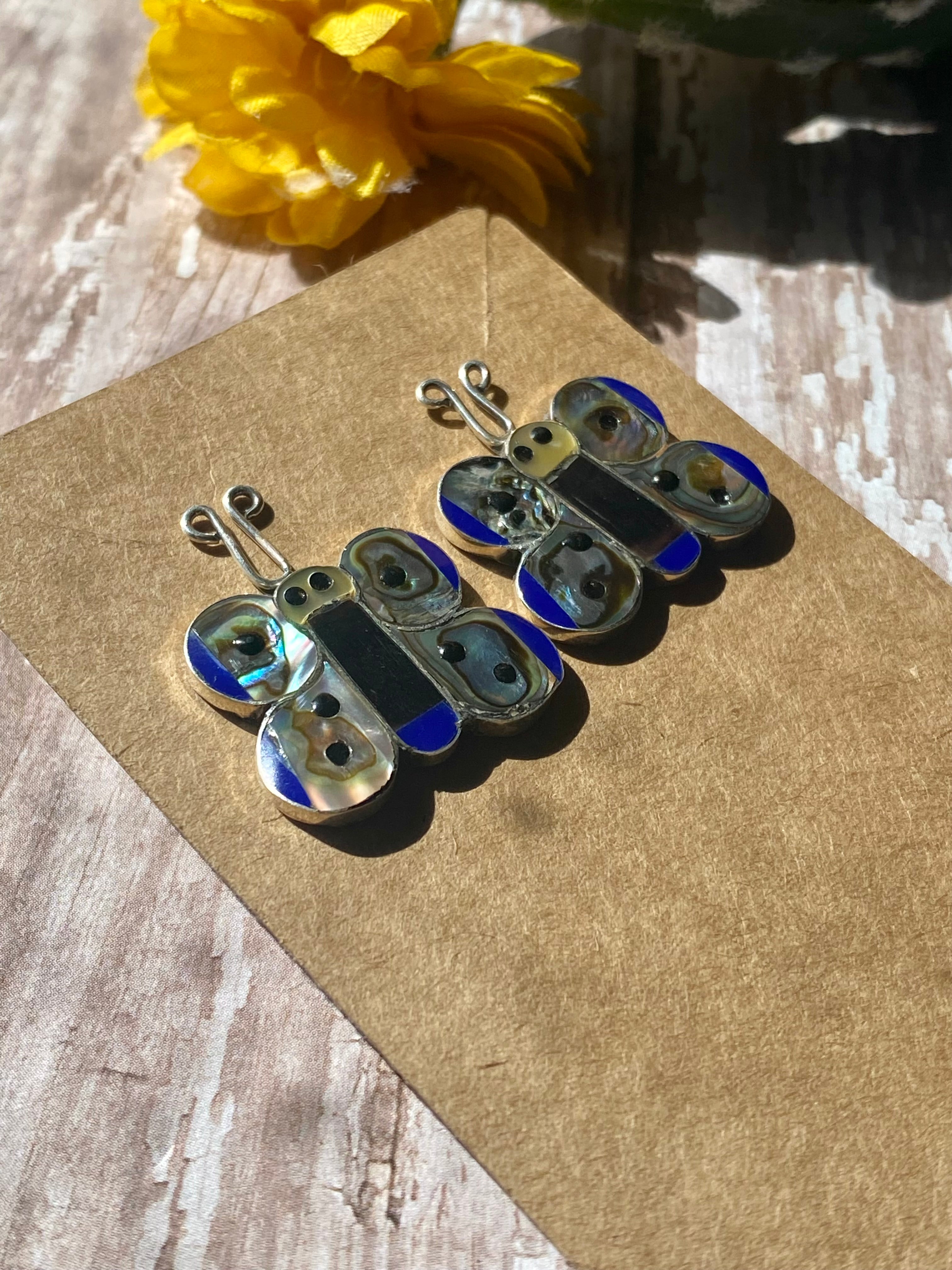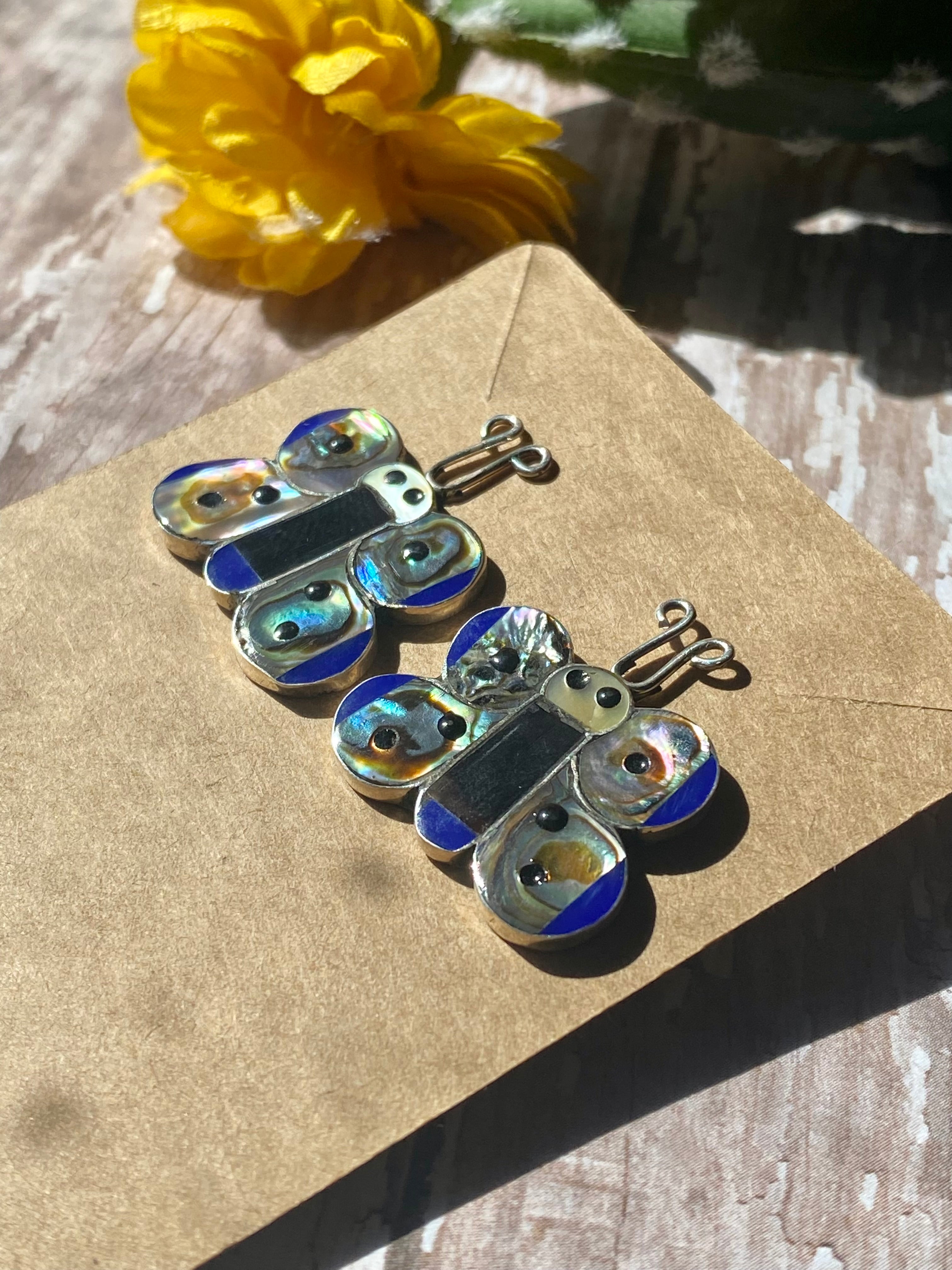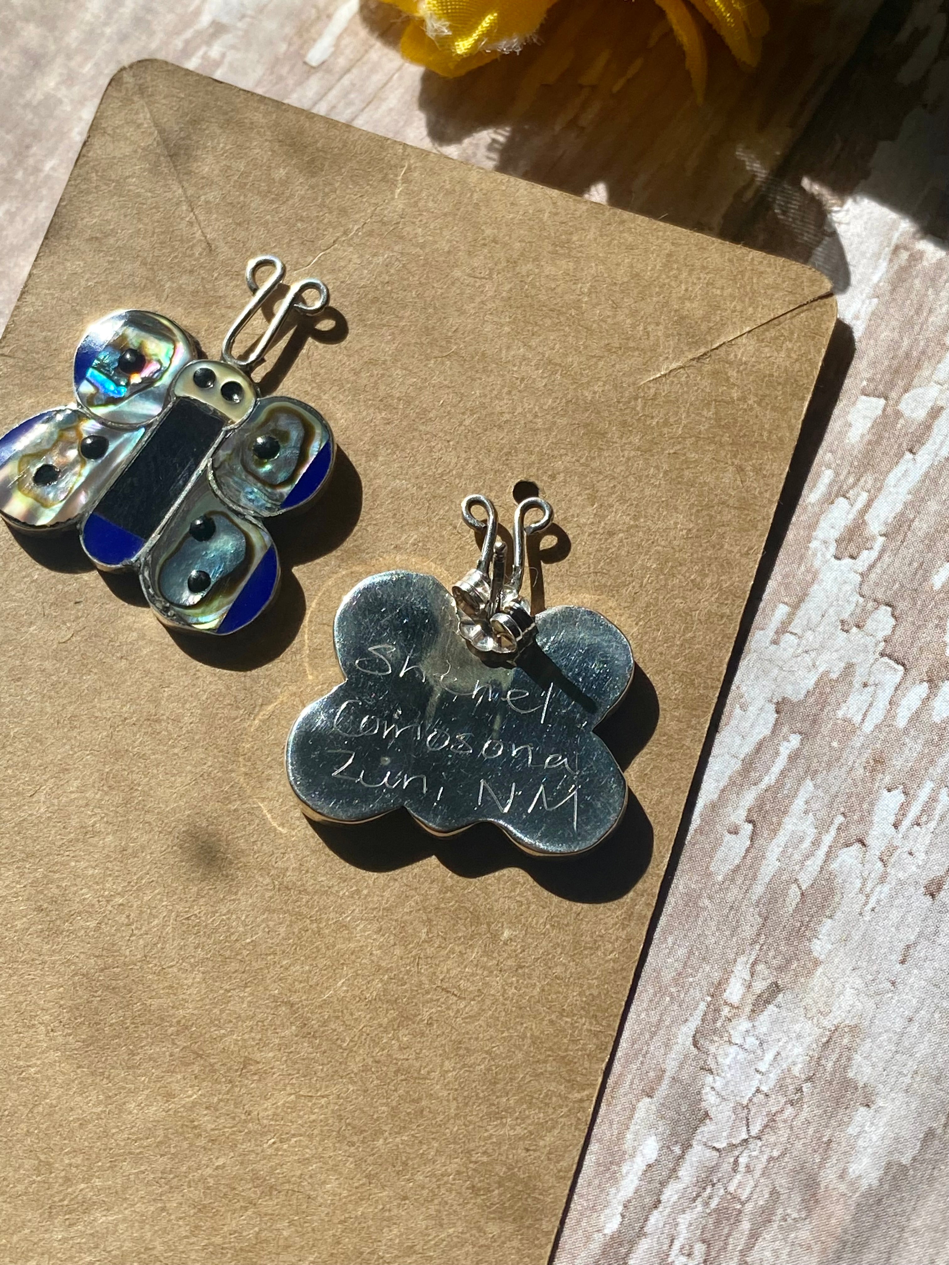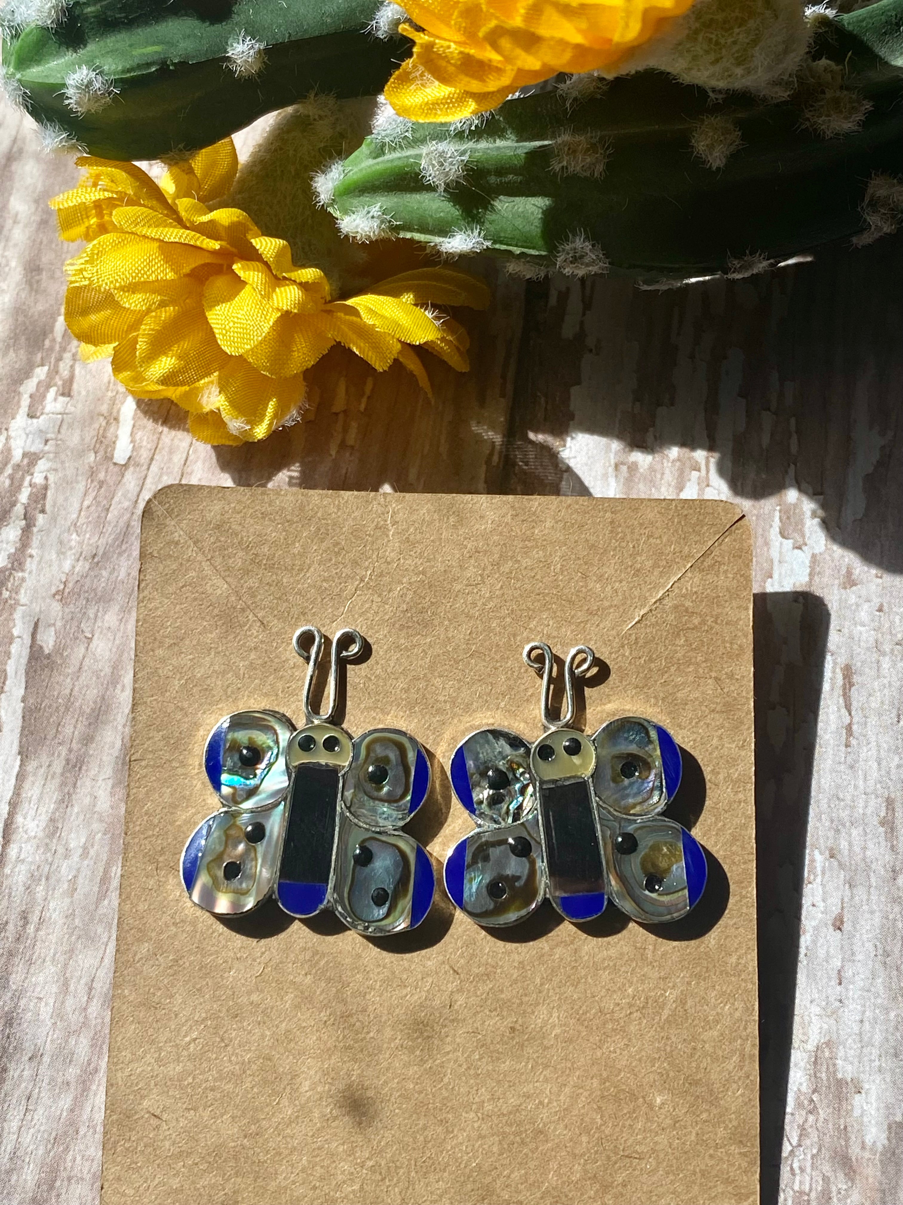 Zuni Made Multi Stone & Sterling Silver Inlay Butterfly Post Earrings. They measure just over 1 inch long and 1 inch wide. Signed by the artist.