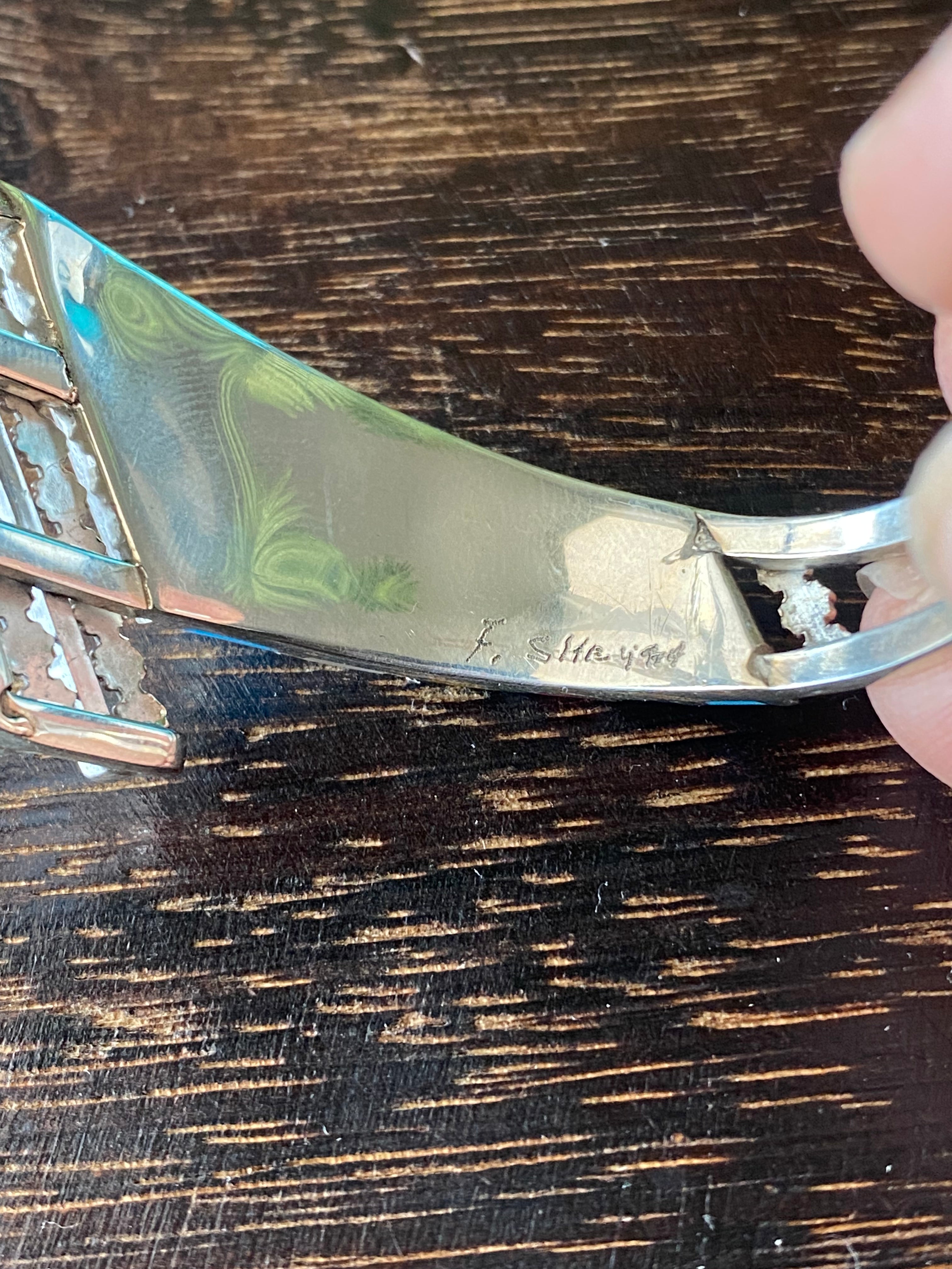 Zuni Made Multi Stone & Sterling Silver Inlay Cuff Bracelet. It measures 1 inch wide with an inside circumference of 5 1/2 inches and a gap of 1 1/4 inches. Signed by the artist.