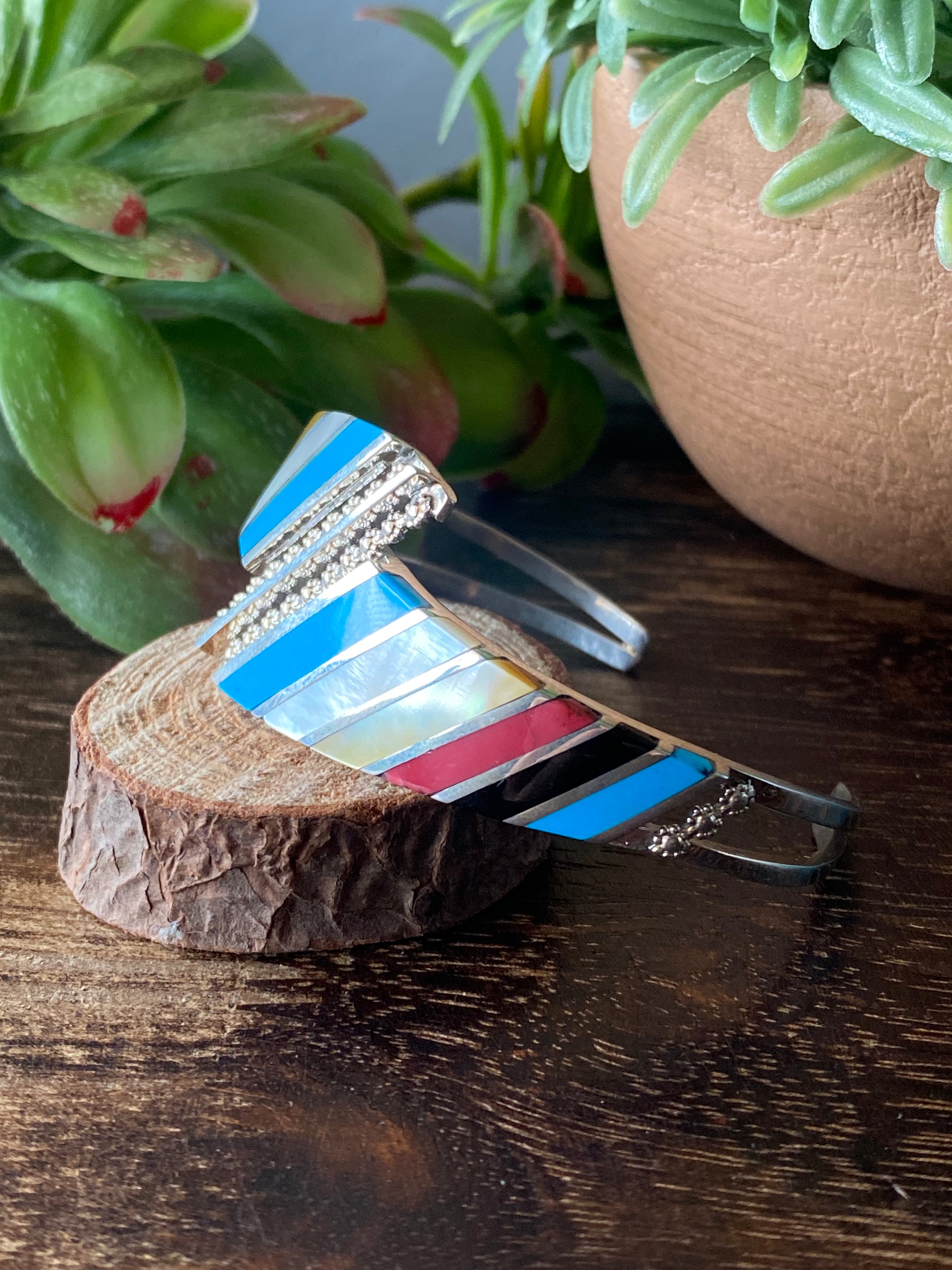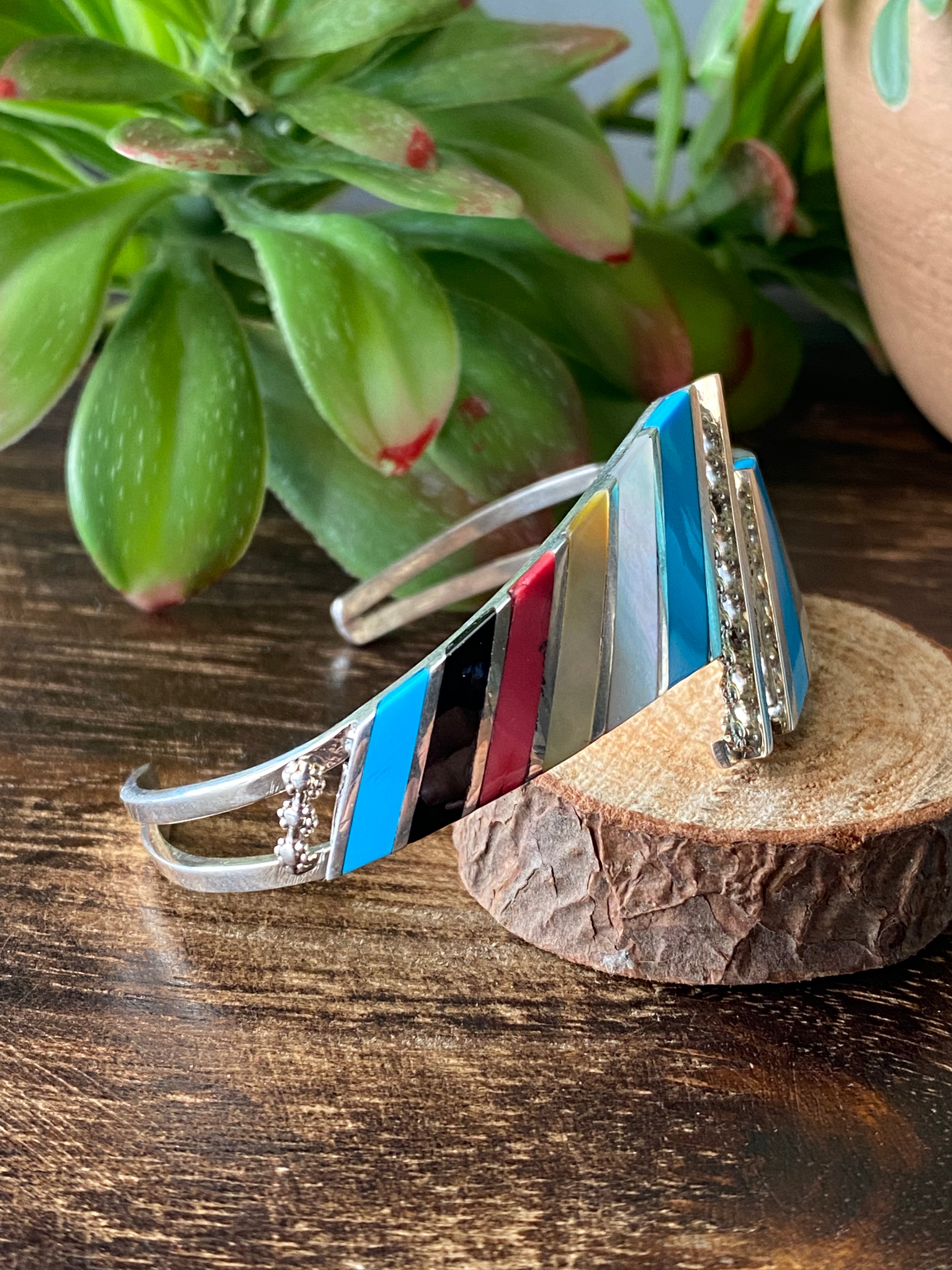 Zuni Made Multi Stone & Sterling Silver Inlay Cuff Bracelet